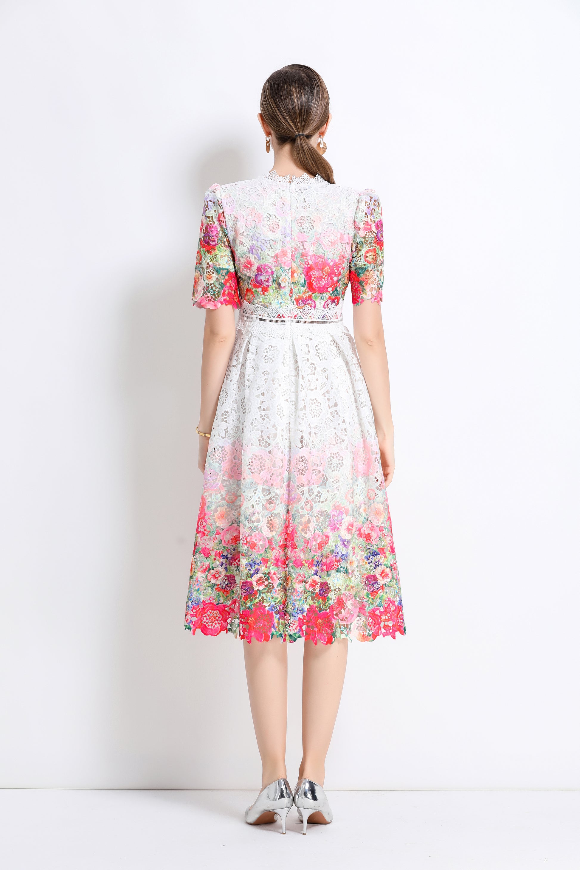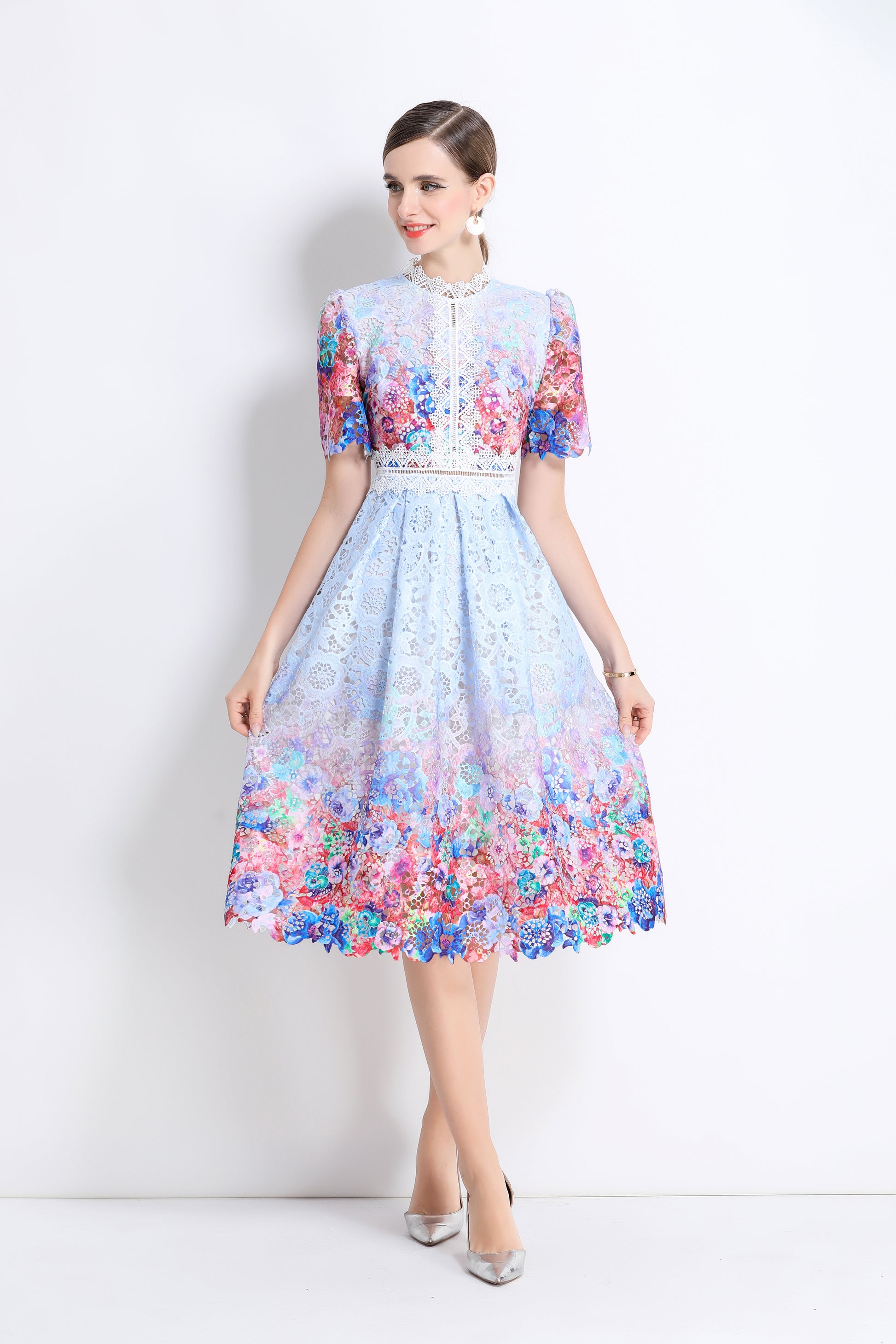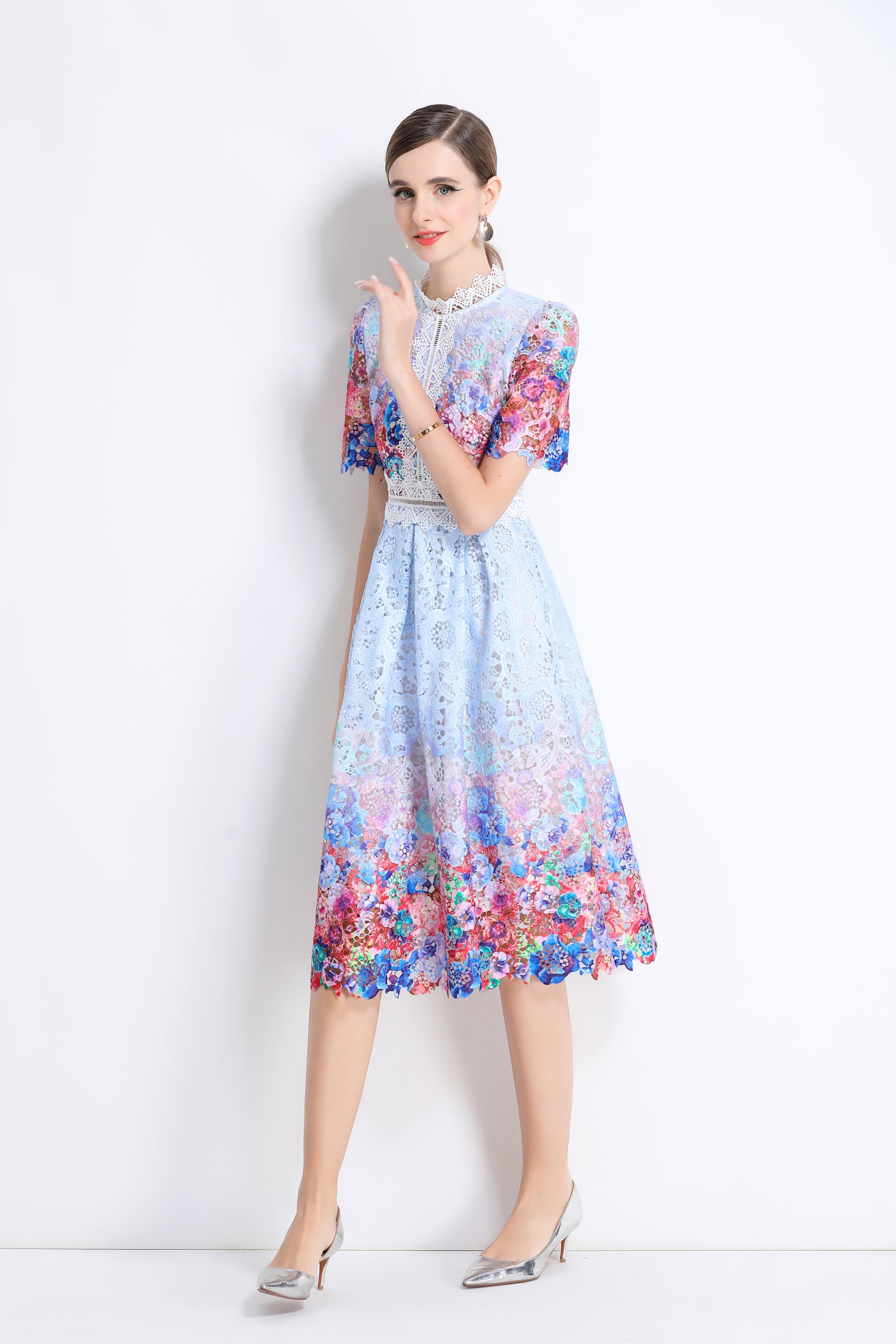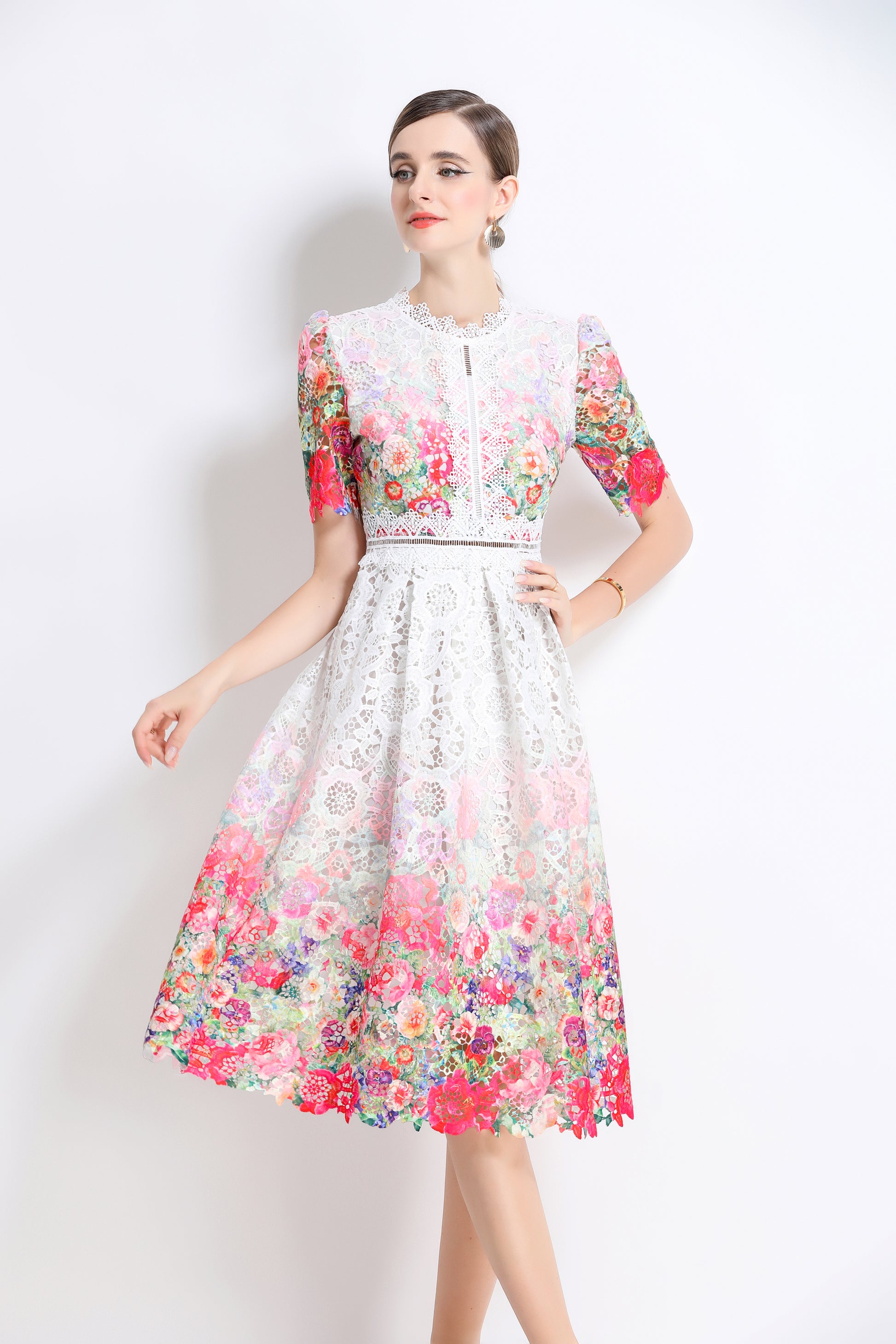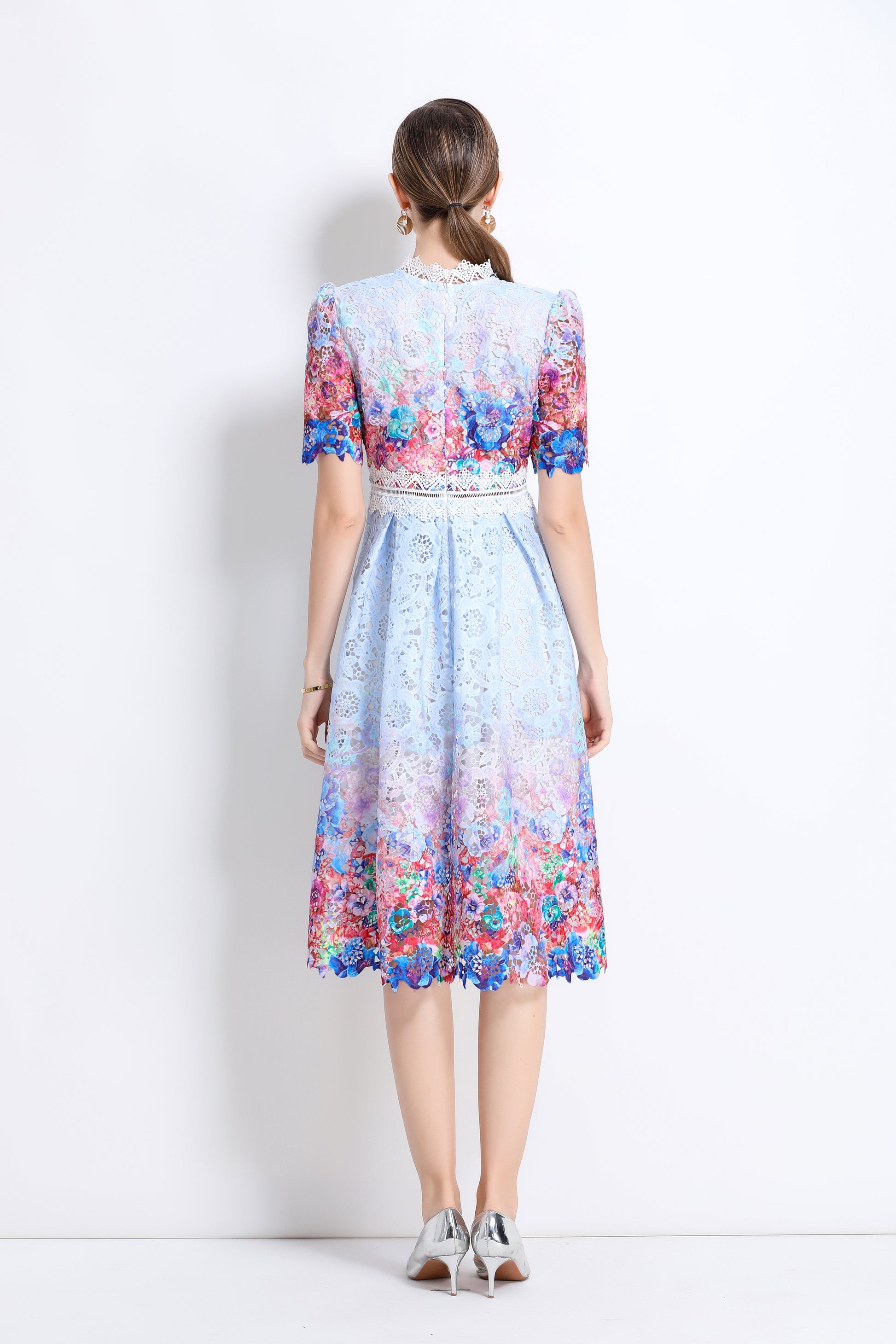- Features: Lace fabric, hollow floral pattern all over, round neck with lace trim, short sleeves with petal edges, crochet waist, concealed zipper closure at back, flowing petal edge dress,A line swing dress make you more feminine.