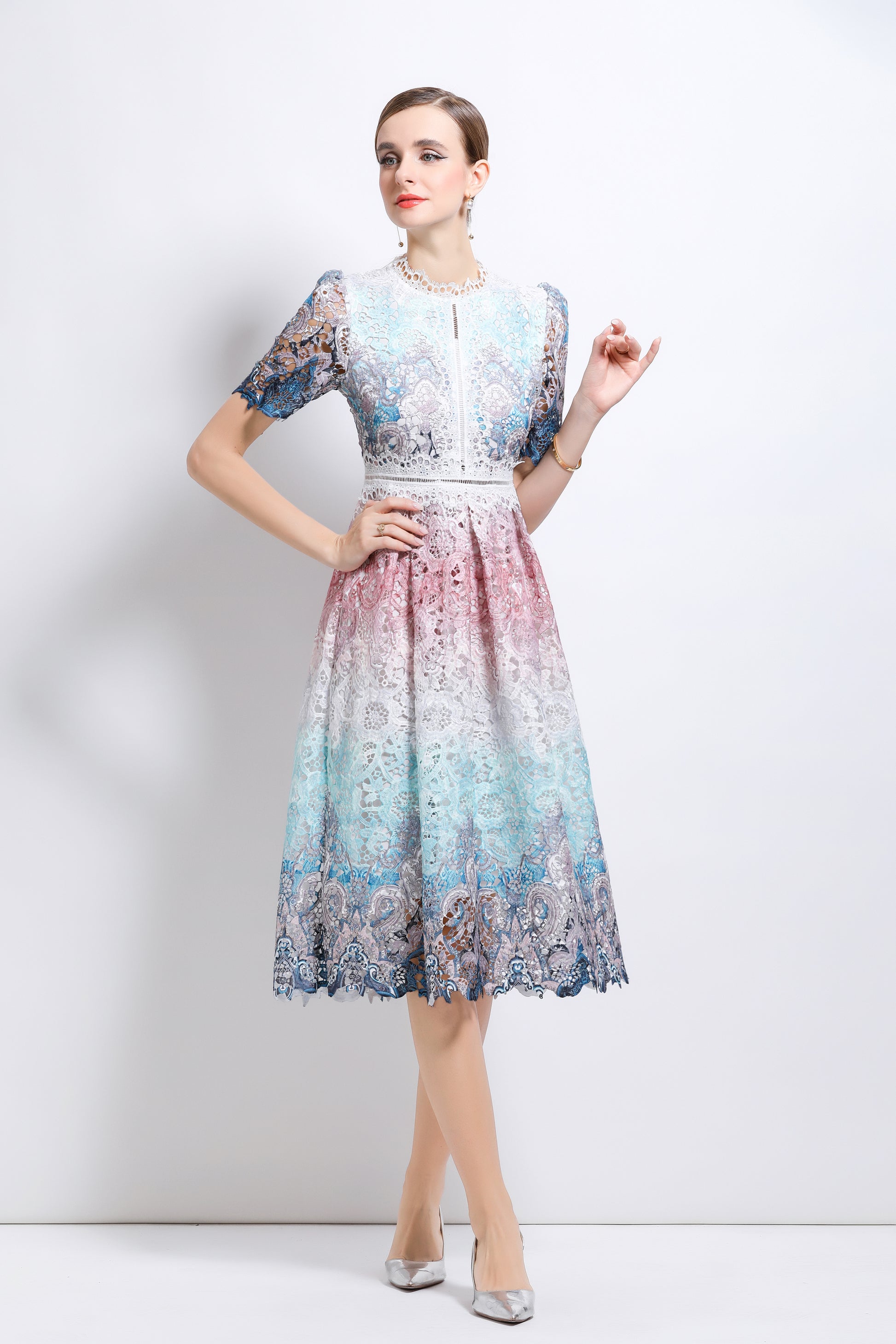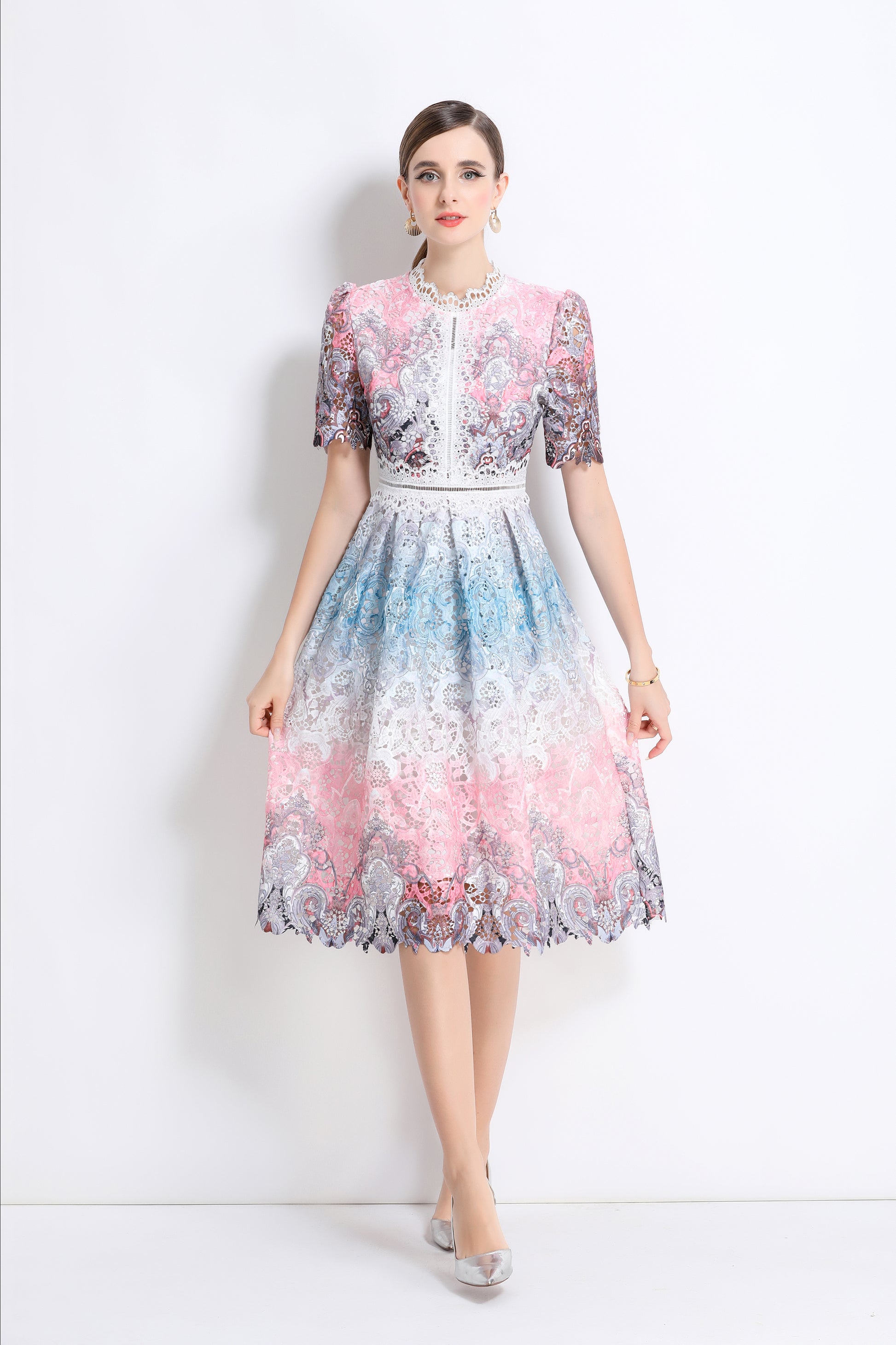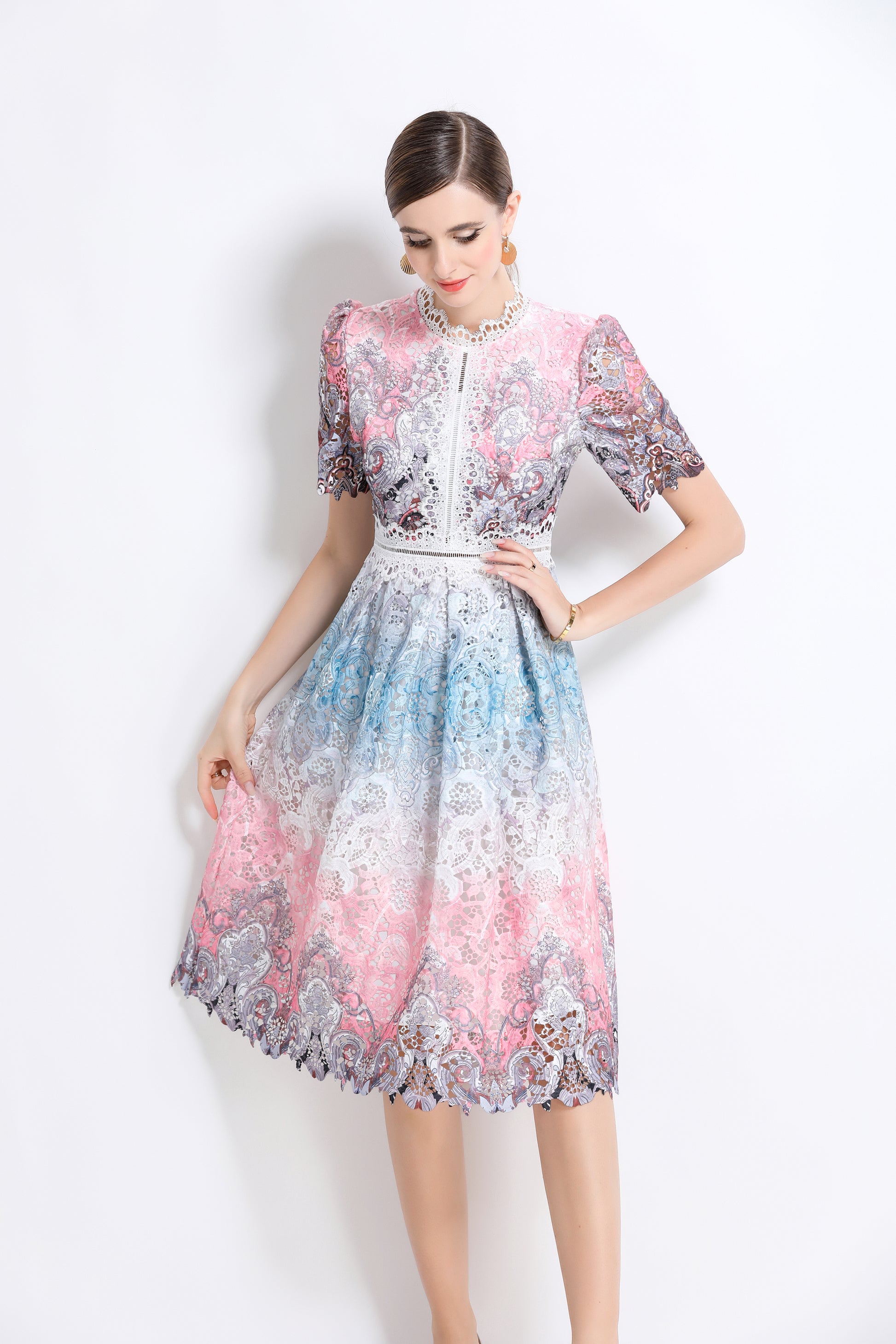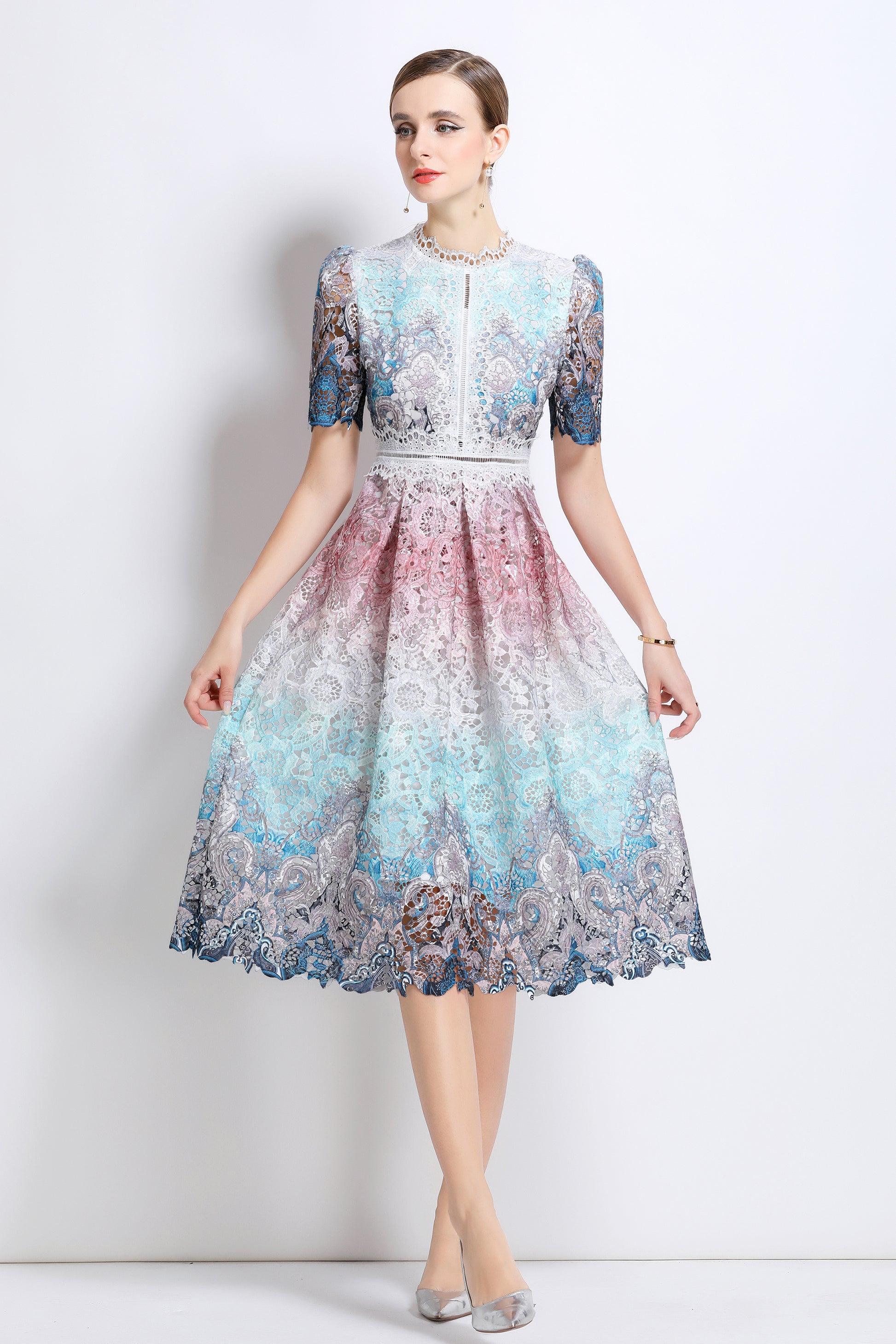 - Features: Lace fabric, hollow floral pattern all over, round neck with lace trim, short sleeves with petal edges, crochet waist, concealed zipper closure at back, flowing petal edge dress,A line swing dress make you more feminine.