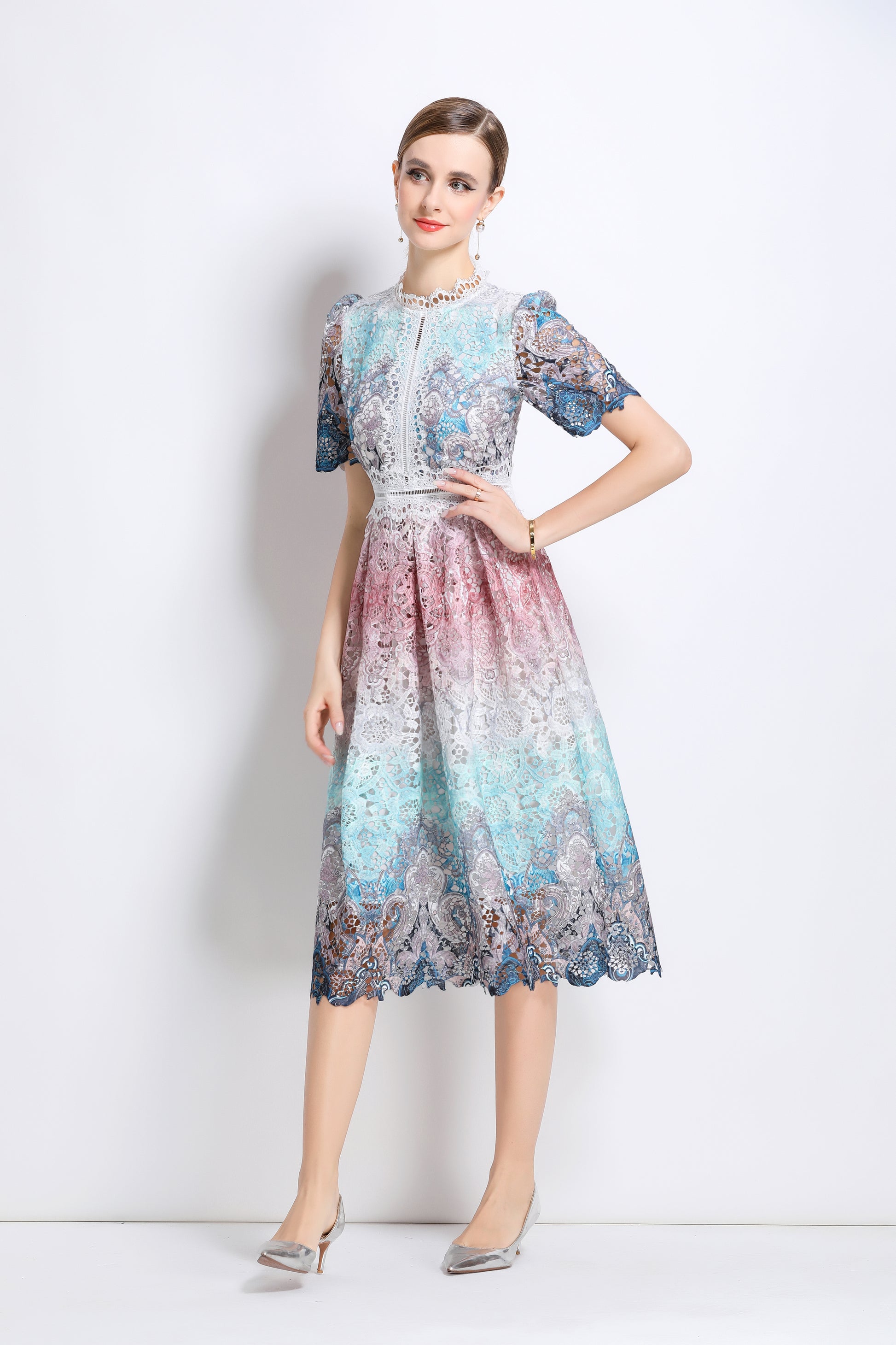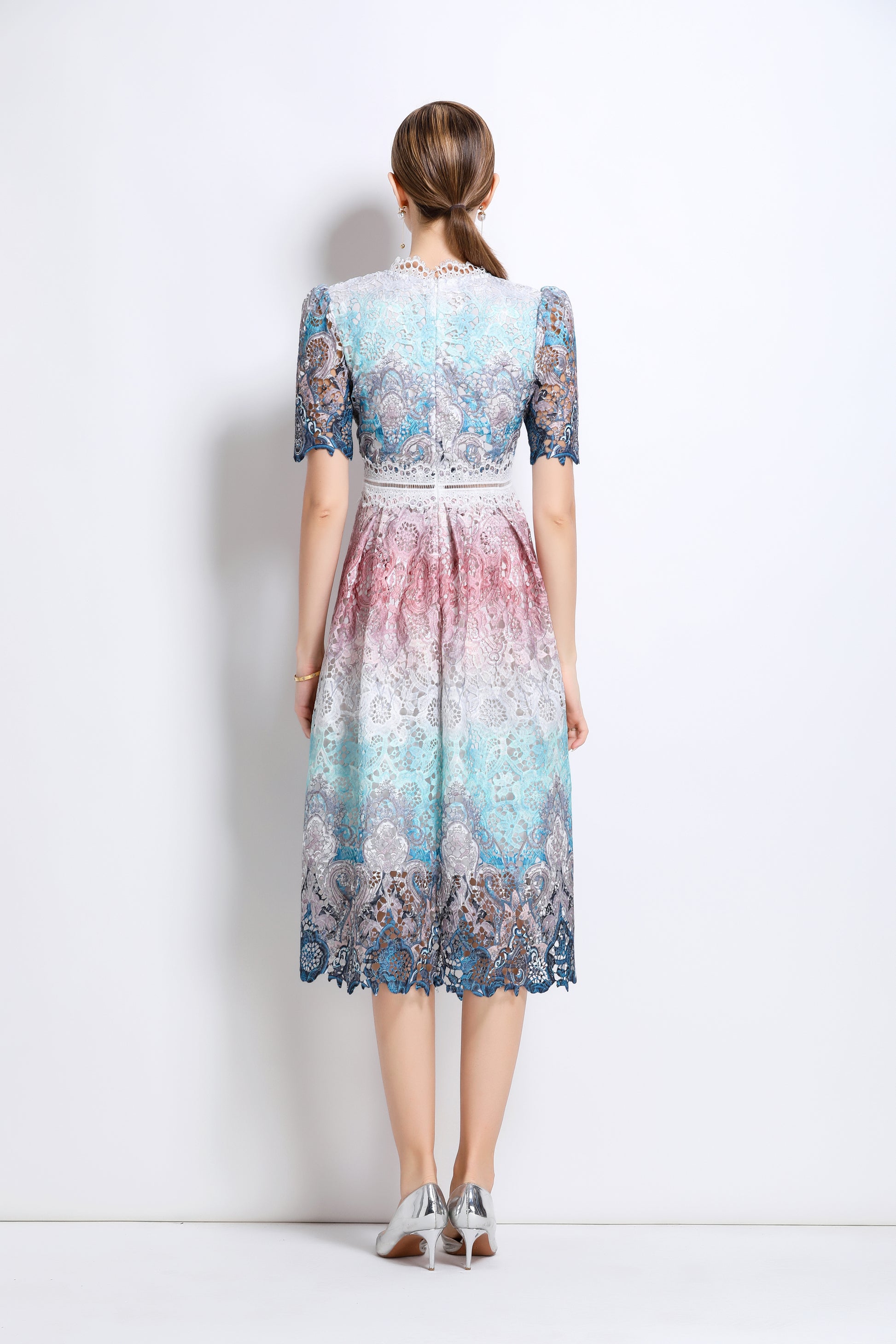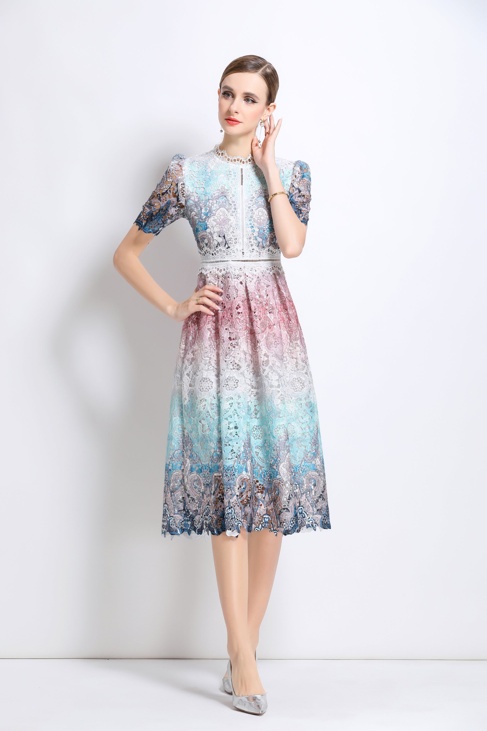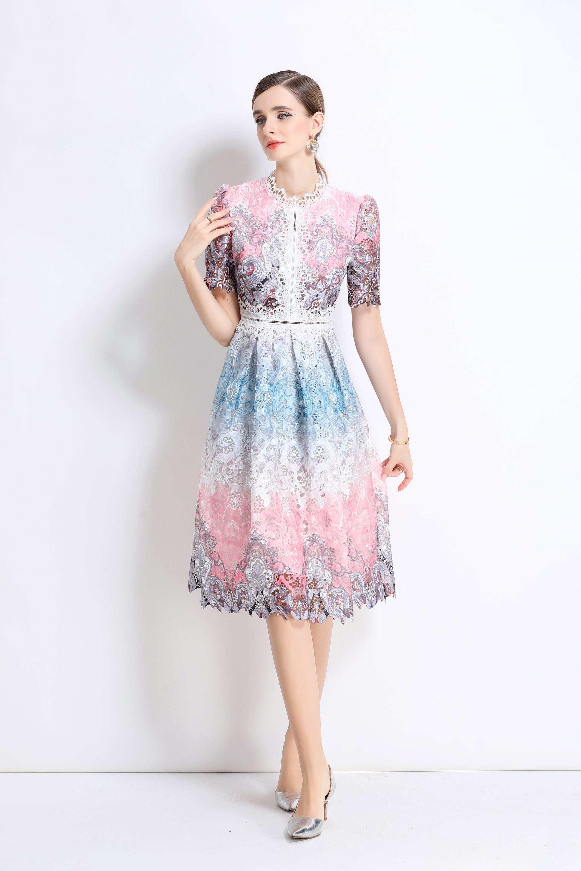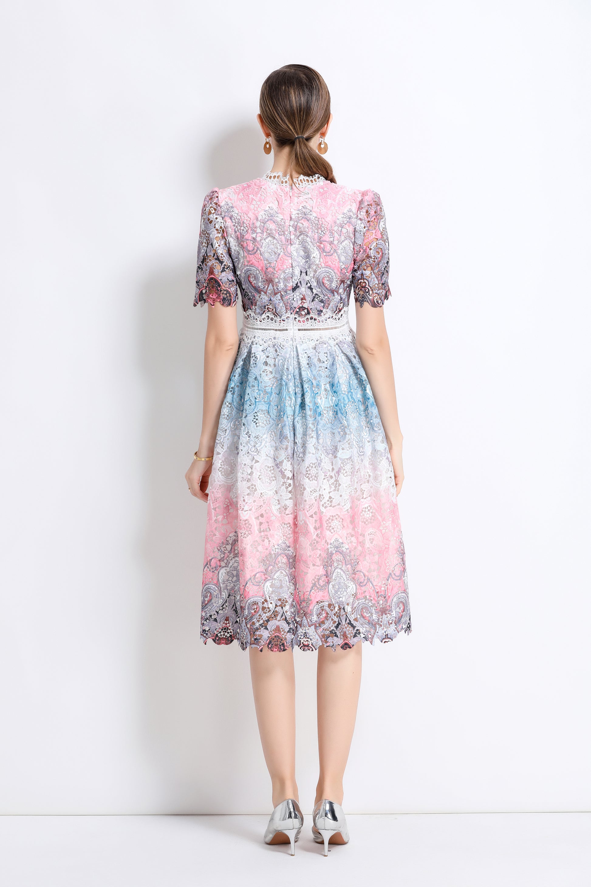 - Features: Lace fabric, hollow floral pattern all over, round neck with lace trim, short sleeves with petal edges, crochet waist, concealed zipper closure at back, flowing petal edge dress,A line swing dress make you more feminine.