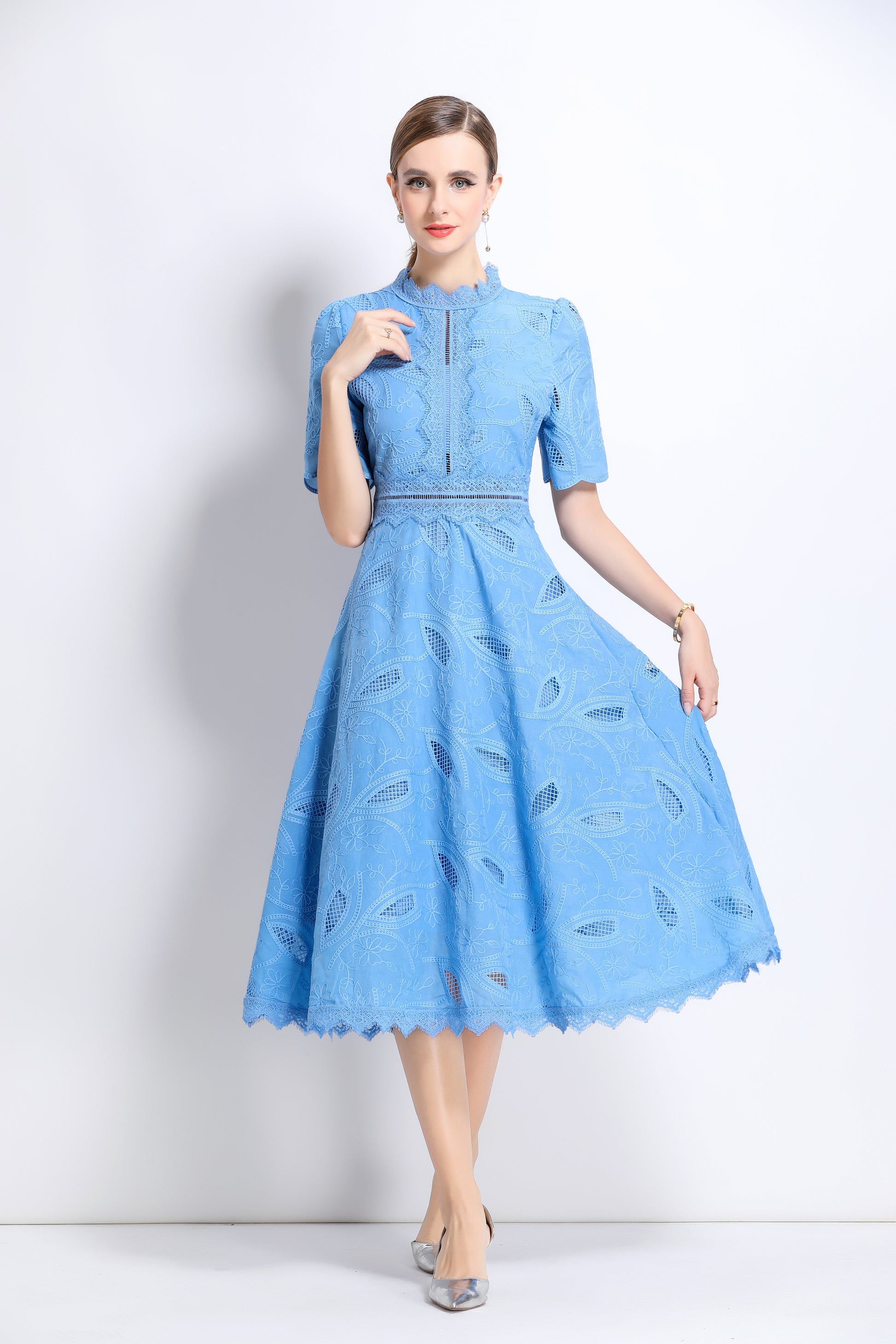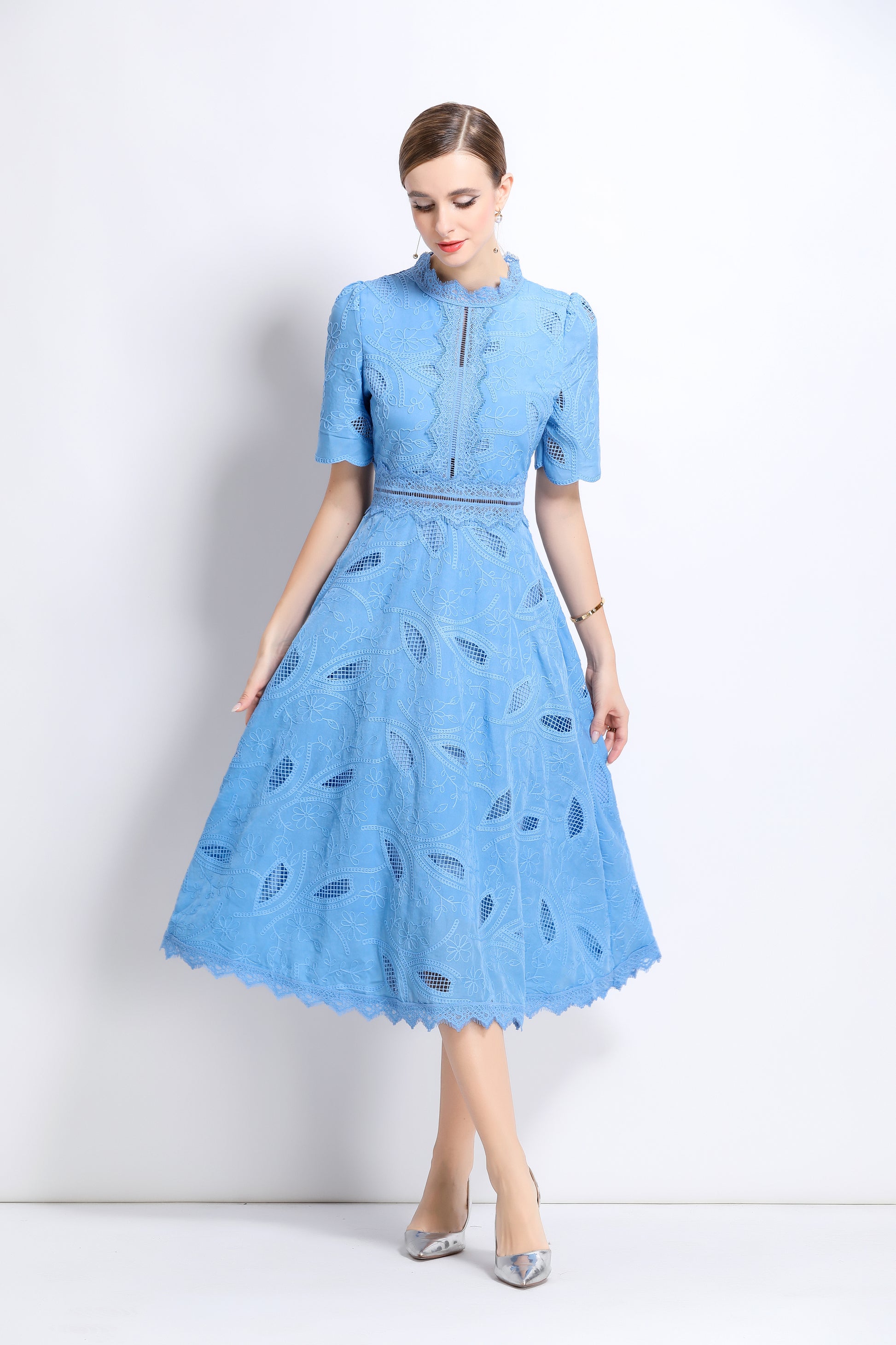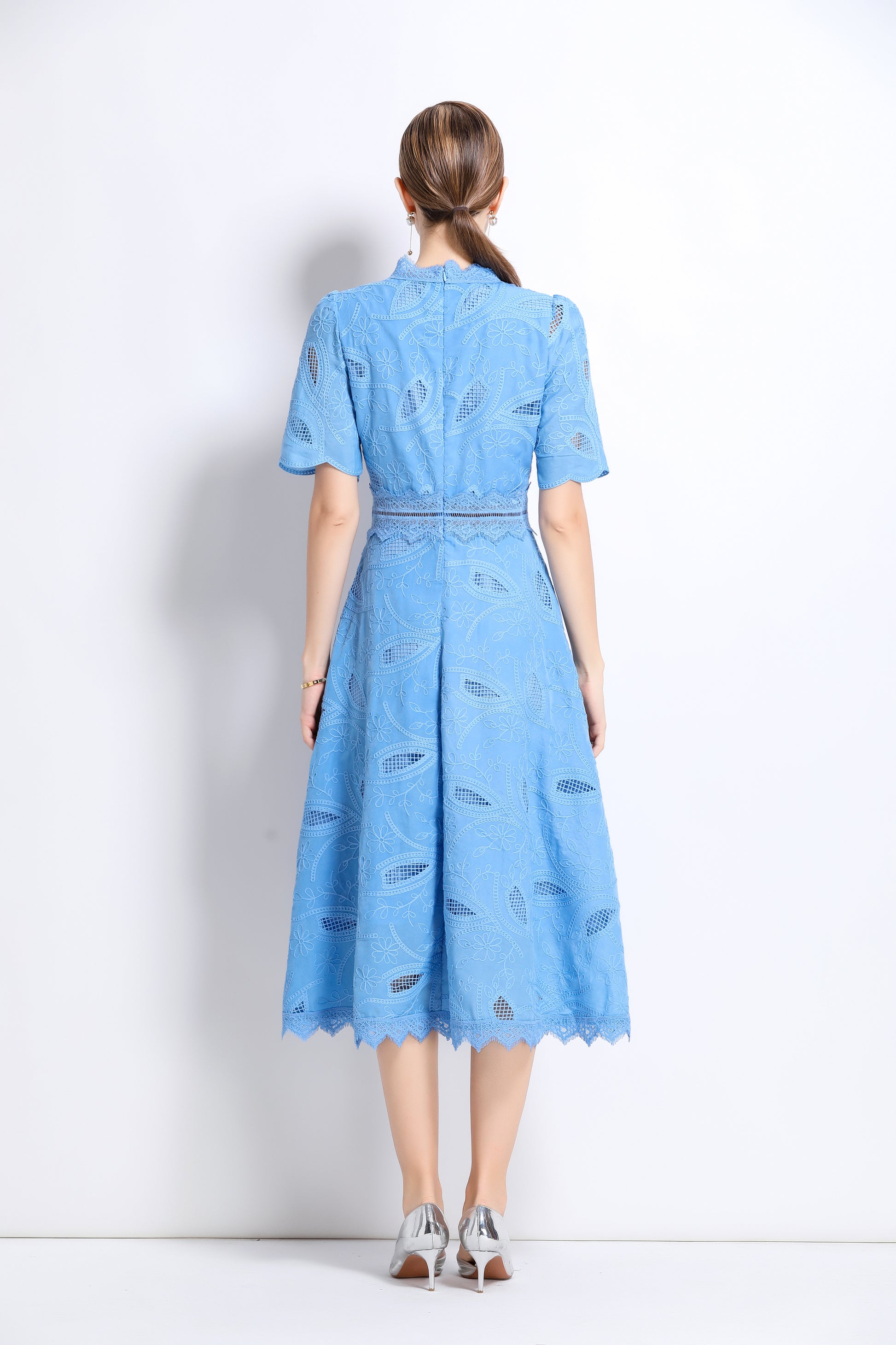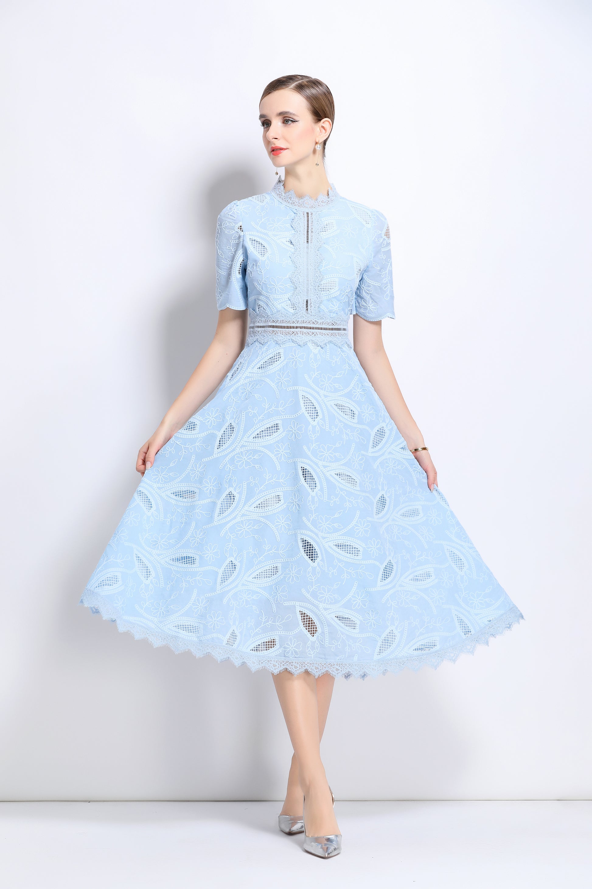 - Features: Short sleeves, hollow out, lace, embroidery, round neck, back zipper, waist crochet, A-line, midi dress.