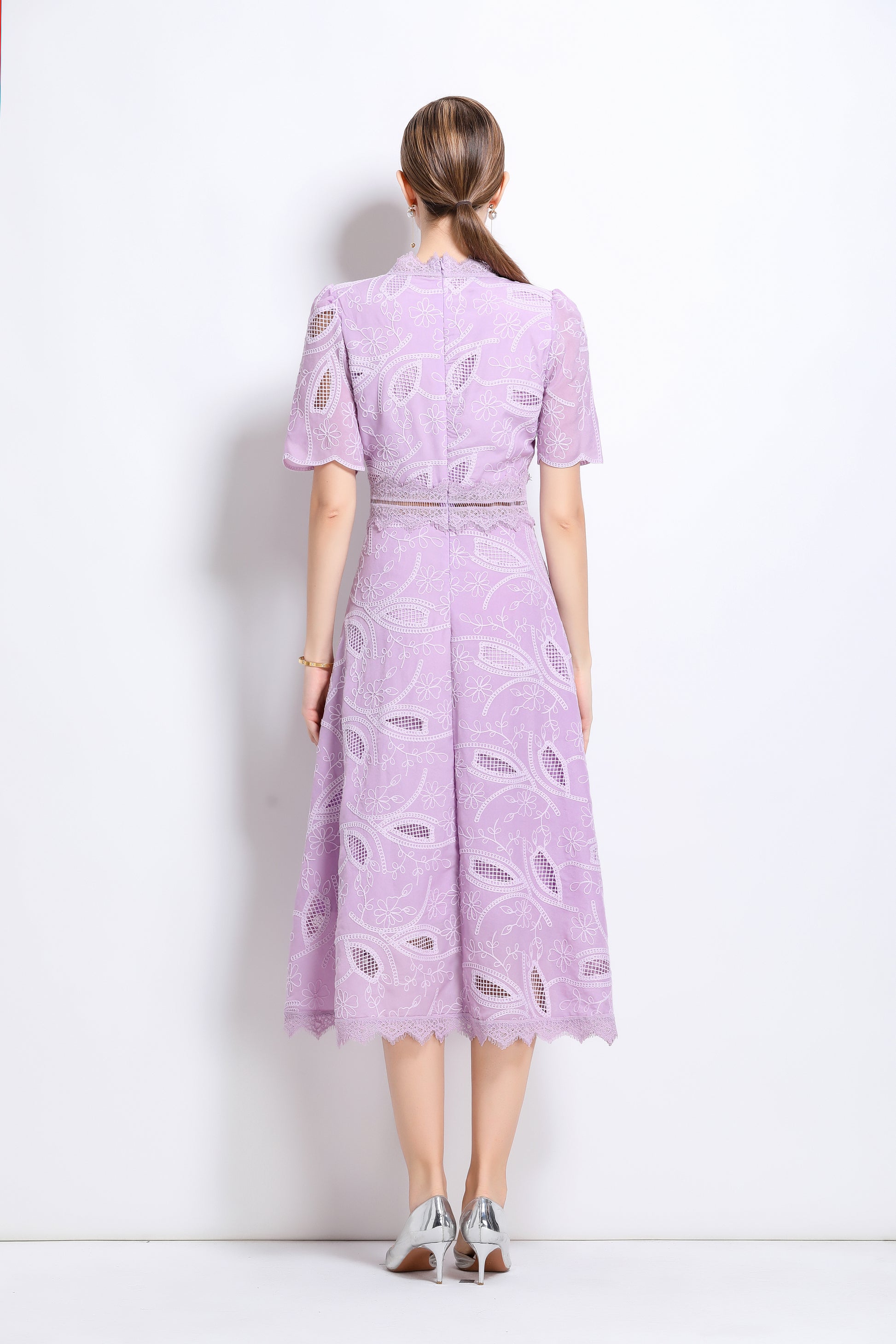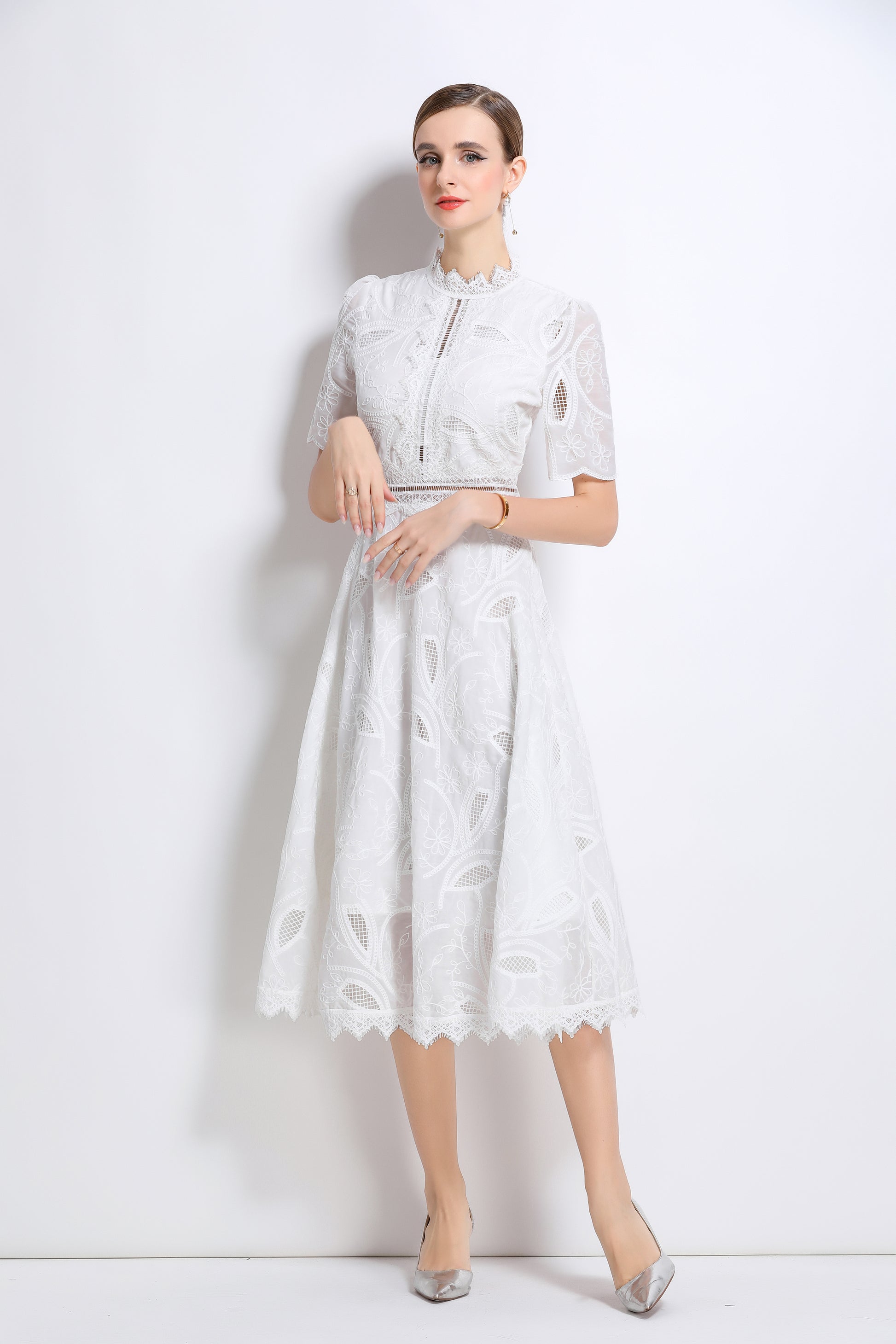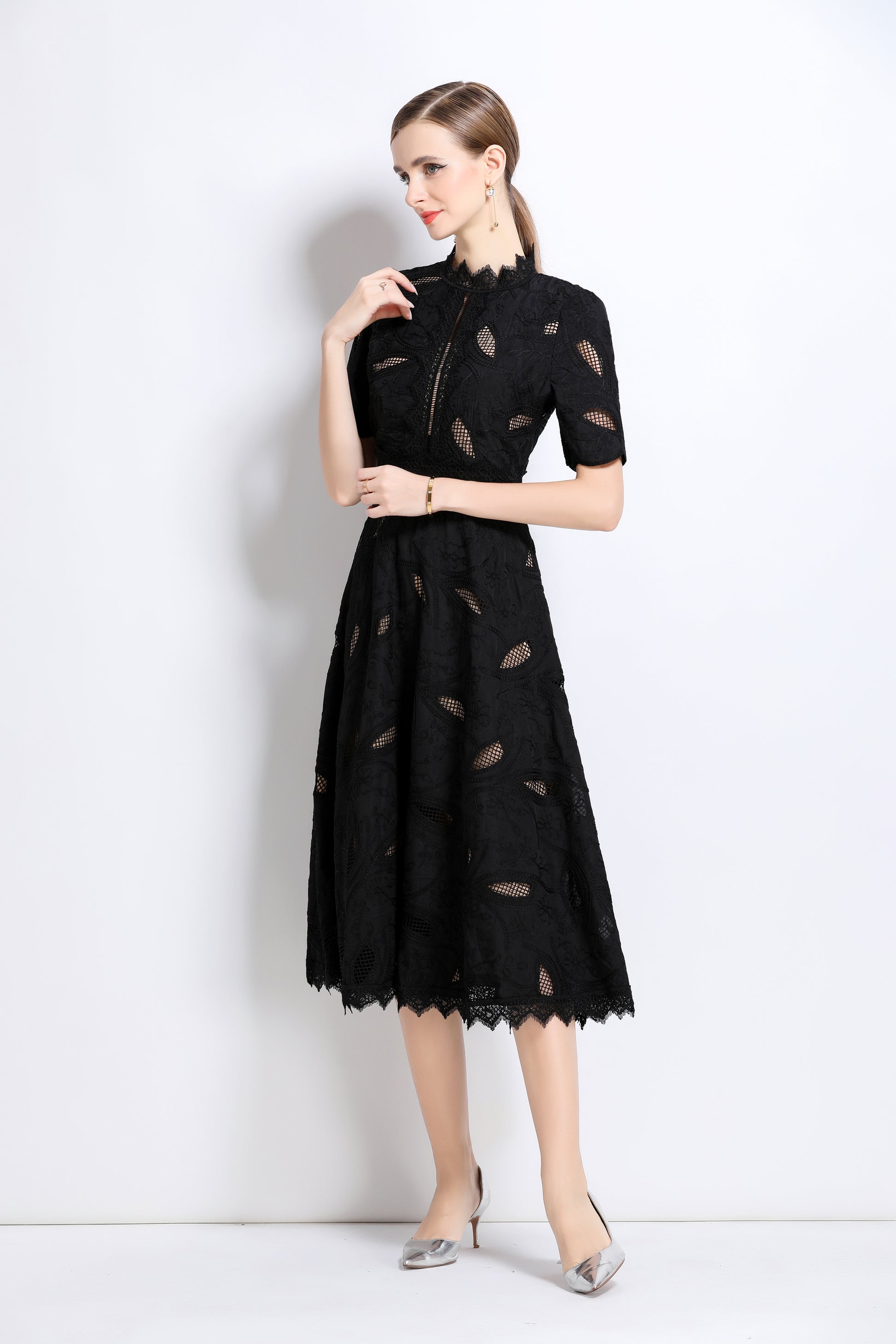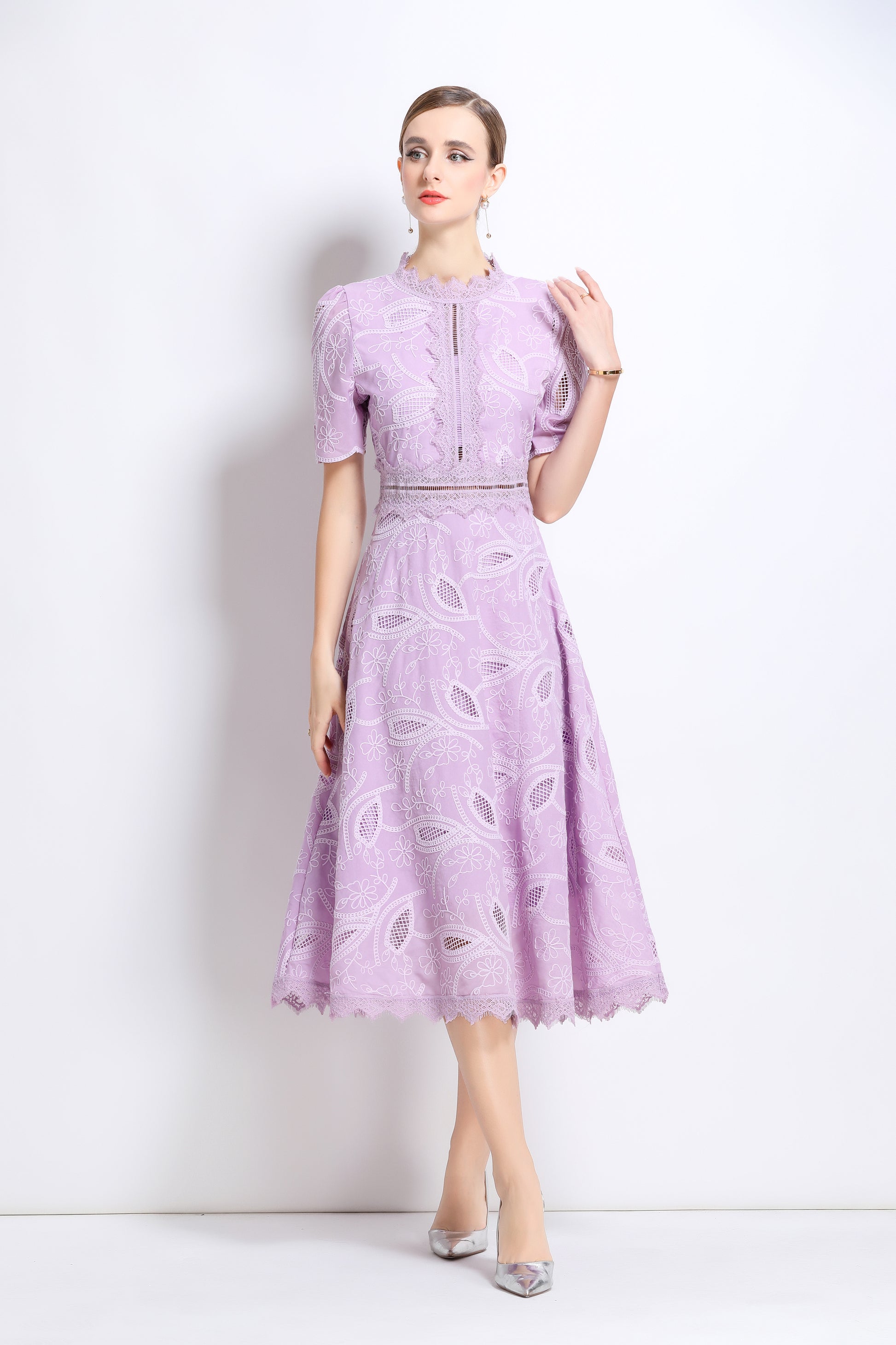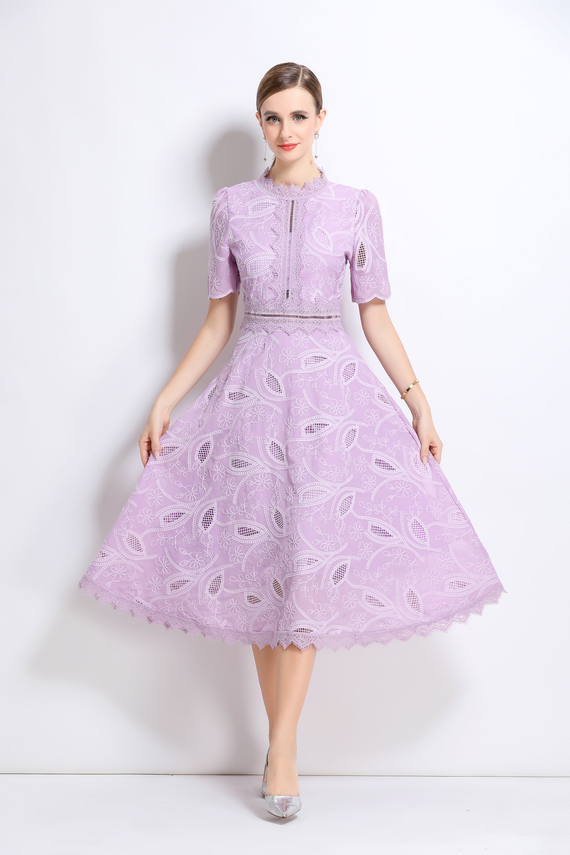 - Features: Short sleeves, hollow out, lace, embroidery, round neck, back zipper, waist crochet, A-line, midi dress.