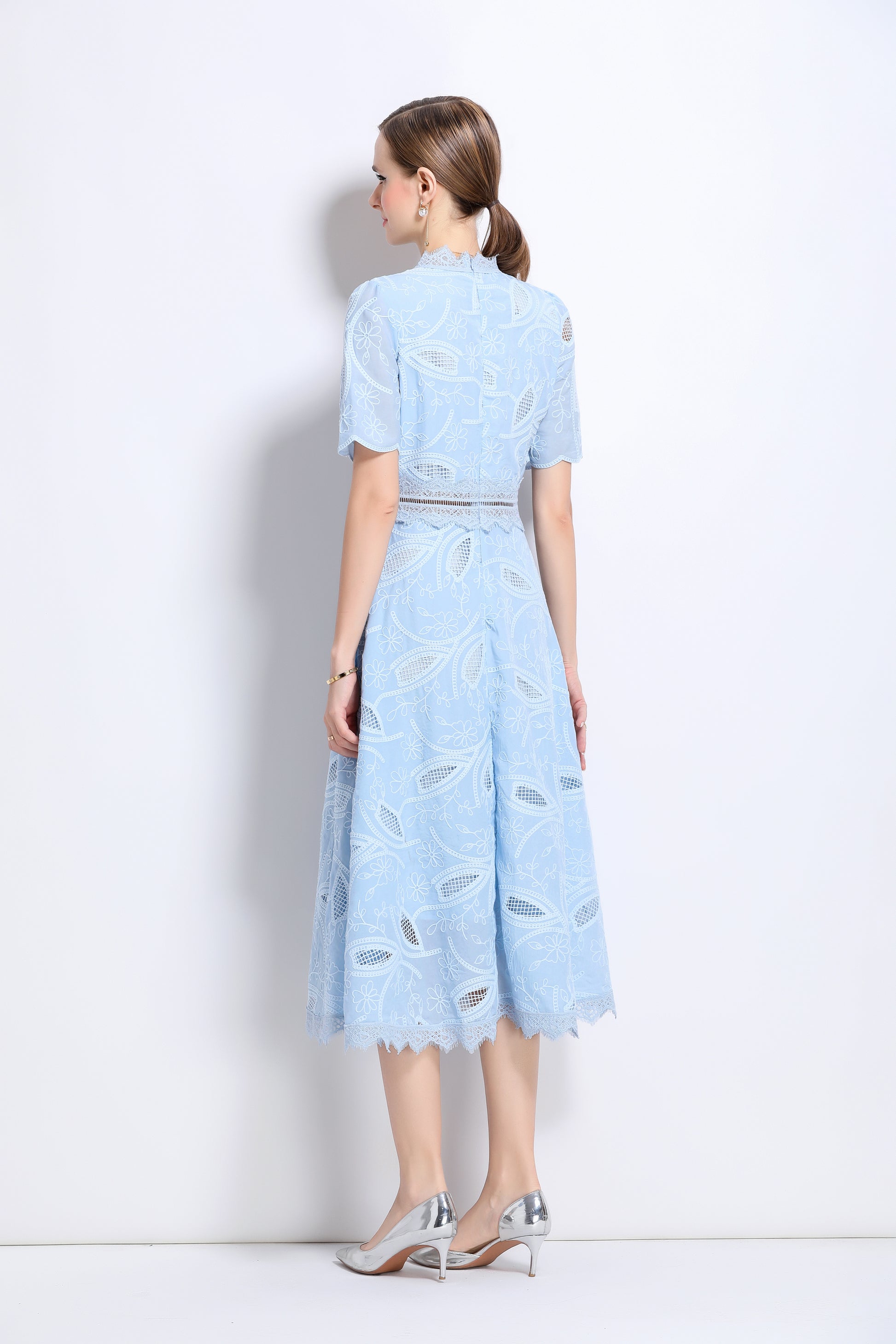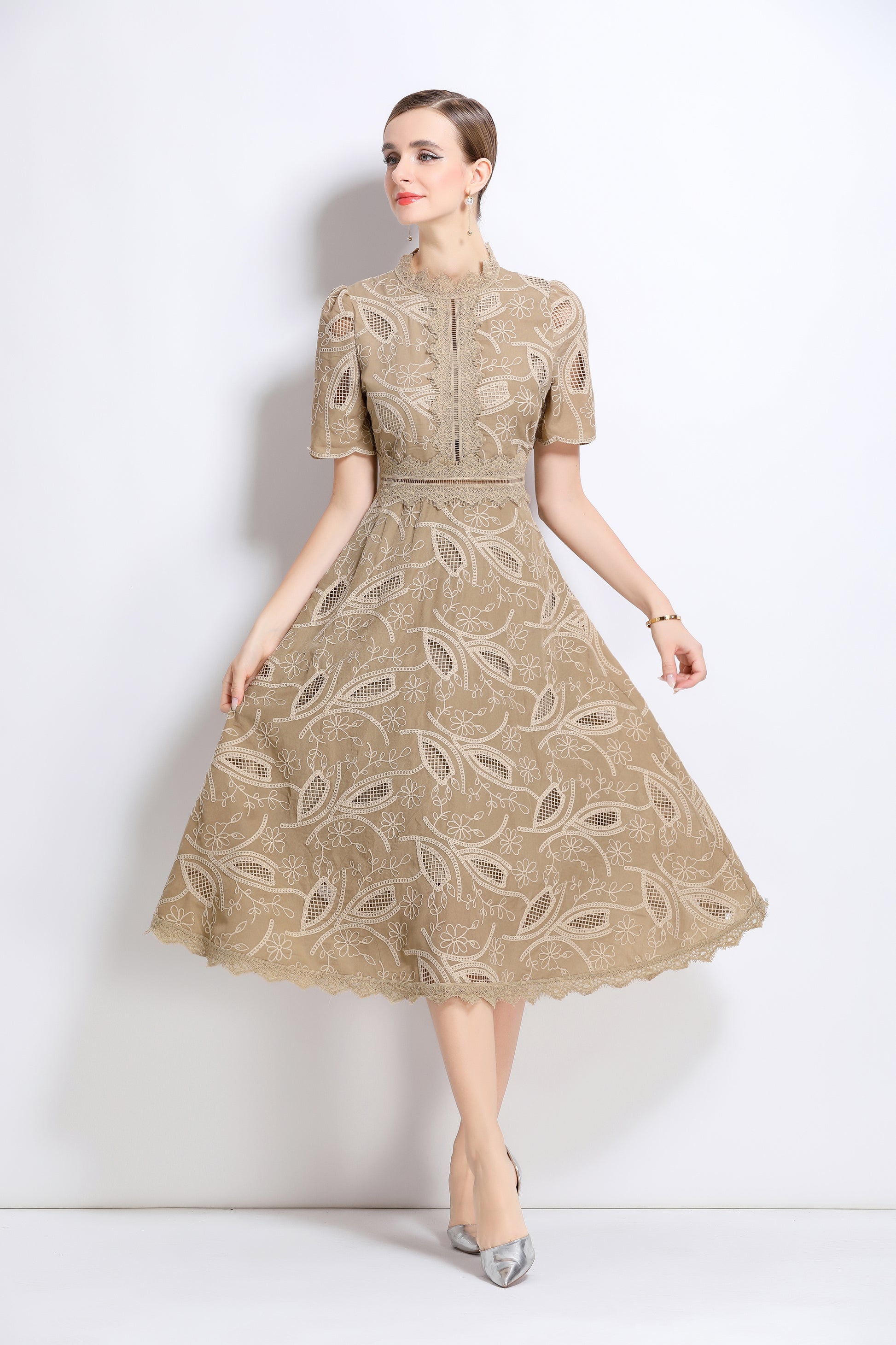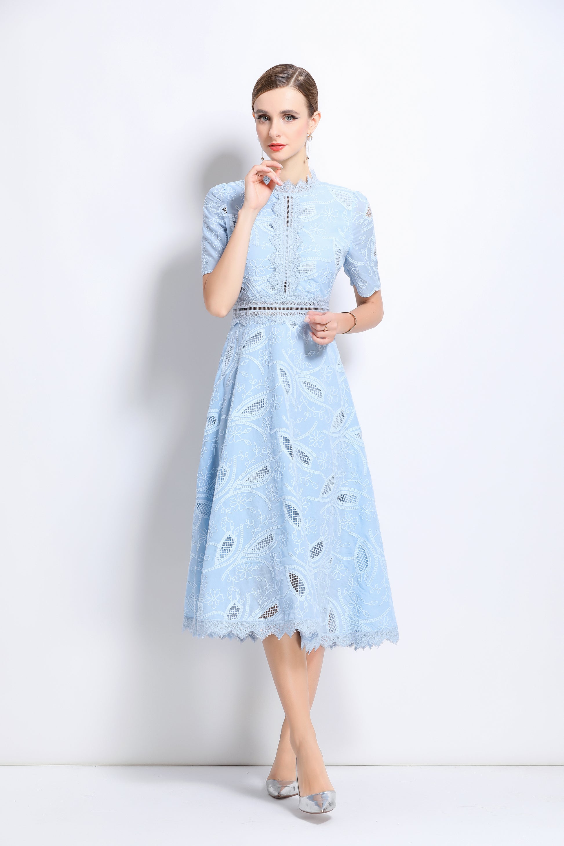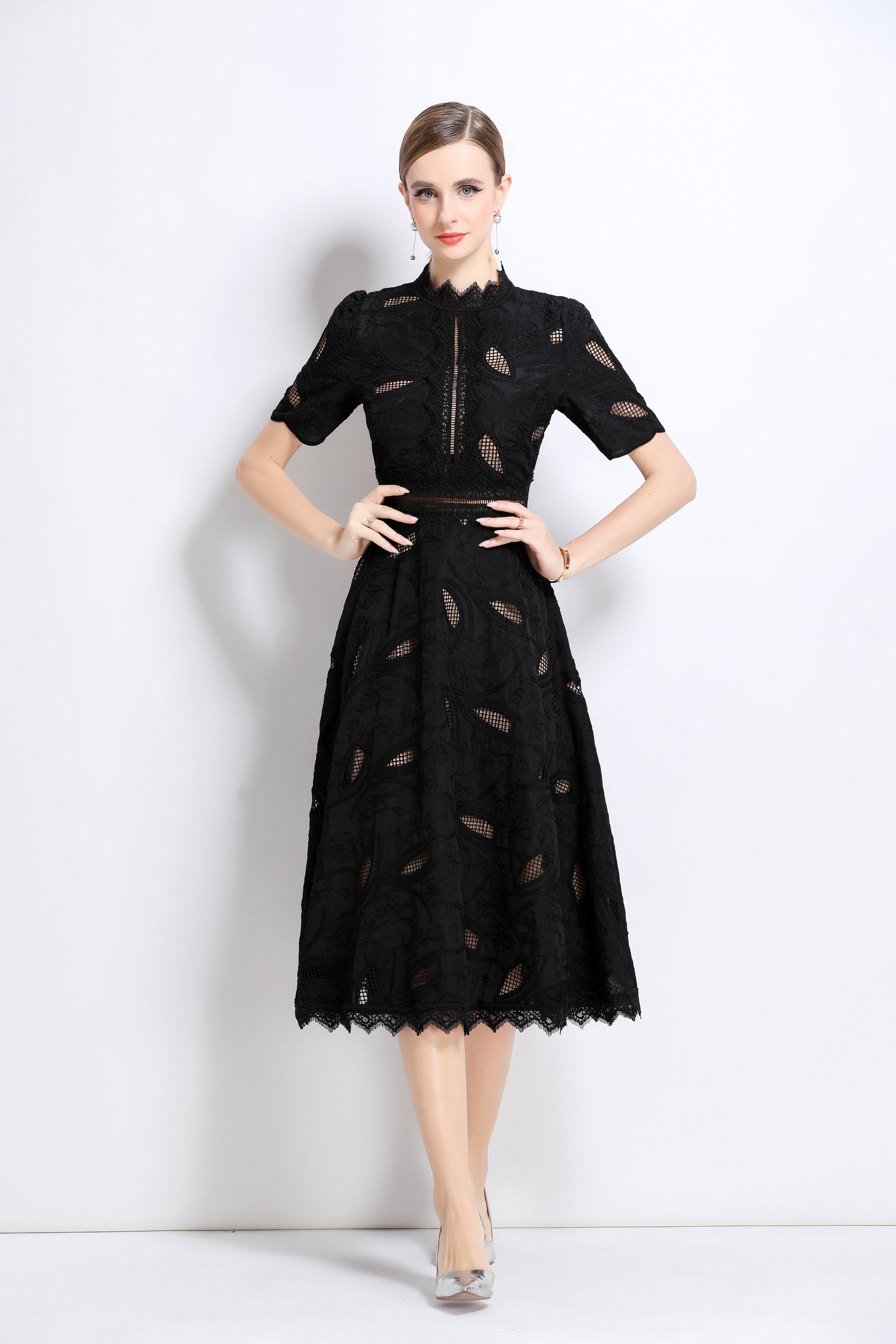 - Features: Short sleeves, hollow out, lace, embroidery, round neck, back zipper, waist crochet, A-line, midi dress.