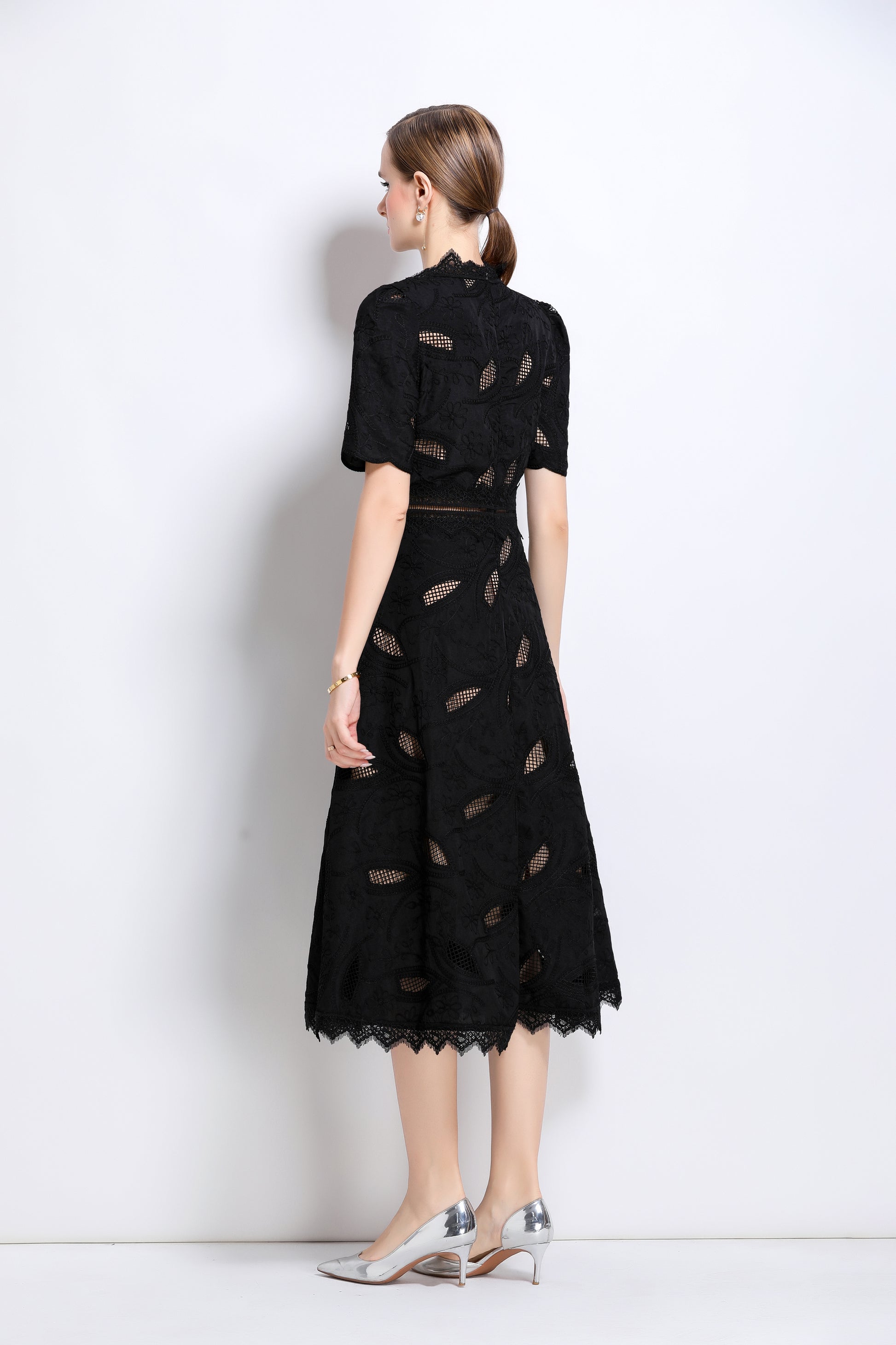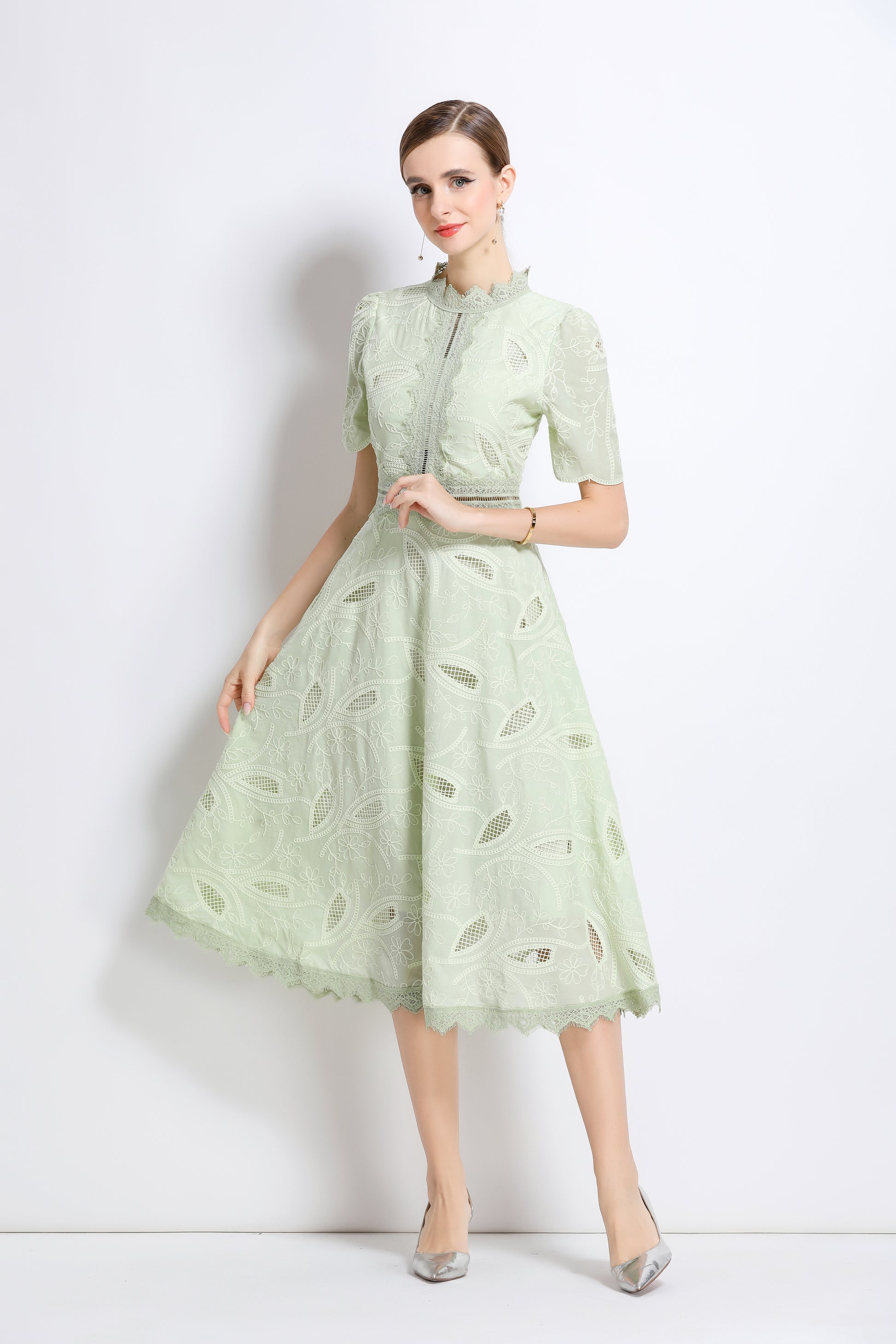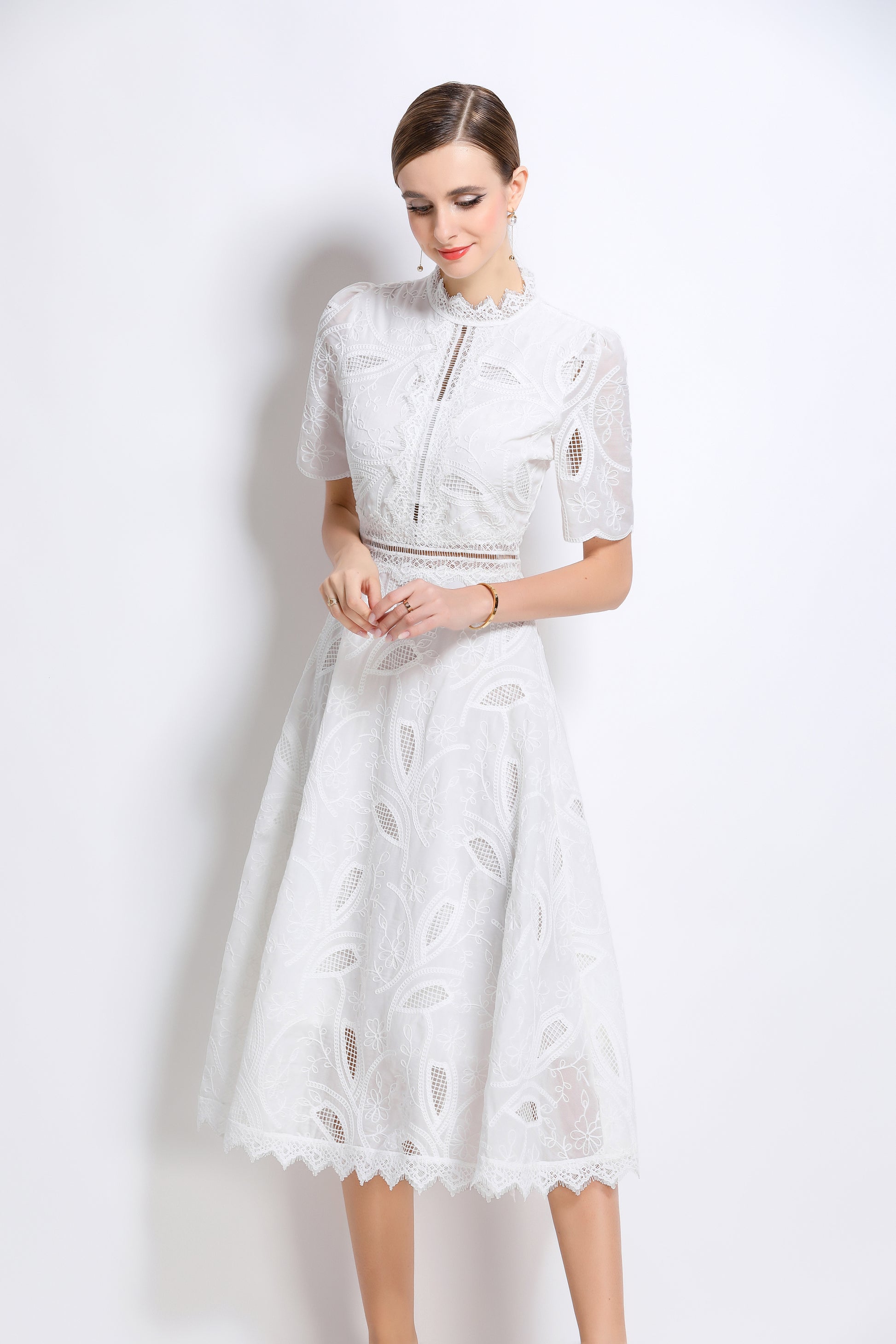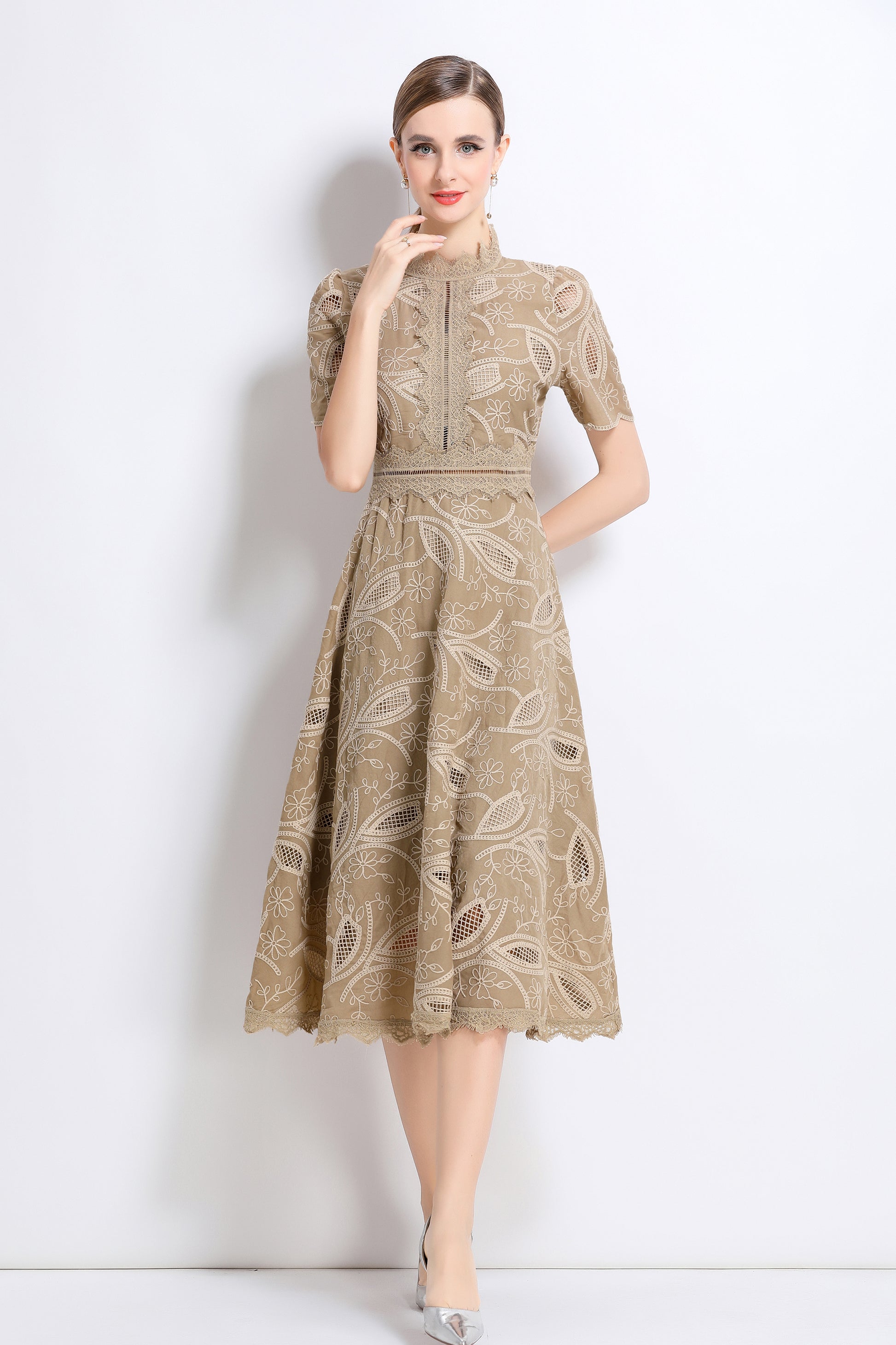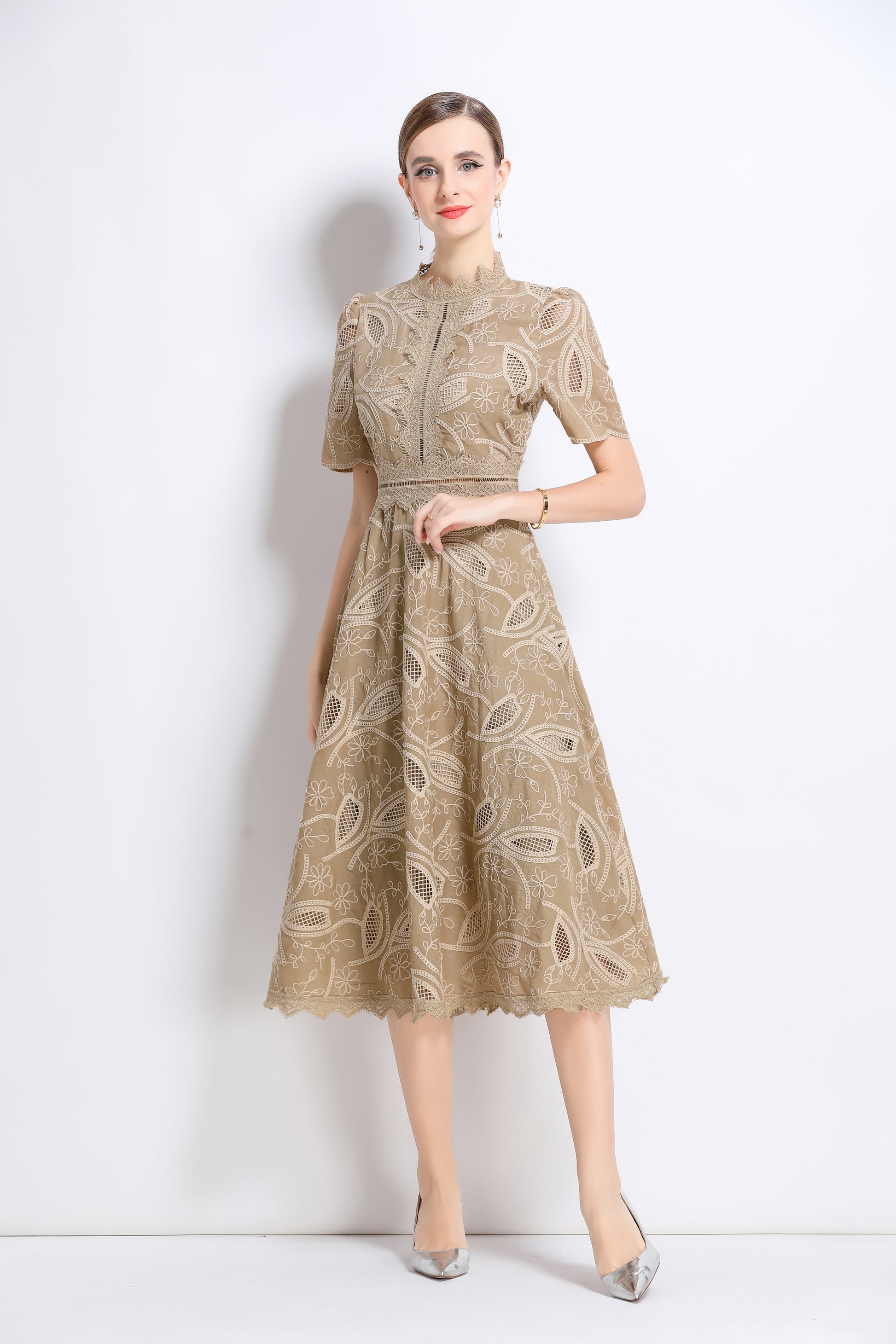 - Features: Short sleeves, hollow out, lace, embroidery, round neck, back zipper, waist crochet, A-line, midi dress.