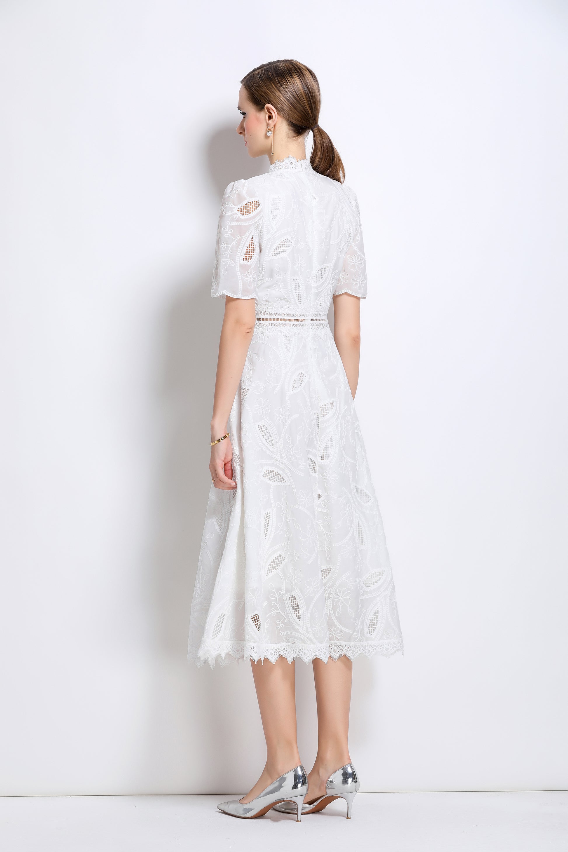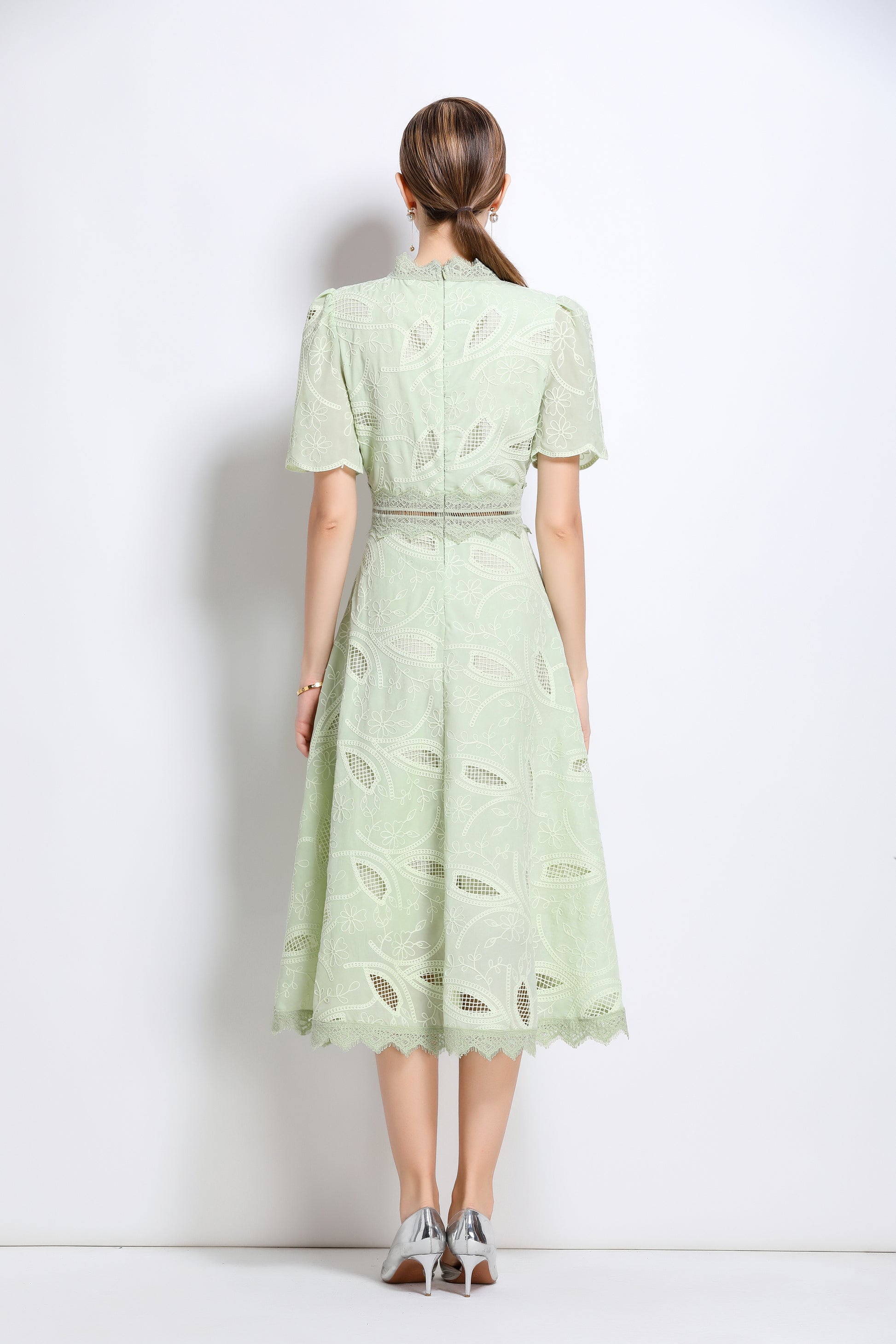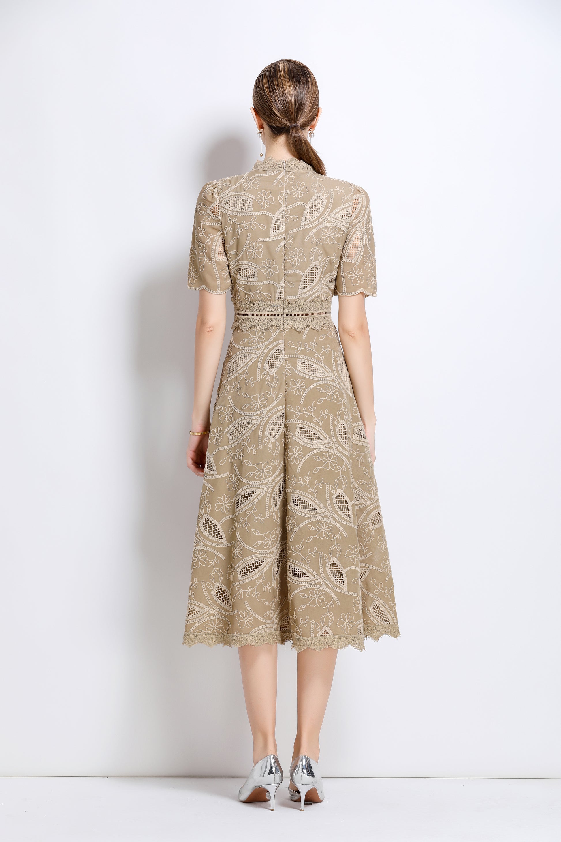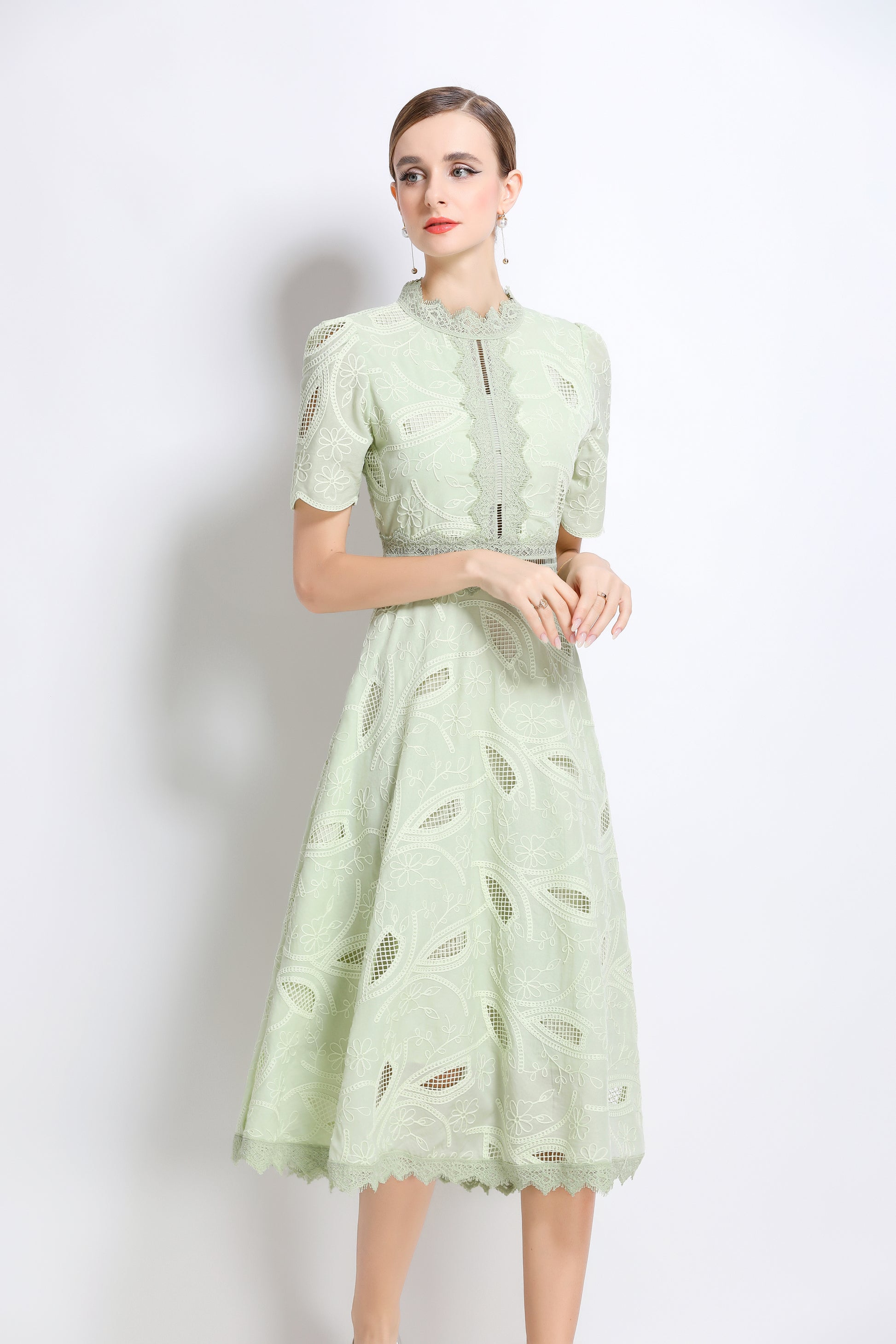 - Features: Short sleeves, hollow out, lace, embroidery, round neck, back zipper, waist crochet, A-line, midi dress.