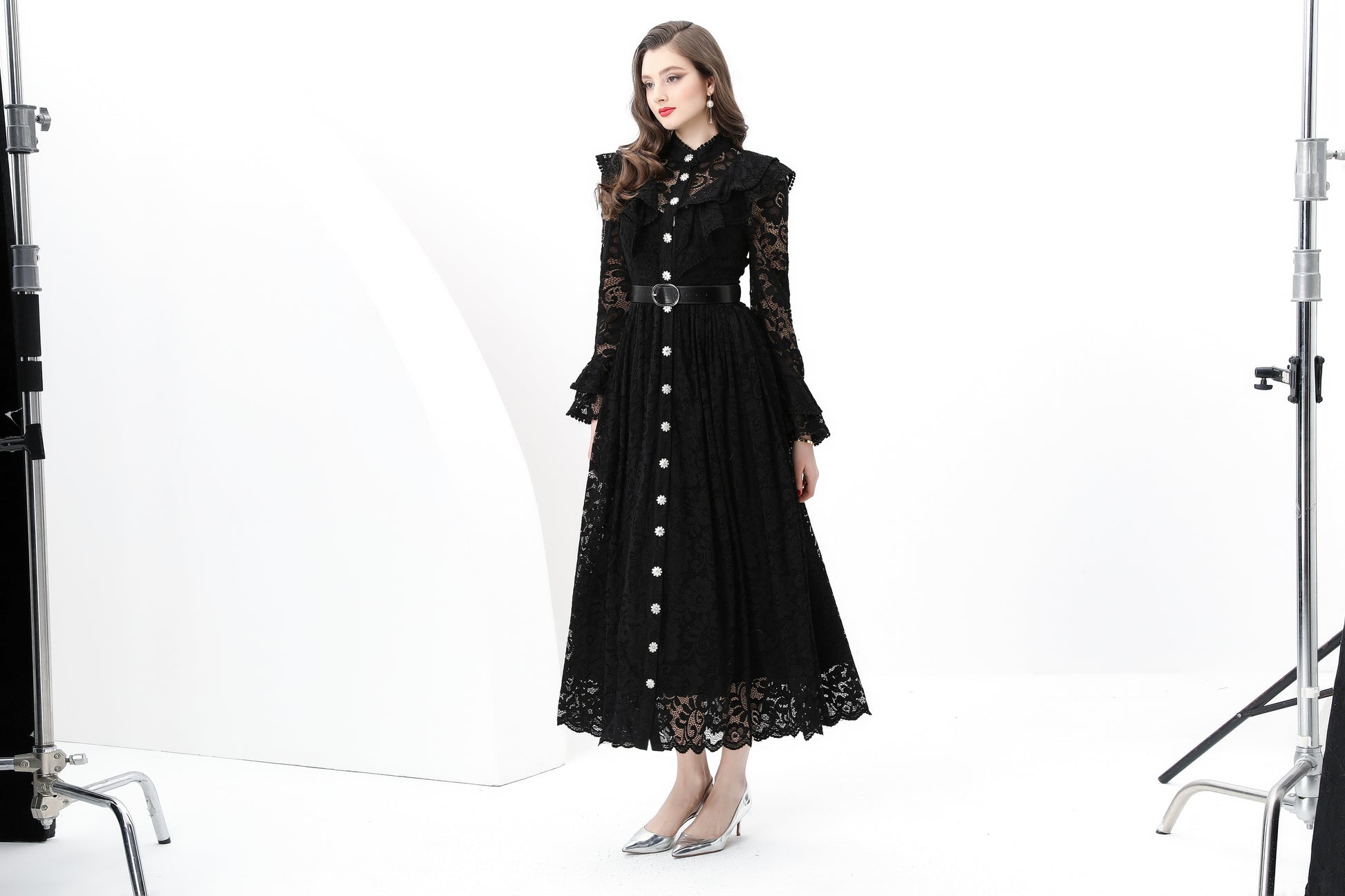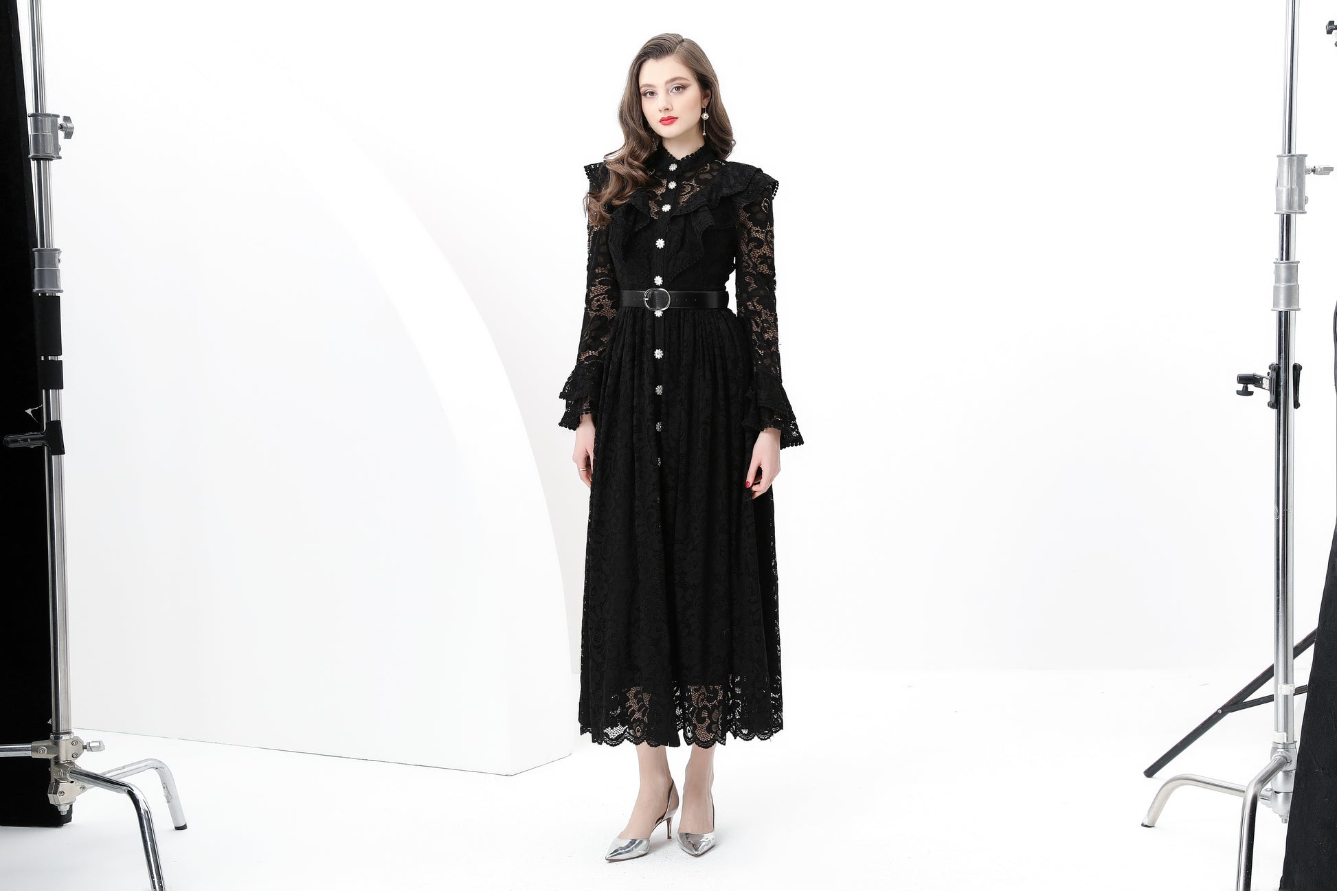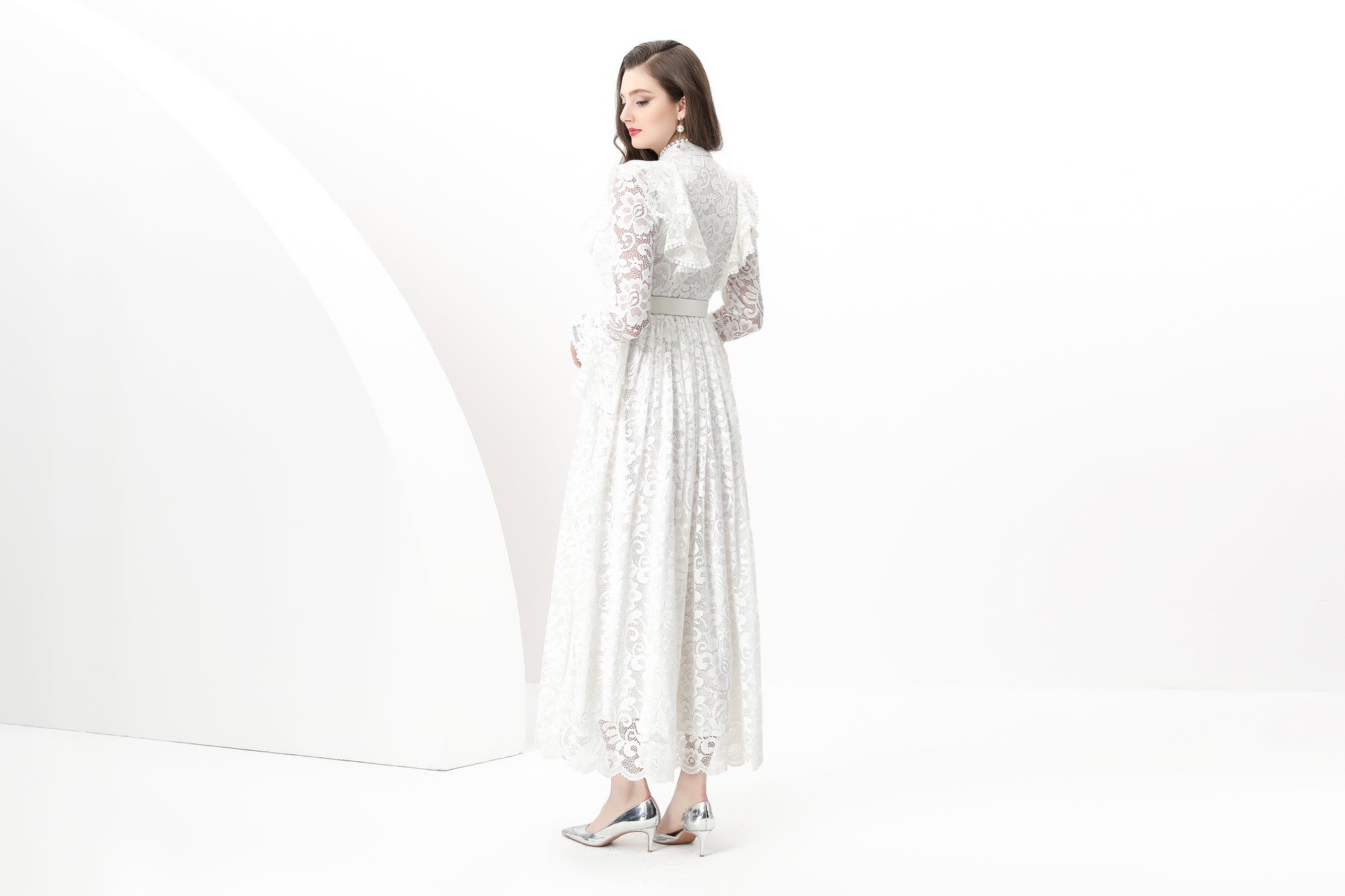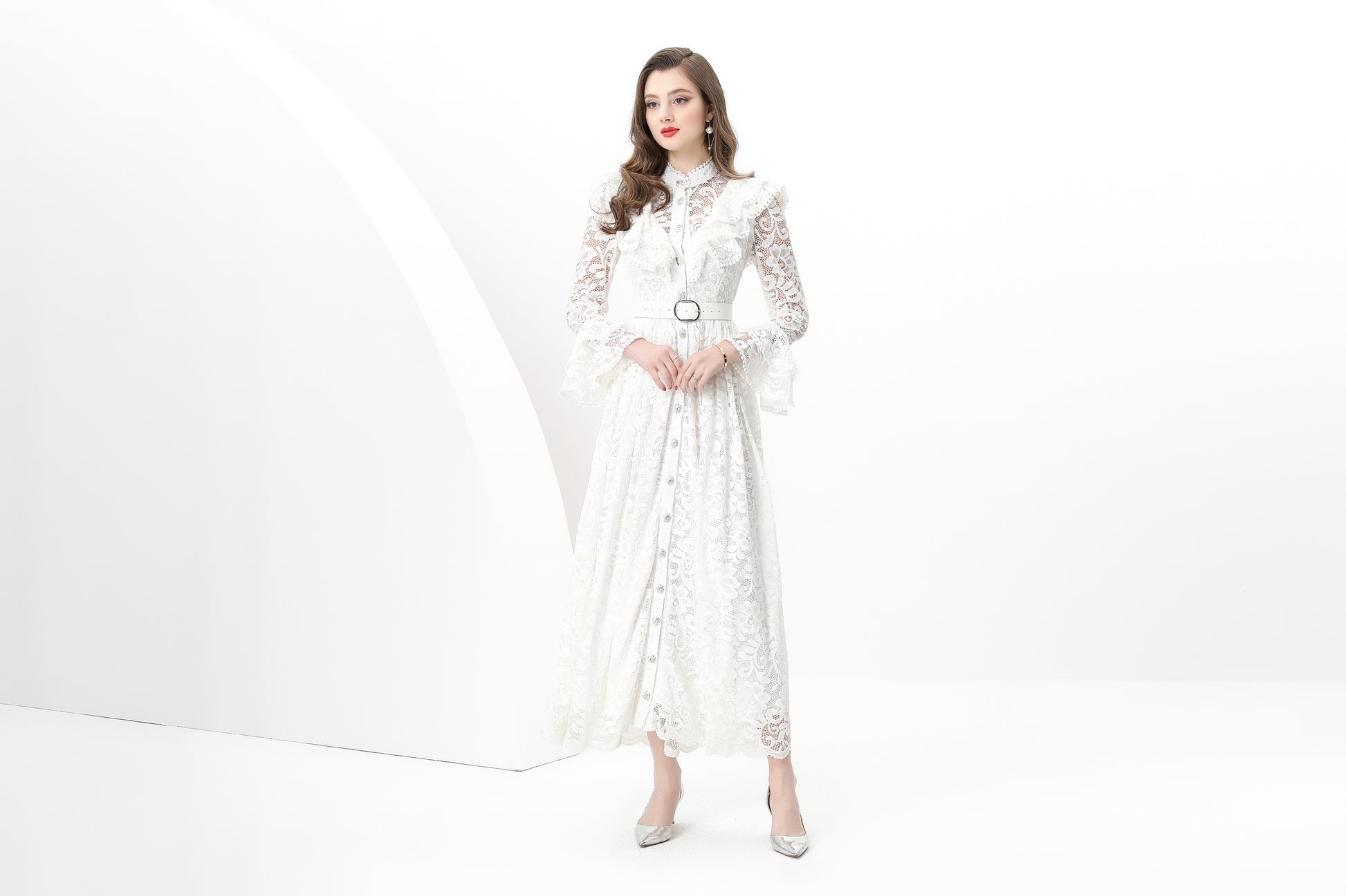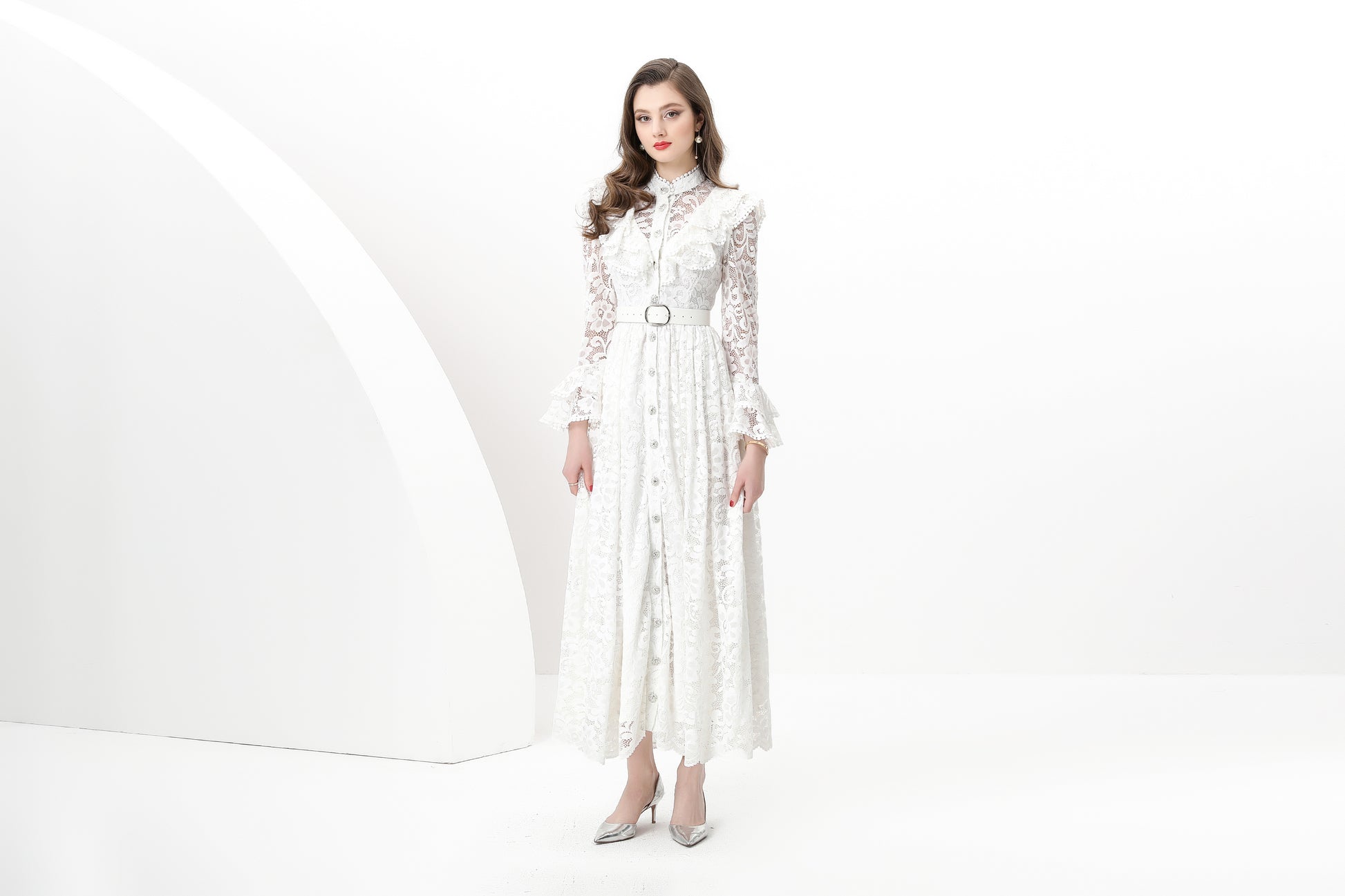 - Features: mandarin, front buttons, Lace fabric, Bell sleeves, Long sleeve design, ruffle design, Belt, Luxury style,maxi dress.