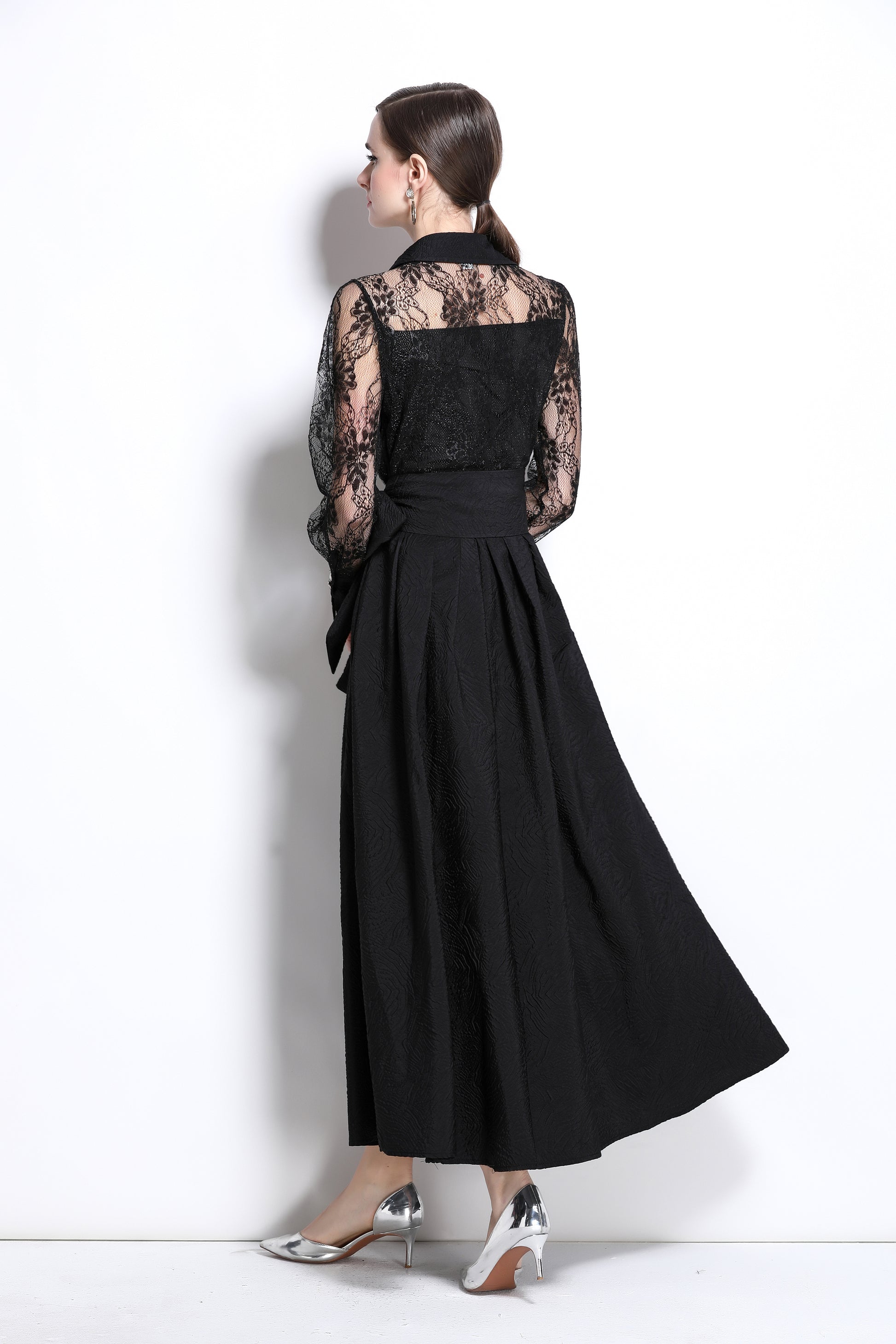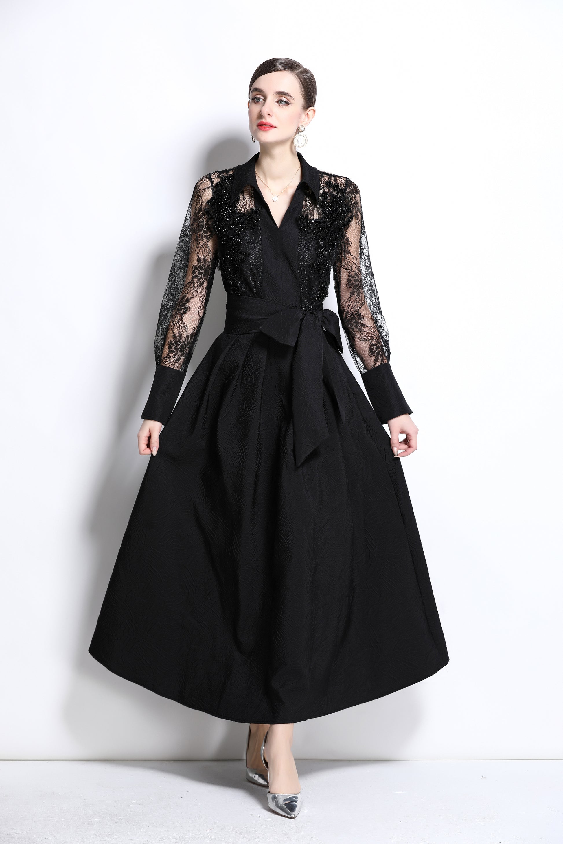 - Features: Collar V-neck, mesh embroidery, Fabric stitching, lace long sleeve, flash bead, jacquard texture, side zipper, belt, maxi dress.