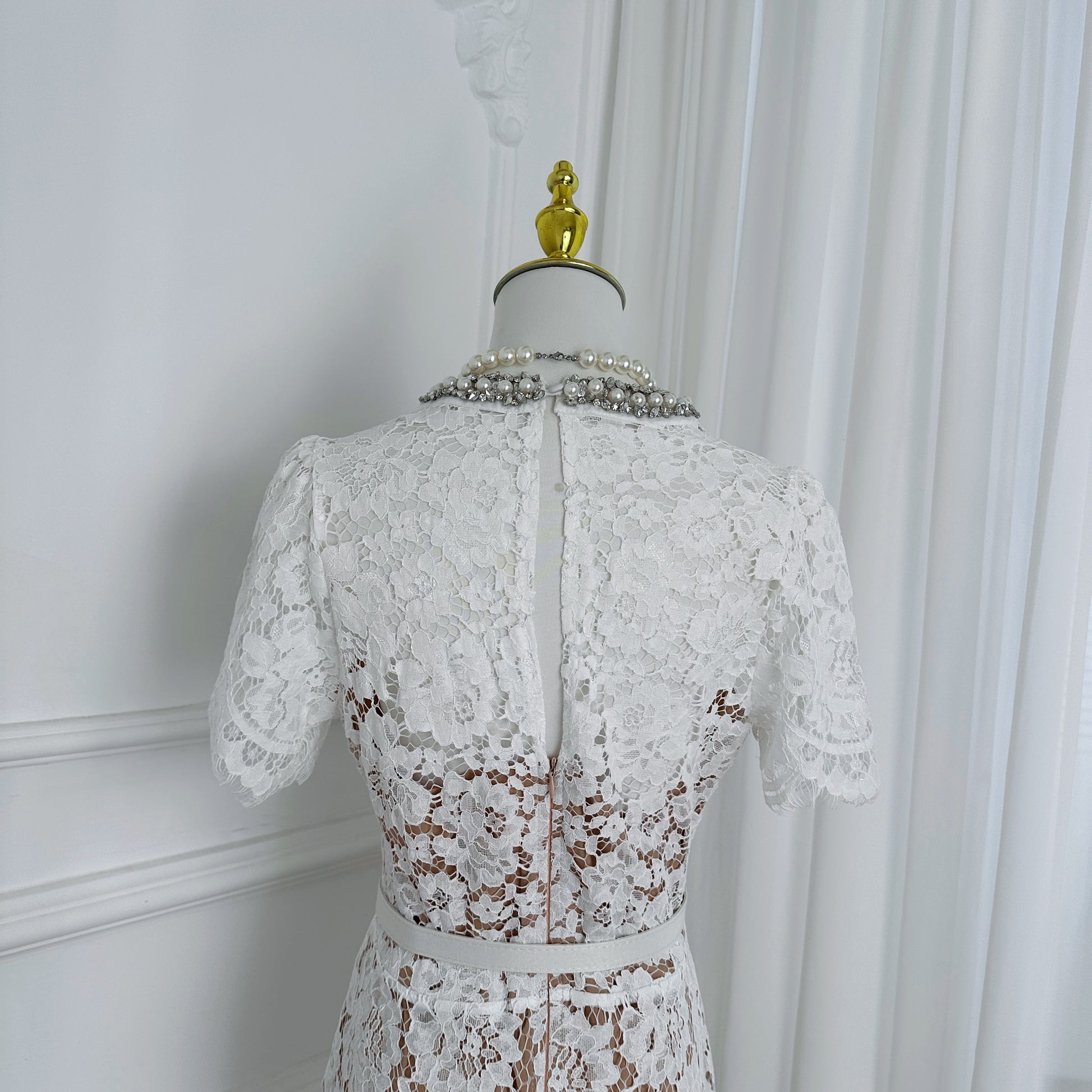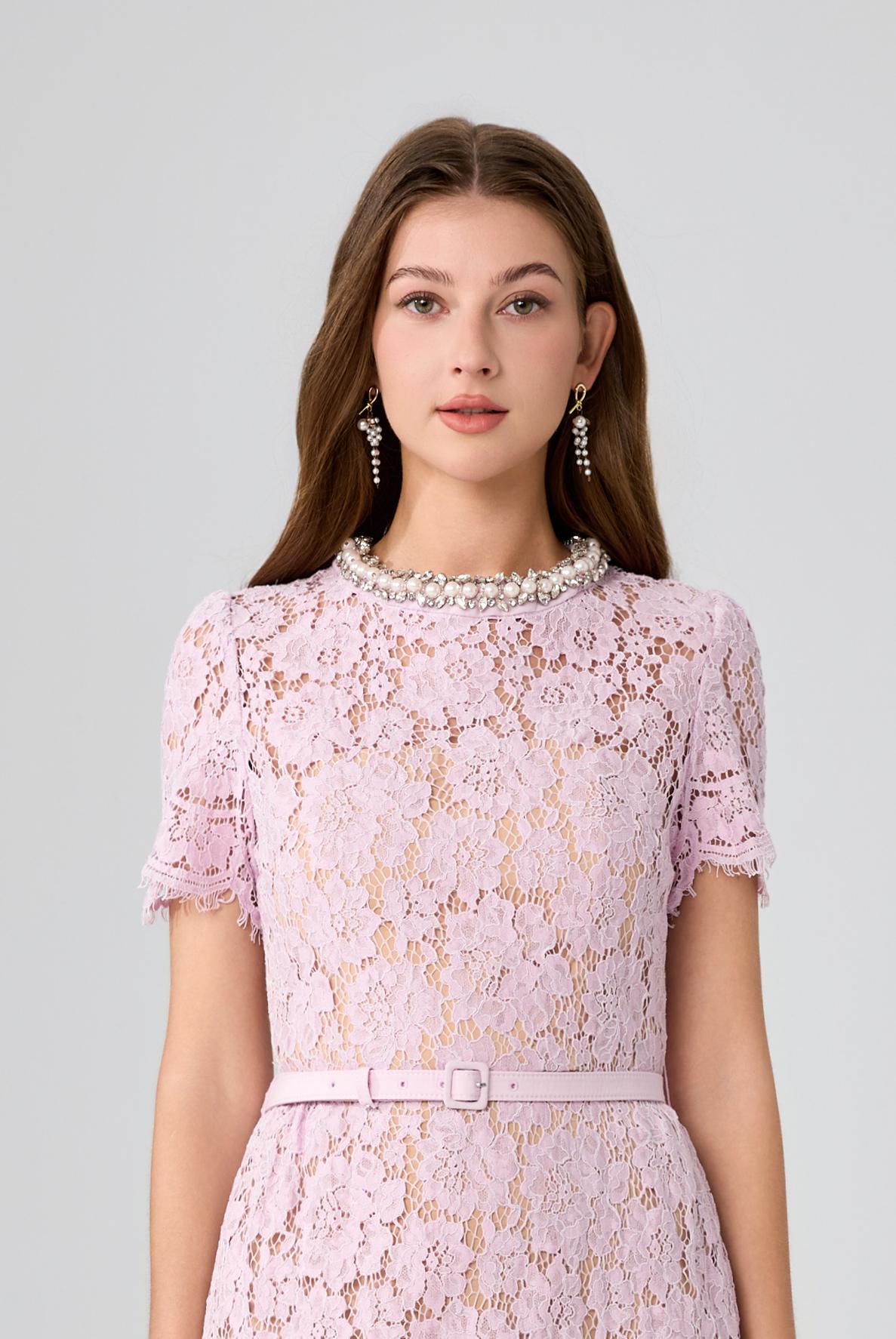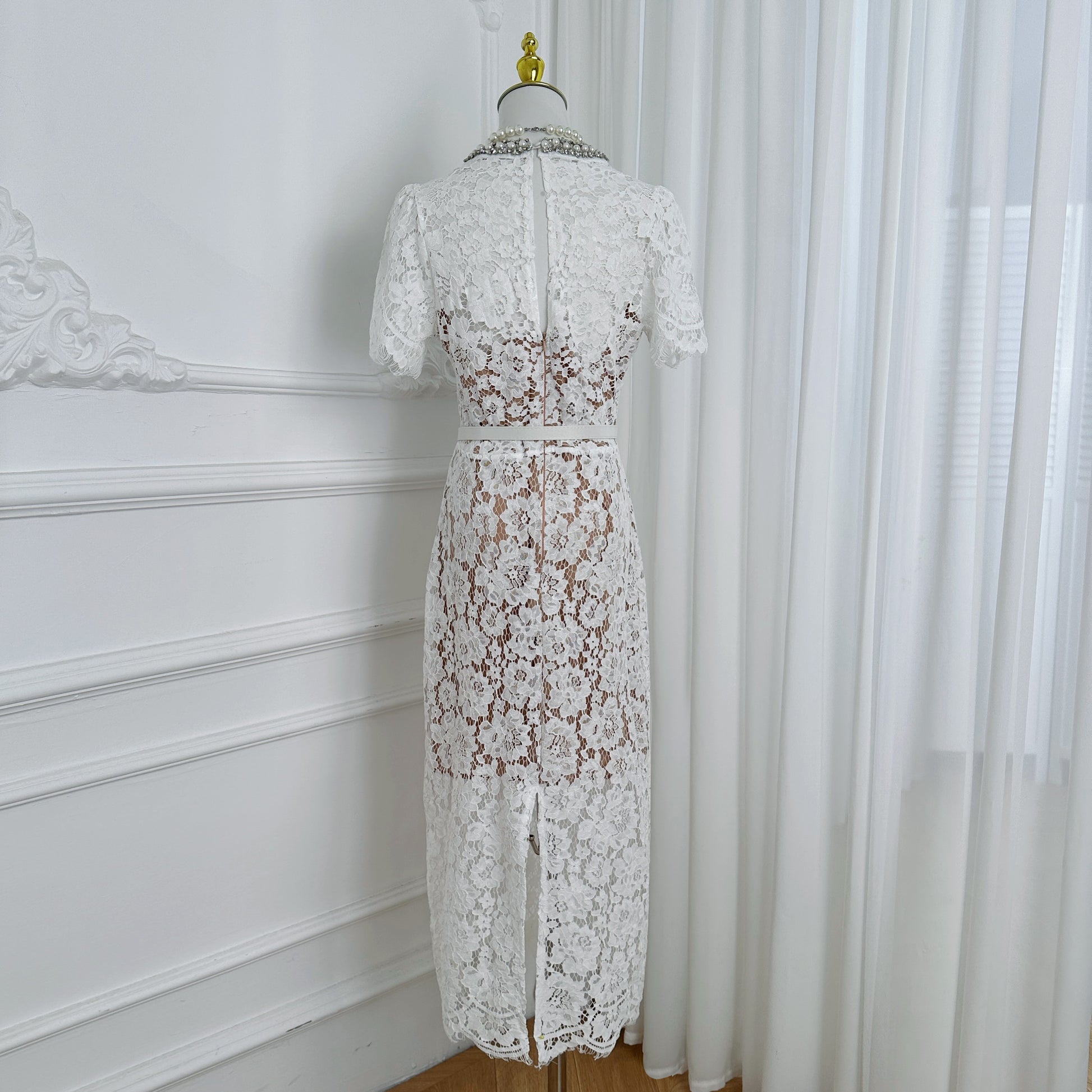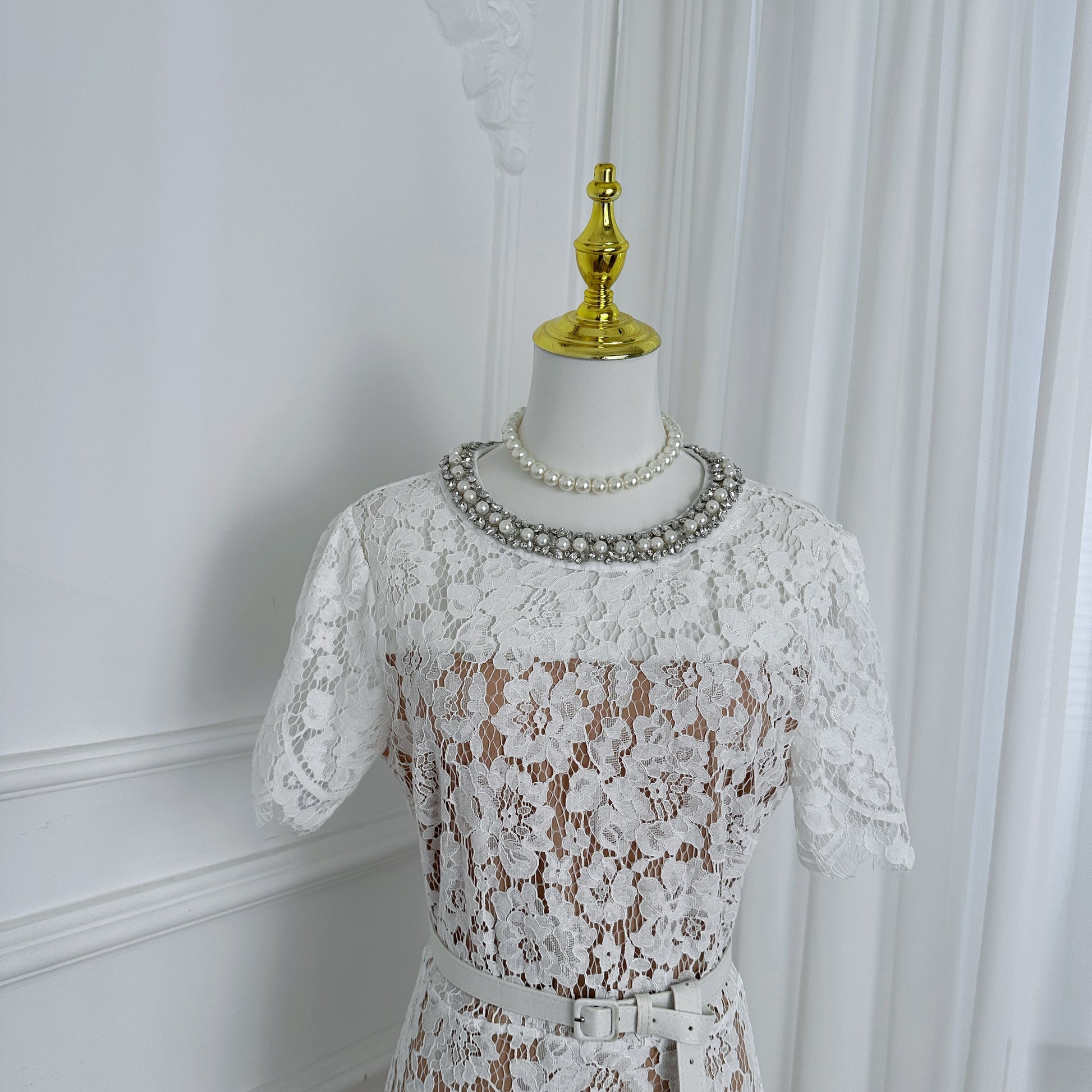 - Features: Lace material, with elegant patterns and breathability, suitable for wearing in spring and summer. Bodycon, with a belt, pearl nail diamond round neck, short sleeves, lining, rear zipper, and rear slit.