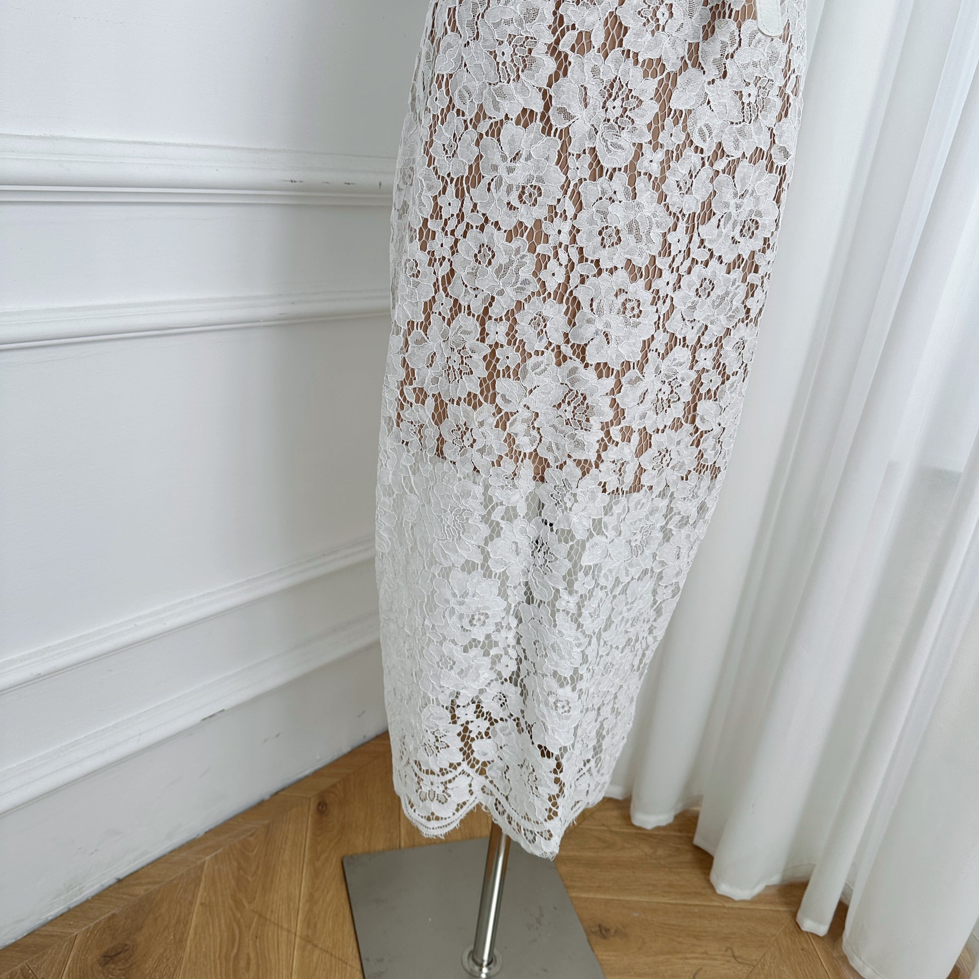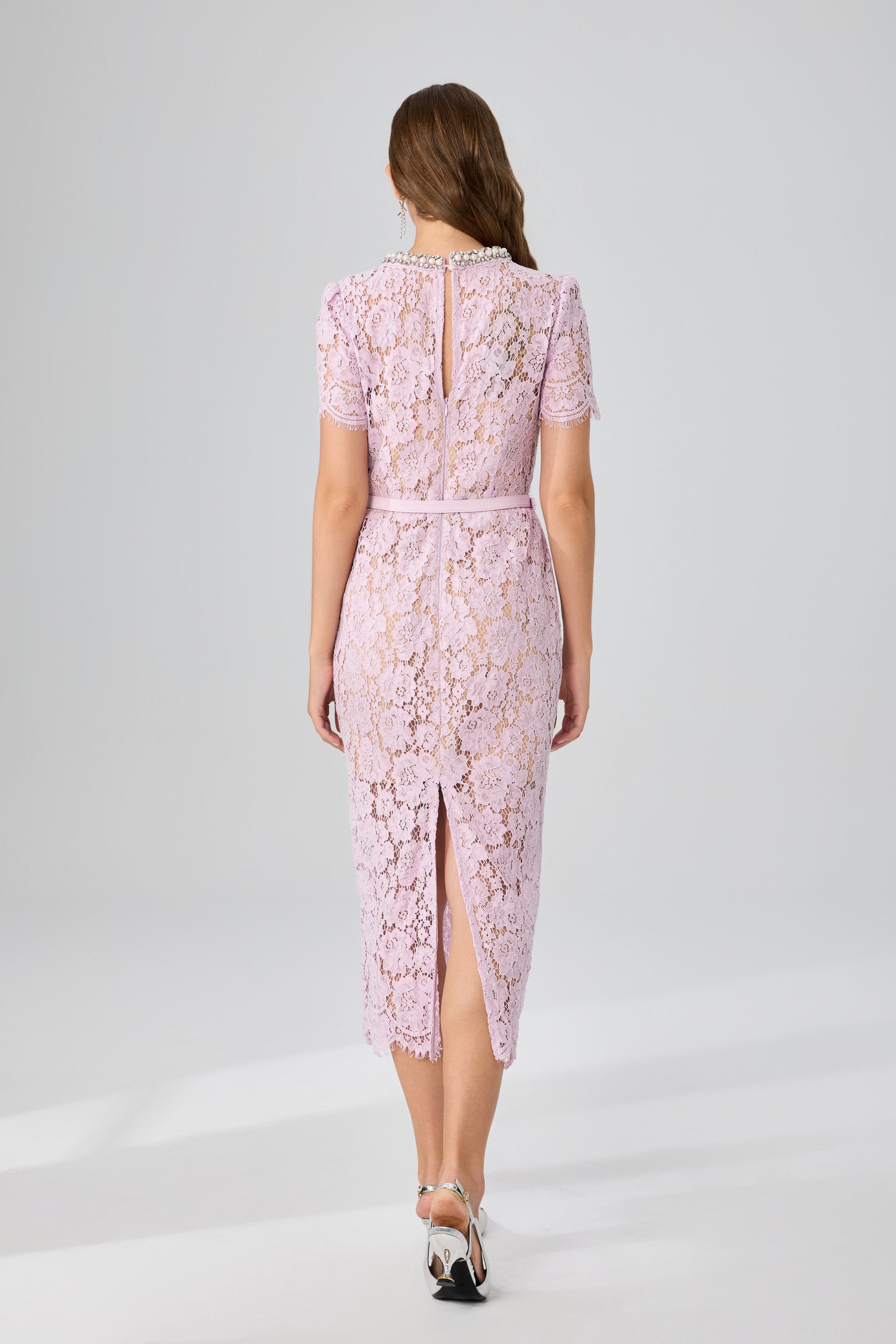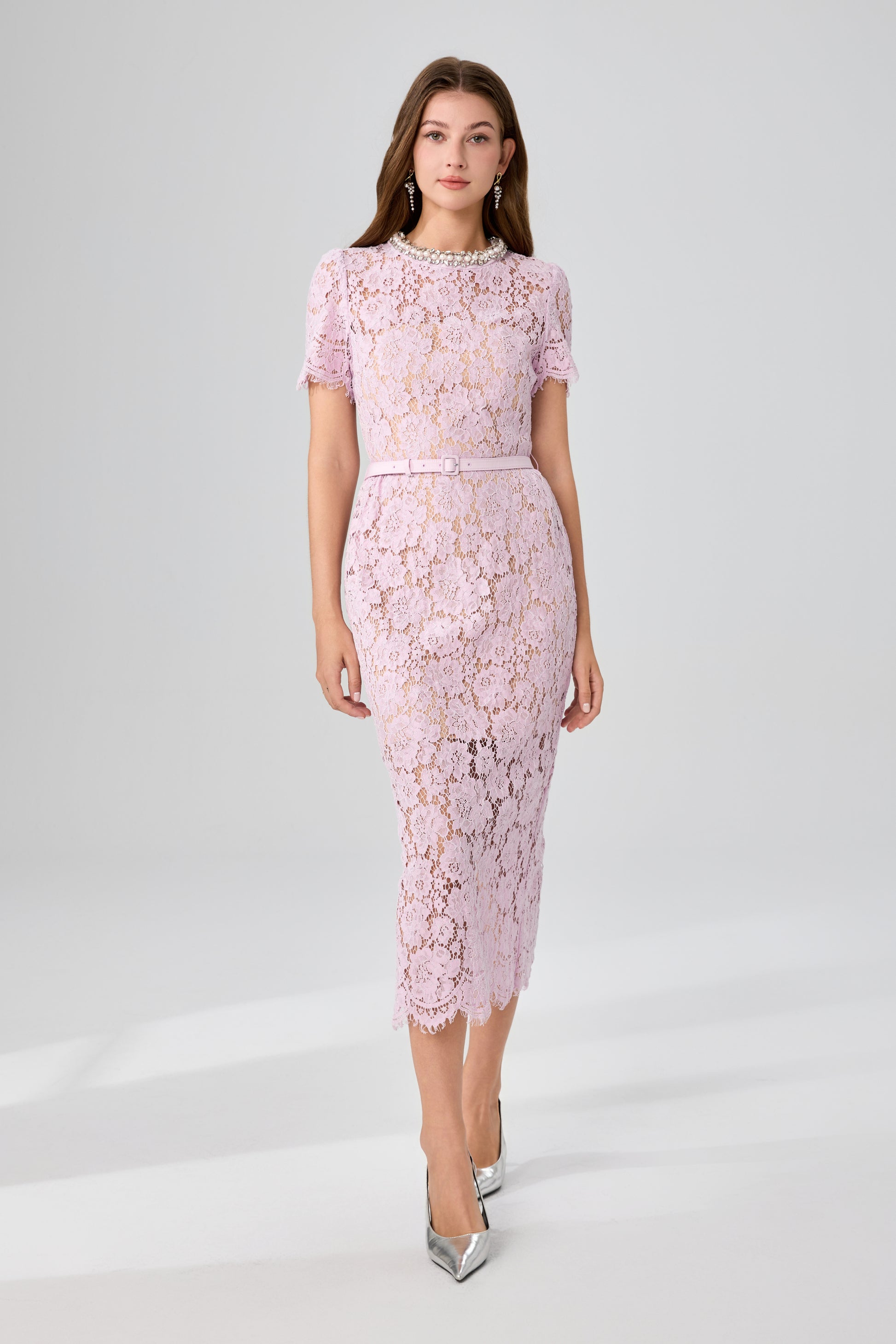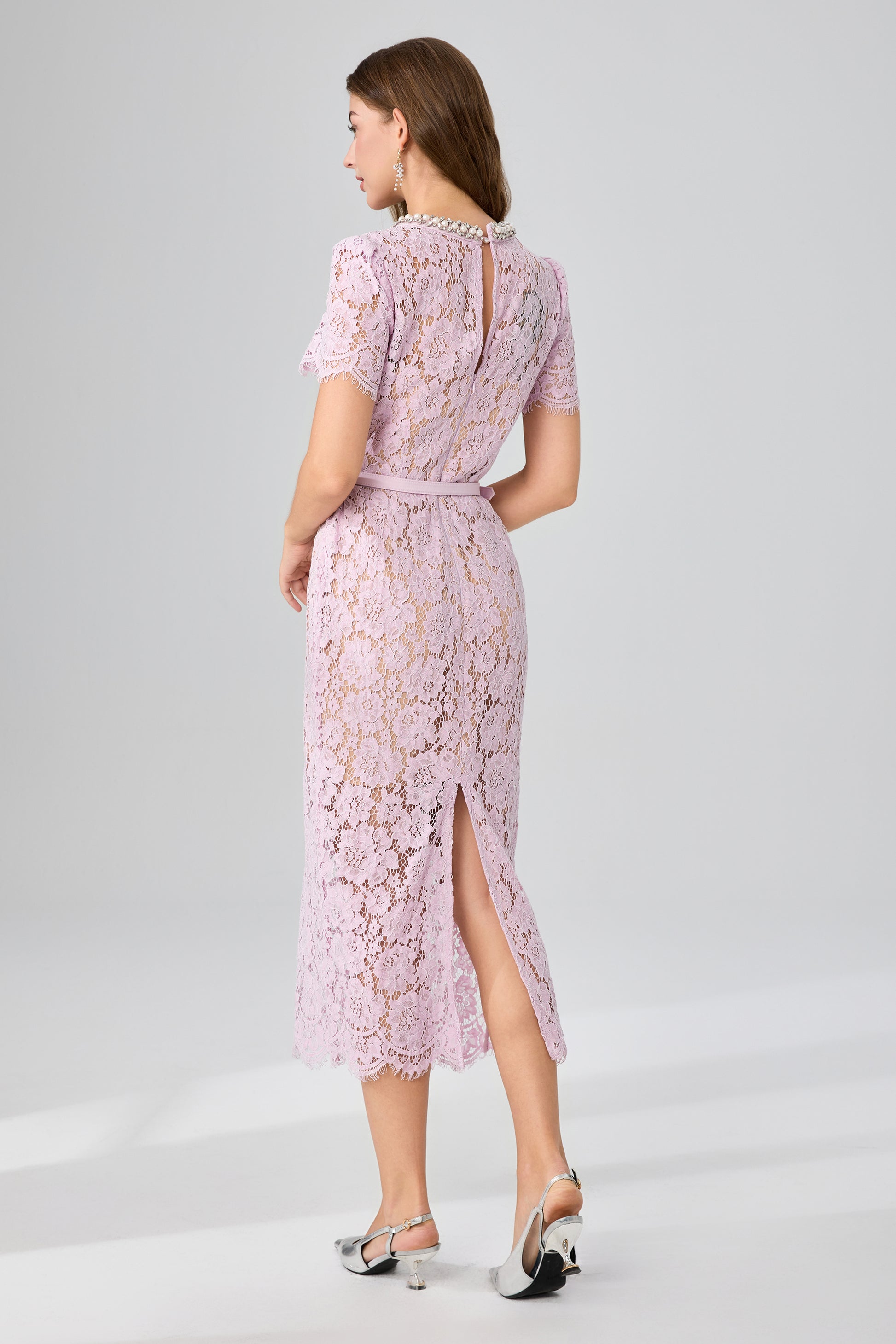 - Features: Lace material, with elegant patterns and breathability, suitable for wearing in spring and summer. Bodycon, with a belt, pearl nail diamond round neck, short sleeves, lining, rear zipper, and rear slit.