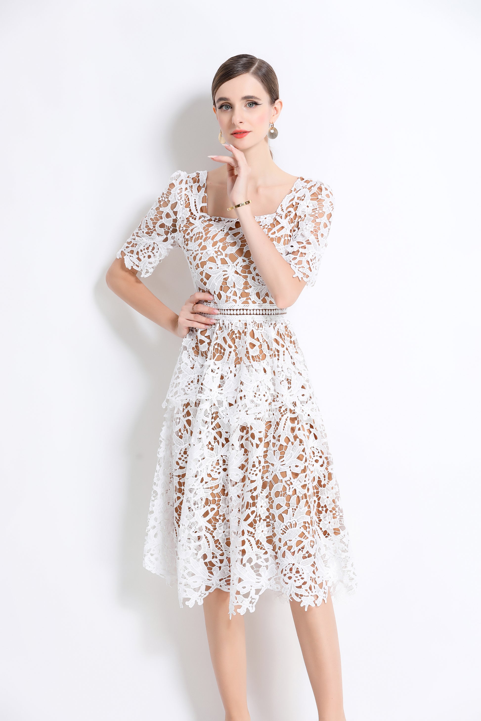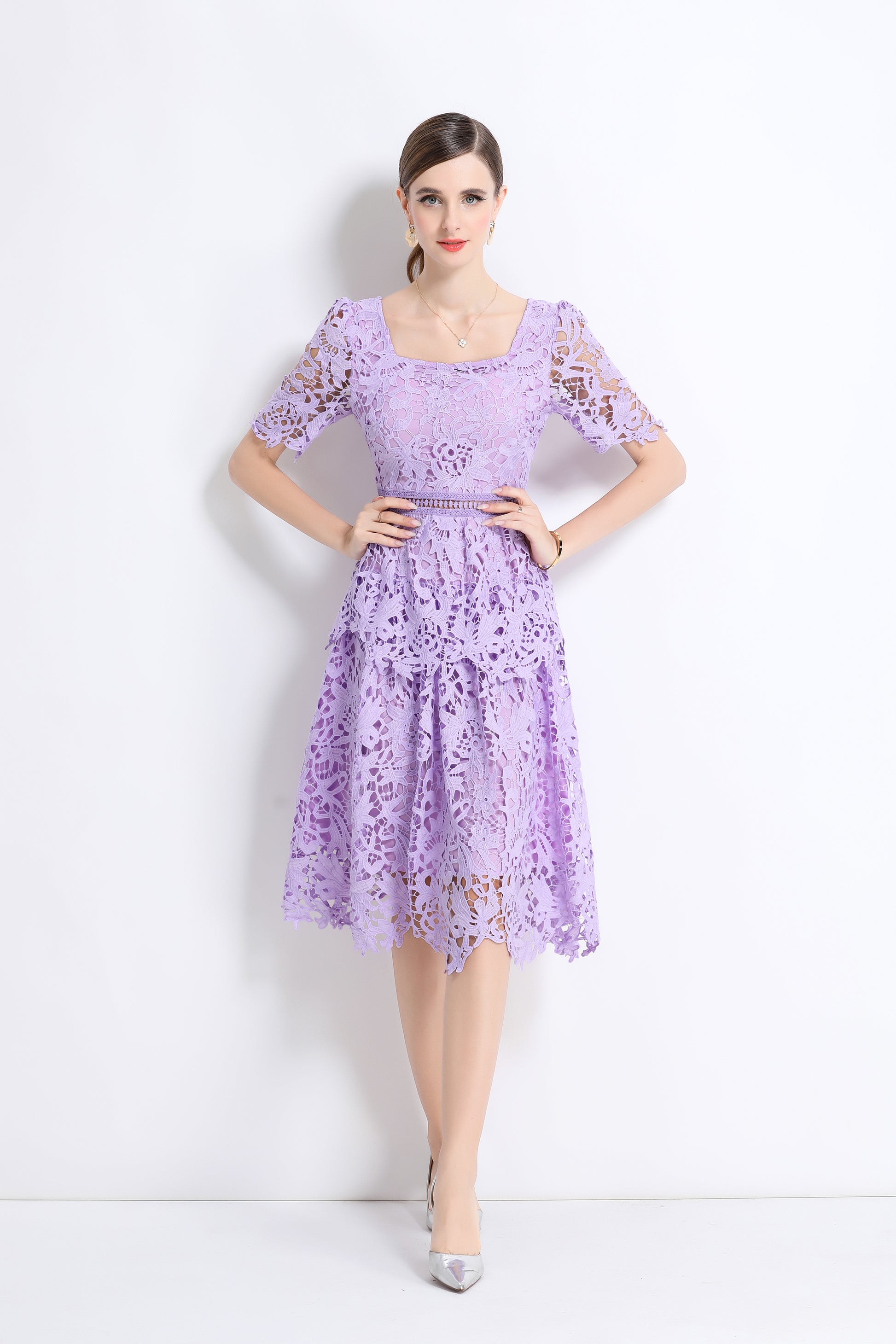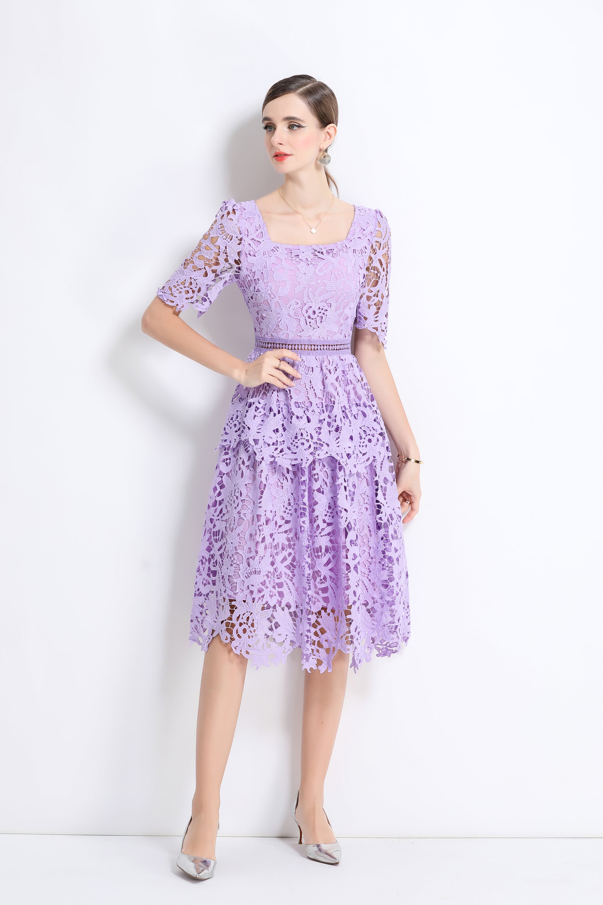 Women's Lace Square Neck Sort Sleeve Midi Dress