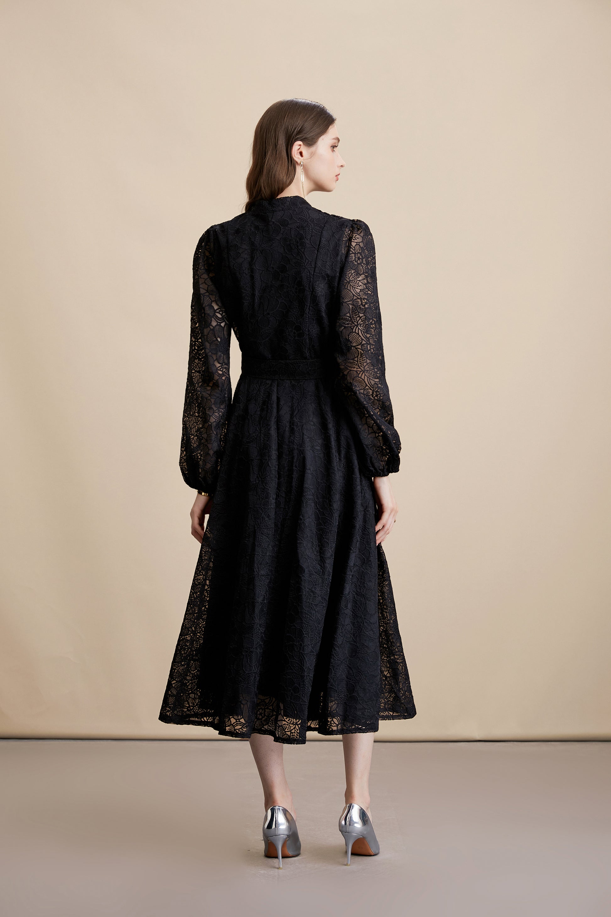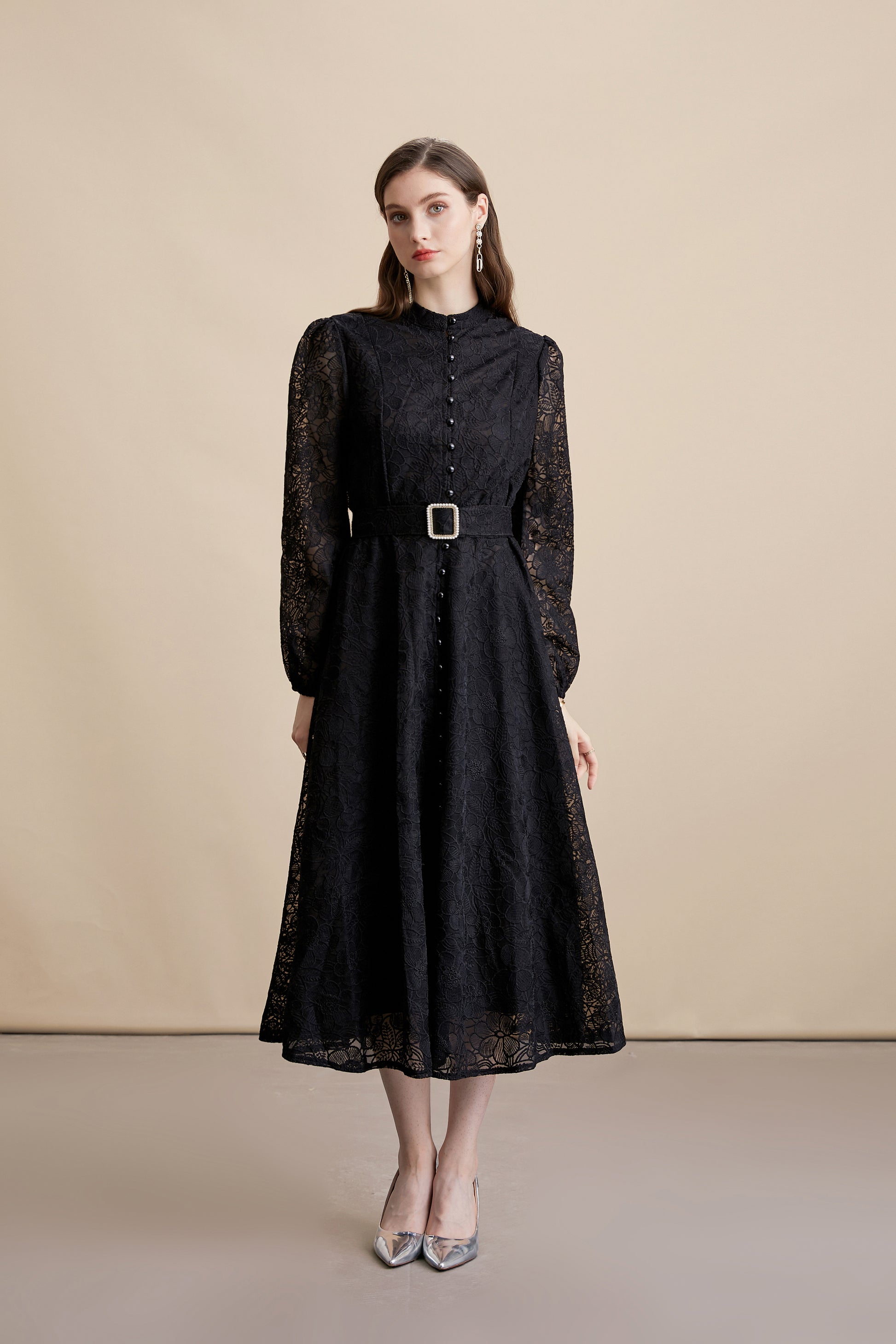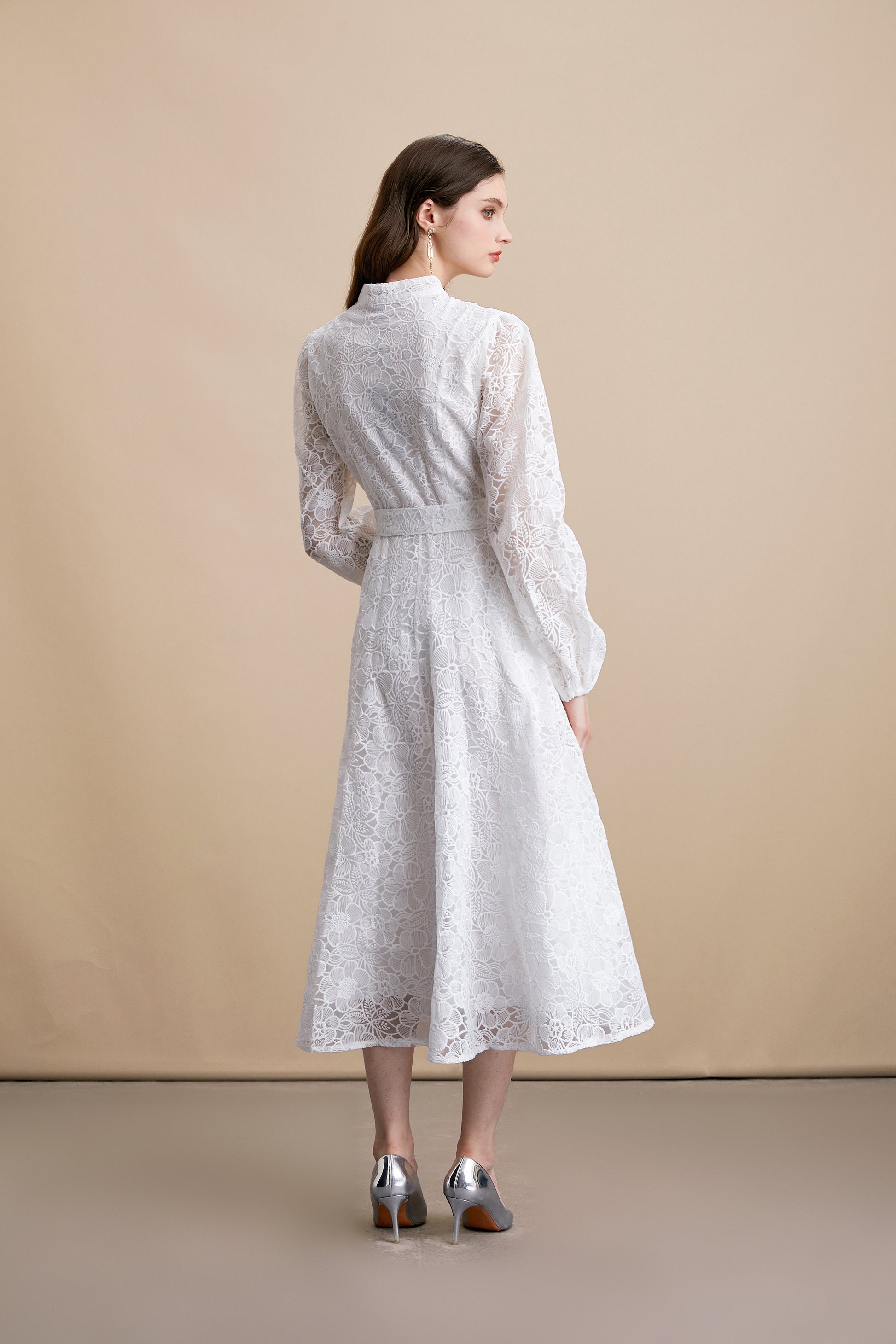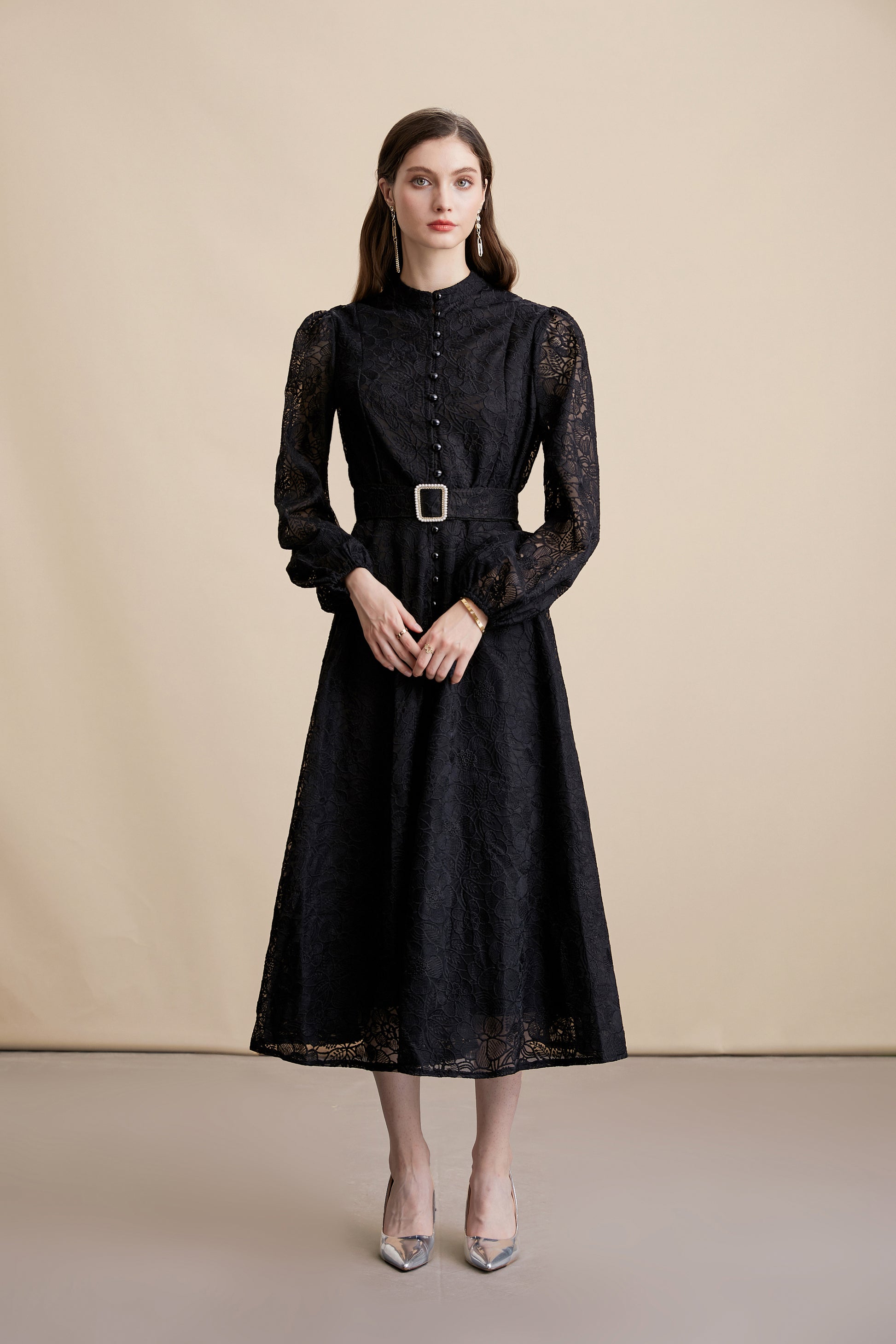 - Features:Elegant lace dress,lace floral embroidery,stand-up collar,single-breasted buttons,puffed sleeves, long sleeves,with a belt,midi lace dress.