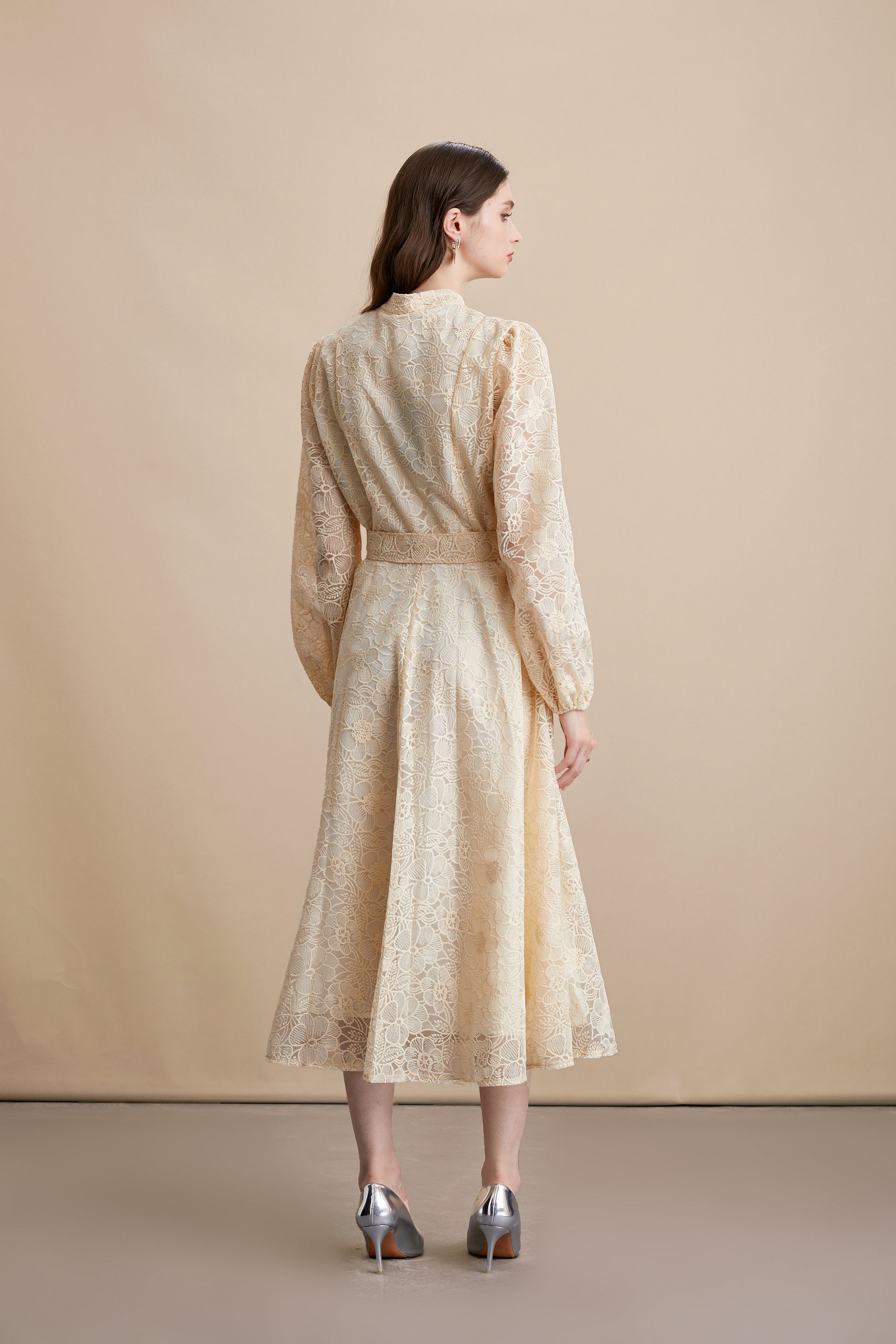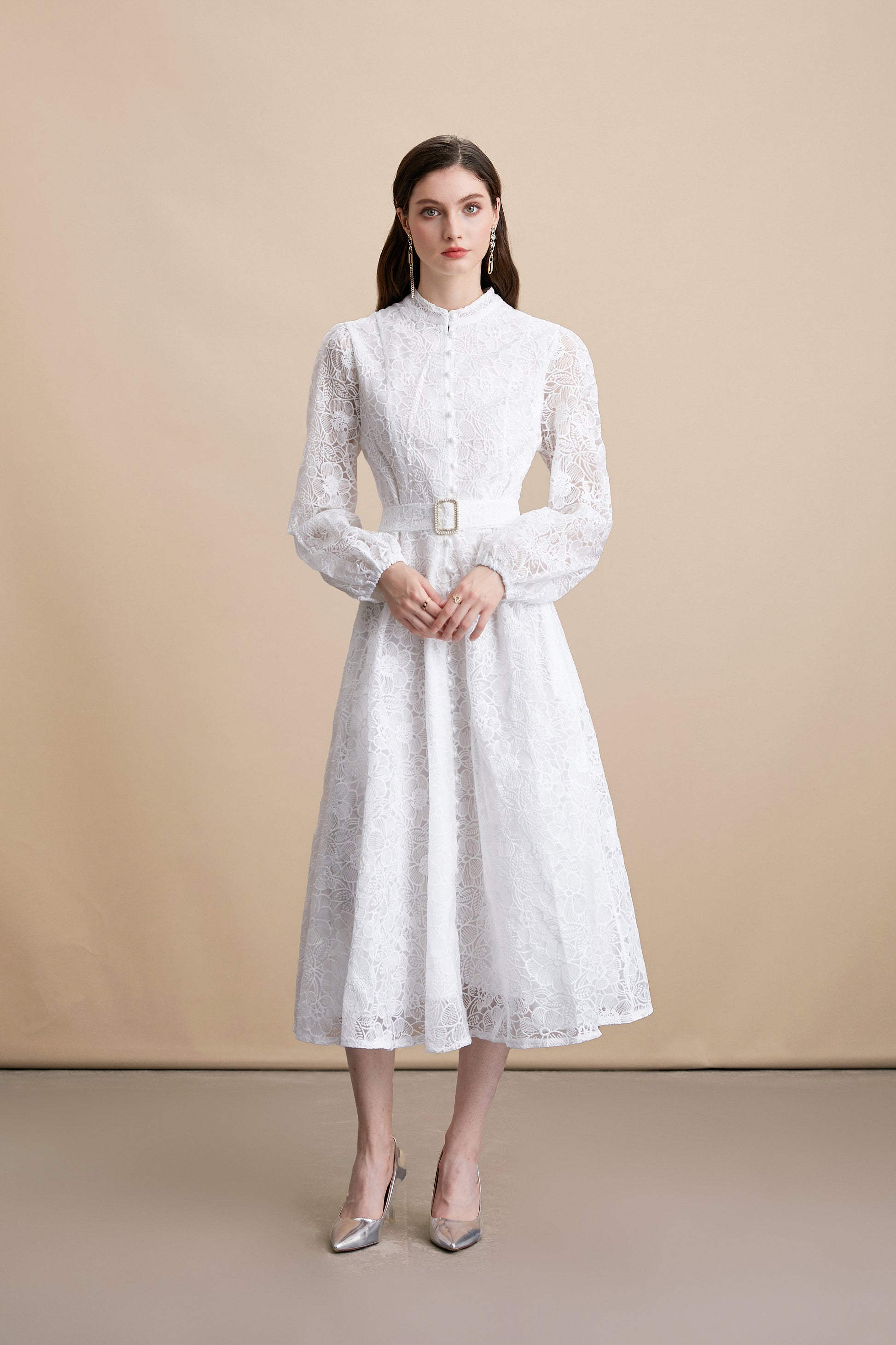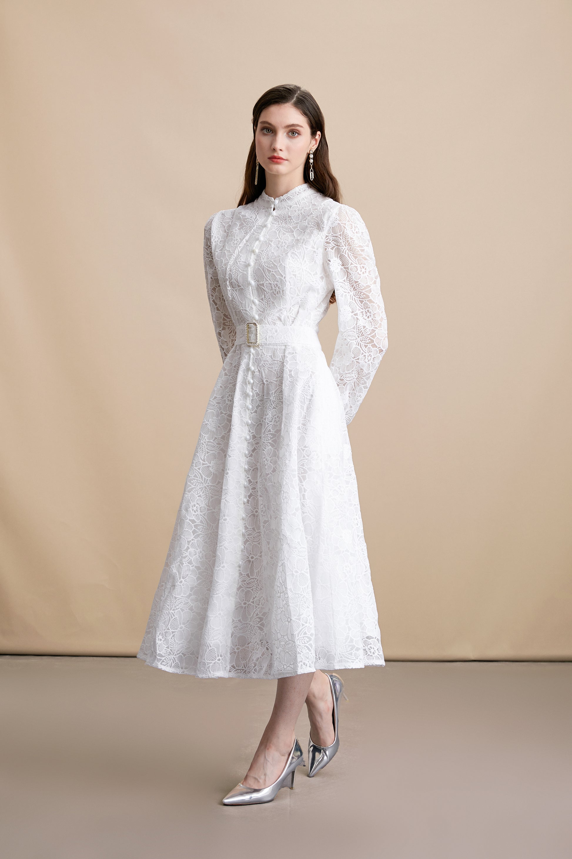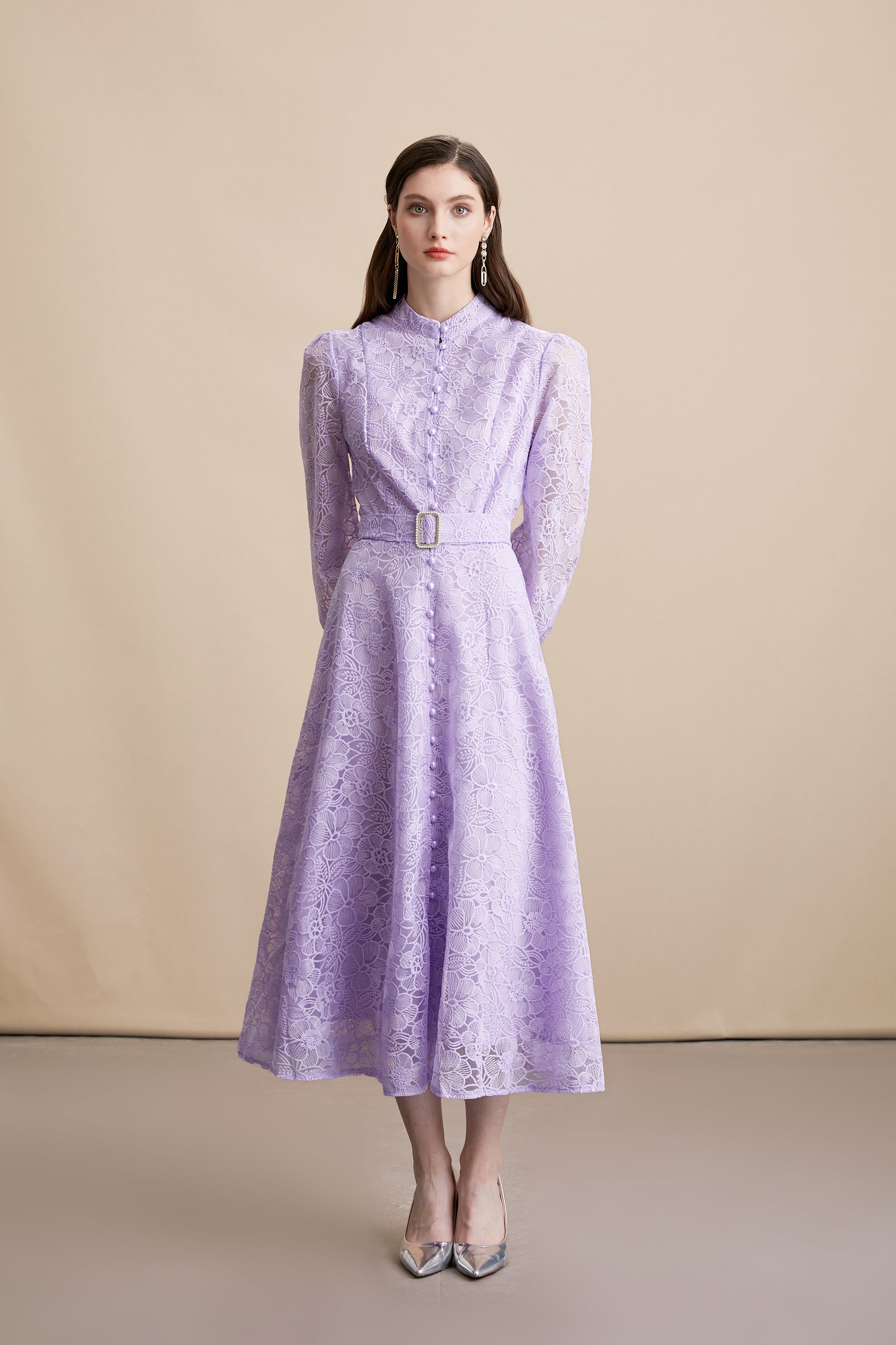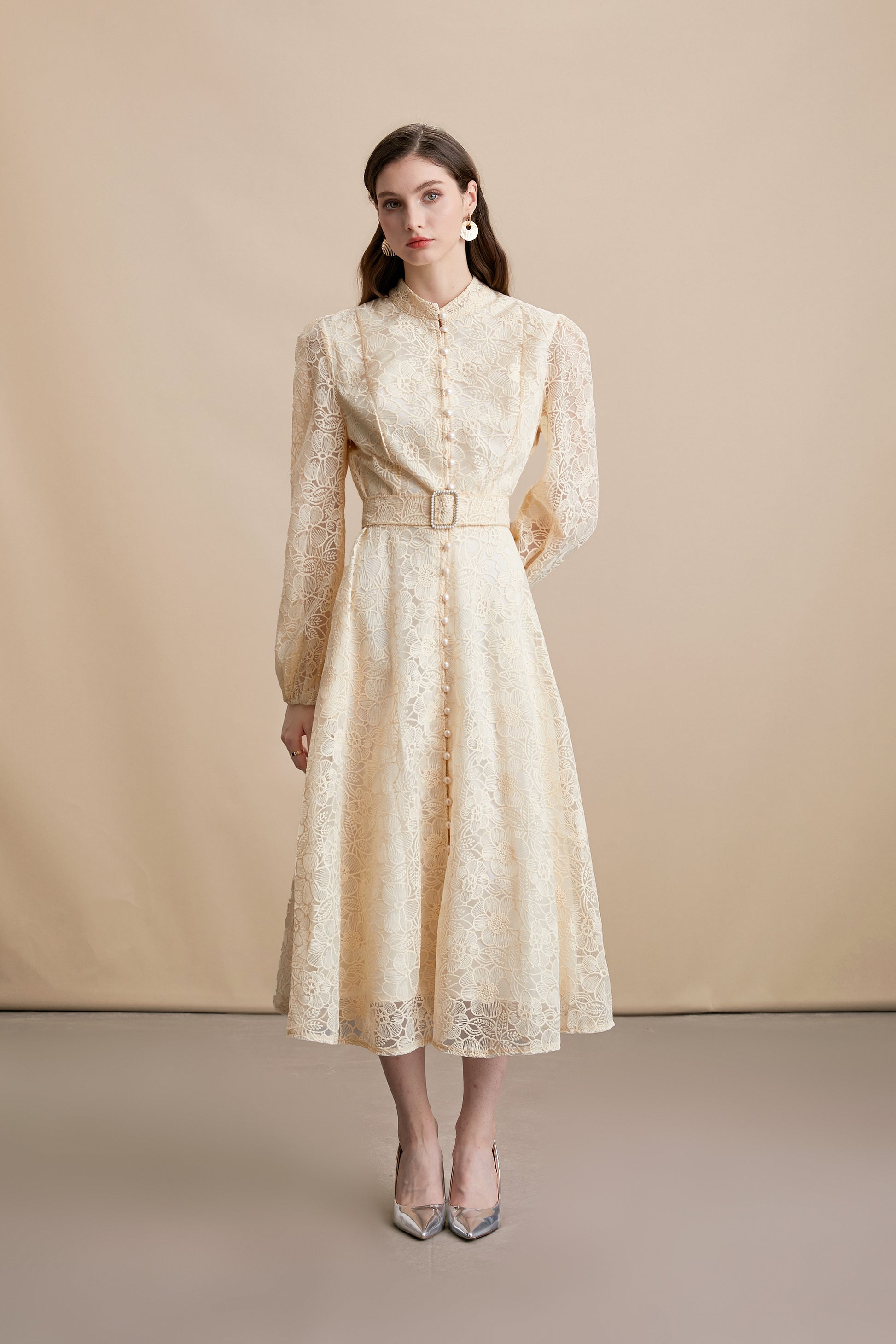 - Features:Elegant lace dress,lace floral embroidery,stand-up collar,single-breasted buttons,puffed sleeves, long sleeves,with a belt,midi lace dress.
