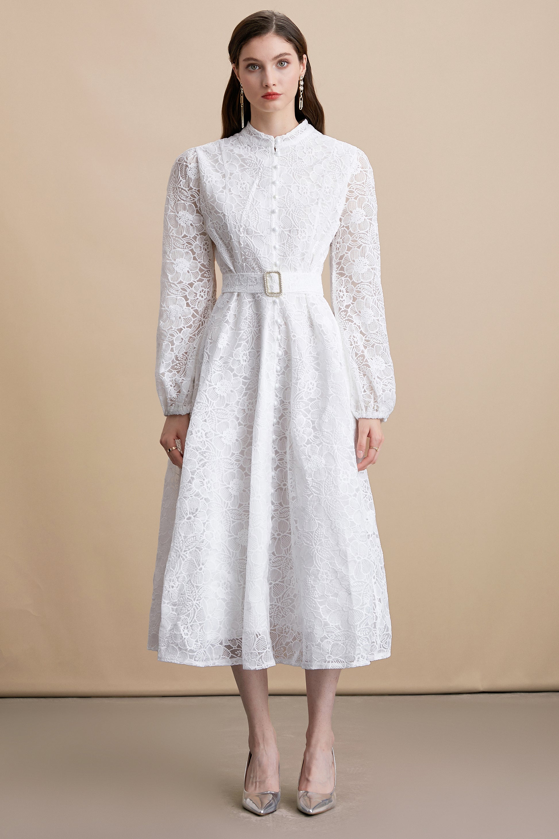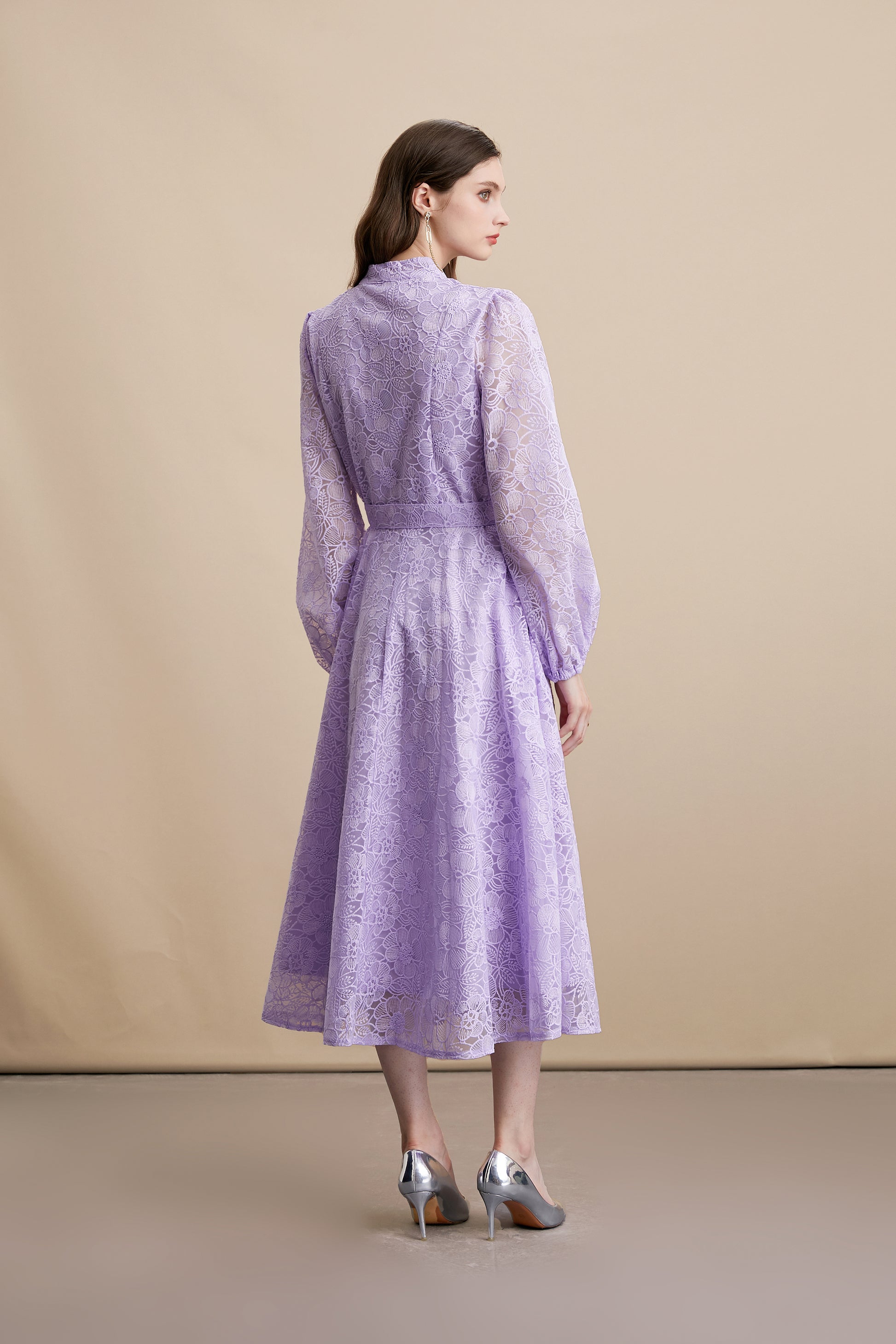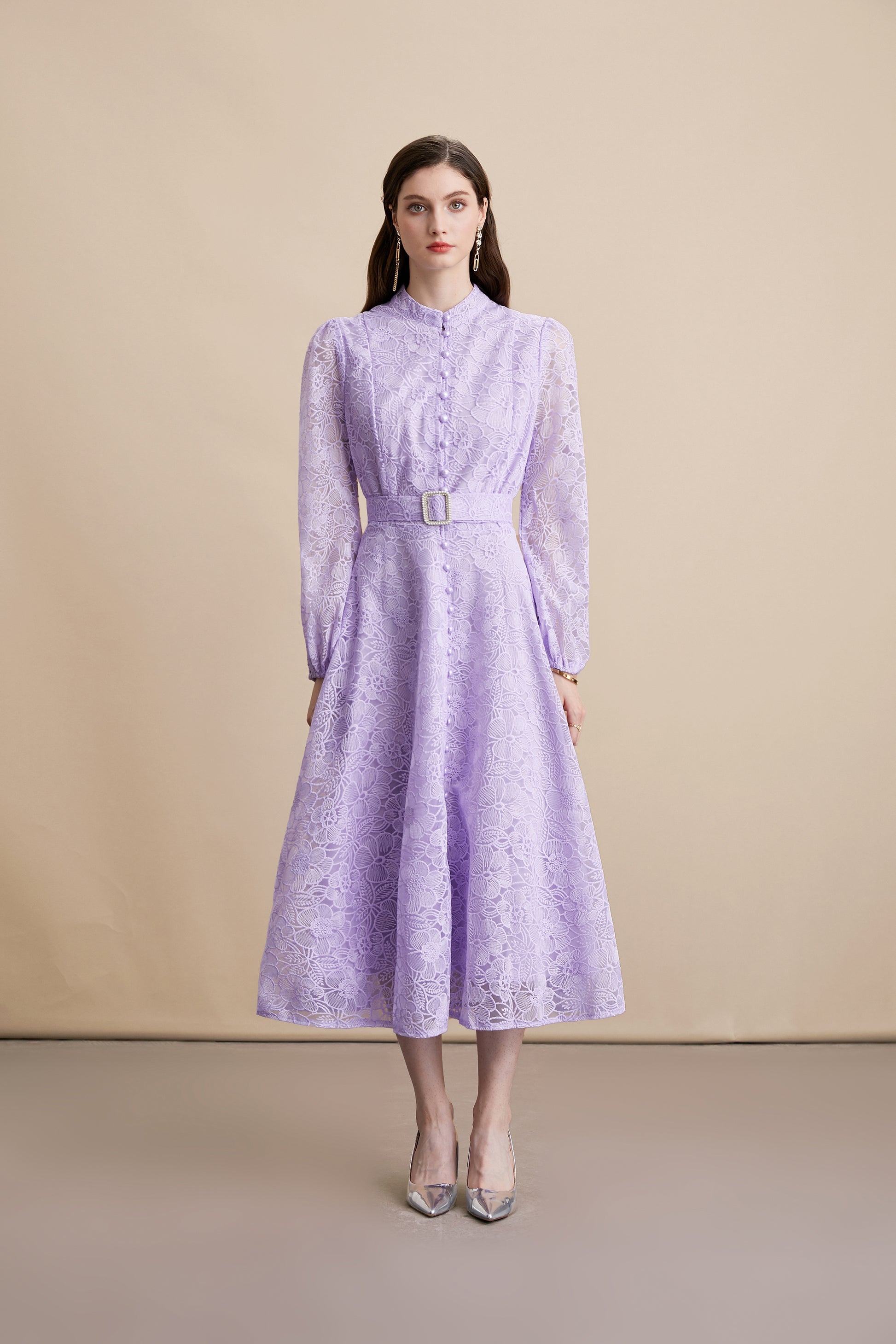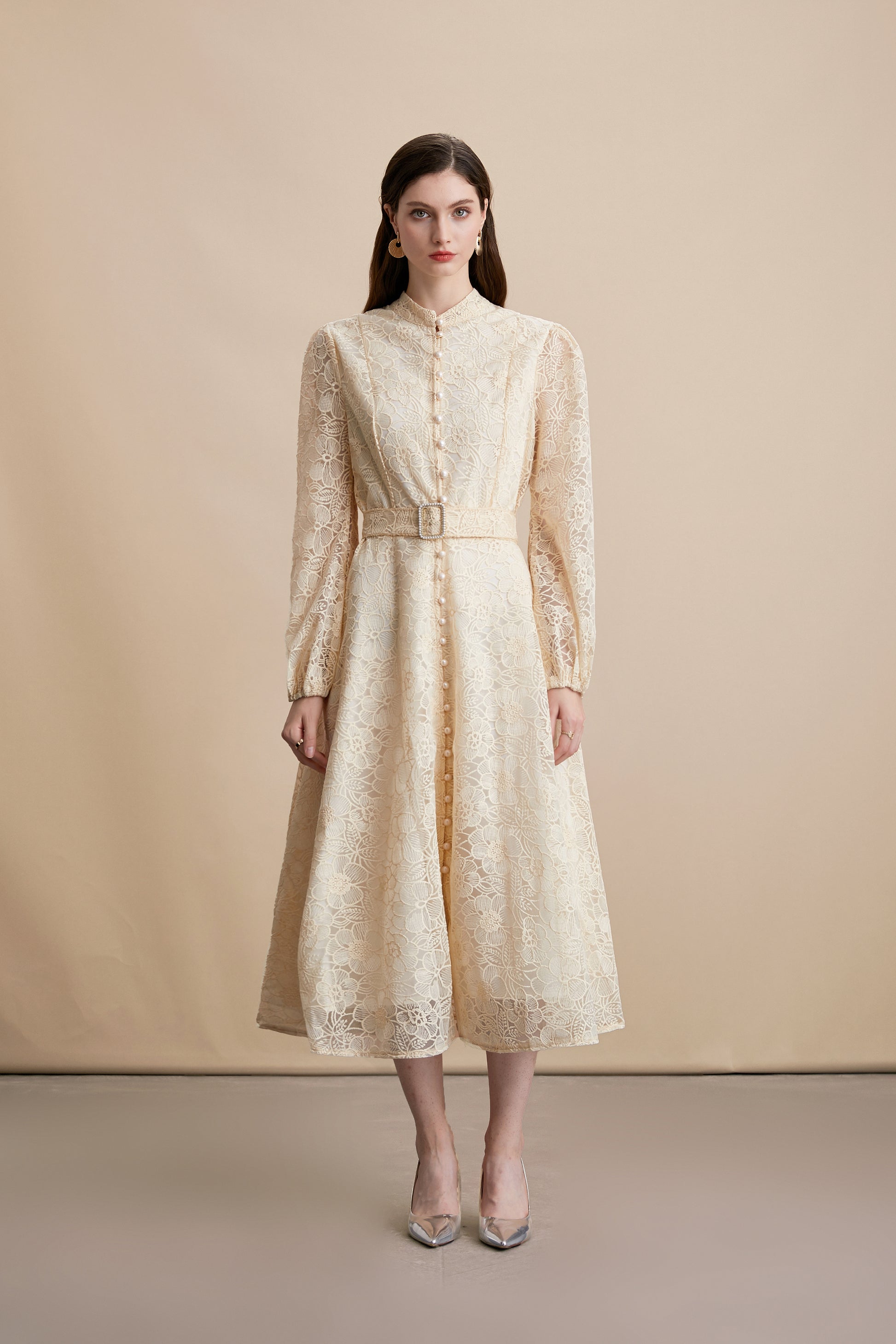 - Features:Elegant lace dress,lace floral embroidery,stand-up collar,single-breasted buttons,puffed sleeves, long sleeves,with a belt,midi lace dress.