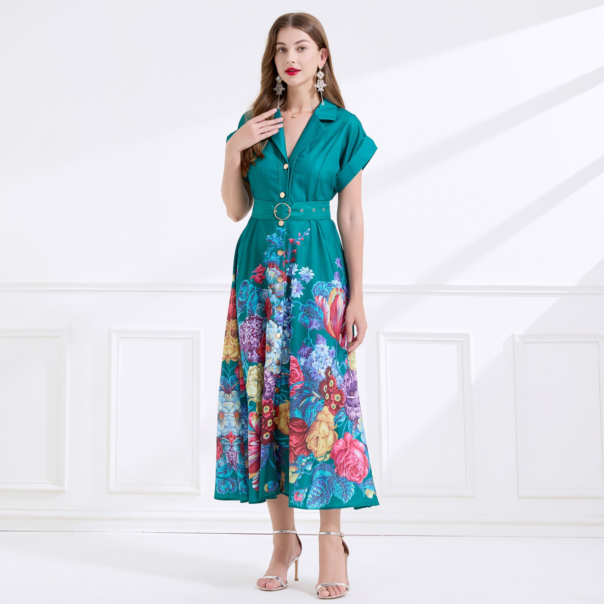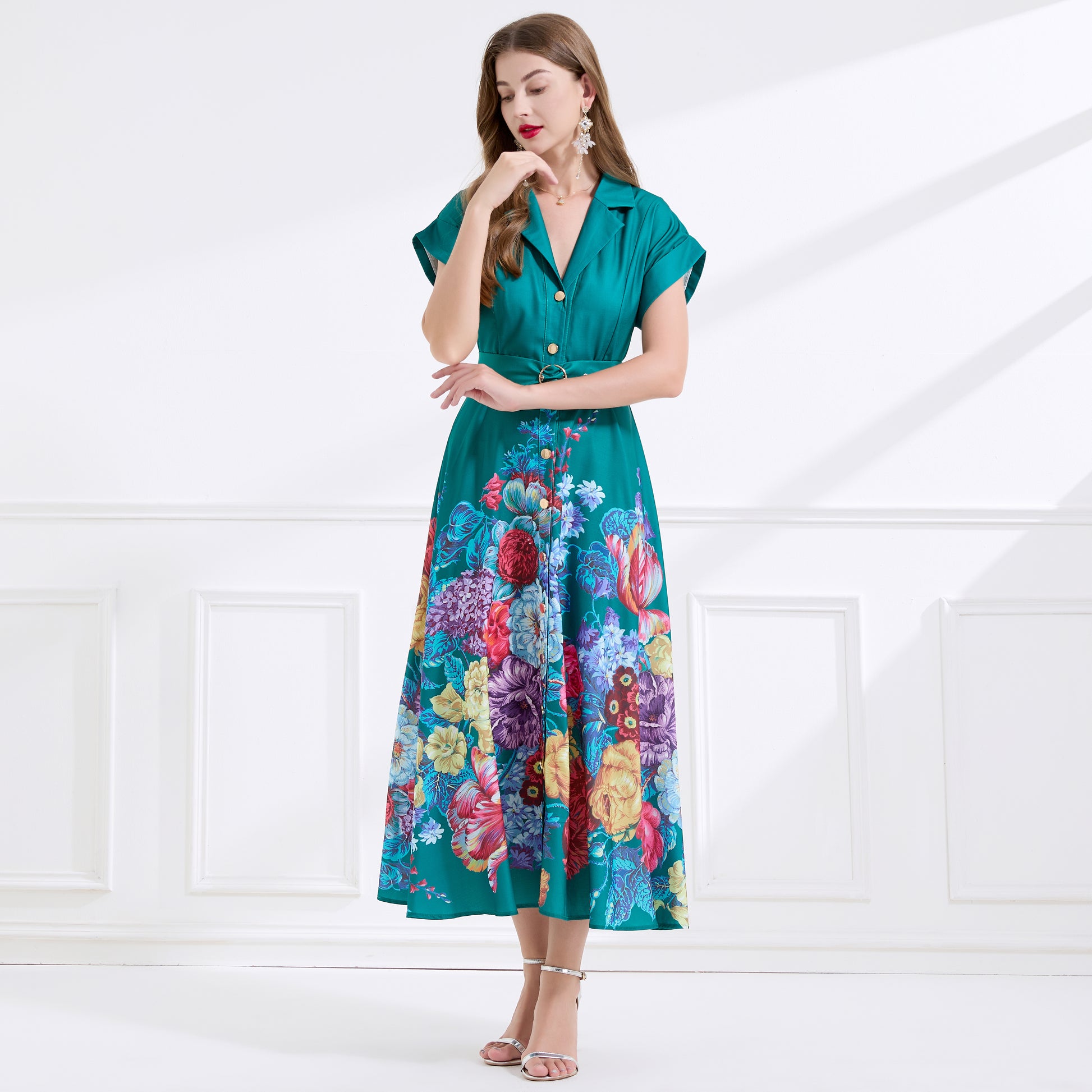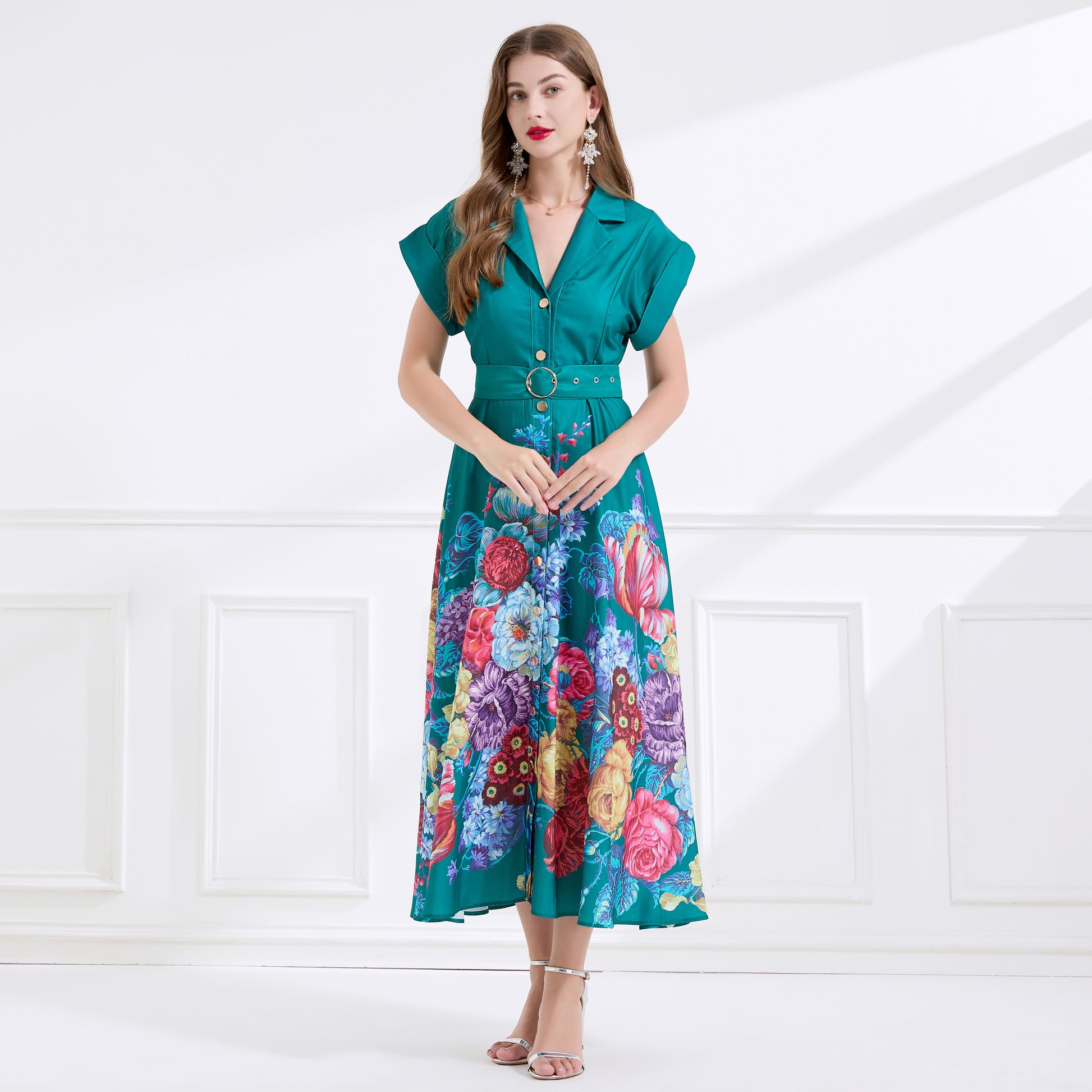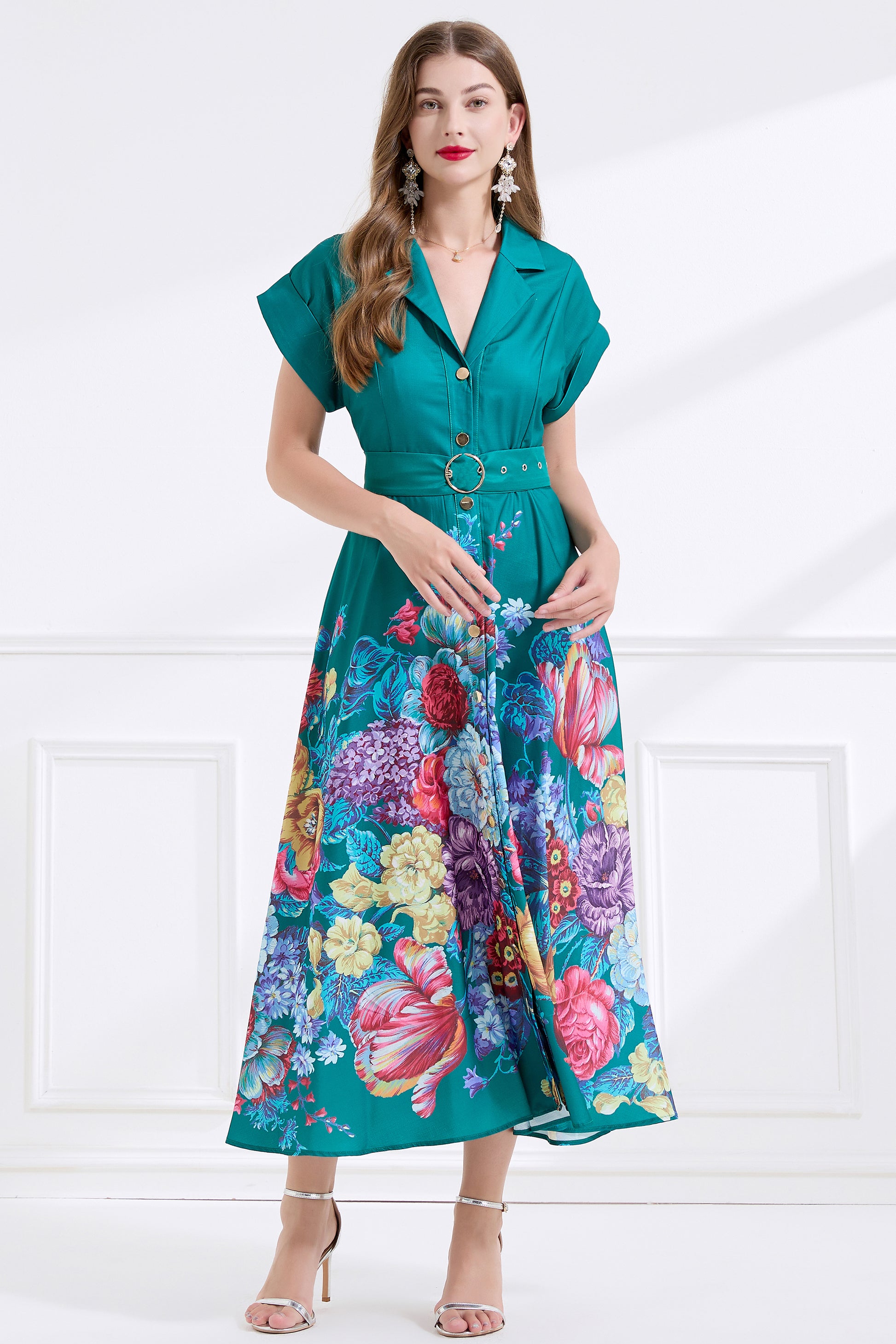 • Features: Lapel V-neck, short sleeve, belt, front button, full body floral print, pleated, maxi dress.