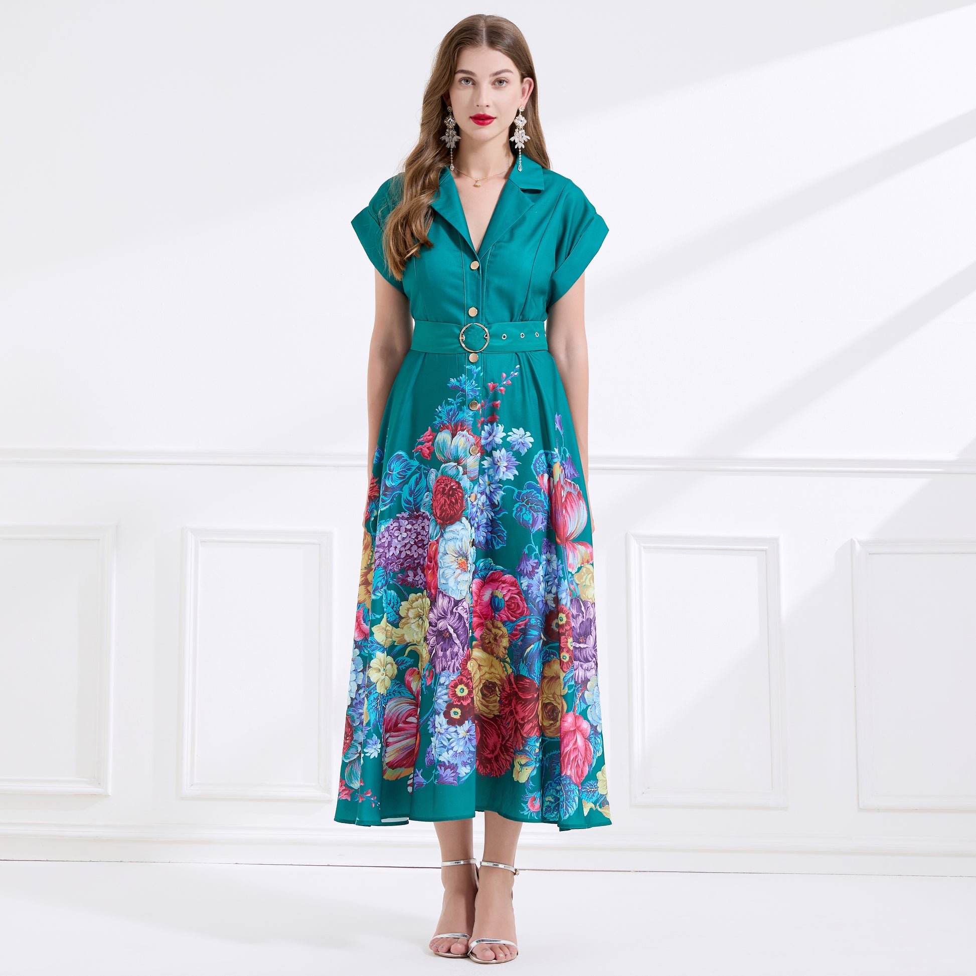 Women's Lapel V-Neck Floral Print Maxi Dress