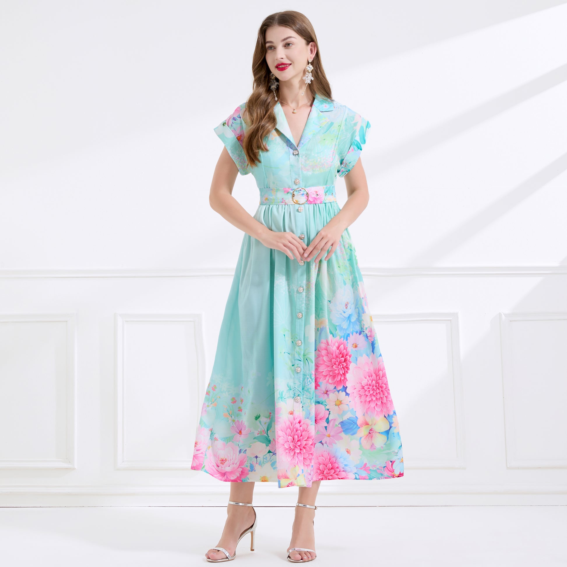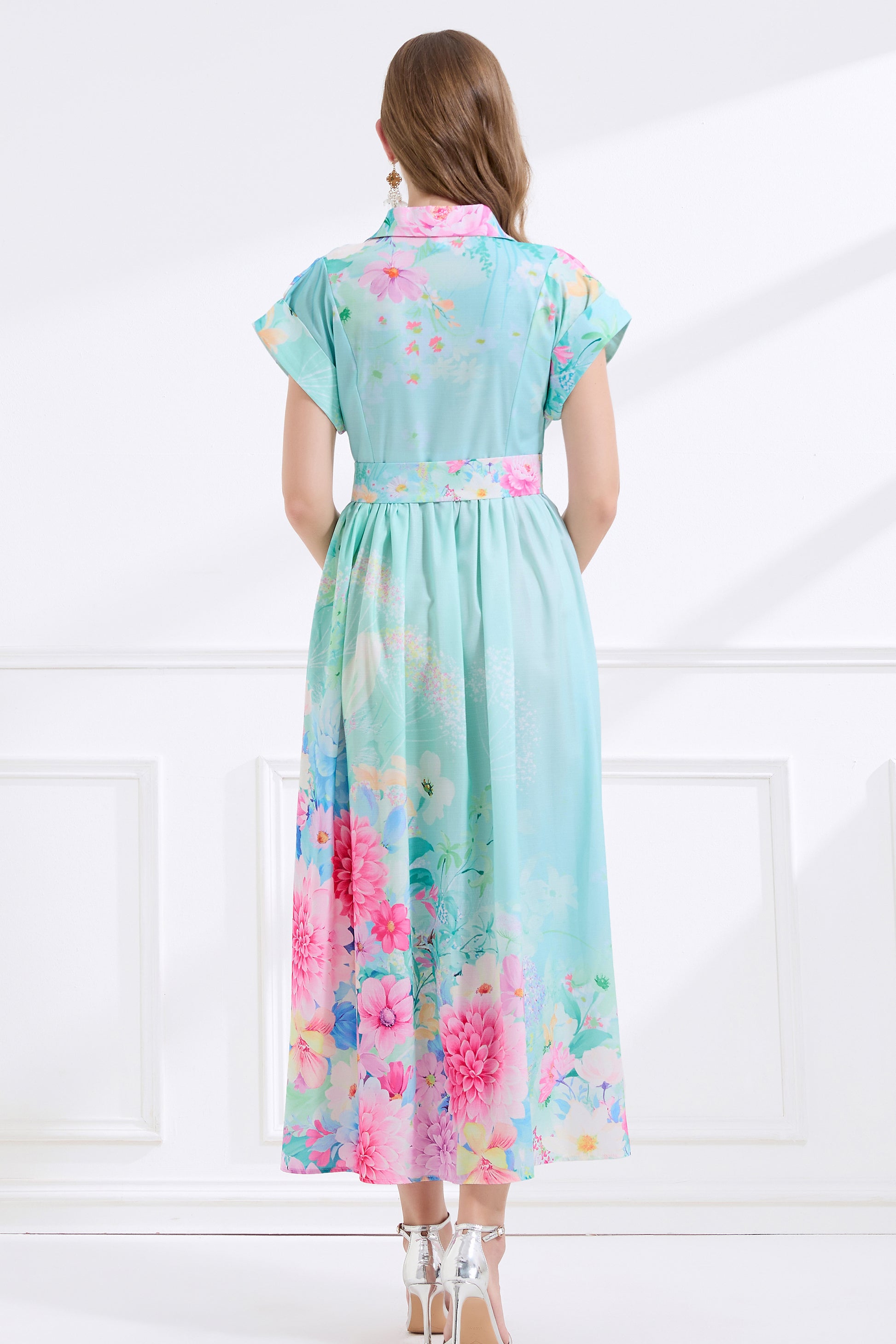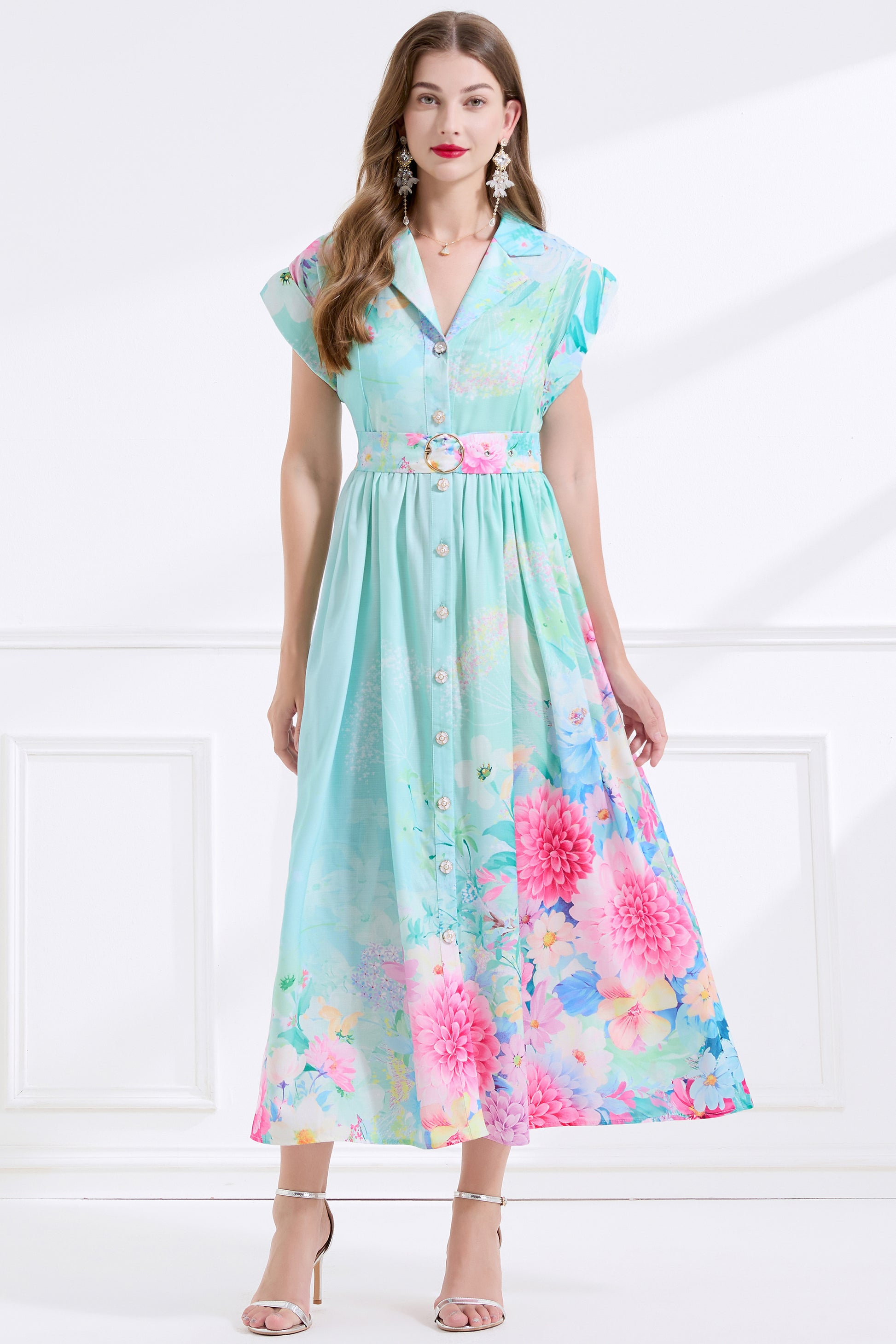 • Features: Lapel V-neck, short sleeve, belt, front button, full body floral print, pleated, maxi dress.