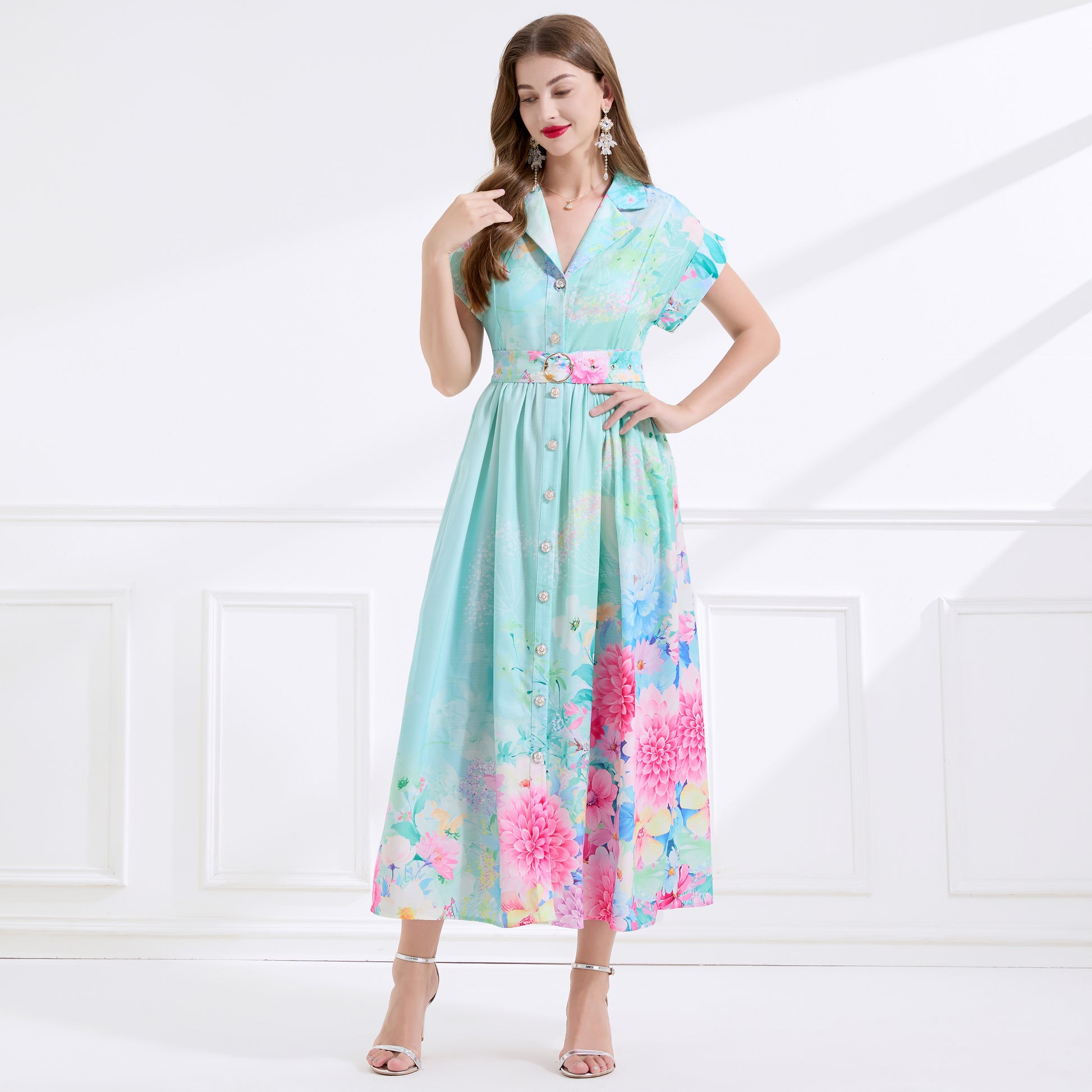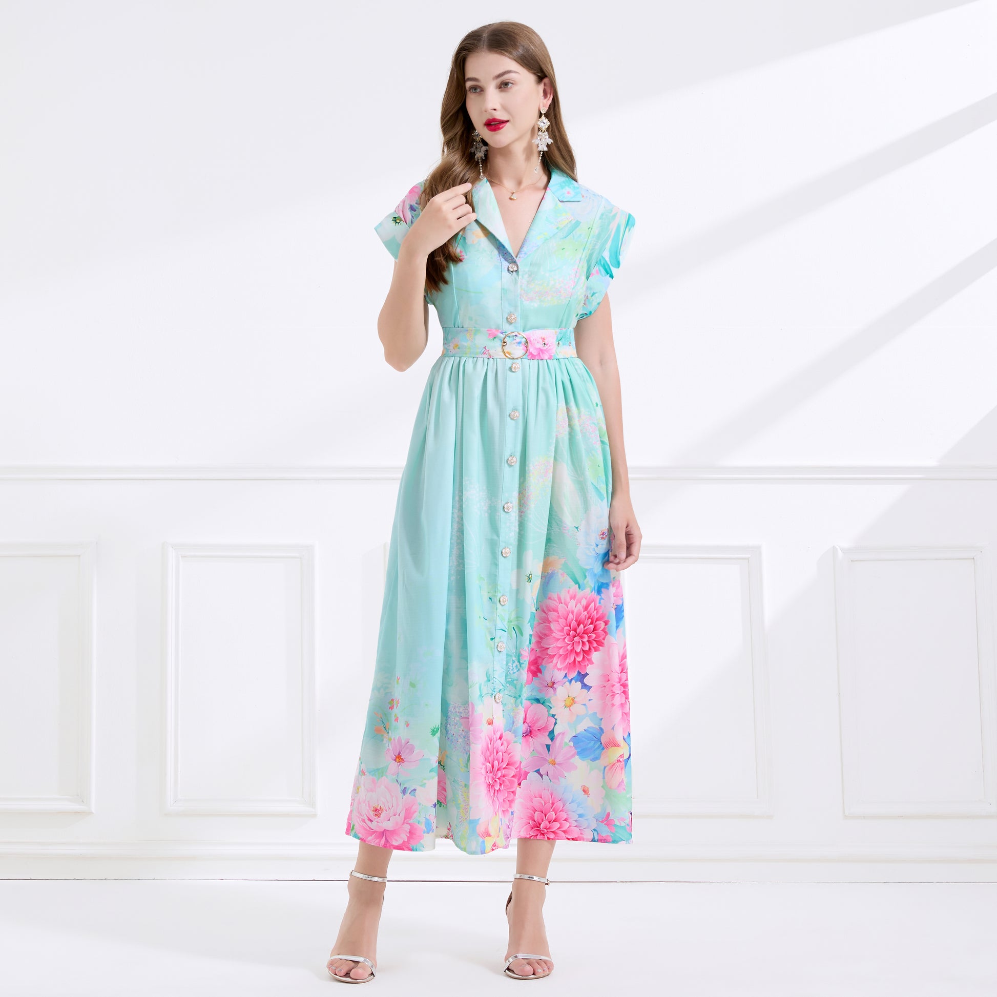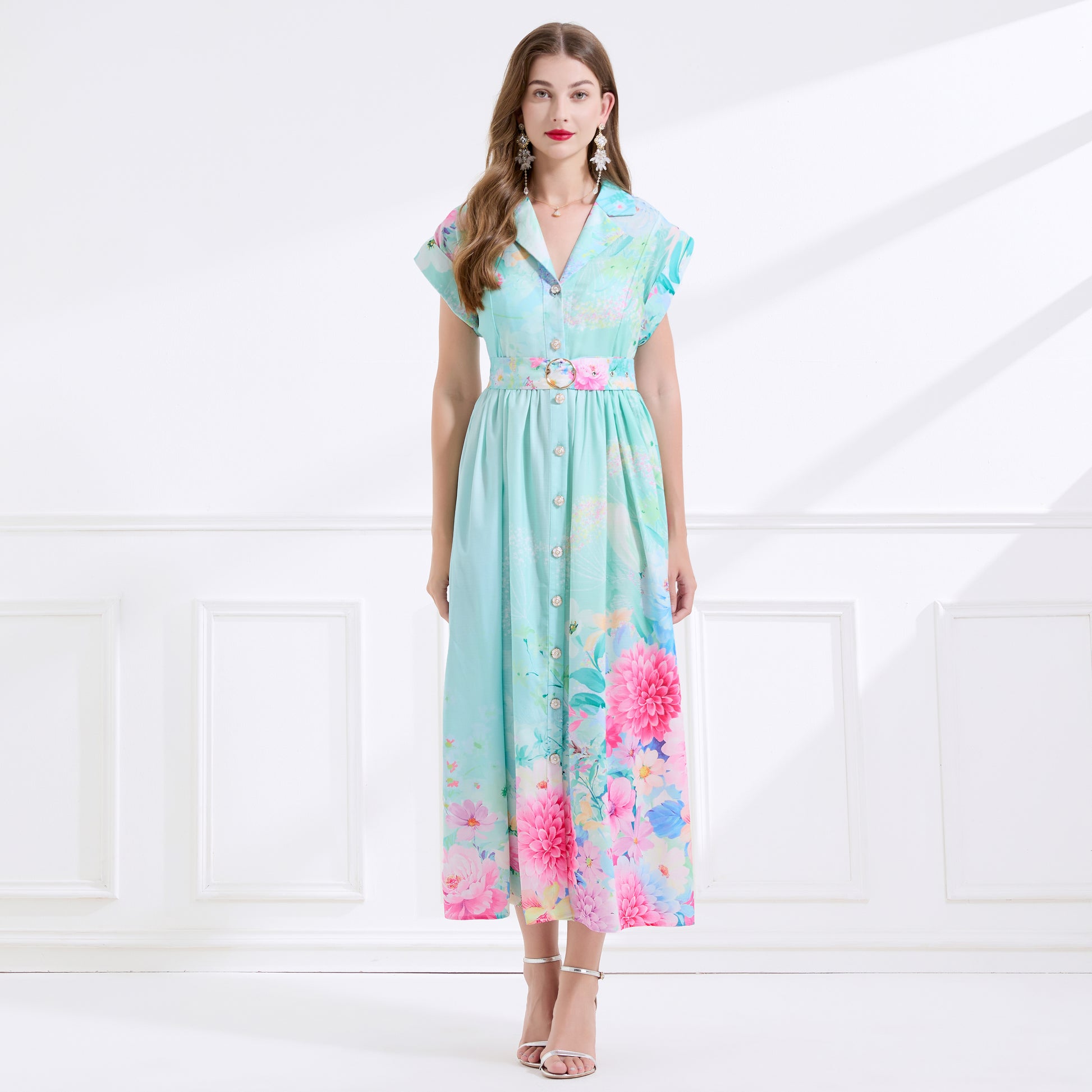 • Features: Lapel V-neck, short sleeve, belt, front button, full body floral print, pleated, maxi dress.