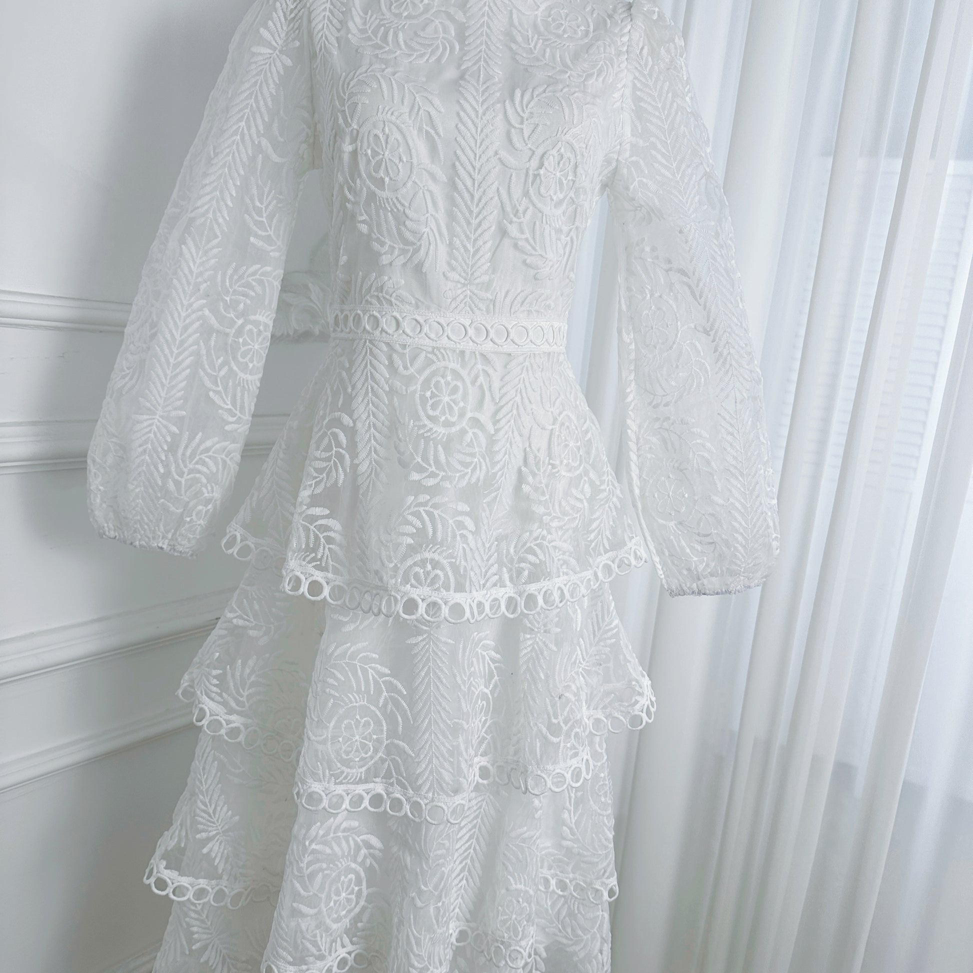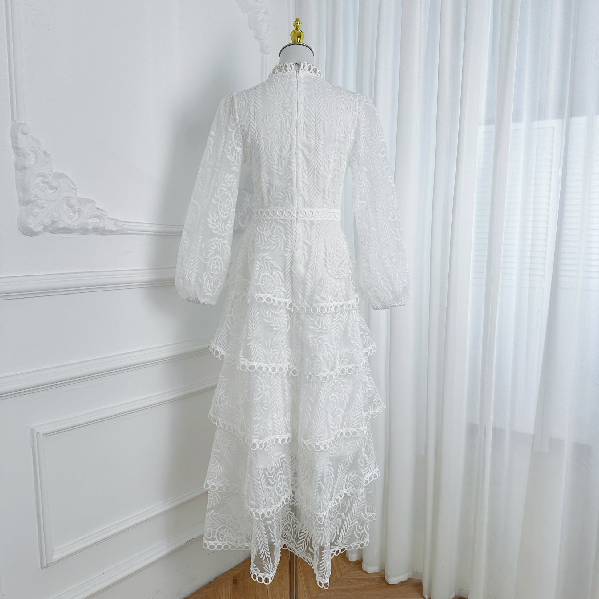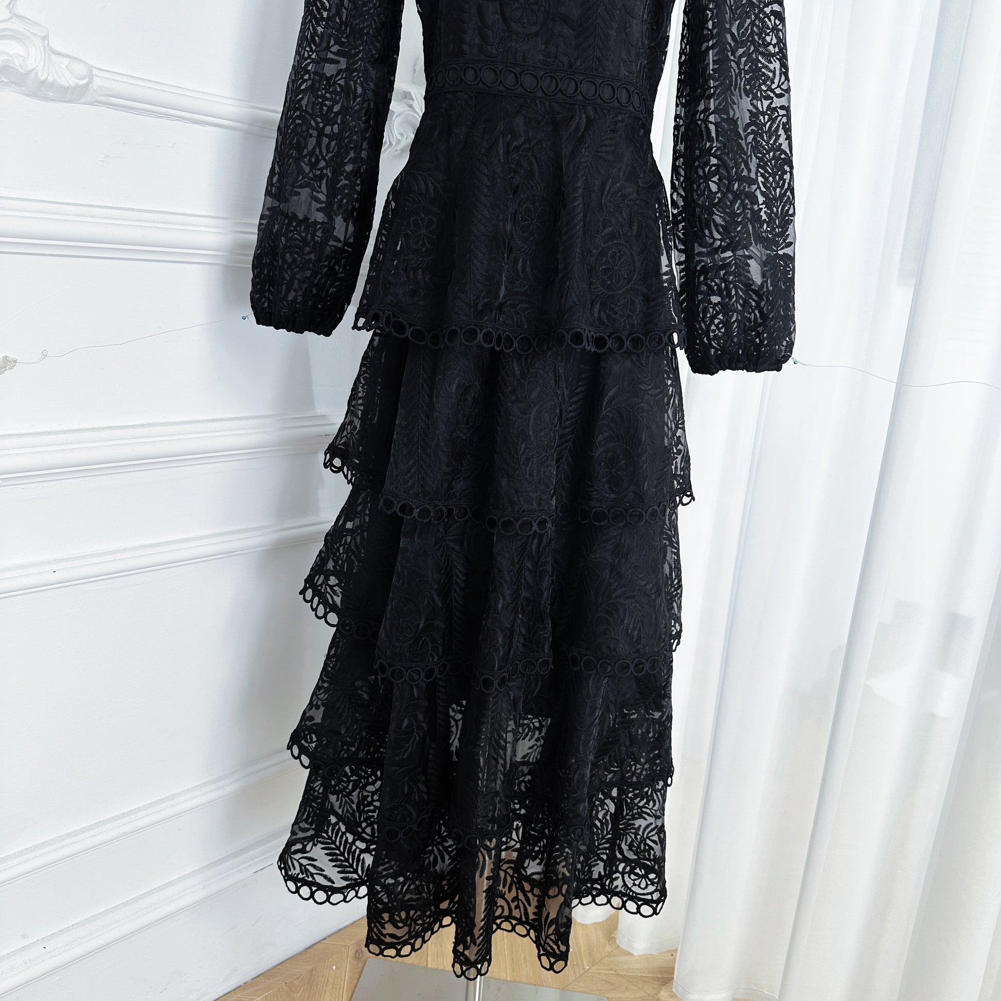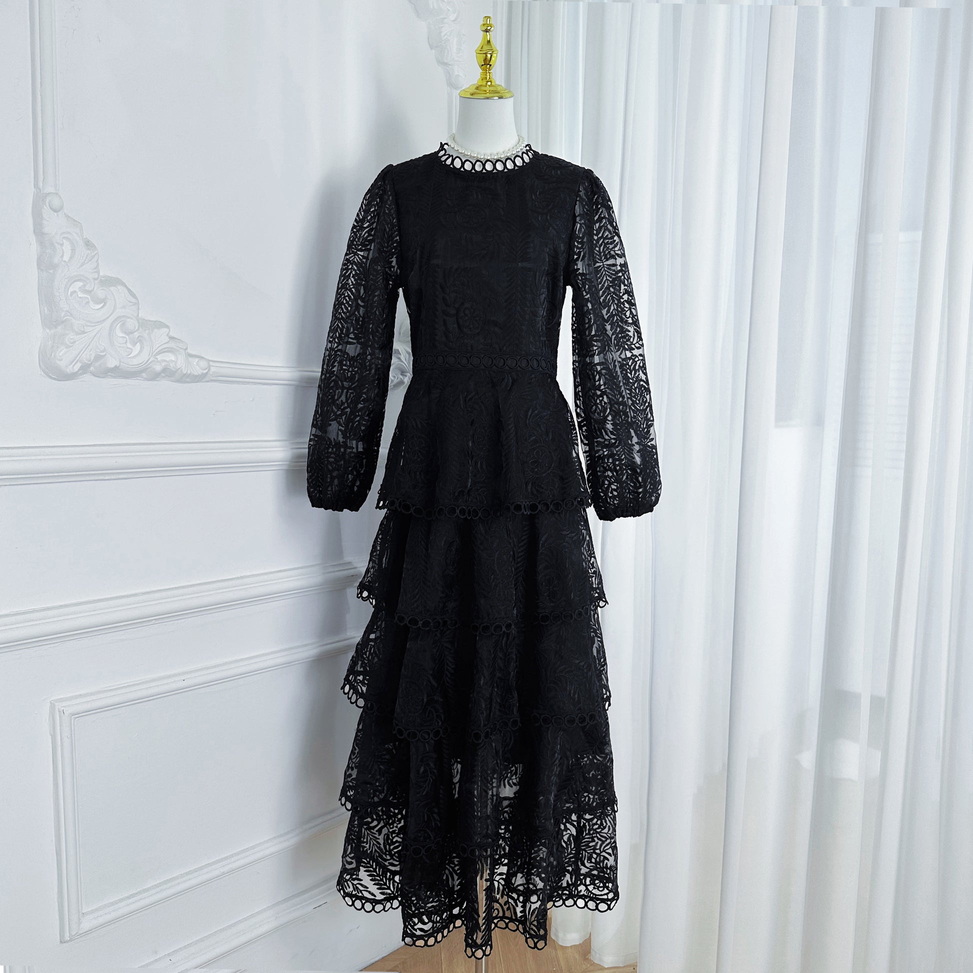 - Design: The entire body is covered with mesh fabric featuring exquisite embroidered patterns, with partial hollowed-out designs, adding an air of elegance and fashion. The multi-layered skirt hem design enhances the three-dimensional effect and dynamic feel of the dress.