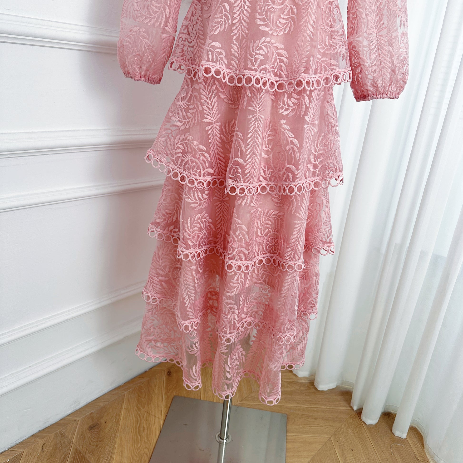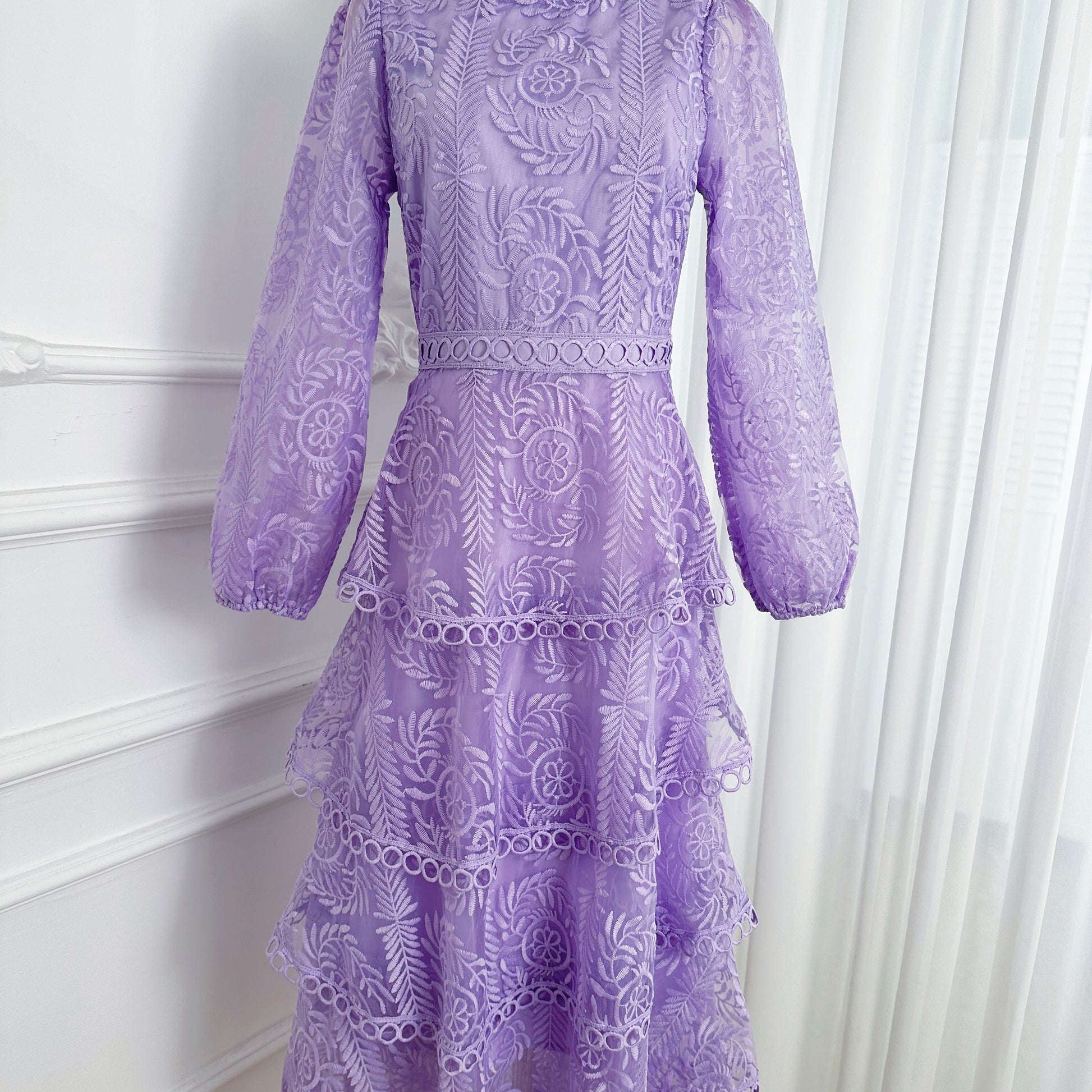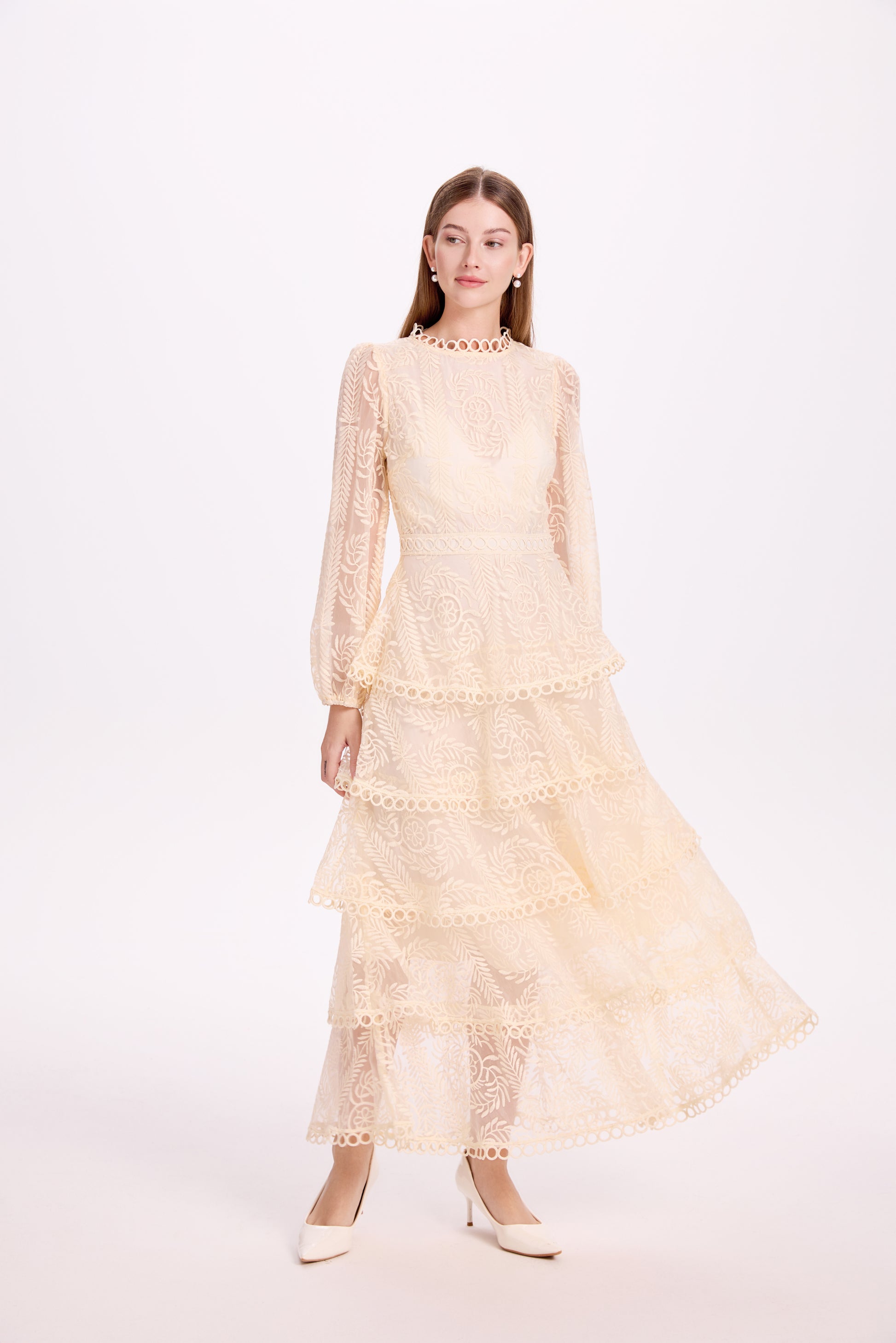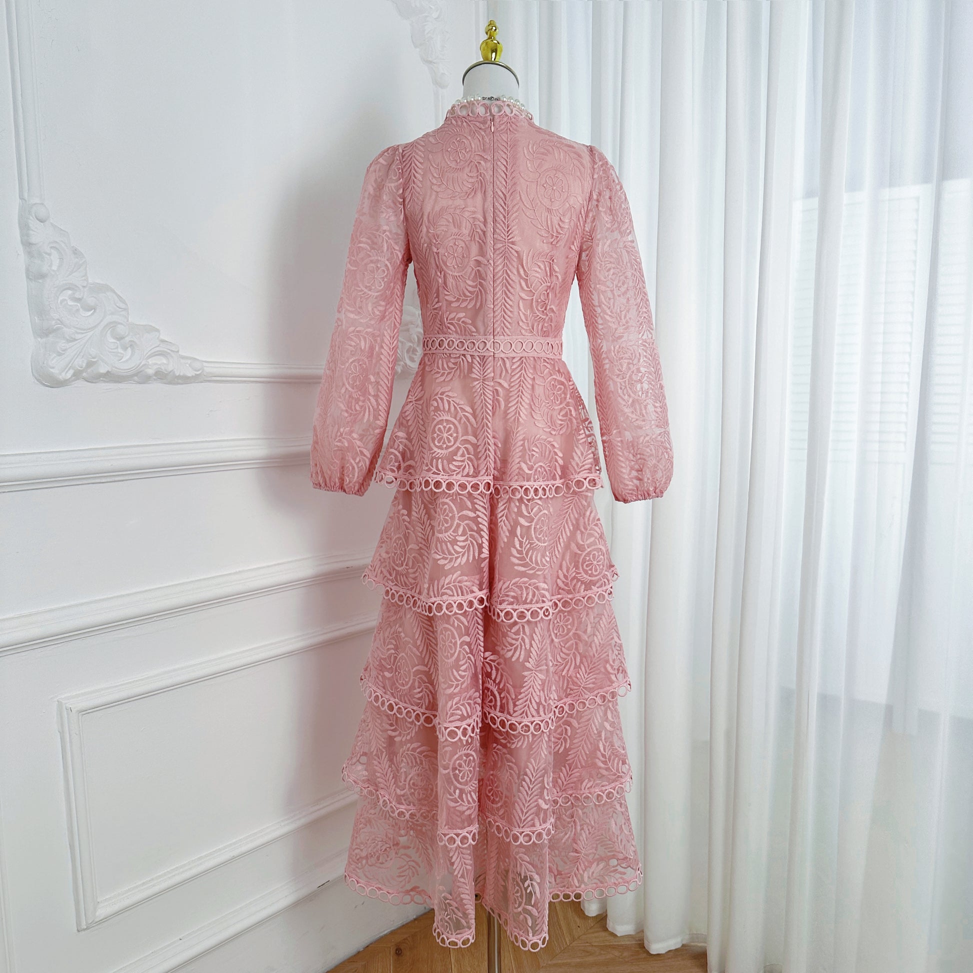 - Design: The entire body is covered with mesh fabric featuring exquisite embroidered patterns, with partial hollowed-out designs, adding an air of elegance and fashion. The multi-layered skirt hem design enhances the three-dimensional effect and dynamic feel of the dress.