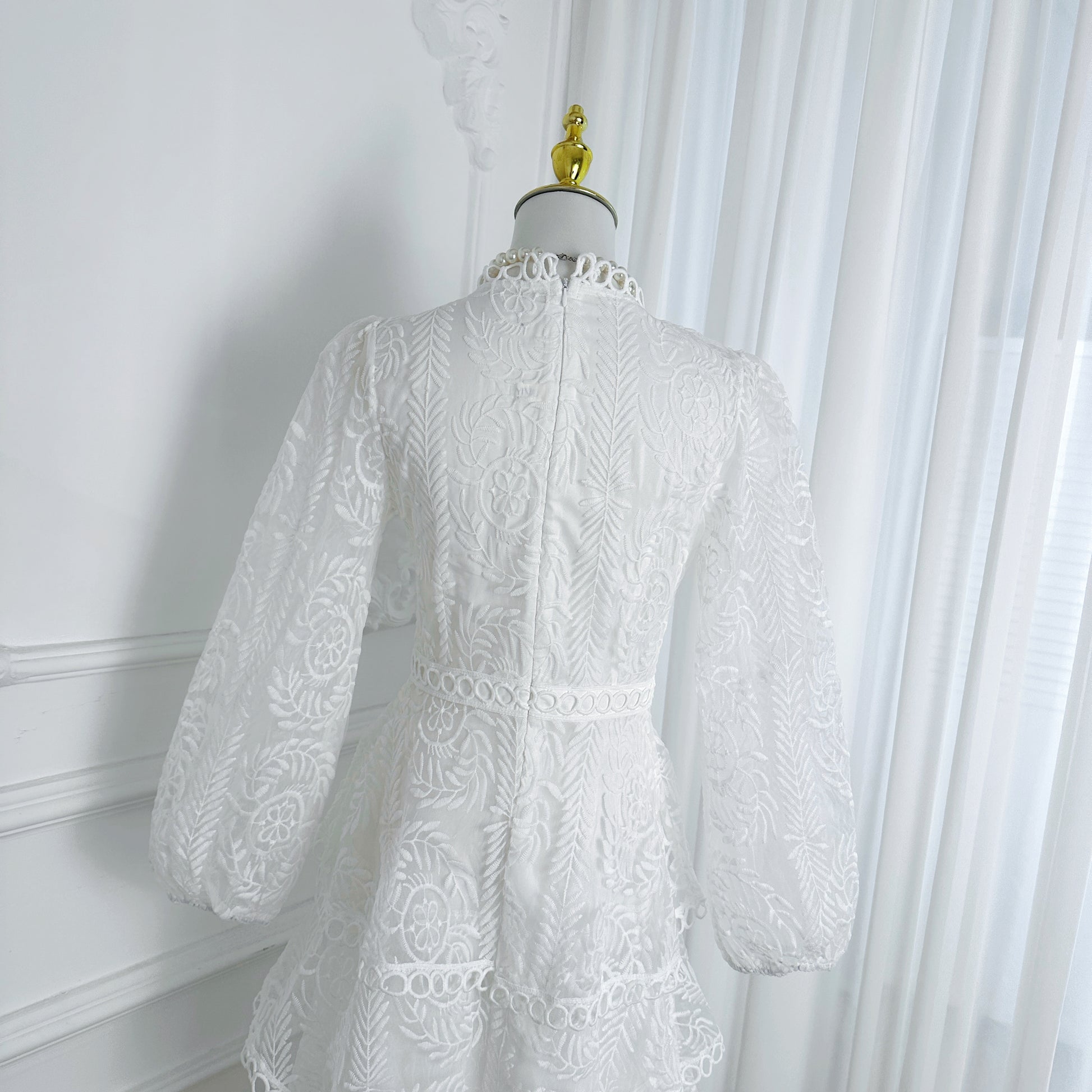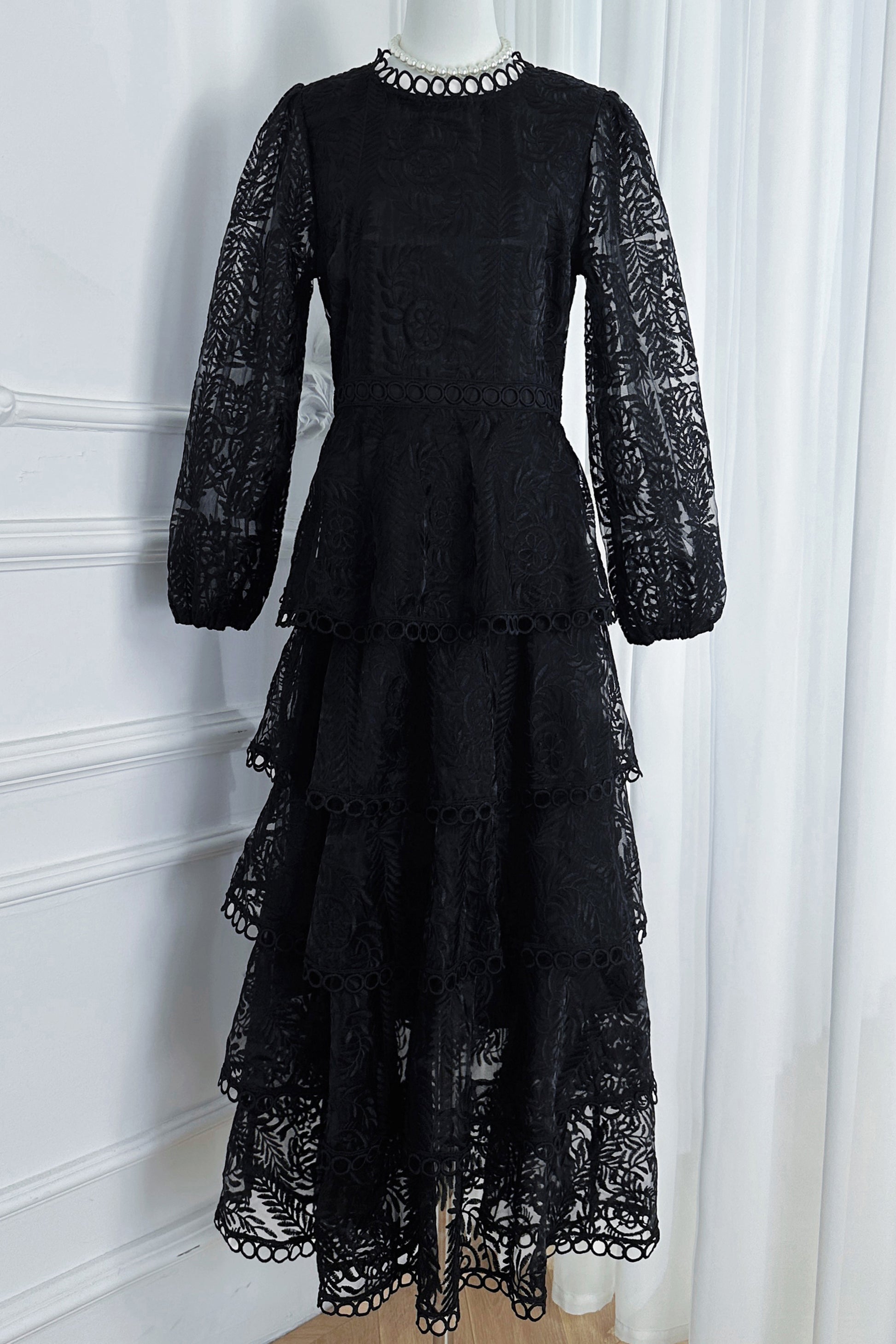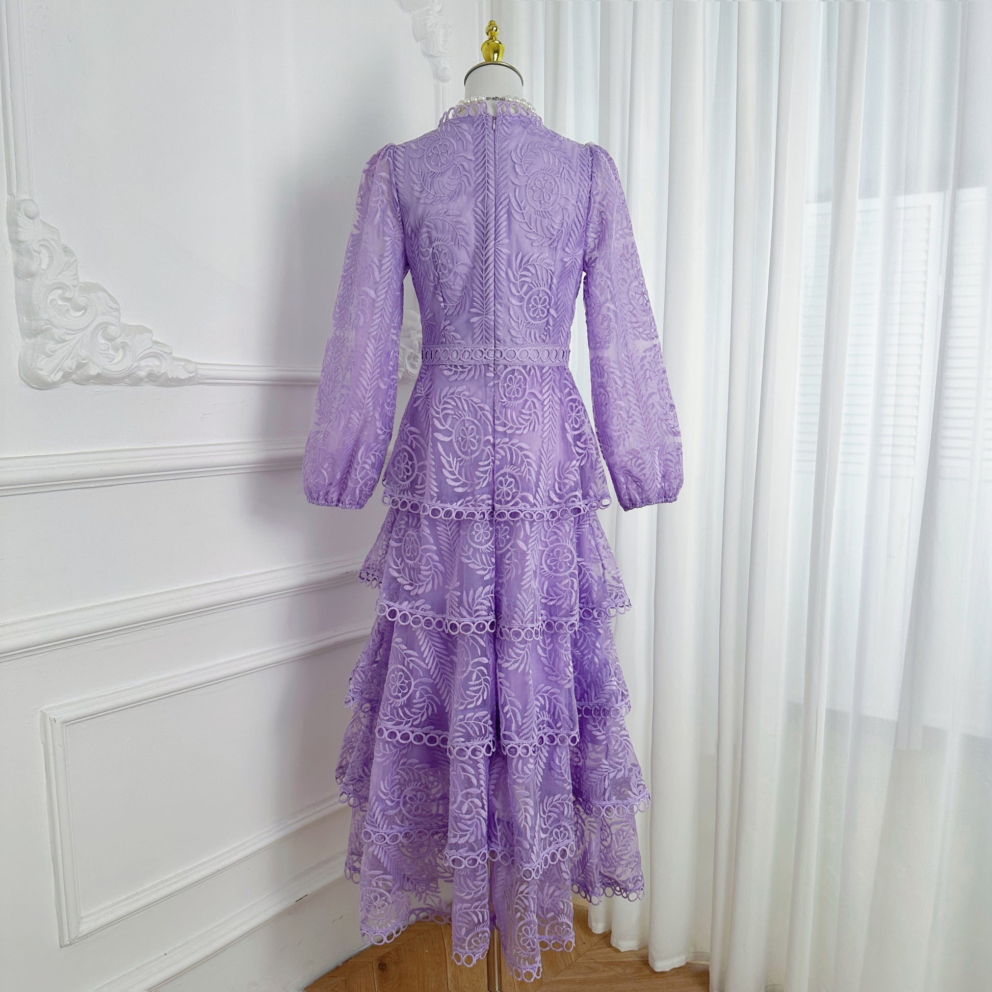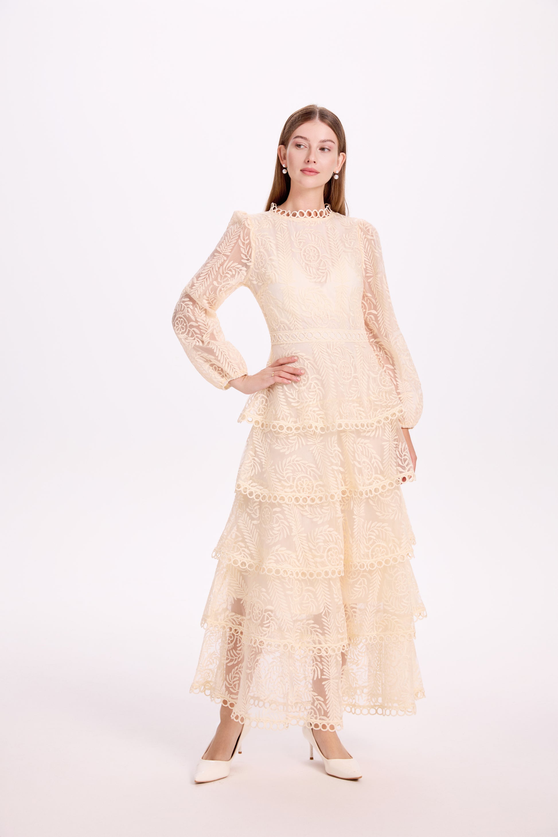 - Design: The entire body is covered with mesh fabric featuring exquisite embroidered patterns, with partial hollowed-out designs, adding an air of elegance and fashion. The multi-layered skirt hem design enhances the three-dimensional effect and dynamic feel of the dress.