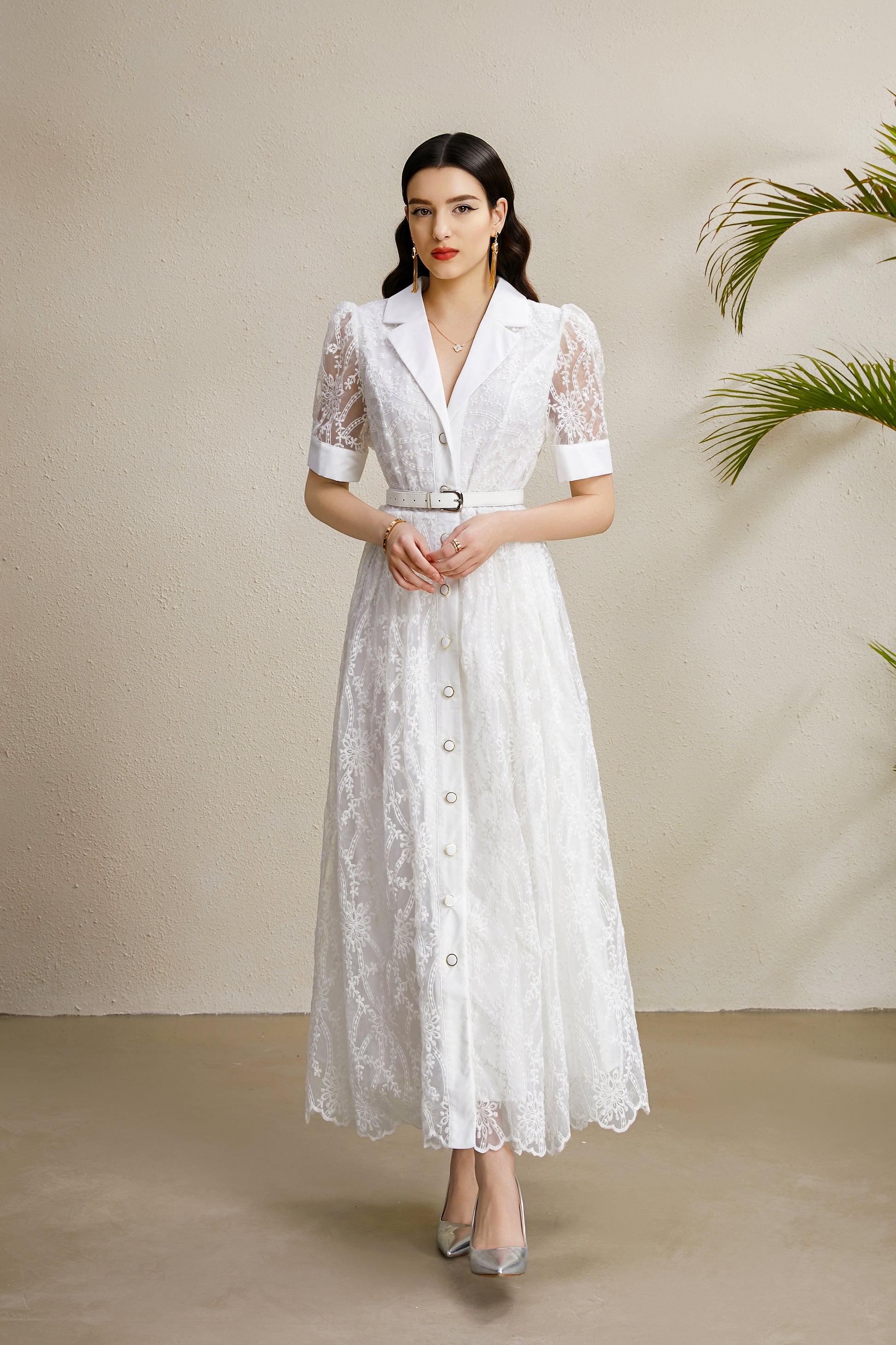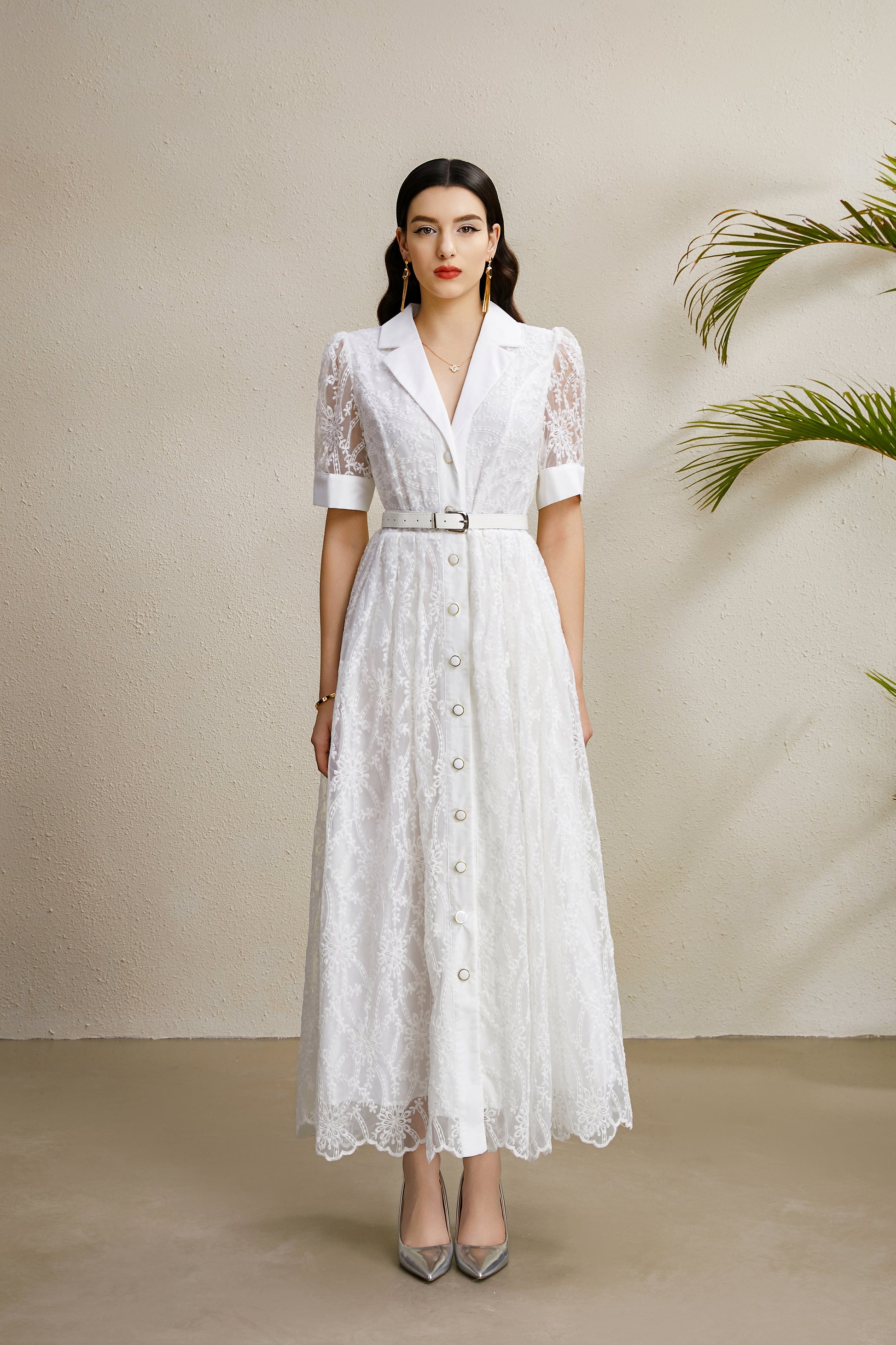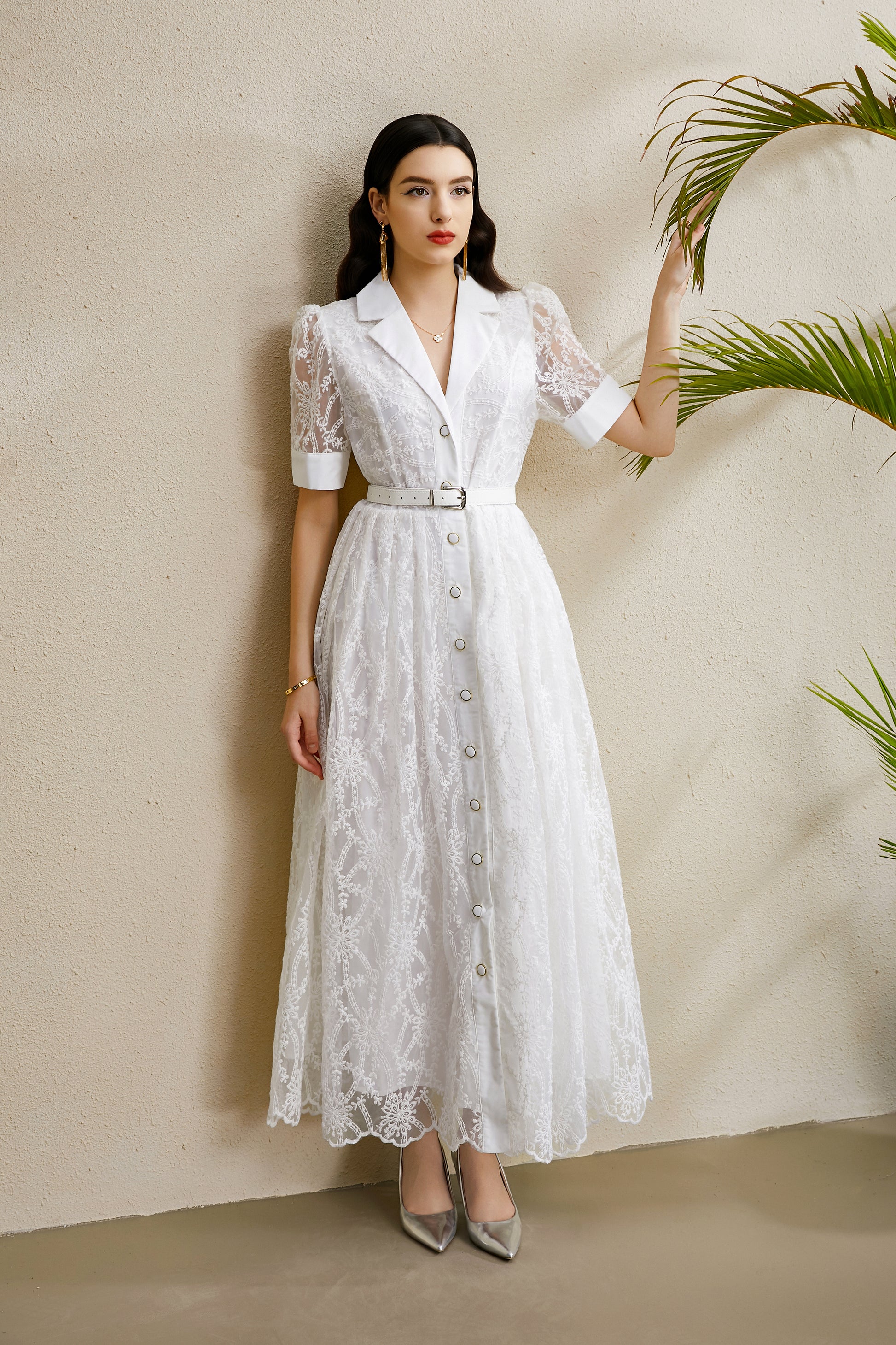 • Design: This mesh embroidered lace dress showcases a perfect blend of elegance and refinement. The dress is made of mesh fabric and covered with exquisite embroidered lace patterns, adding a three-dimensional effect and artistic touch to the garment. The waist is decorated with a pearl belt, which not only highlights the waistline but also adds an overall sense of magnificence.