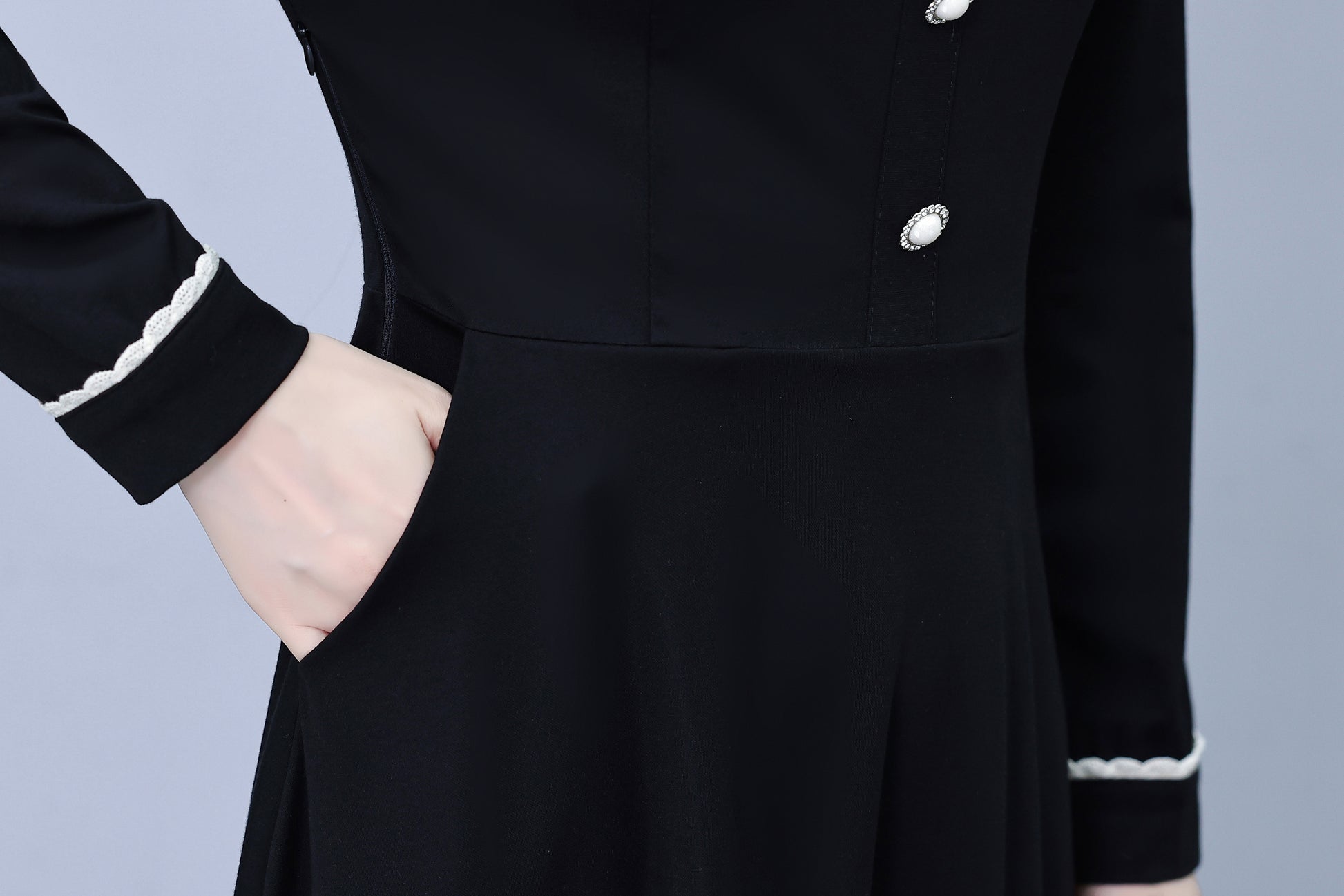 • Features: Long sleeve dress,decorative button, side zipper,double-sided pockets, a-line,black dress,elegant dress,midi length,non-stretch,contrast peter pan collar.Perfect for spring and fall.