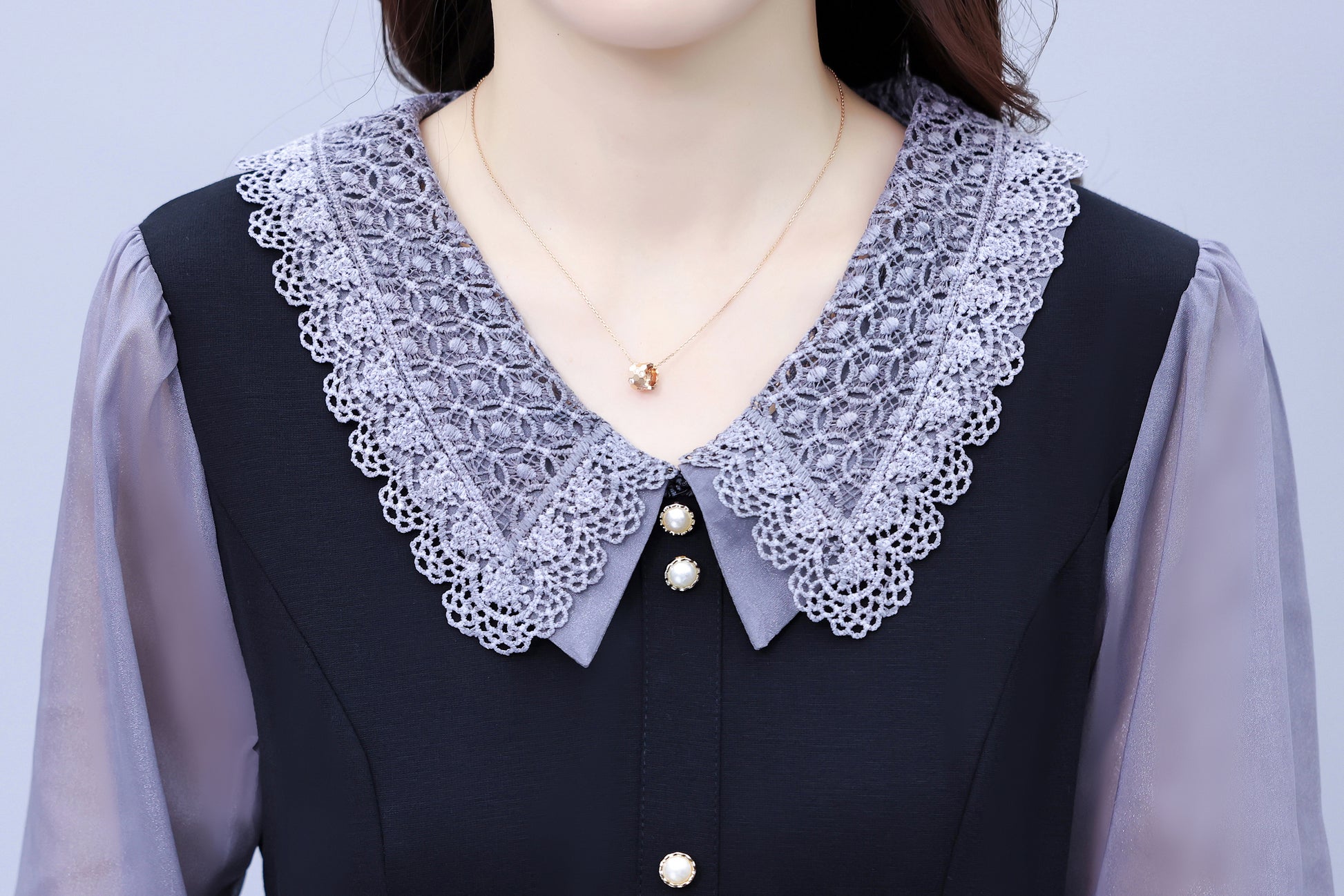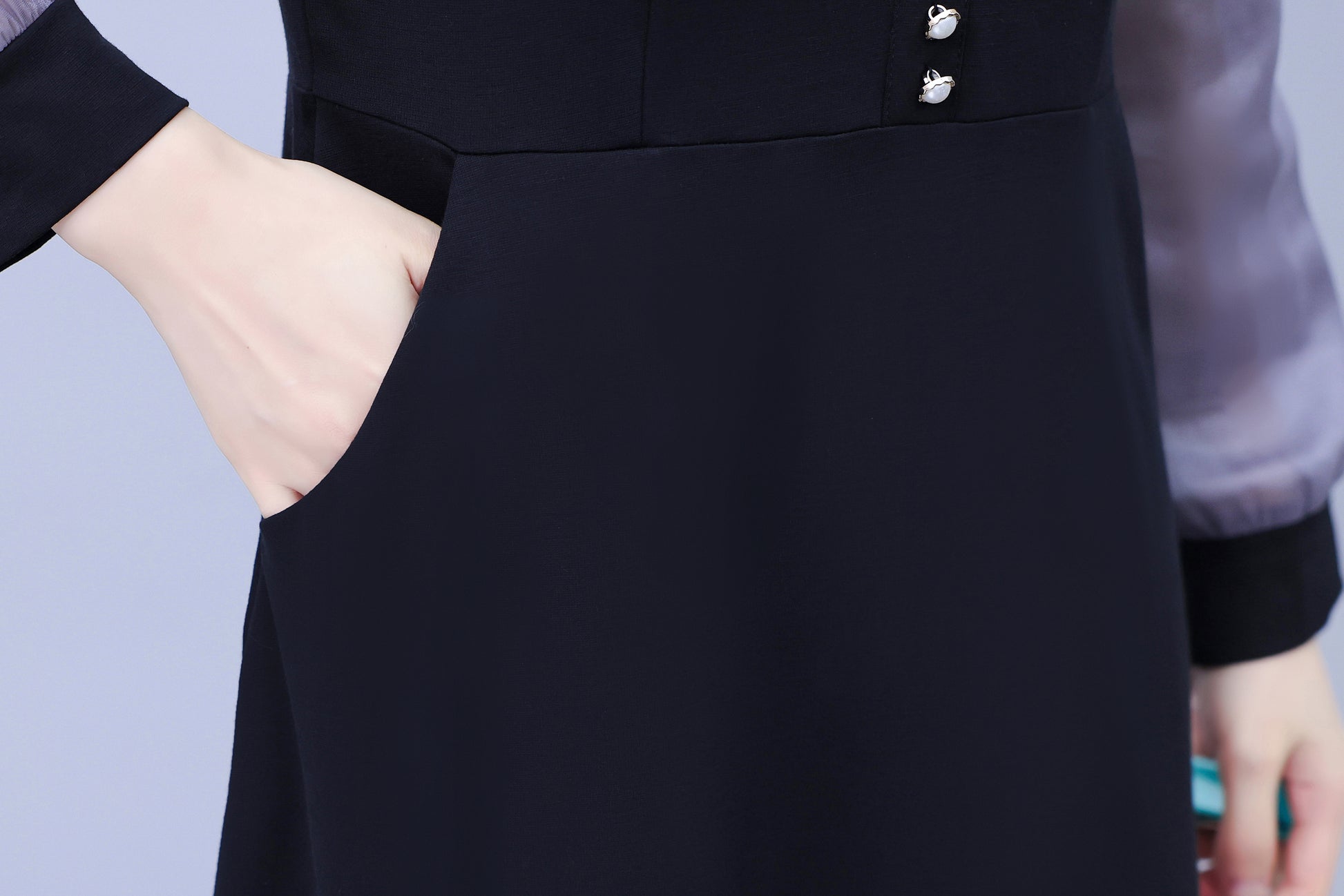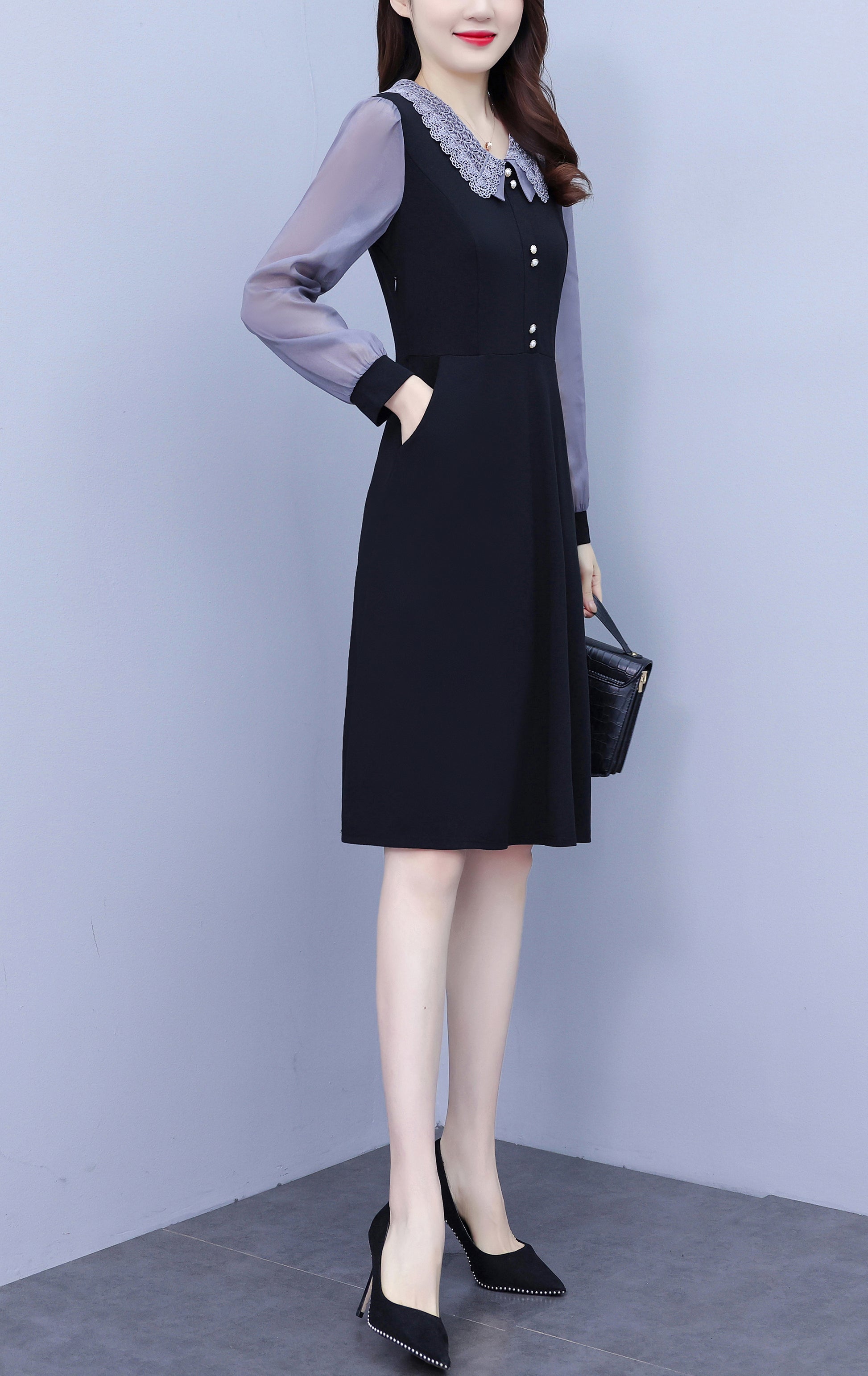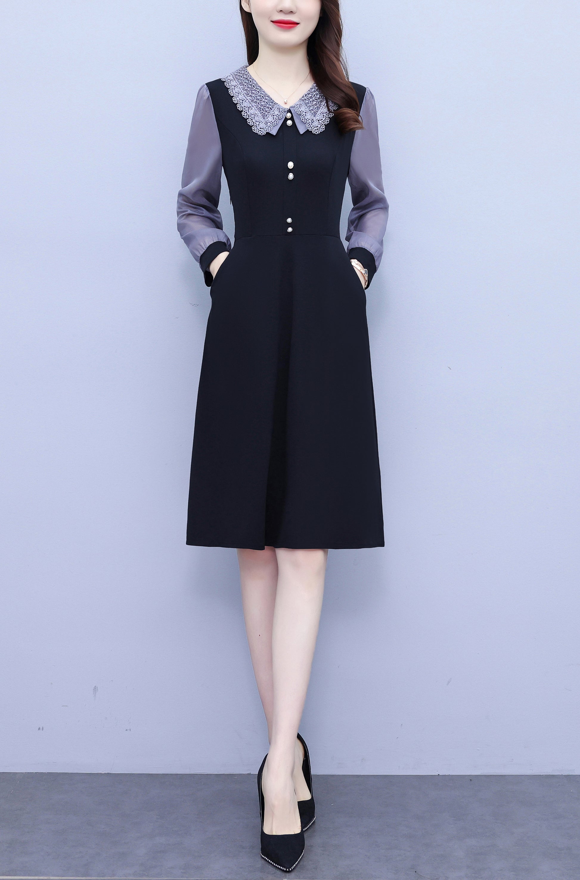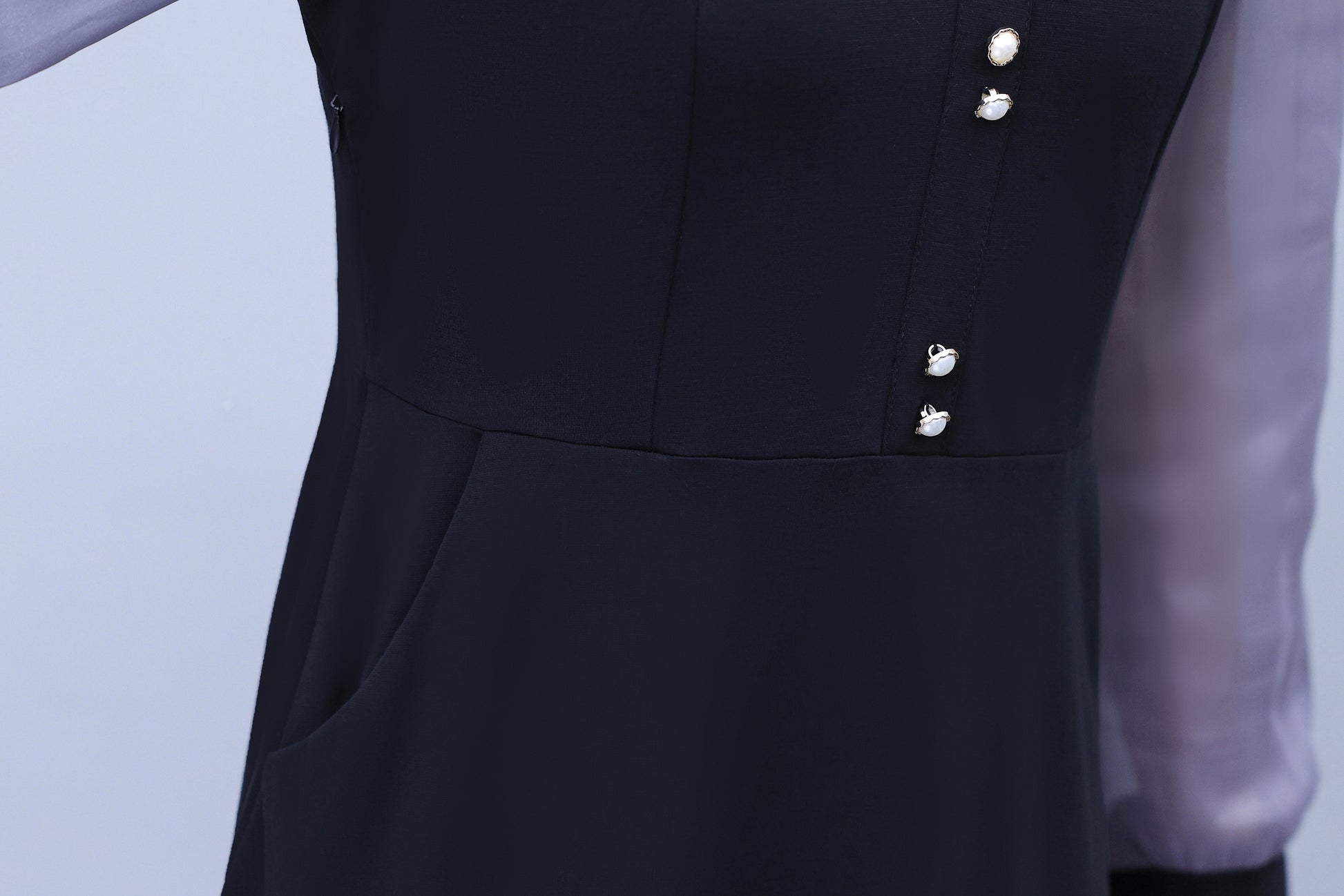 - Features: Long sleeve dress,patchwork dress,decorative button, side zipper,double-sided pockets, a-line,black dress,midi length,non-stretch,contrast peter pan collar.