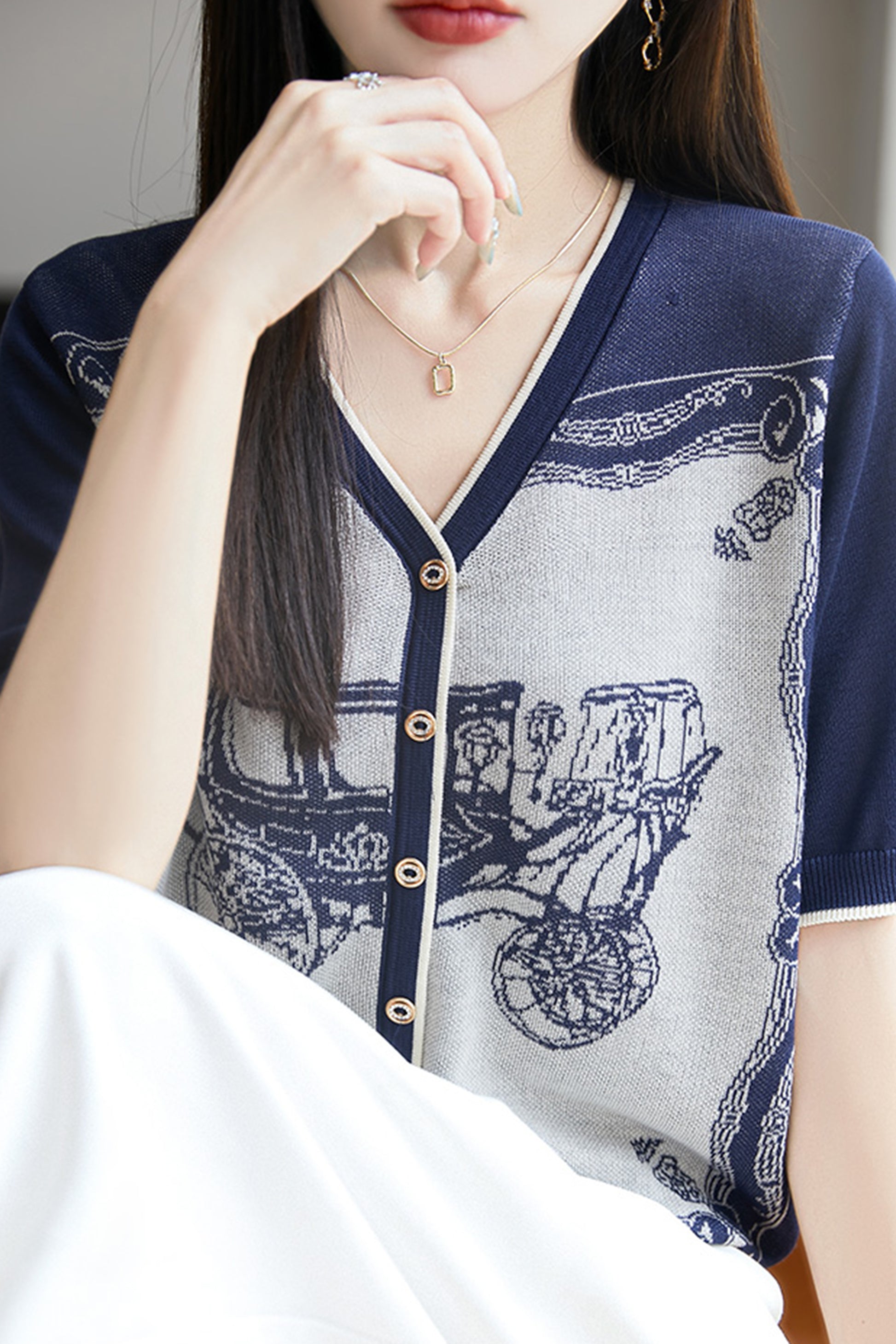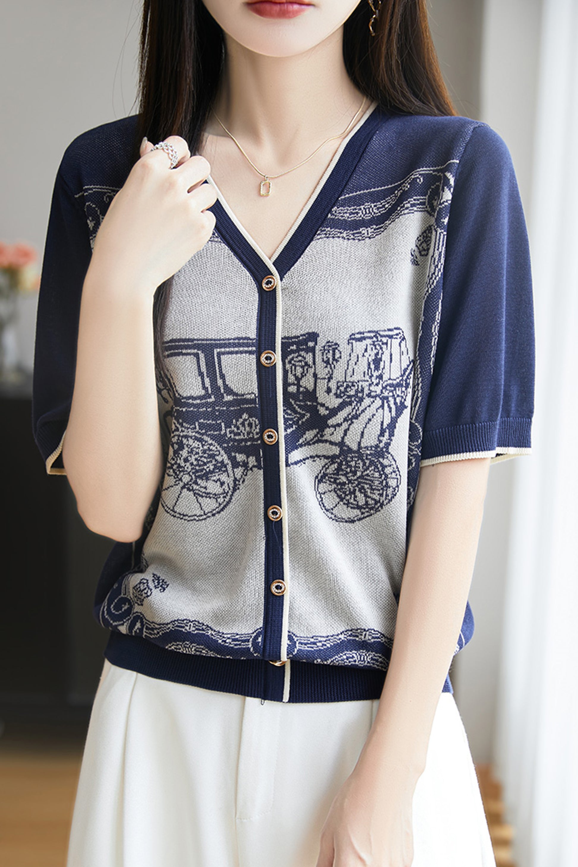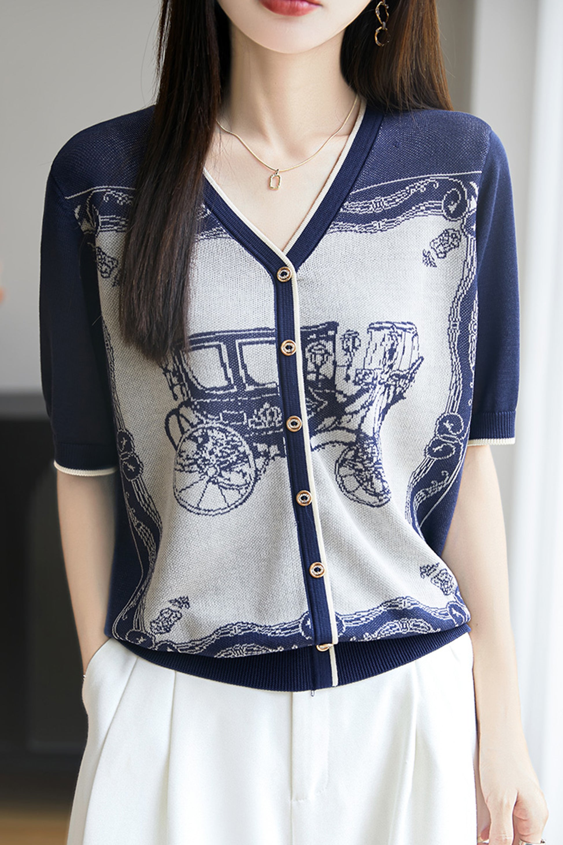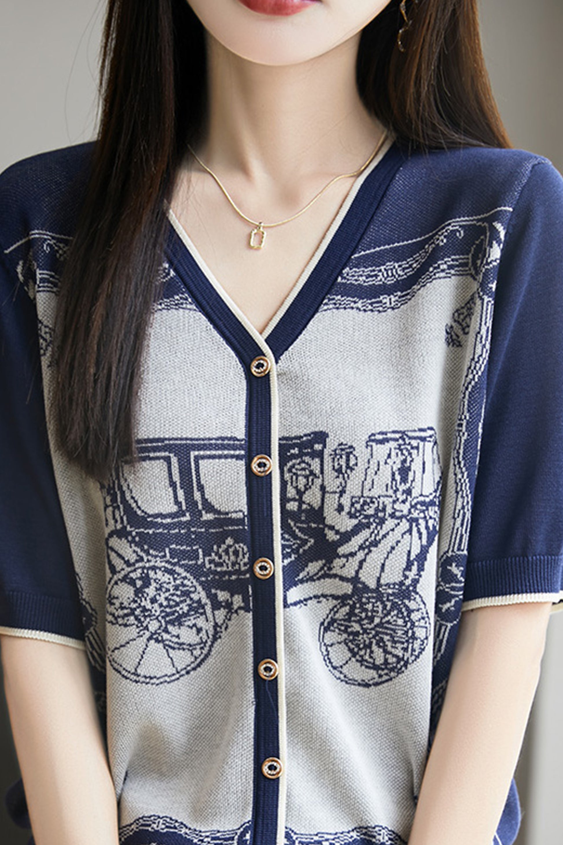 • Features: Summer top, V-neck, thin knitted cardigan, short sleeves, pattern printing, buttons, soft fabric, good skin affinity, comfortable wearing experience.
