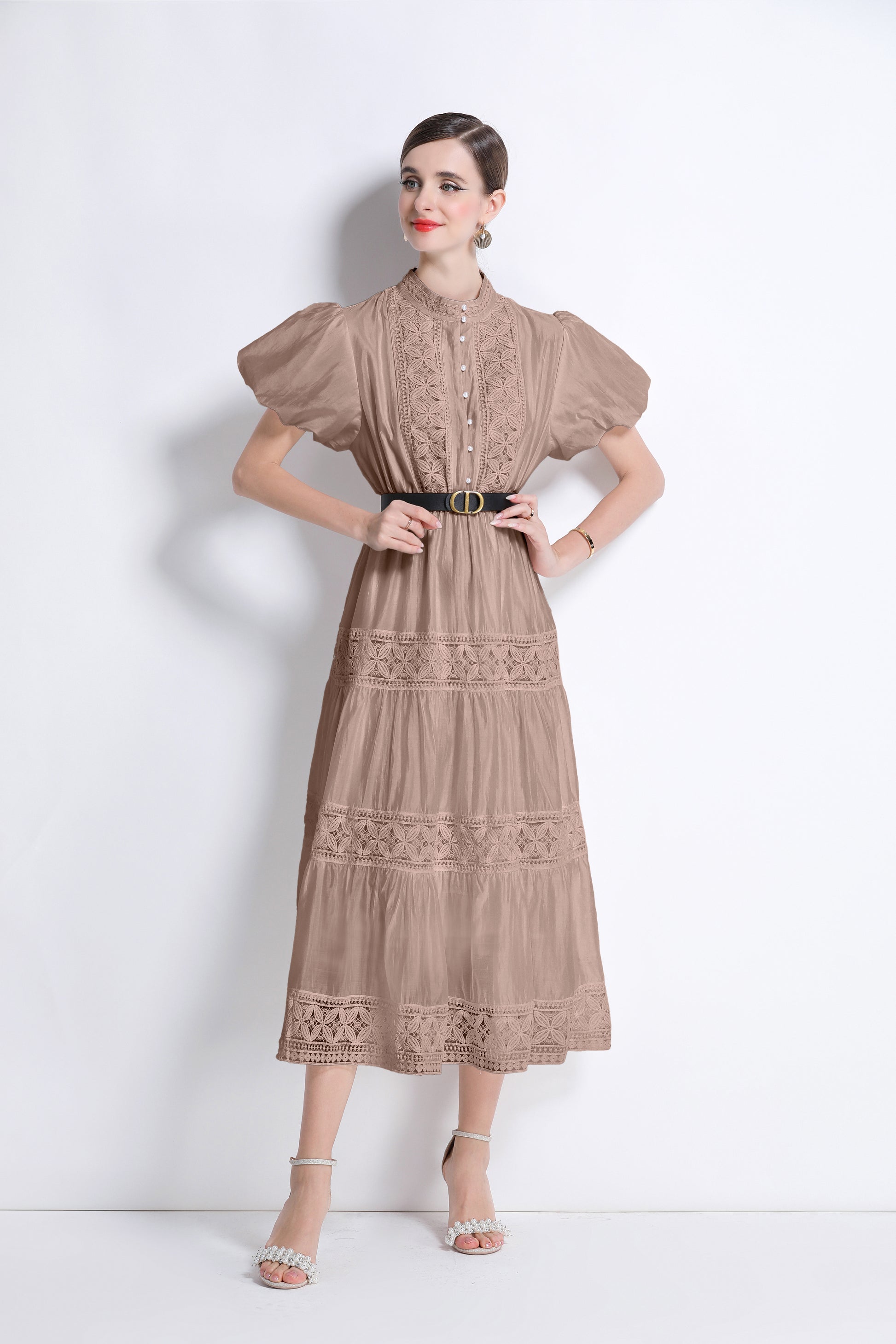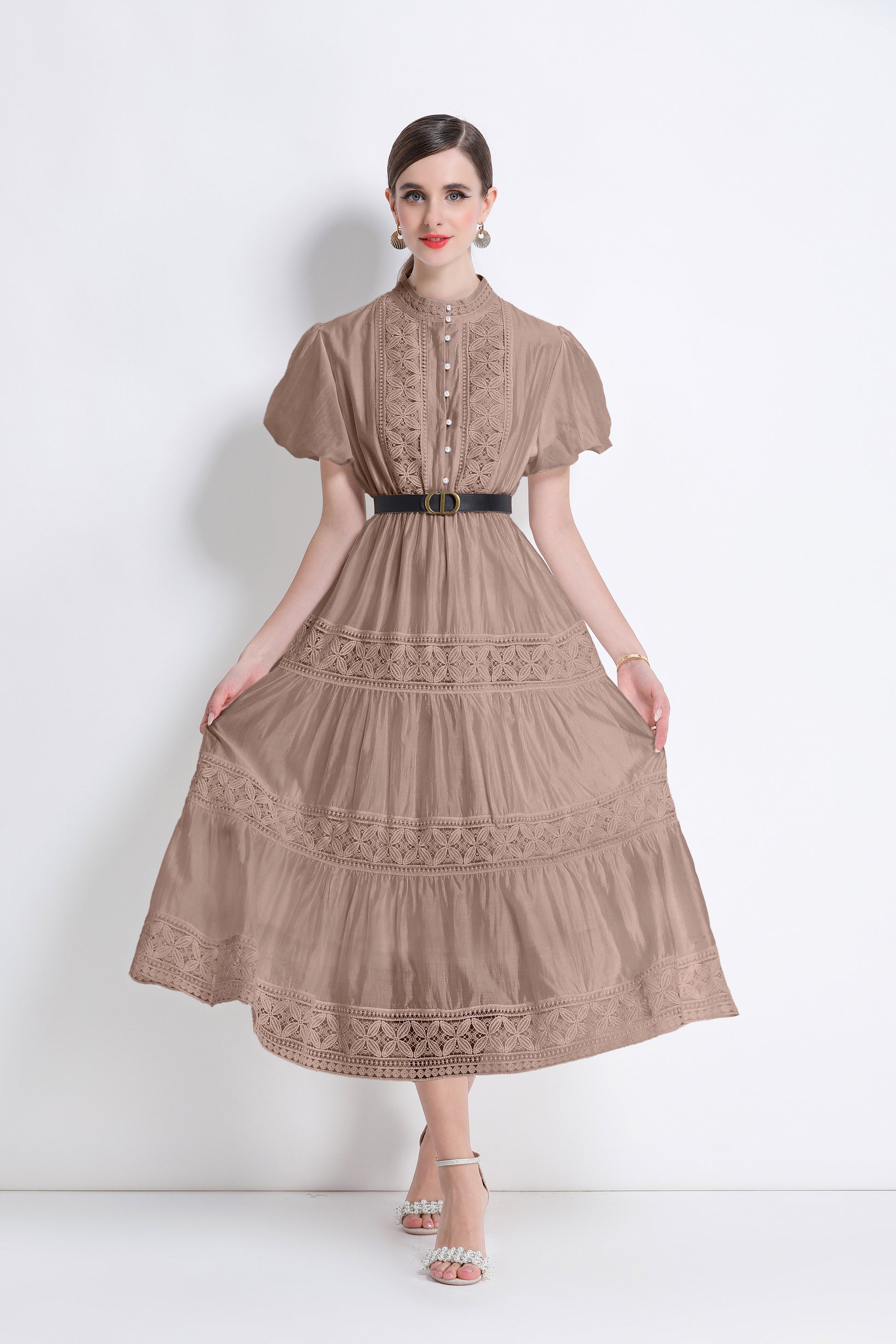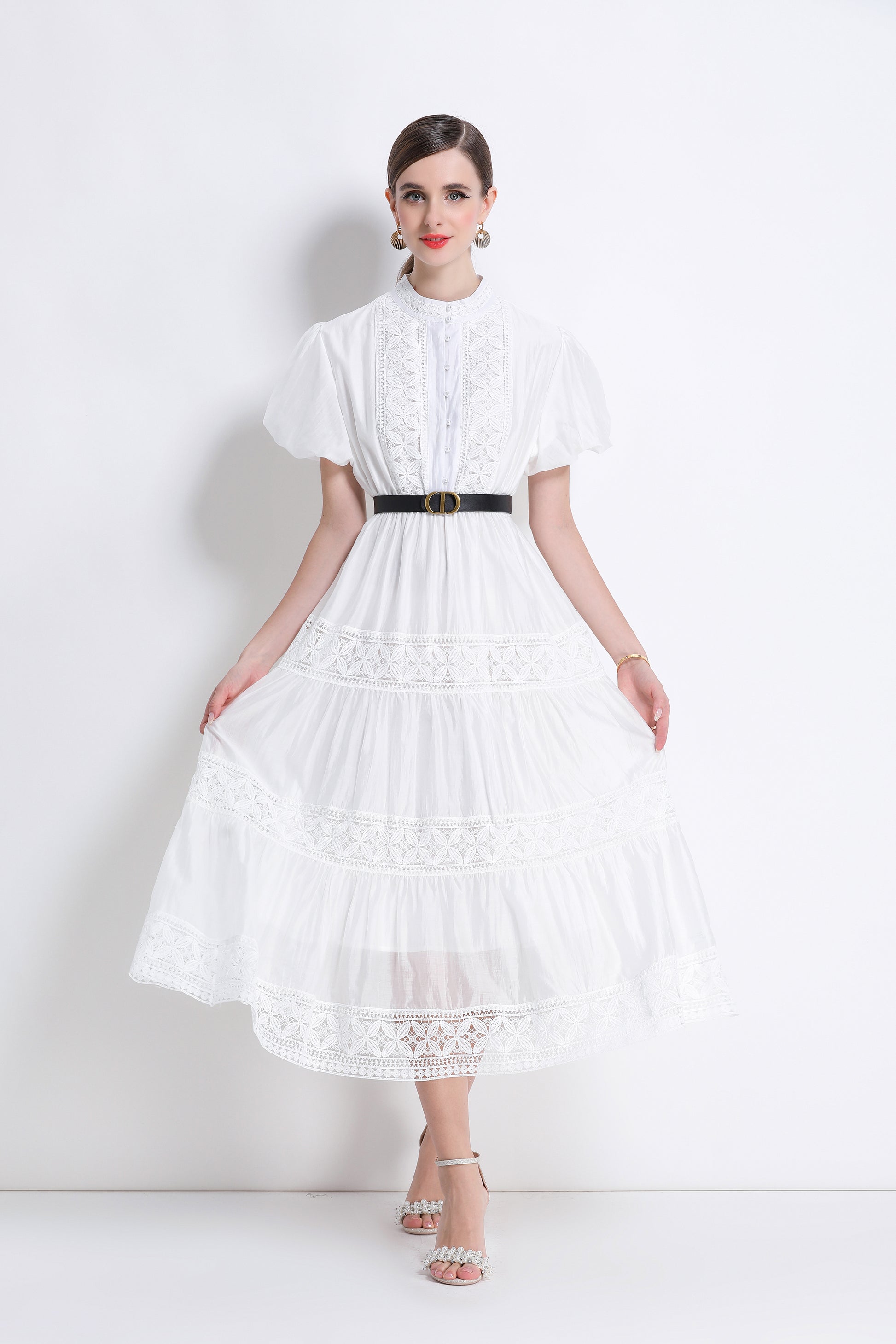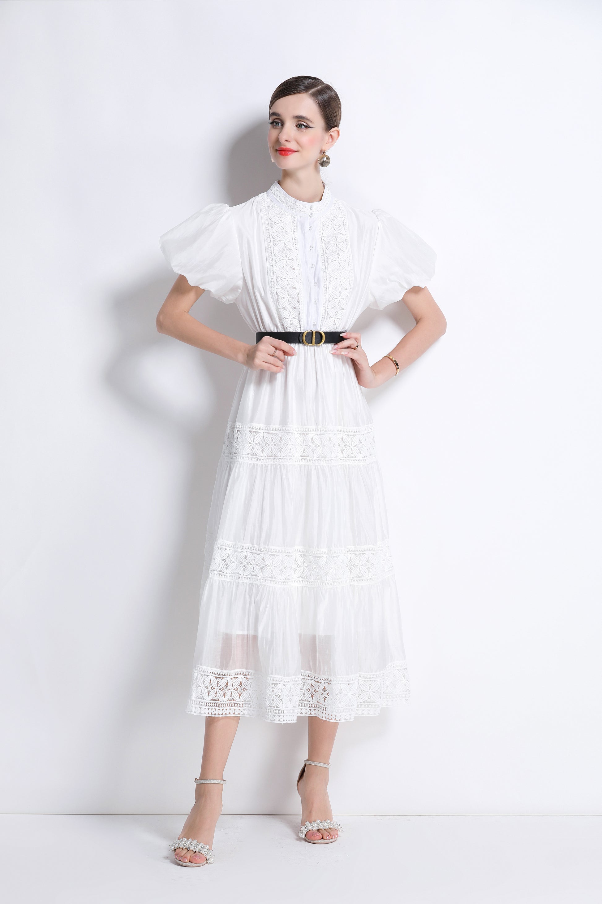- Features: Summer dress, short sleeves with puffed sleeves, round neck, front buttons, lace trim, belt, A-line. The lightweight and breathable fabric is very suitable for summer.