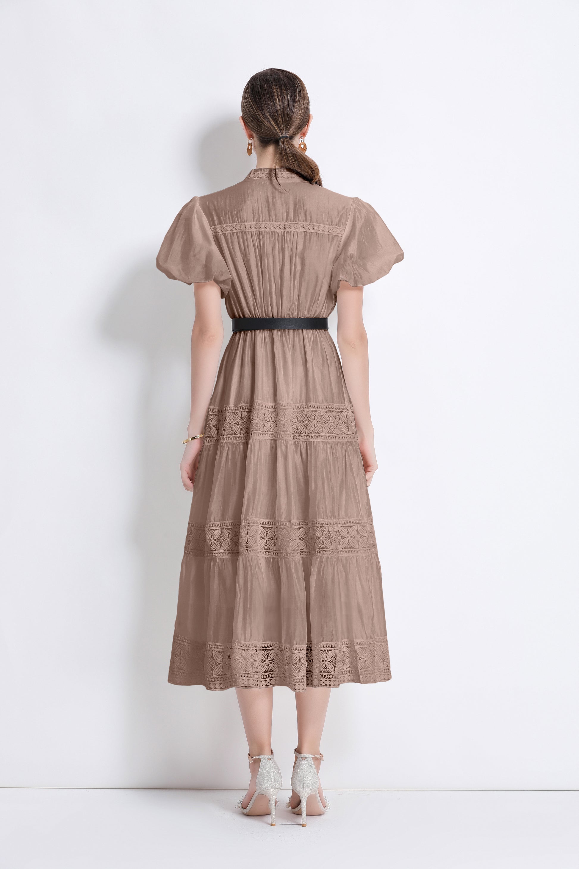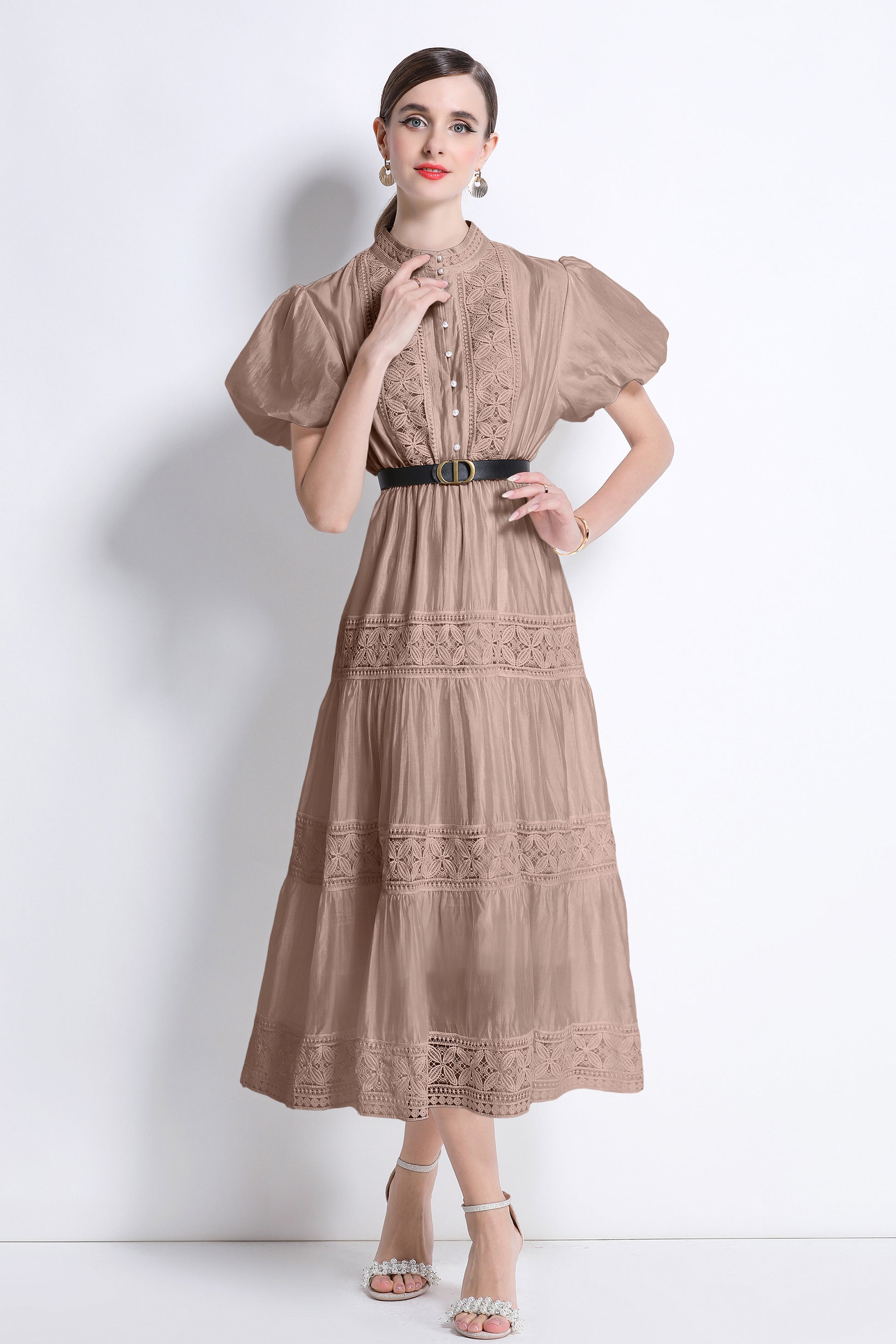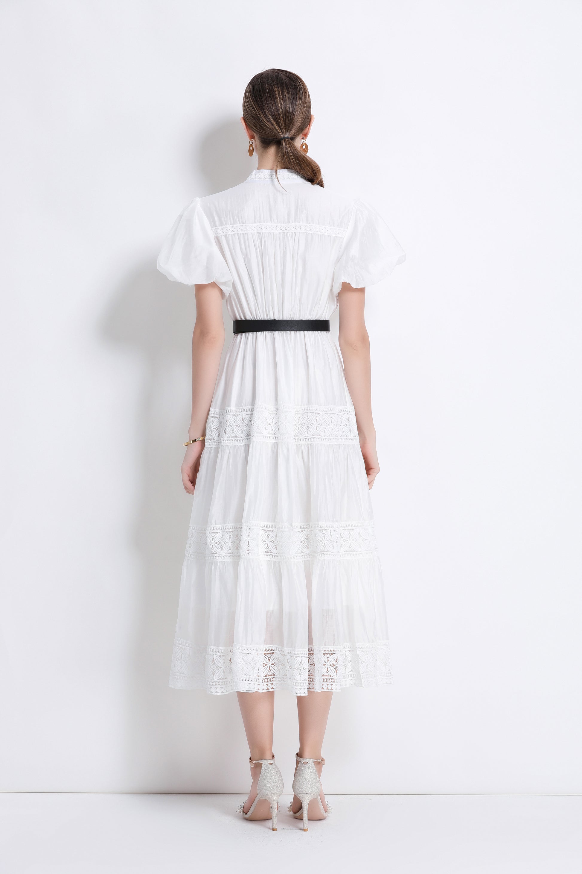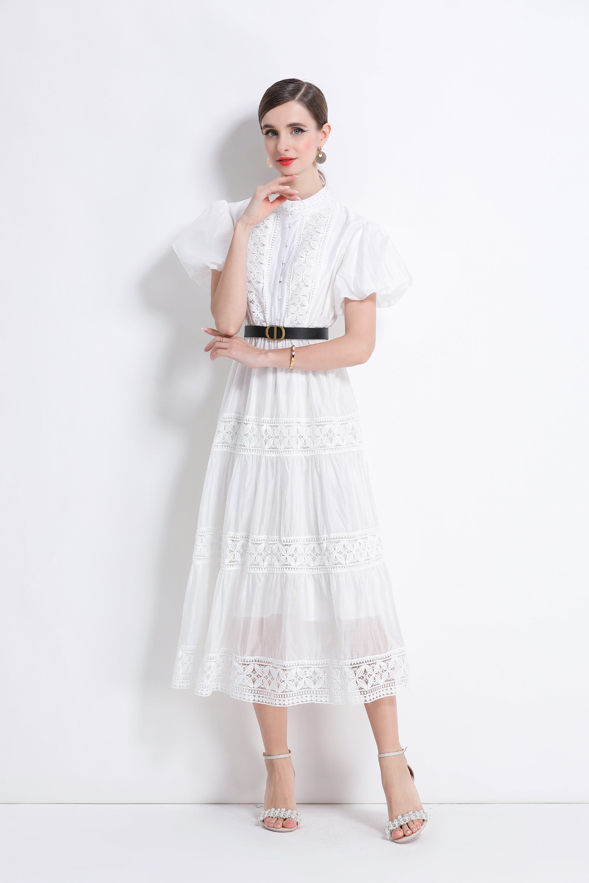 - Features: Summer dress, short sleeves with puffed sleeves, round neck, front buttons, lace trim, belt, A-line. The lightweight and breathable fabric is very suitable for summer.