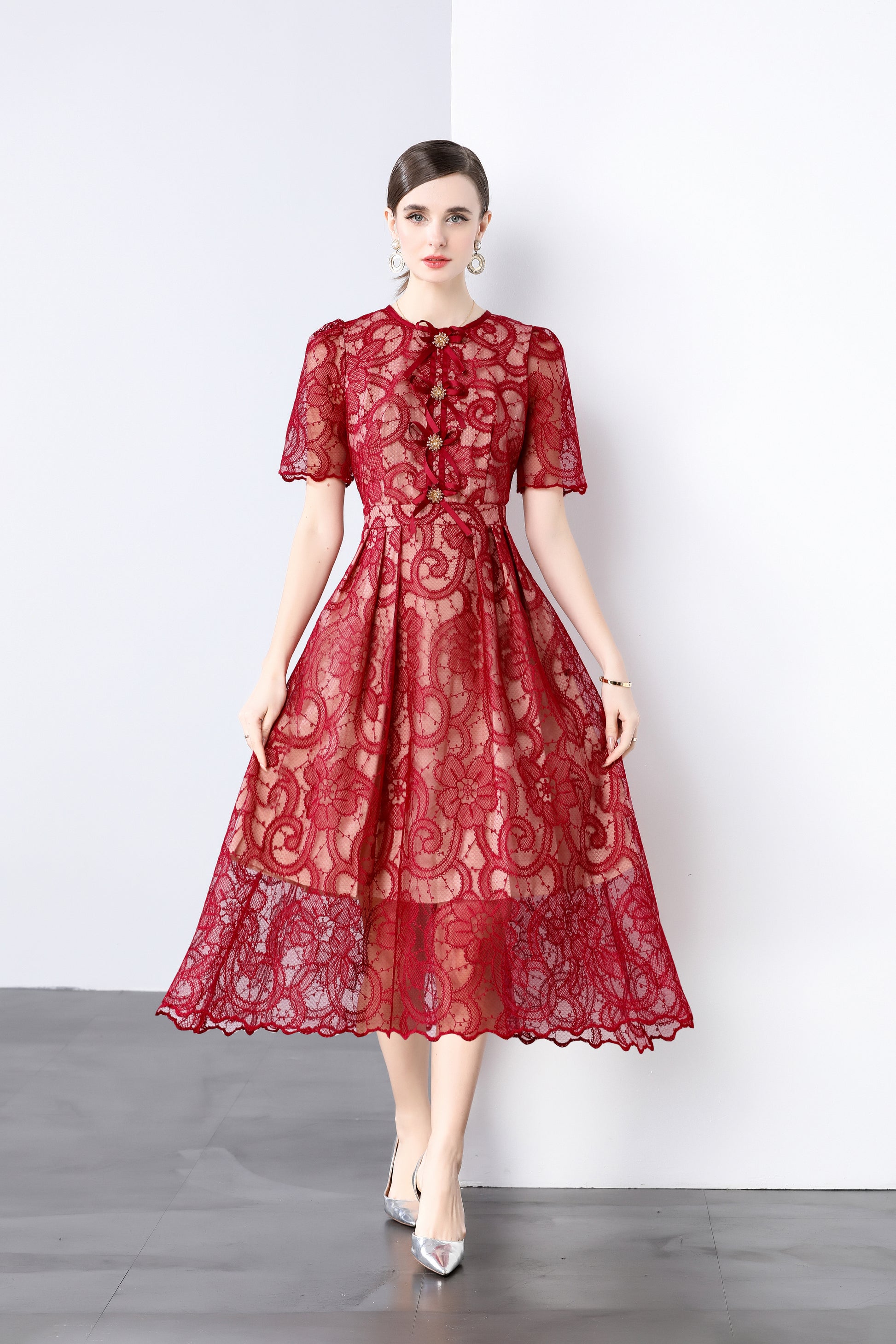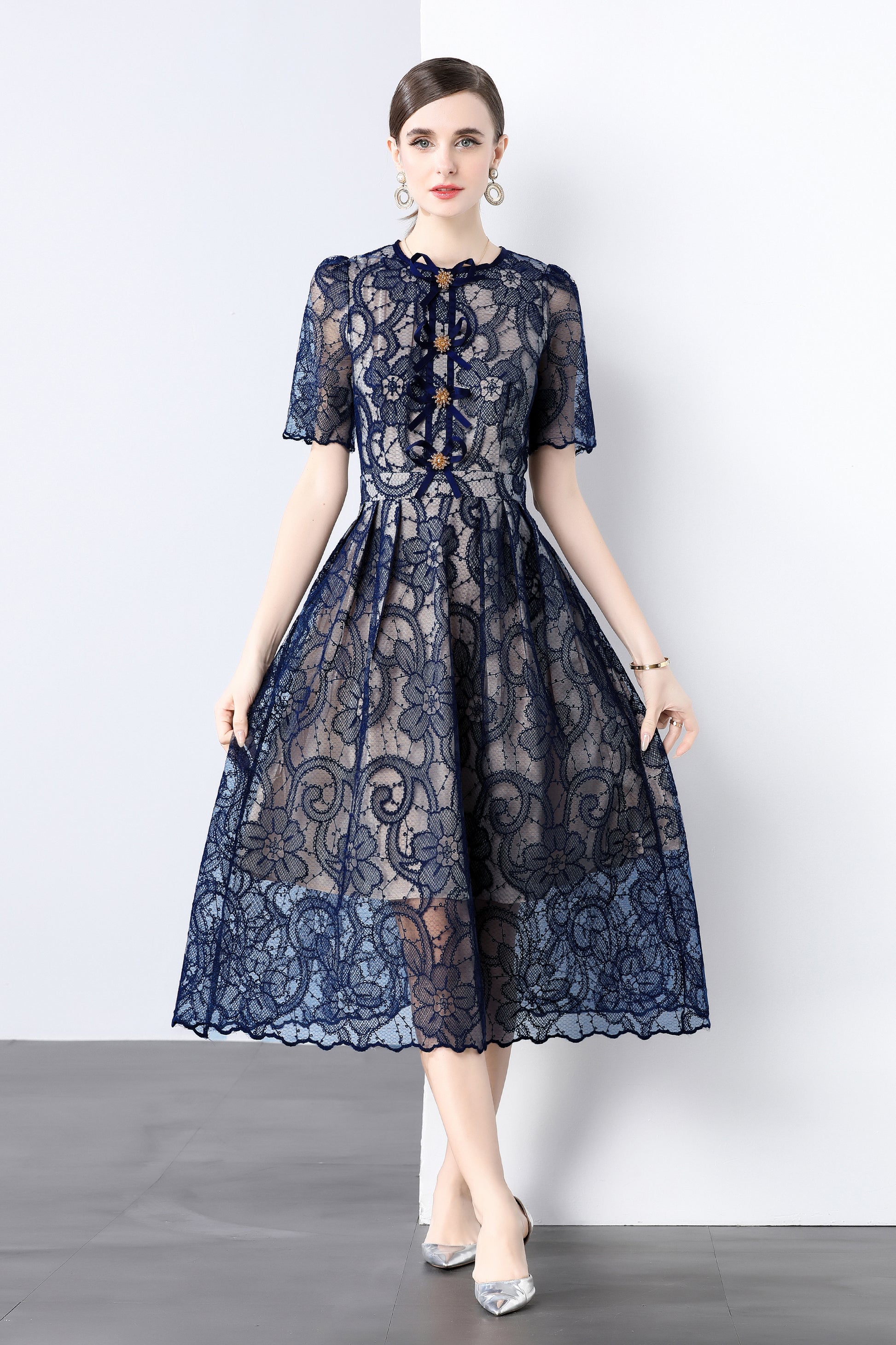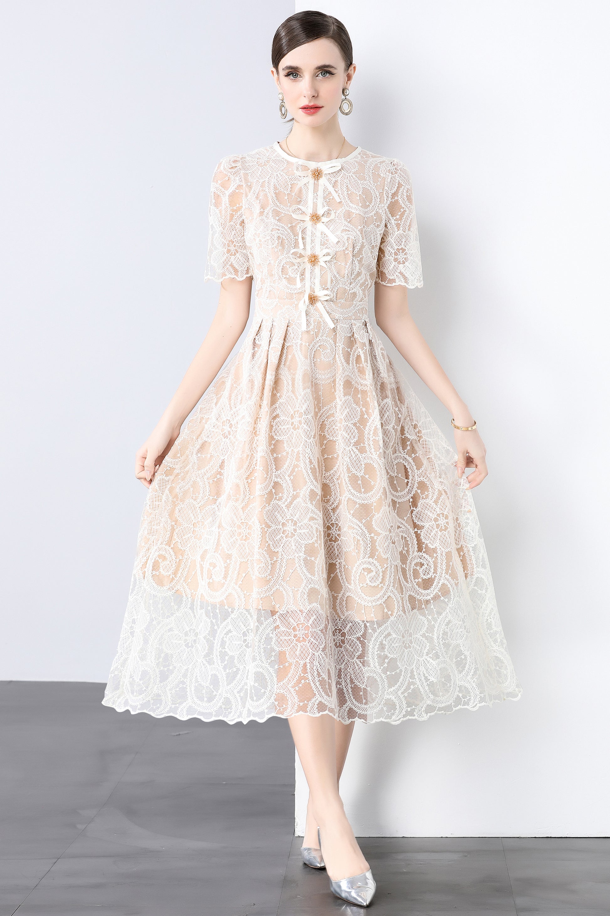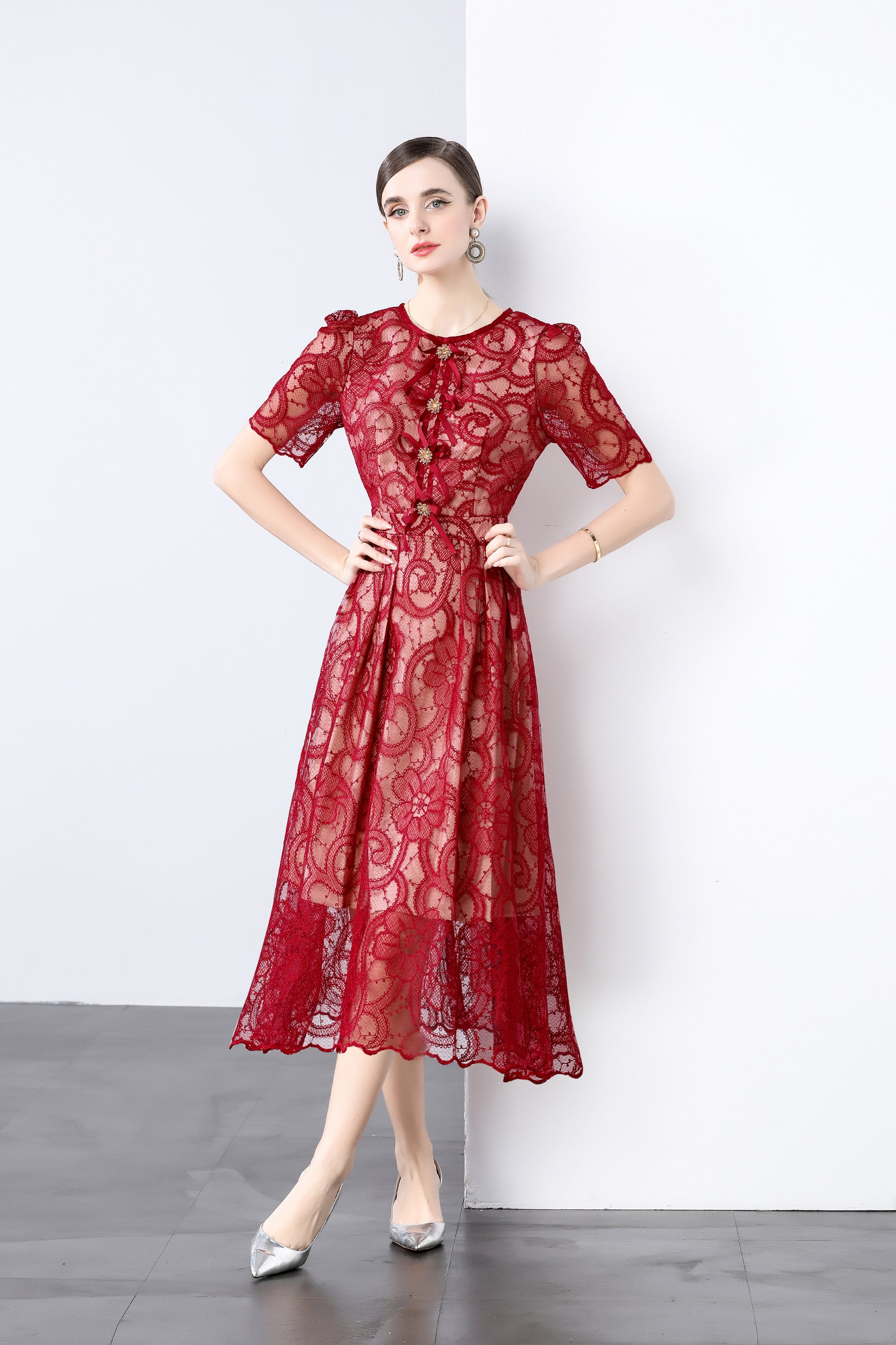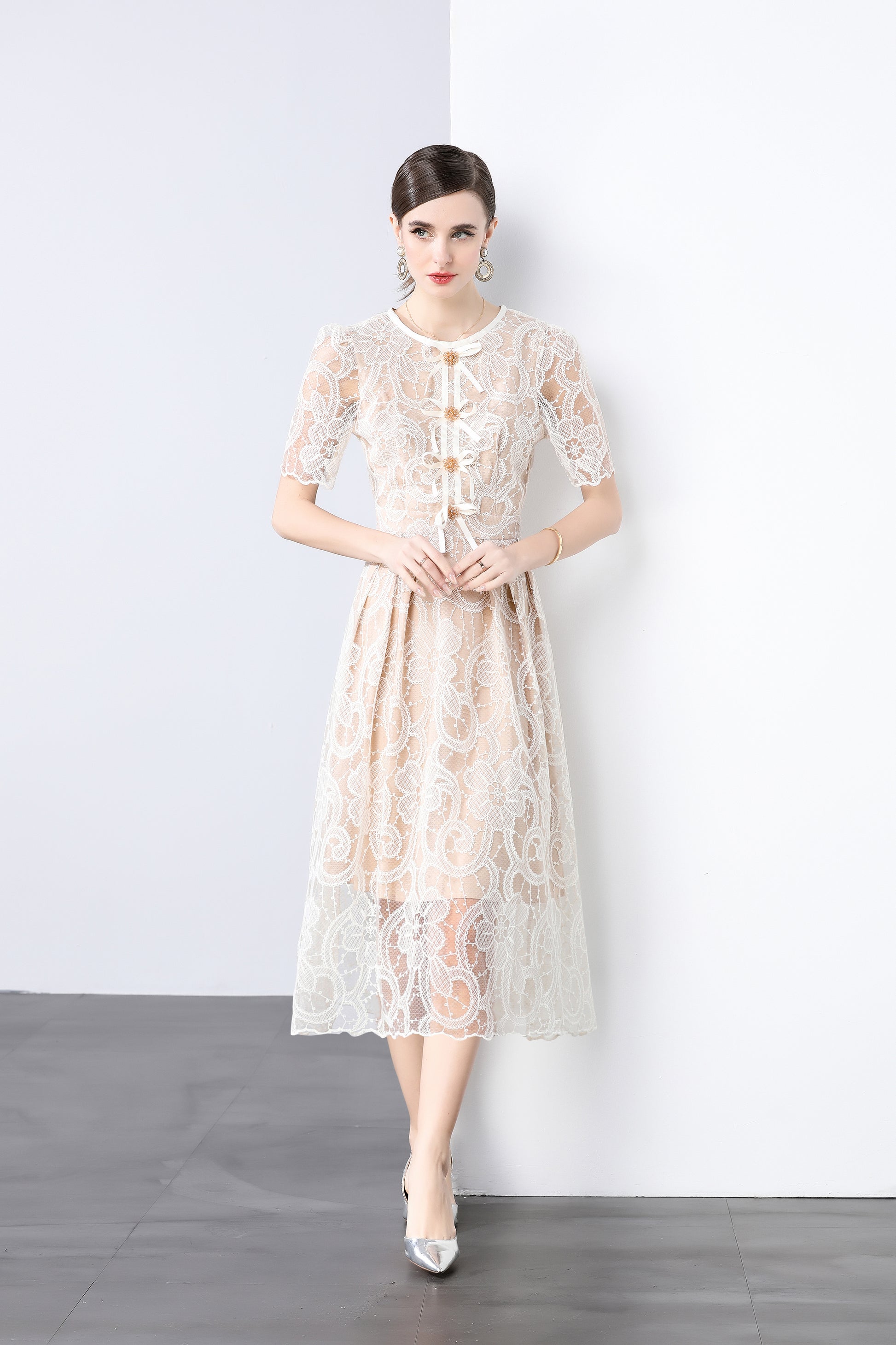 - Features: Classic crewneck,puff sleeve,solid color, high waist, single-breasted,lightweight and breathable embroidery mesh lace, a midi flowy dress.