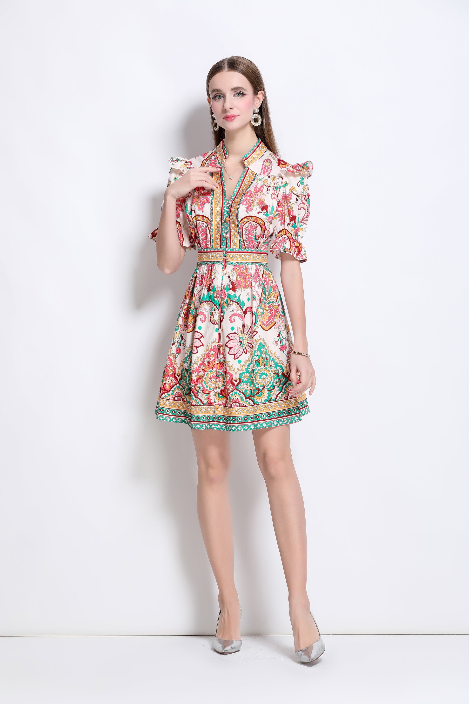 Women's Puff Sleeve V-Neck Print Split Mini Dress