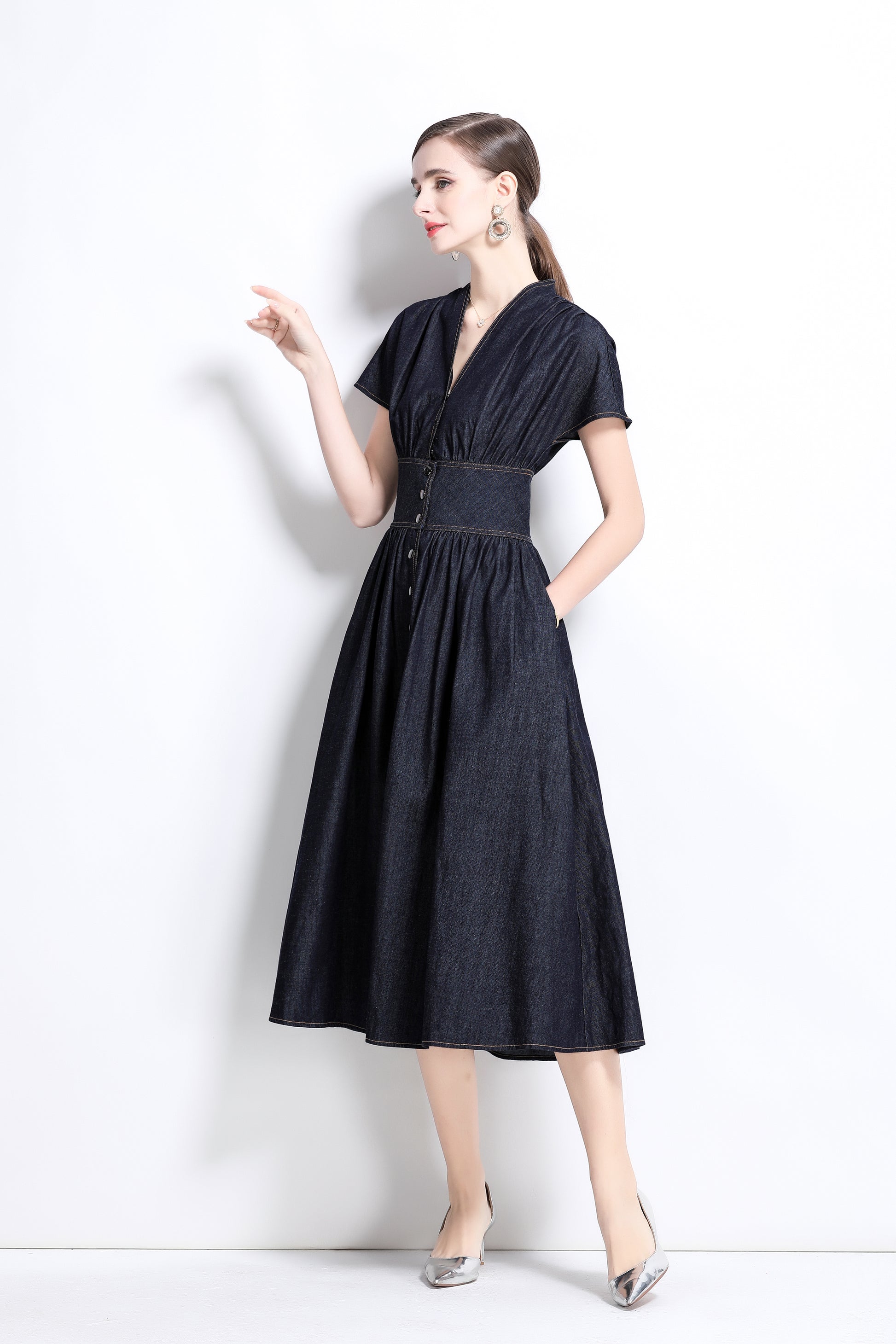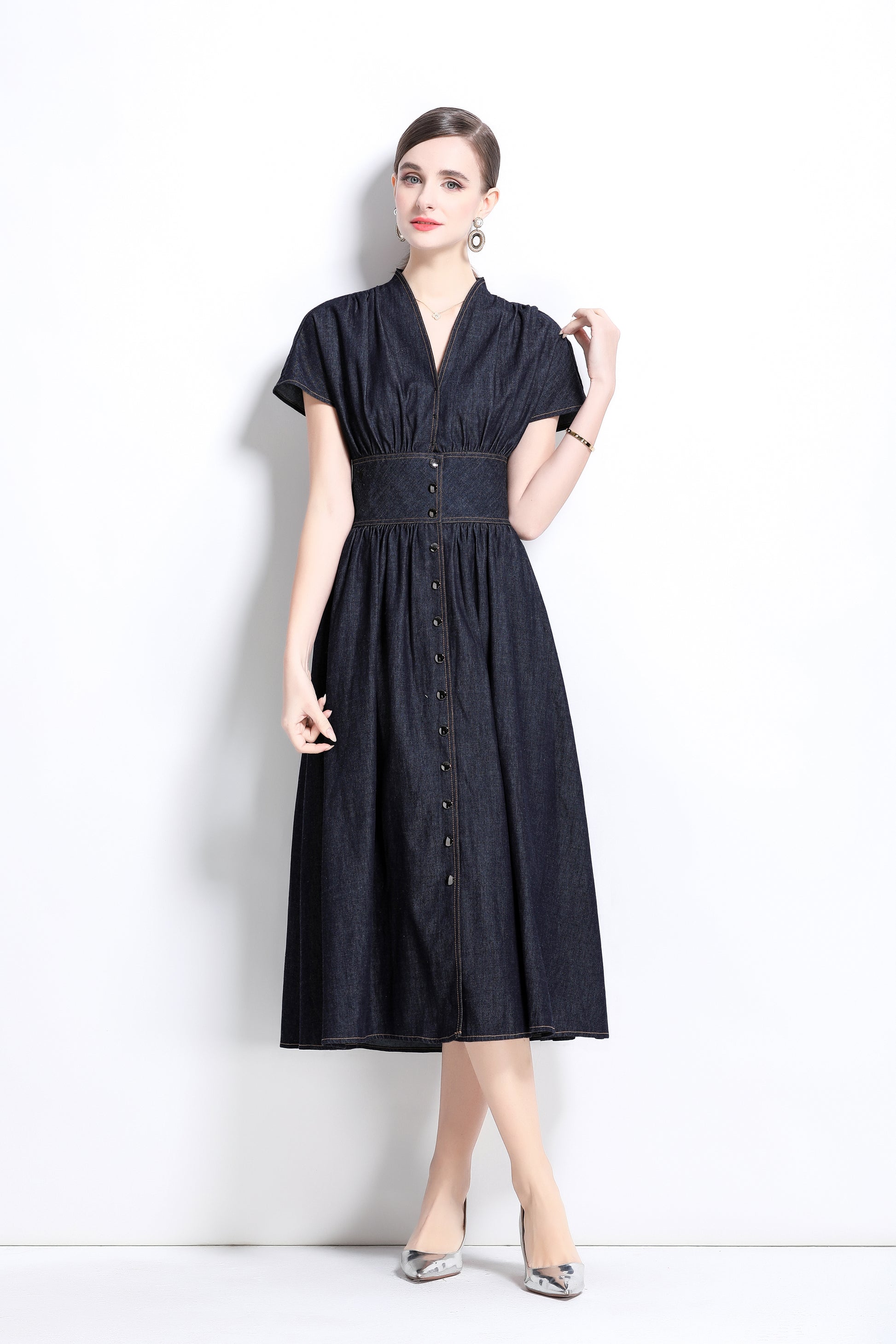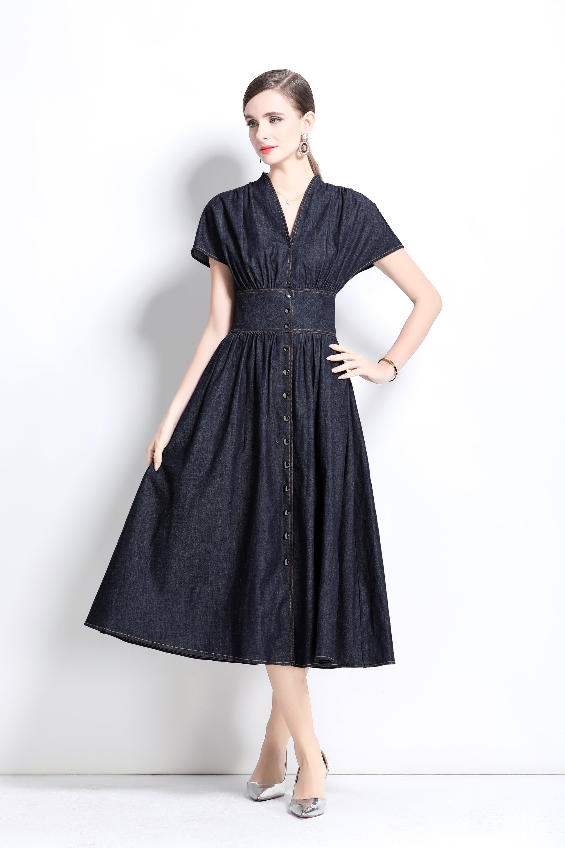 This retro denim V-neck mid-length dress, with its classic denim fabric and elegant A-line cut, adds a touch of leisure and fashion to your wardrobe. The V-neck design and the details of the retro front buttons not only show the feminine beauty of women, but also provide excellent comfort and fashion sense. The bat sleeve design adds a sense of casualness and freedom to this dress.