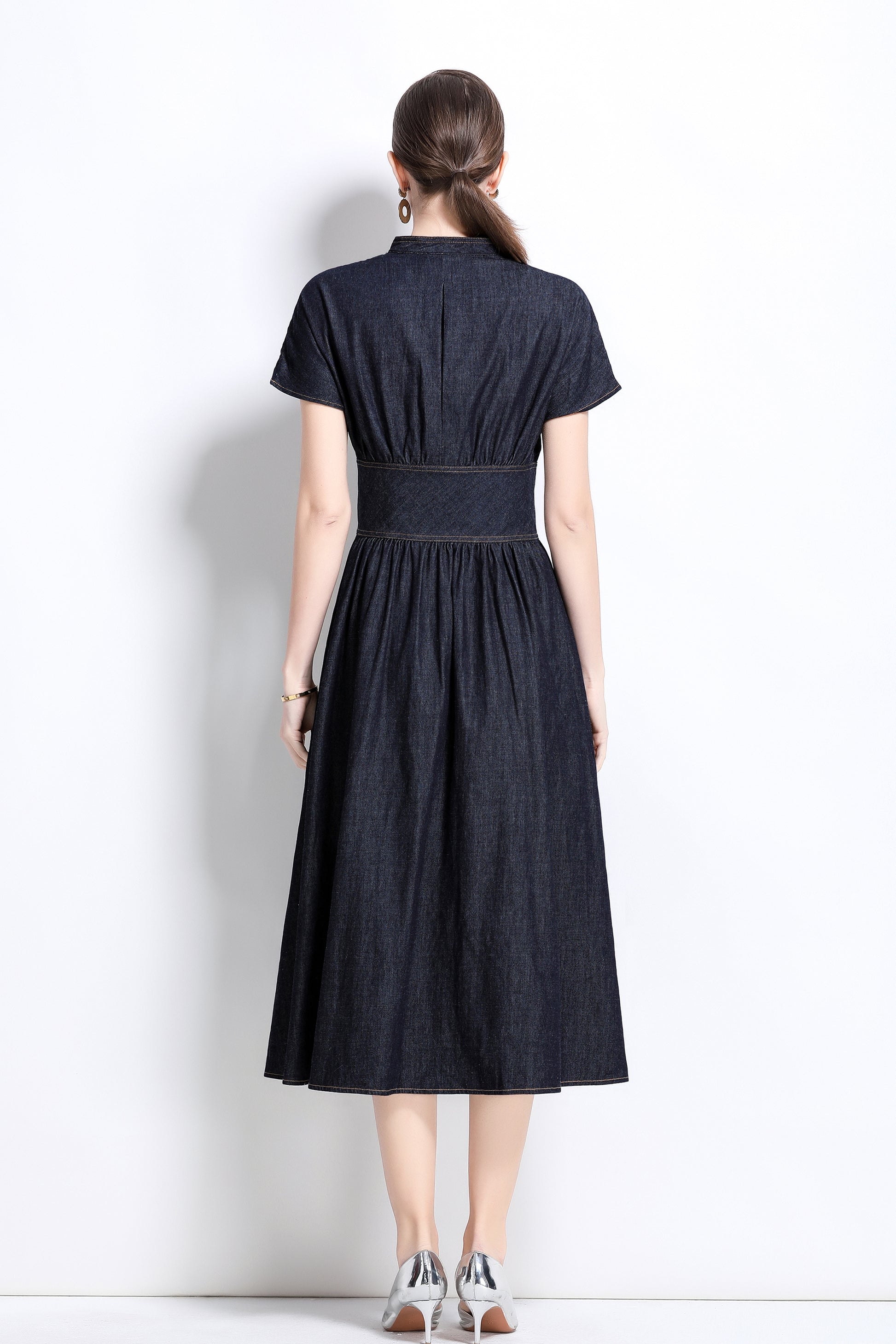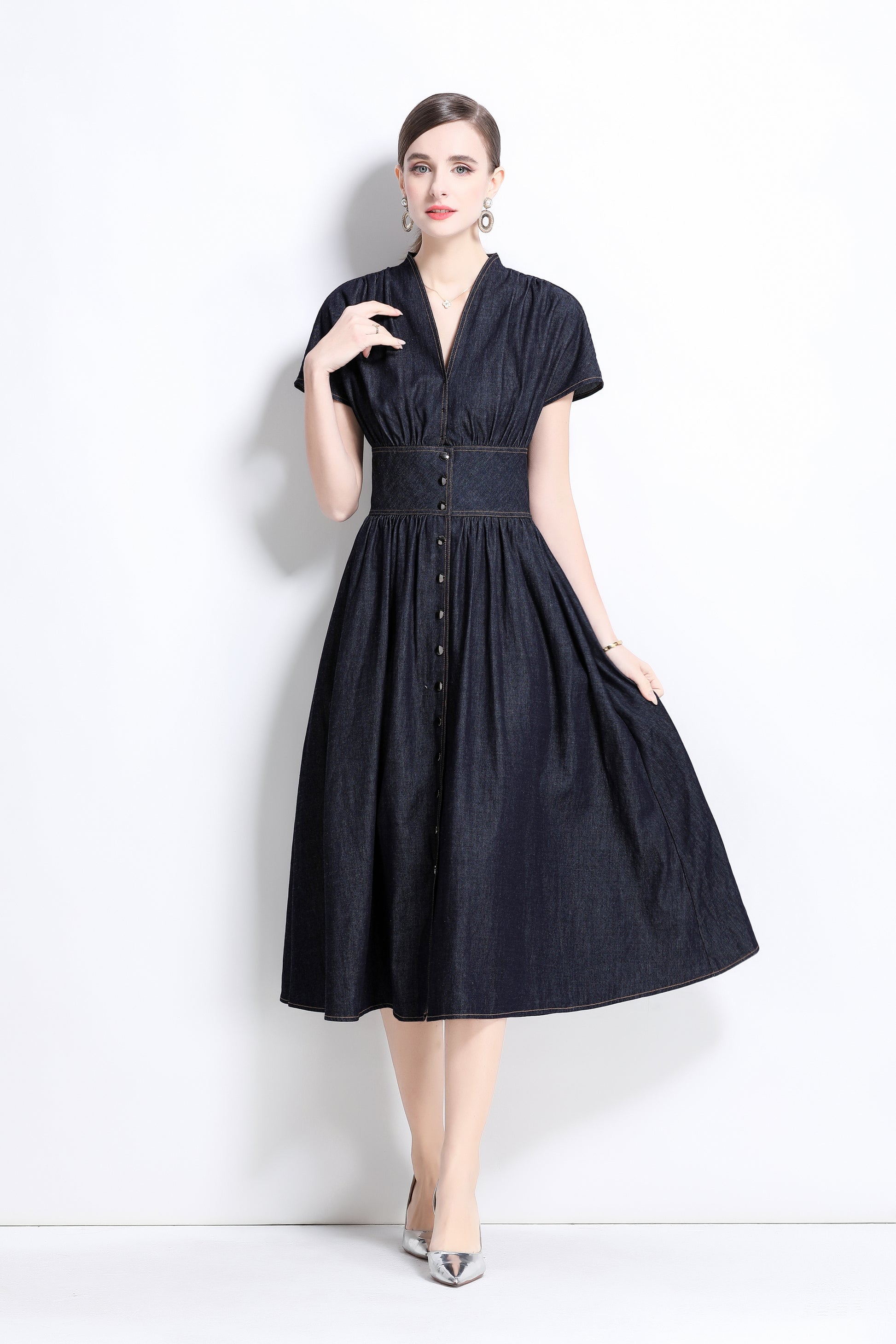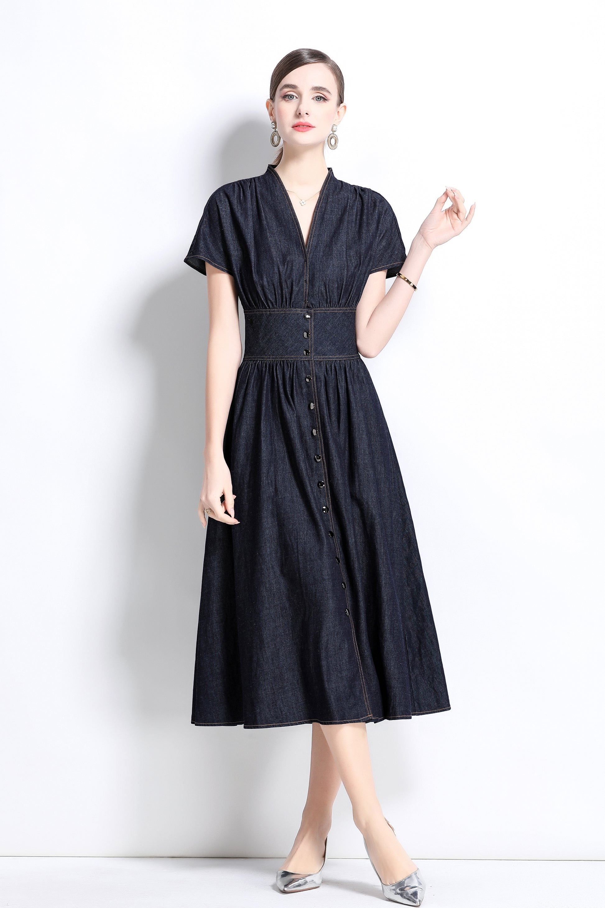 This retro denim V-neck mid-length dress, with its classic denim fabric and elegant A-line cut, adds a touch of leisure and fashion to your wardrobe. The V-neck design and the details of the retro front buttons not only show the feminine beauty of women, but also provide excellent comfort and fashion sense. The bat sleeve design adds a sense of casualness and freedom to this dress.