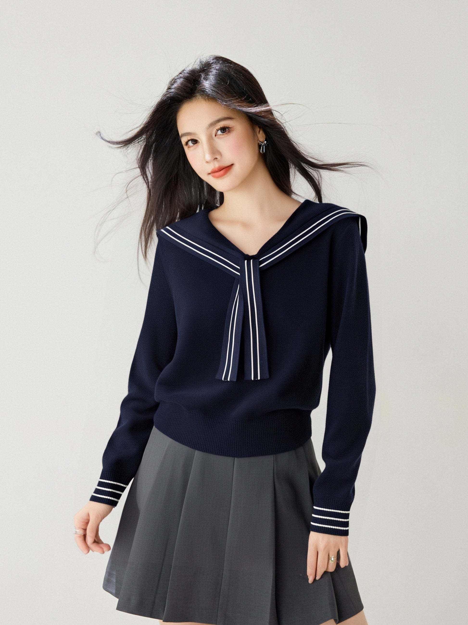 Women's Sailor Collar V-Neck Strip Knit Sweater Blouse