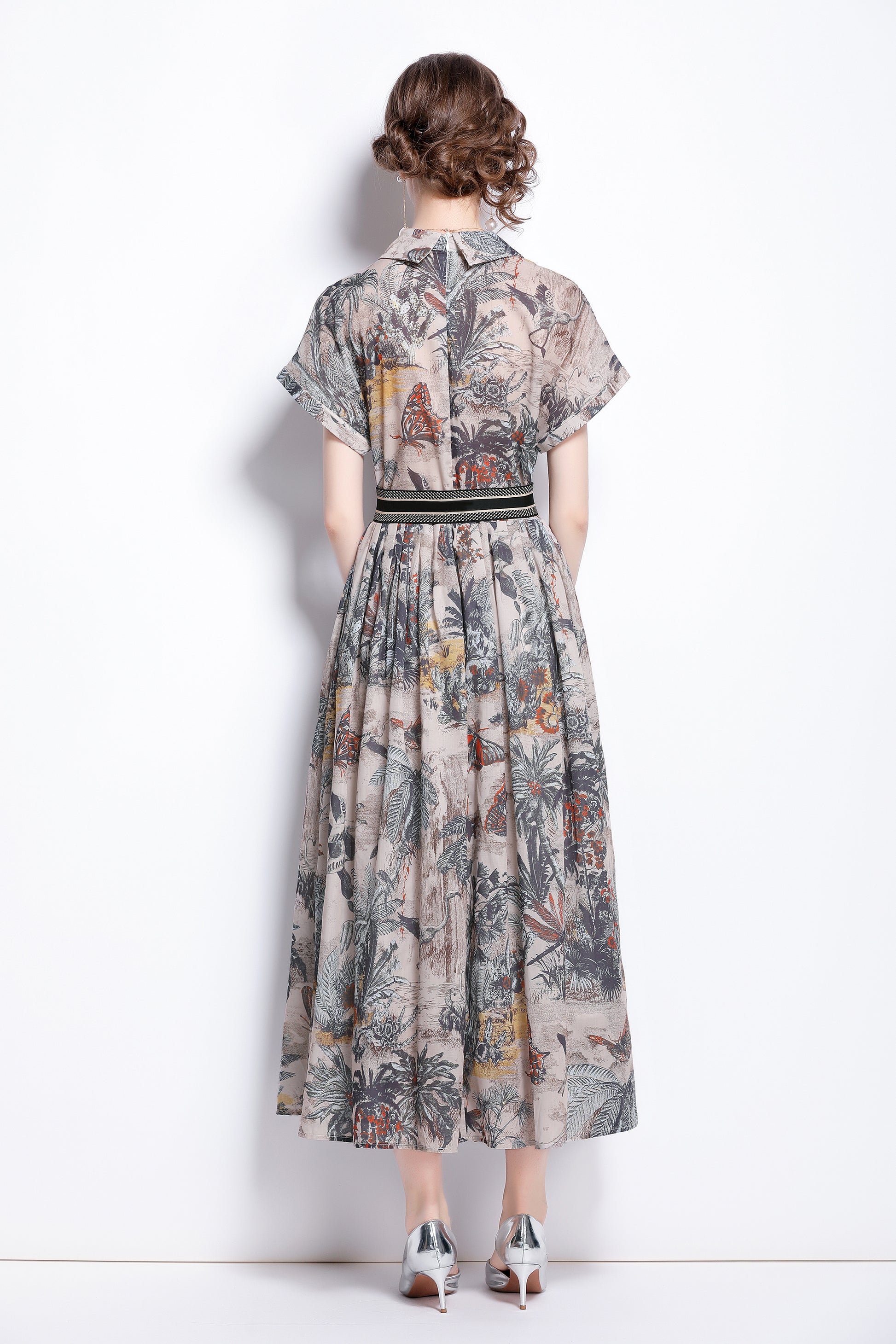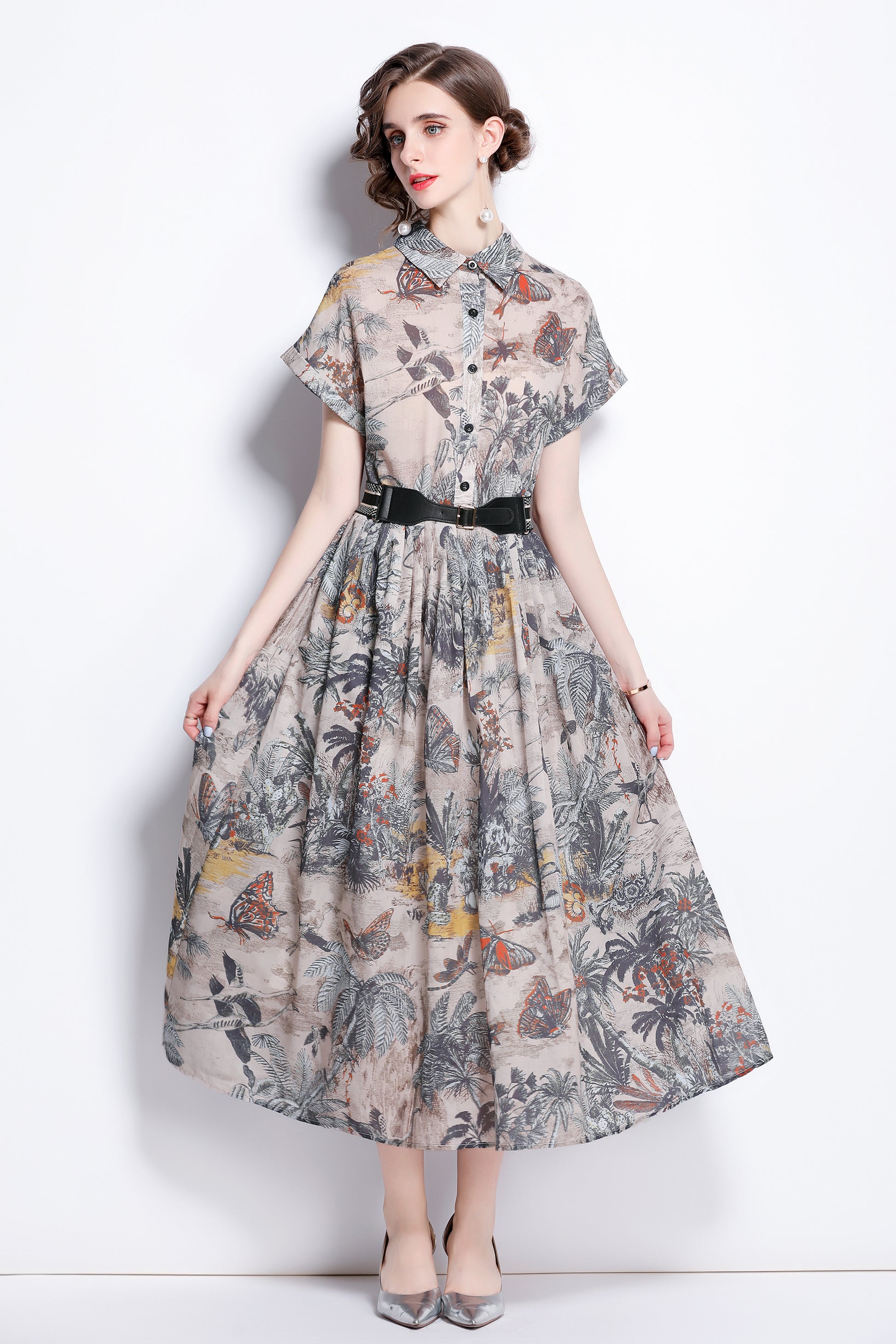 - Features: Floral print, short sleeves, front buttons, back zipper, belt, pleats, A-line dress