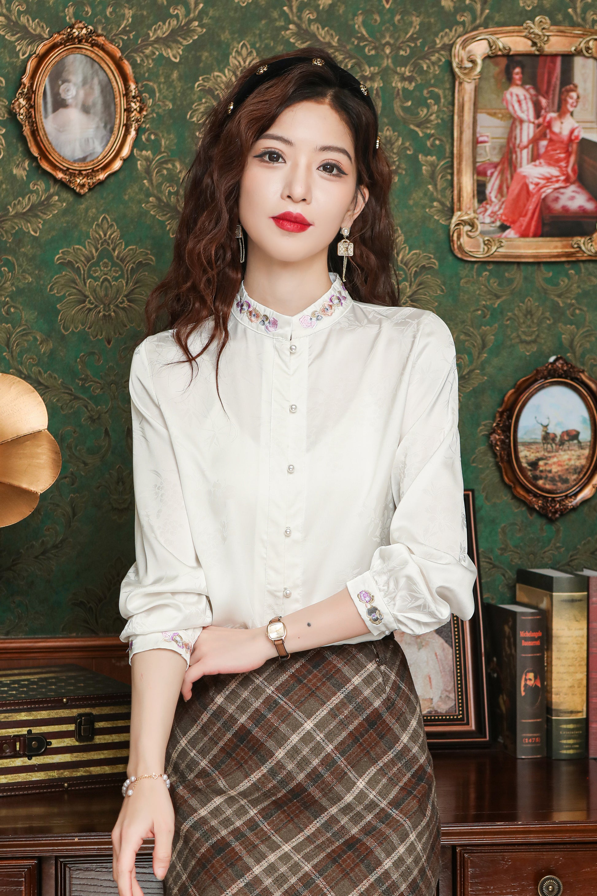 • Feature: Vintage Silk satin fabric, Elegant Embroidery design, Jacquard fabric decoration , Casual Blouse, Flower Print, Regular Fit, Lantern Long Sleeves.It is a chic fashion Chinese style shirt top.