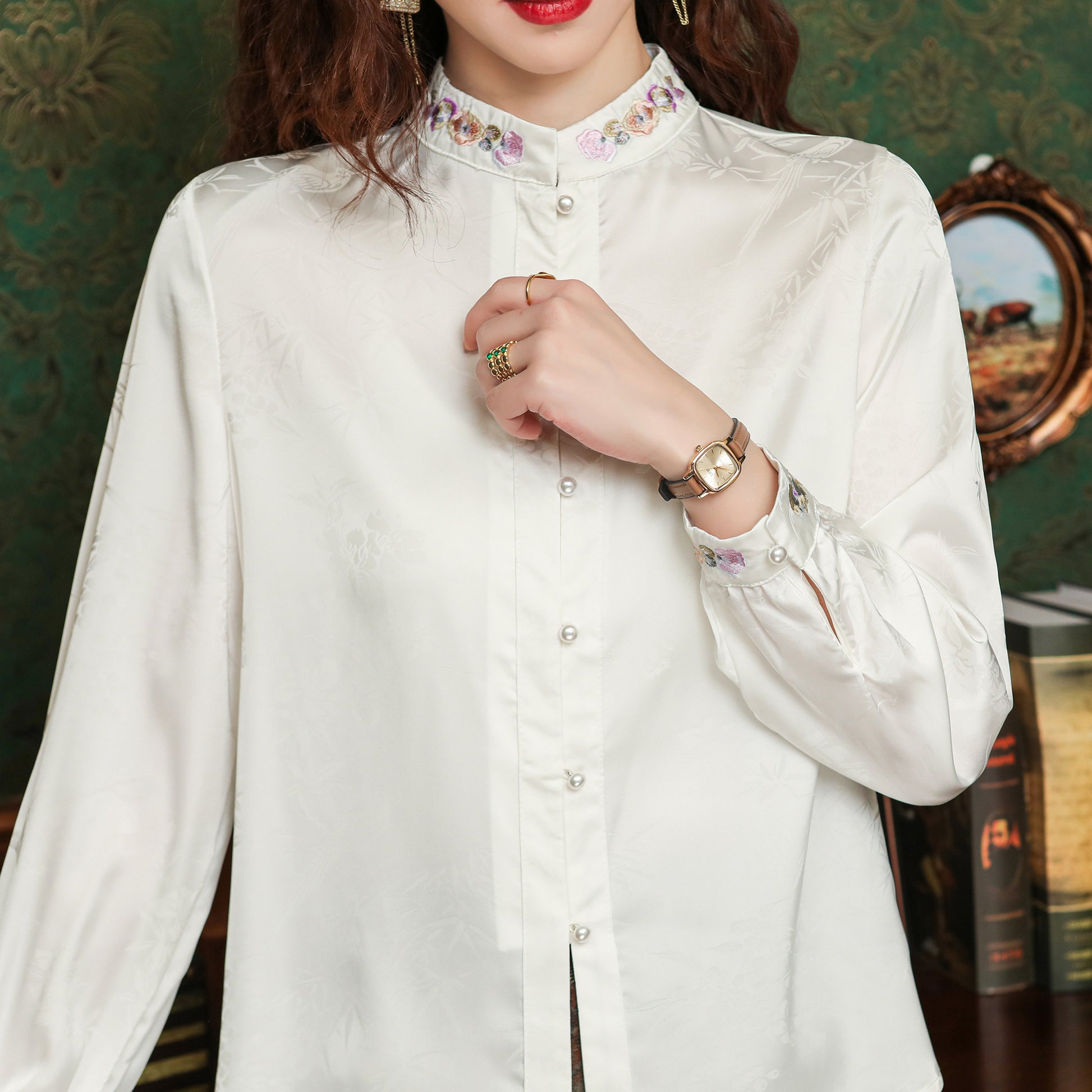 Women's Silk Satin Embroidery Jacquard Blouse Top
