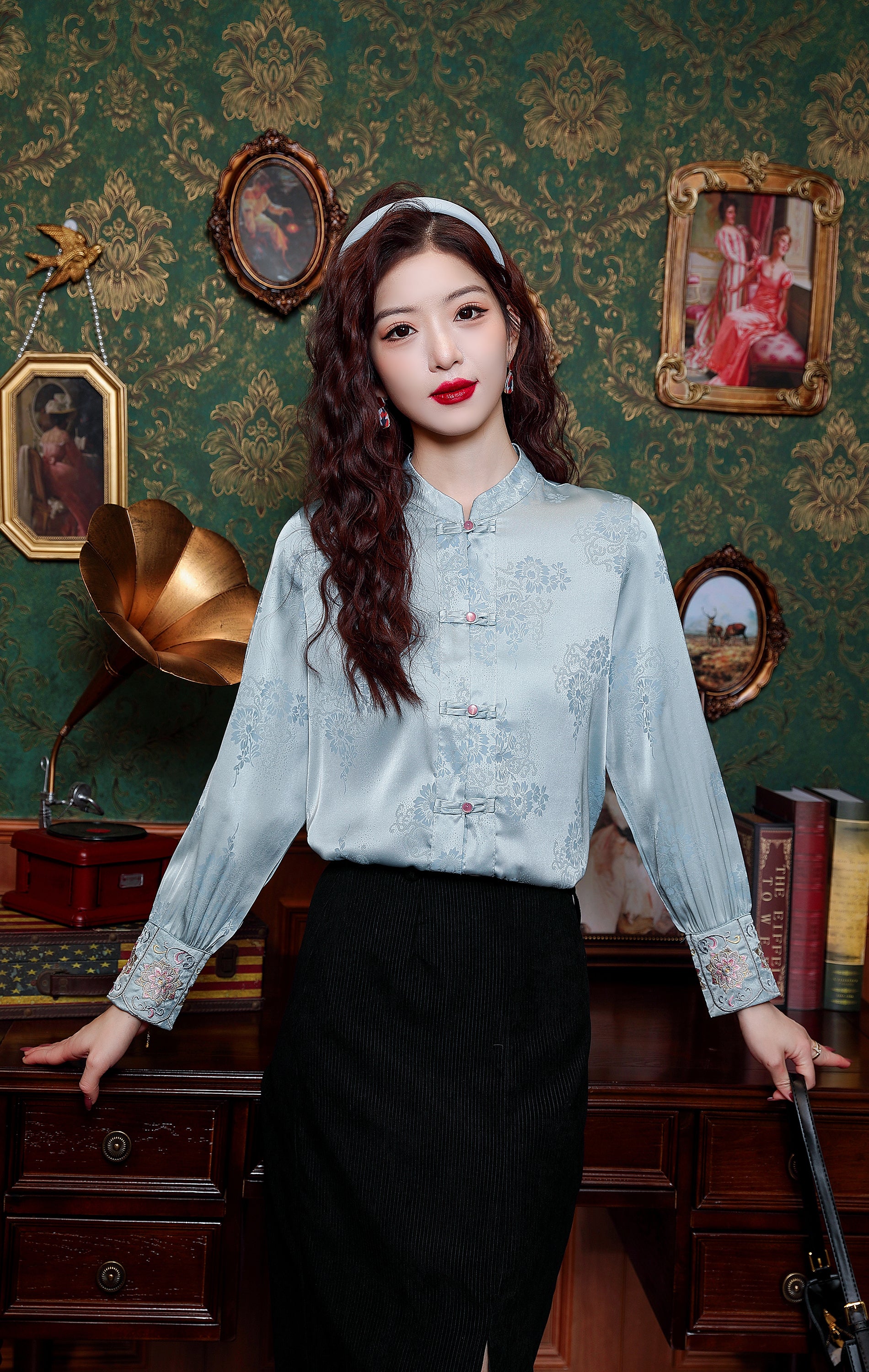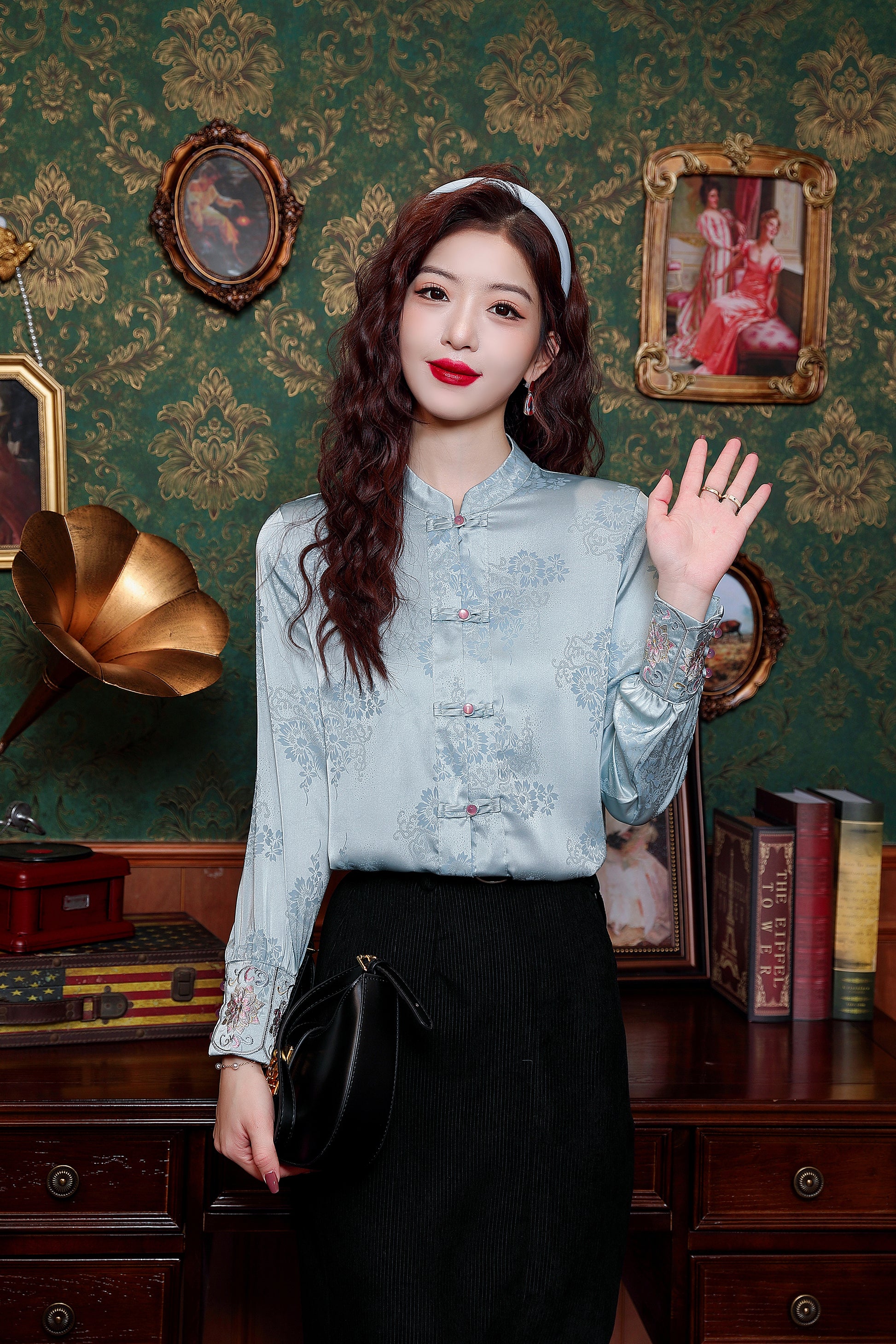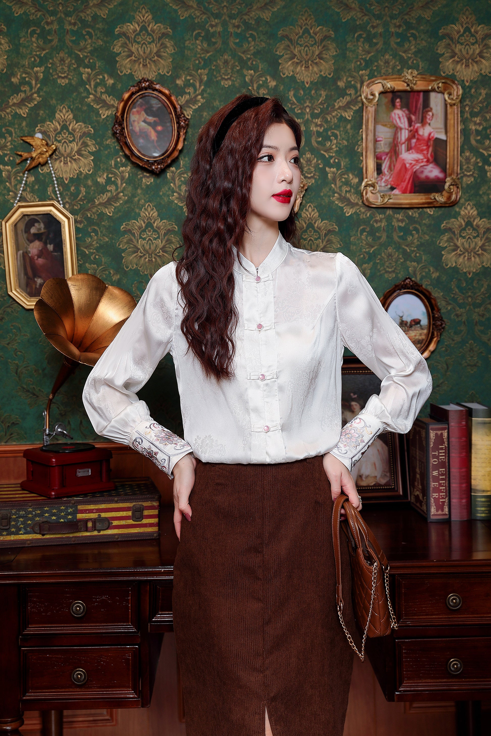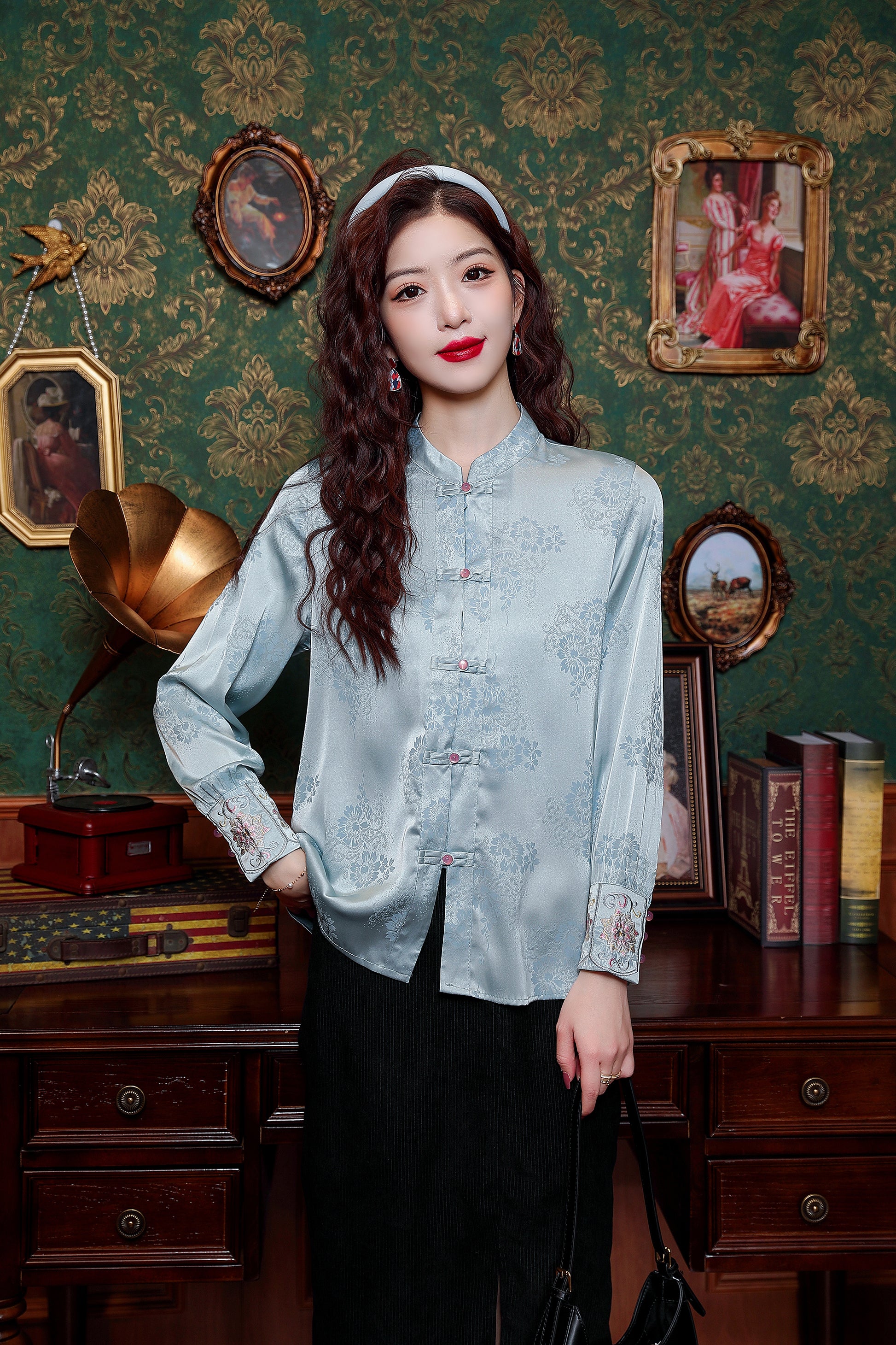 - Feature: Vintage Silk satin fabric, Elegant Embroidery design, Jacquard fabric decoration , Casual Blouse, Flower Print, Regular Fit, Lantern Long Sleeves.It is a chic fashion Chinese style shirt top.