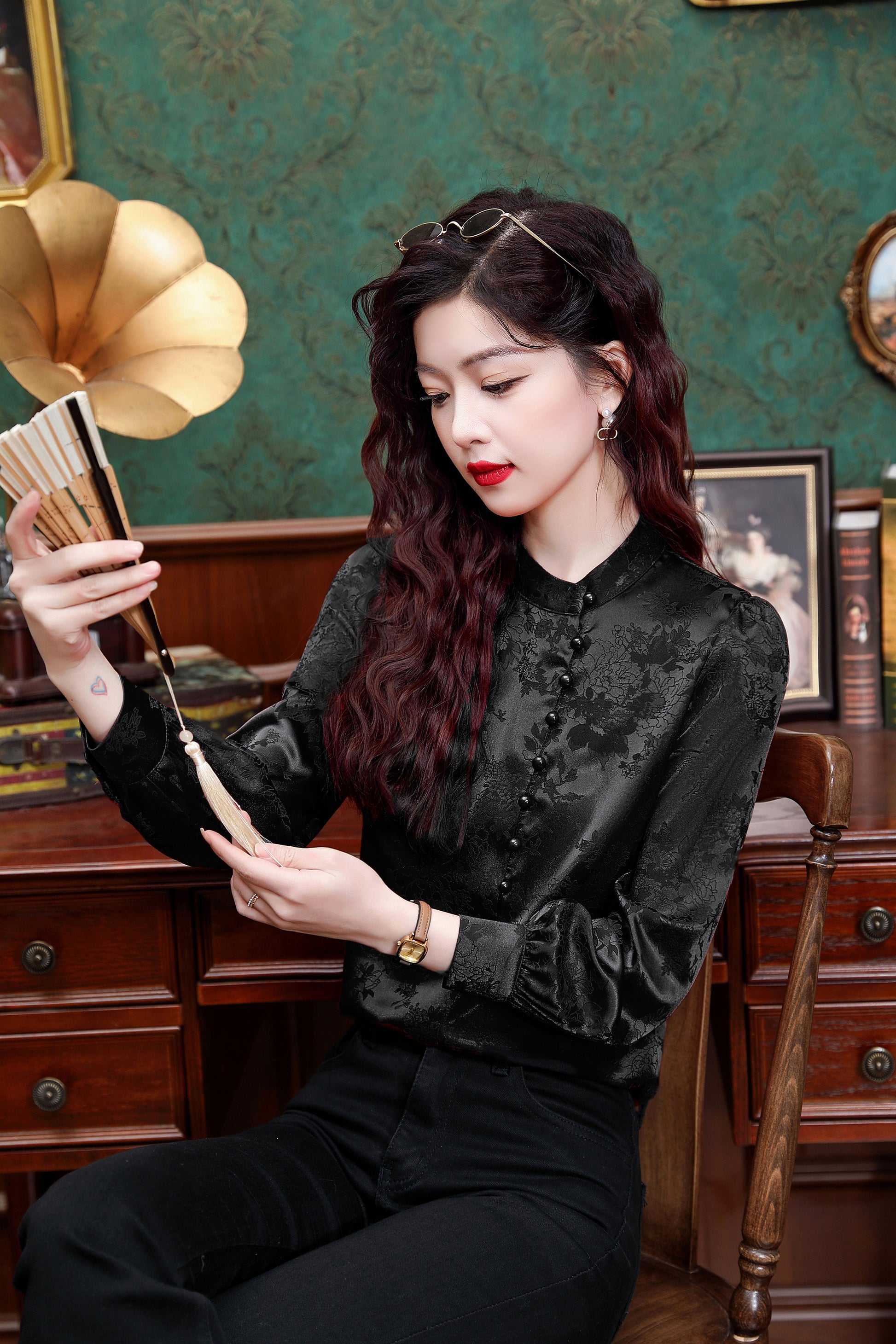 - Feature: Vintage Silk satin fabric, Elegant Embroidery design, Jacquard fabric decoration , Casual Blouse, Flower Print, Regular Fit, Lantern Long Sleeves.It is a chic fashion Chinese style shirt top.