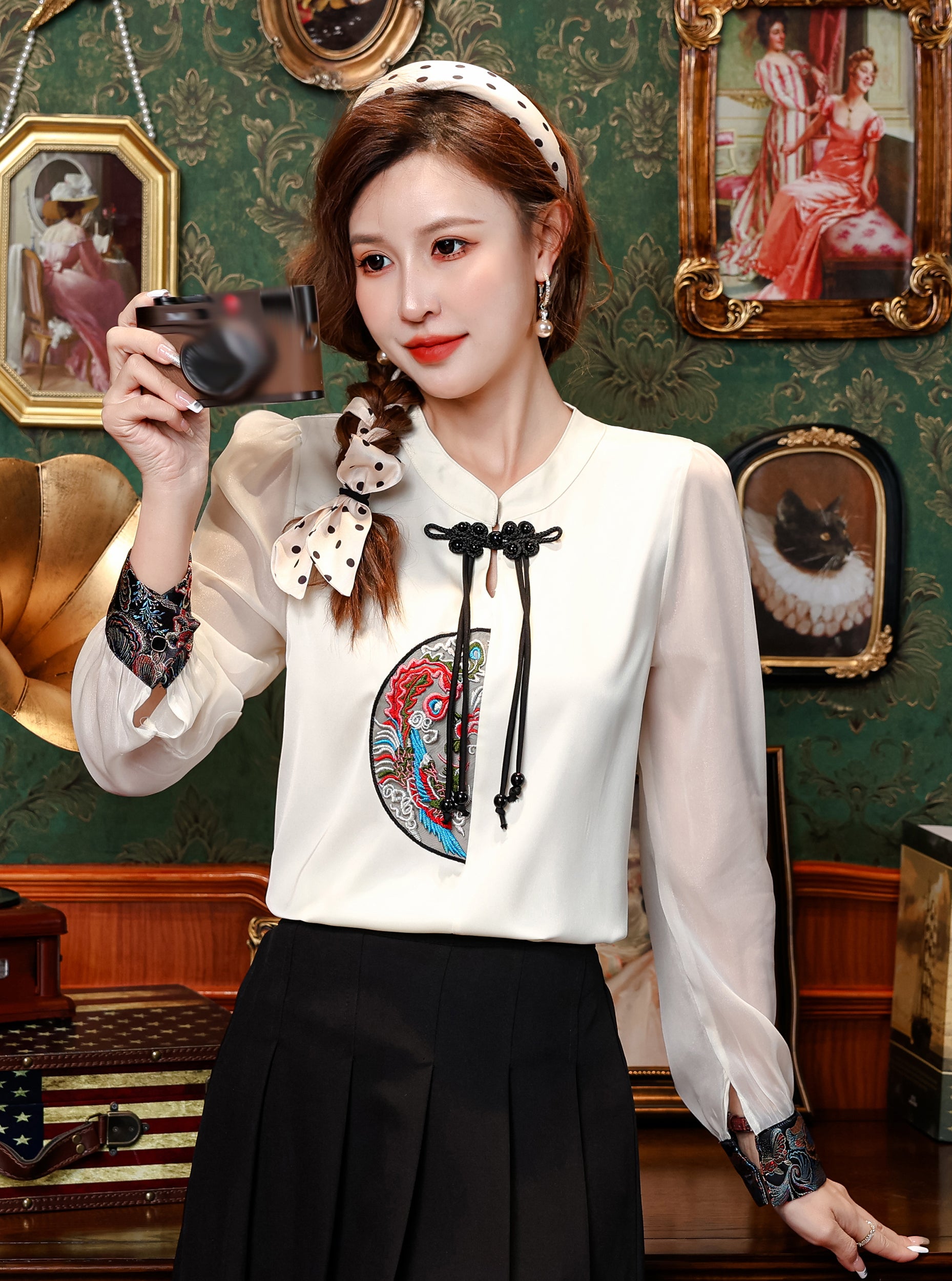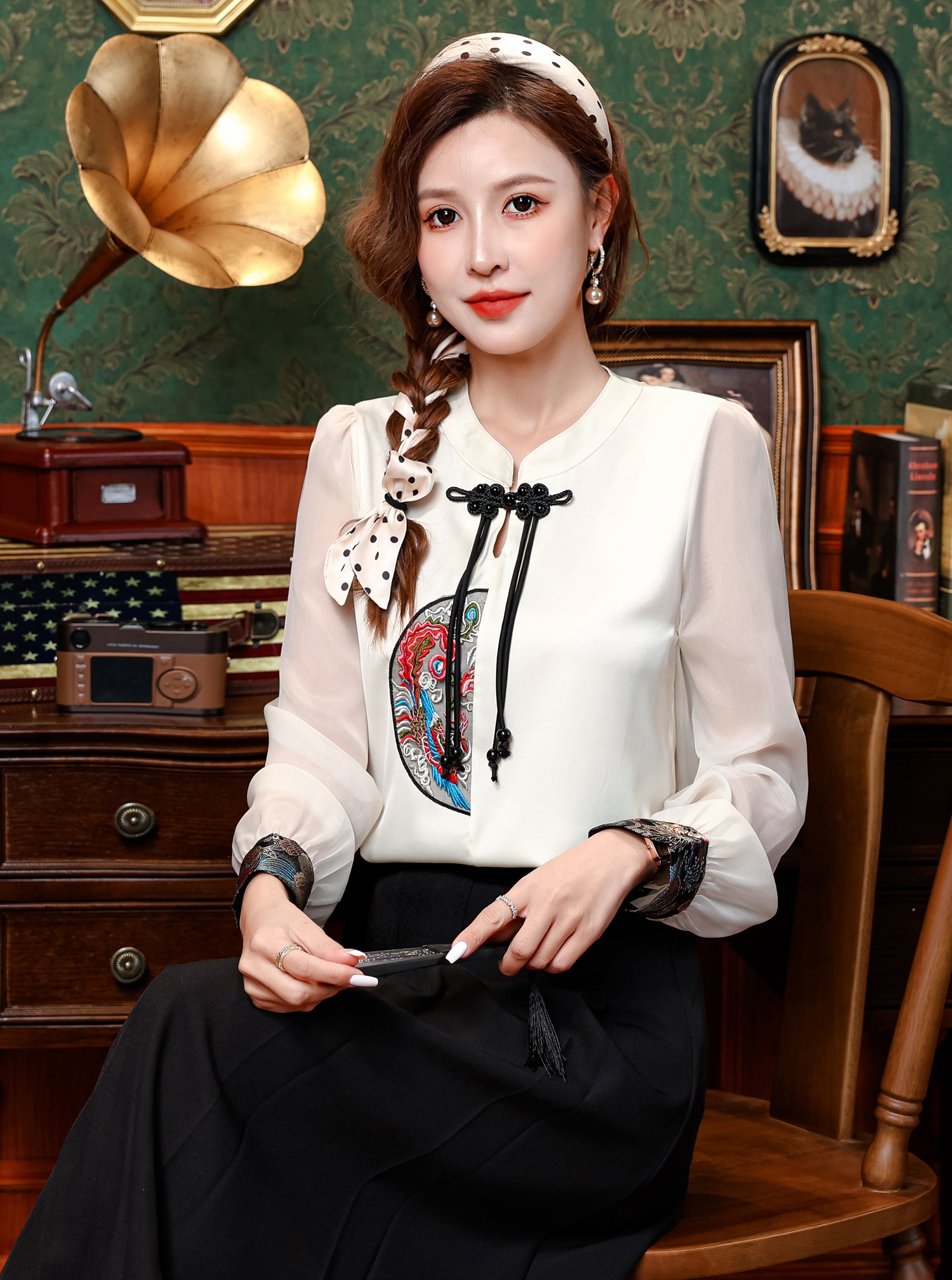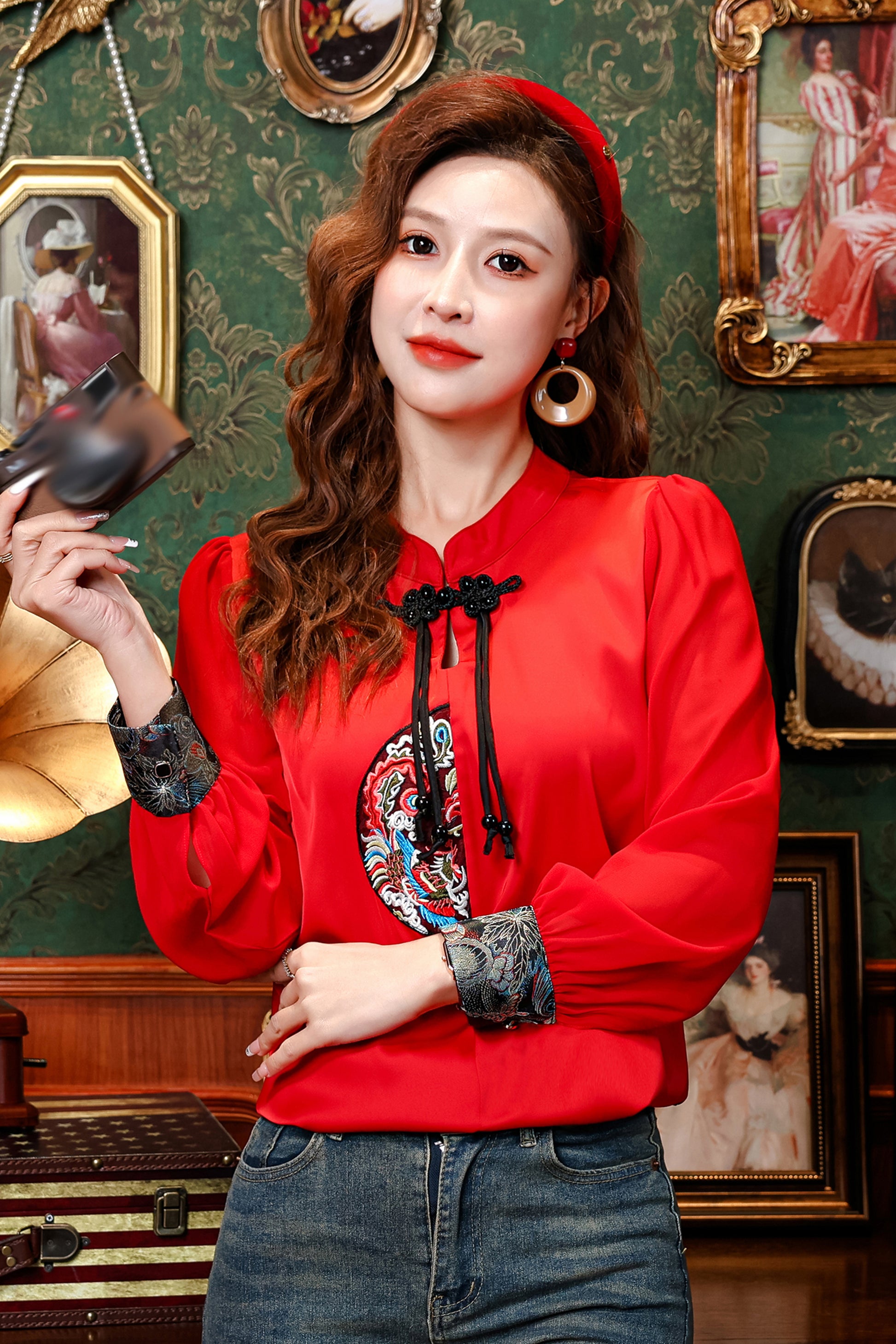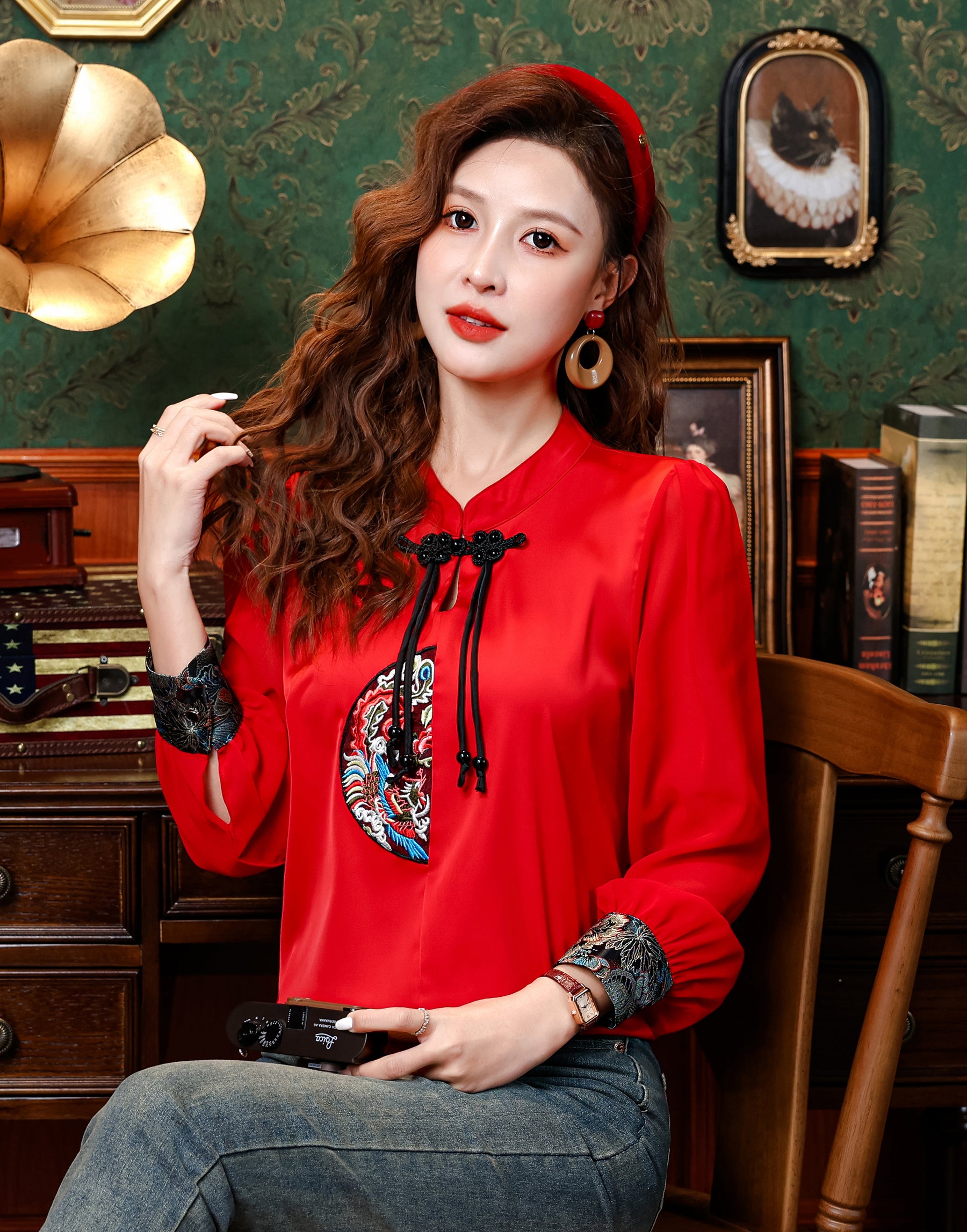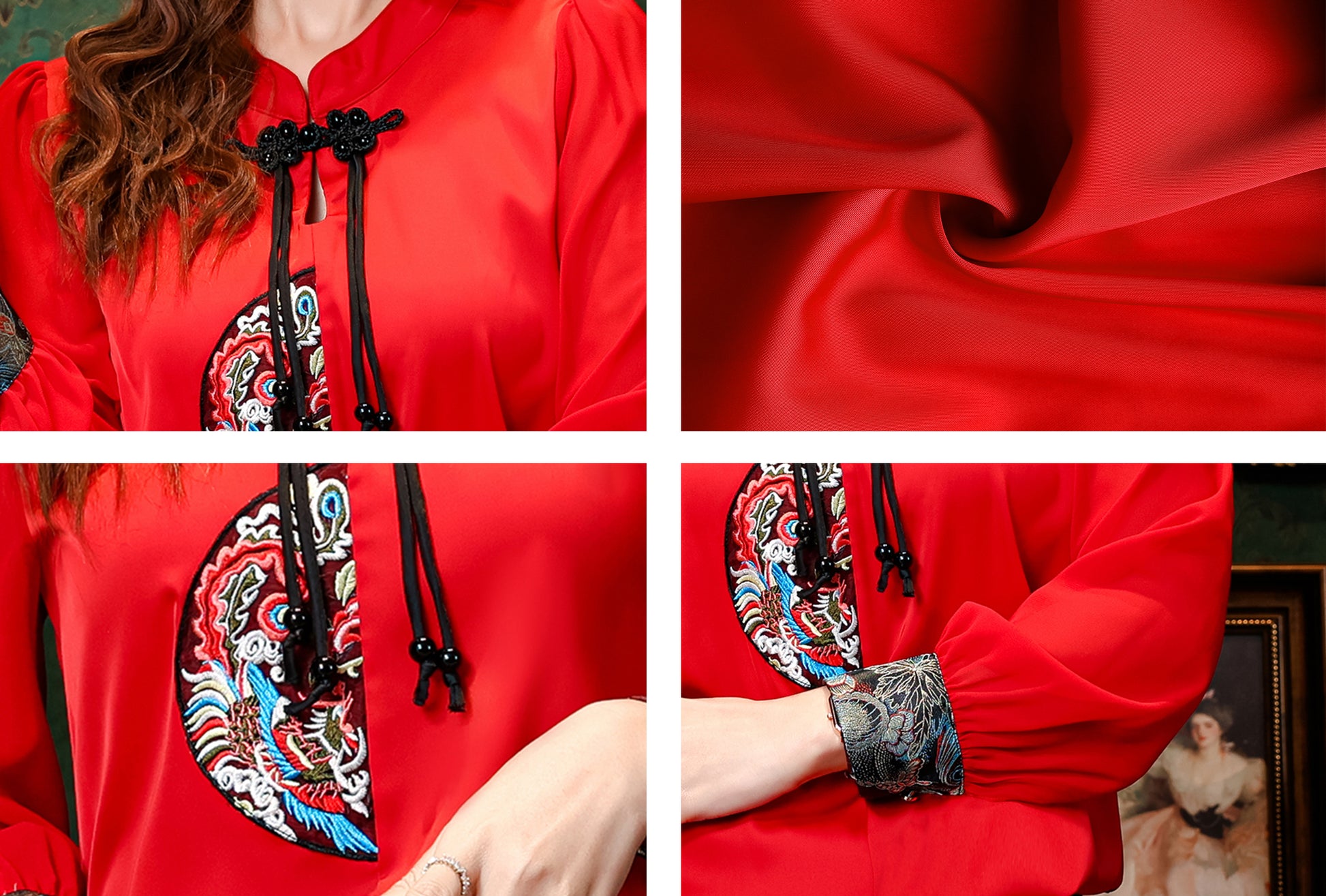 Women's Silk Satin Top Embroidered  Jacquard Shirt