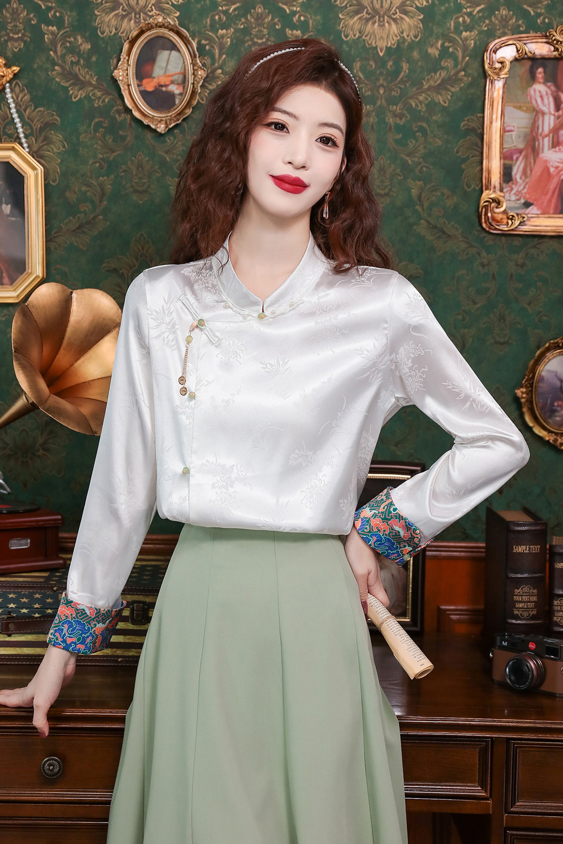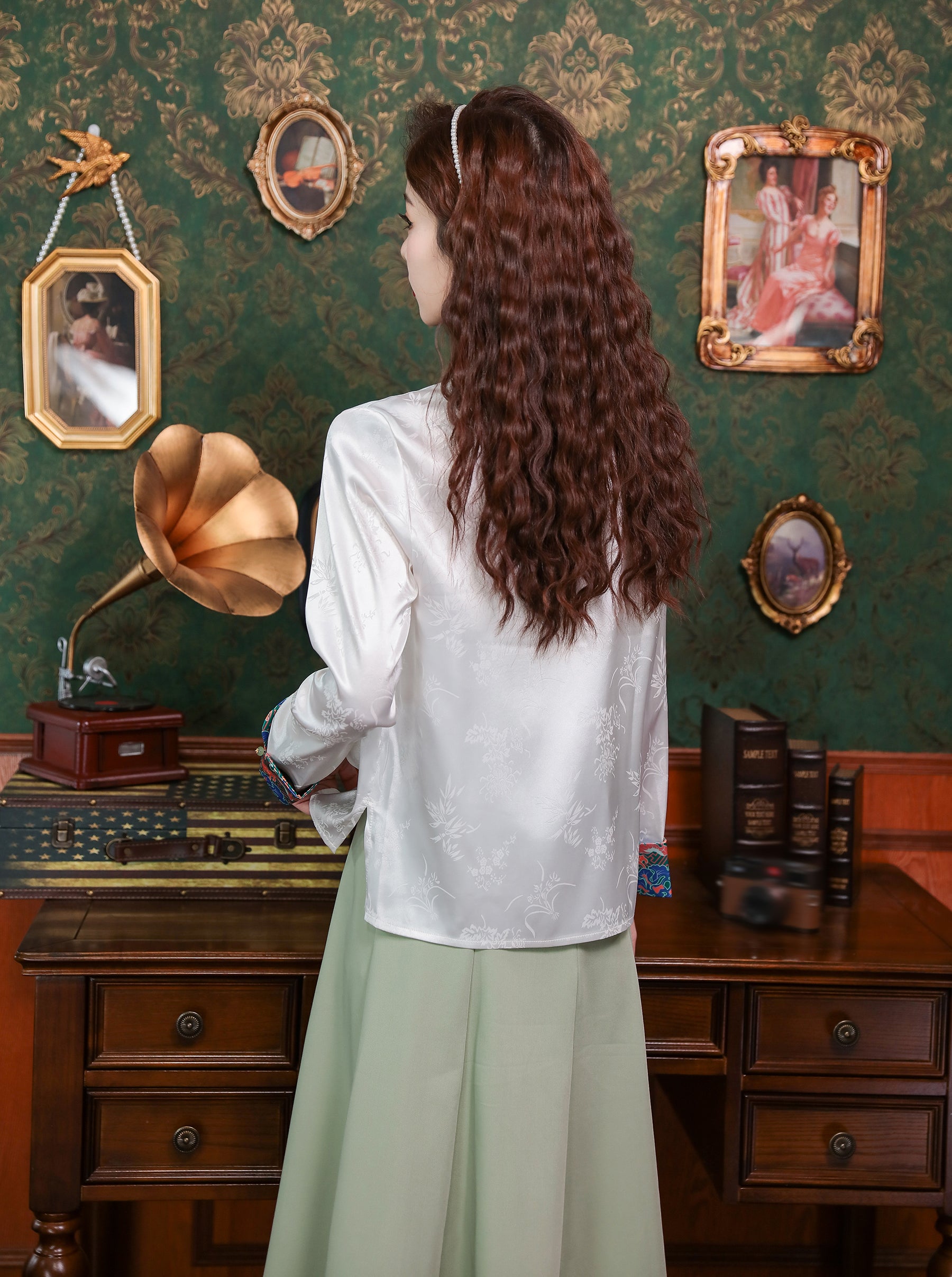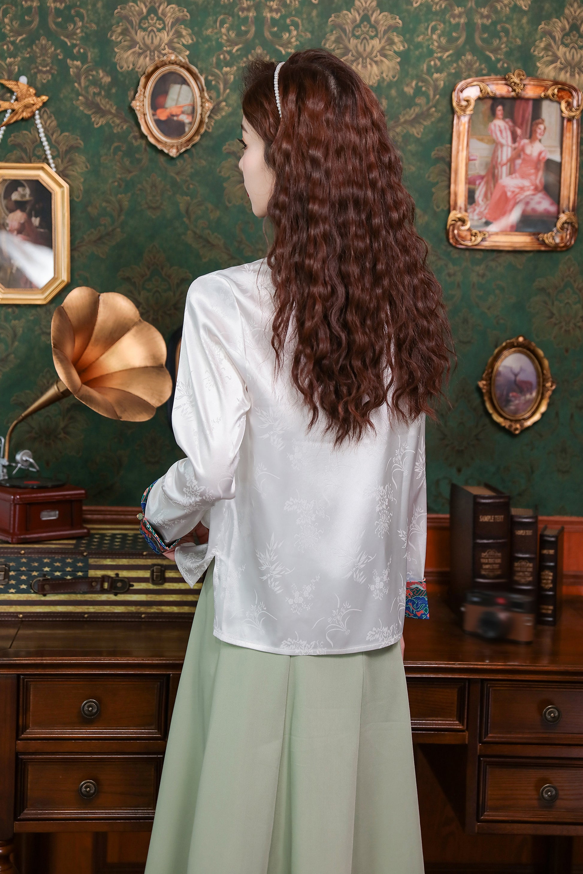 Women's Silk Satin Top Embroidered Jacquard Shirt