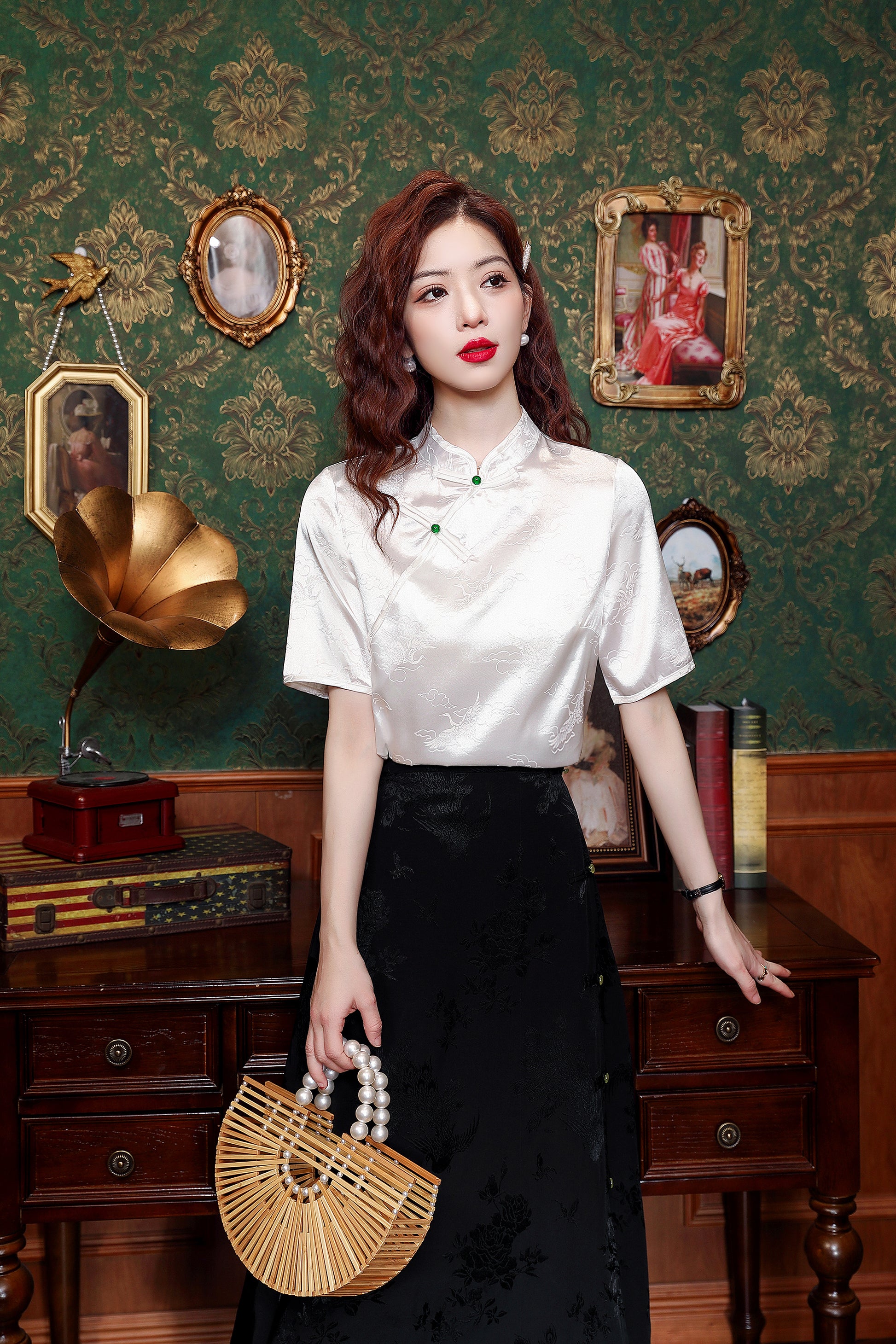 • Feature: Vintage Silk satin fabric, hight Neck, Jacquard fabric decoration , Casual Blouse, Flower Print, Regular Fit,short Sleeves,Disc buckle,slanted opening. It is a chic fashion summer Chinese style shirt top.