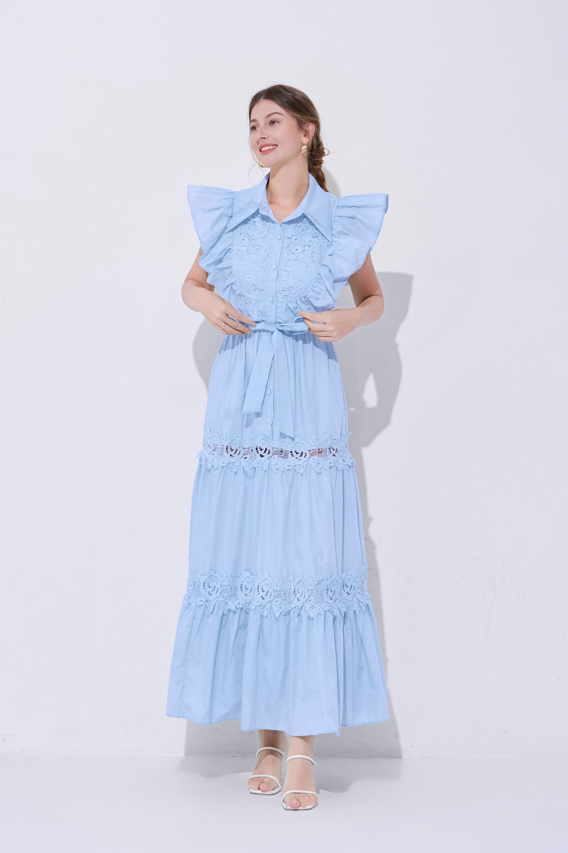 Women's Sleeveless Ruffles Lace Button Mixi Dress