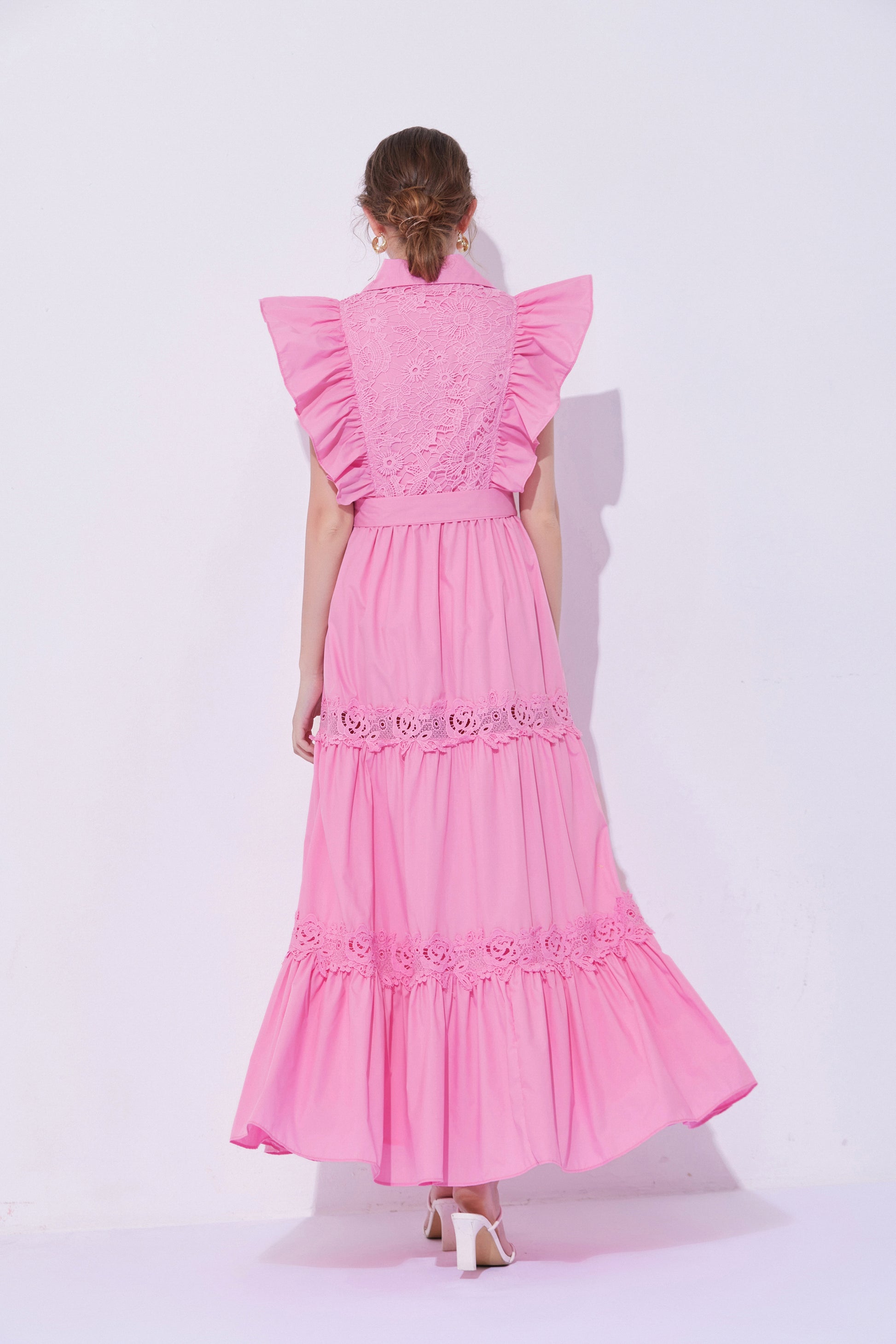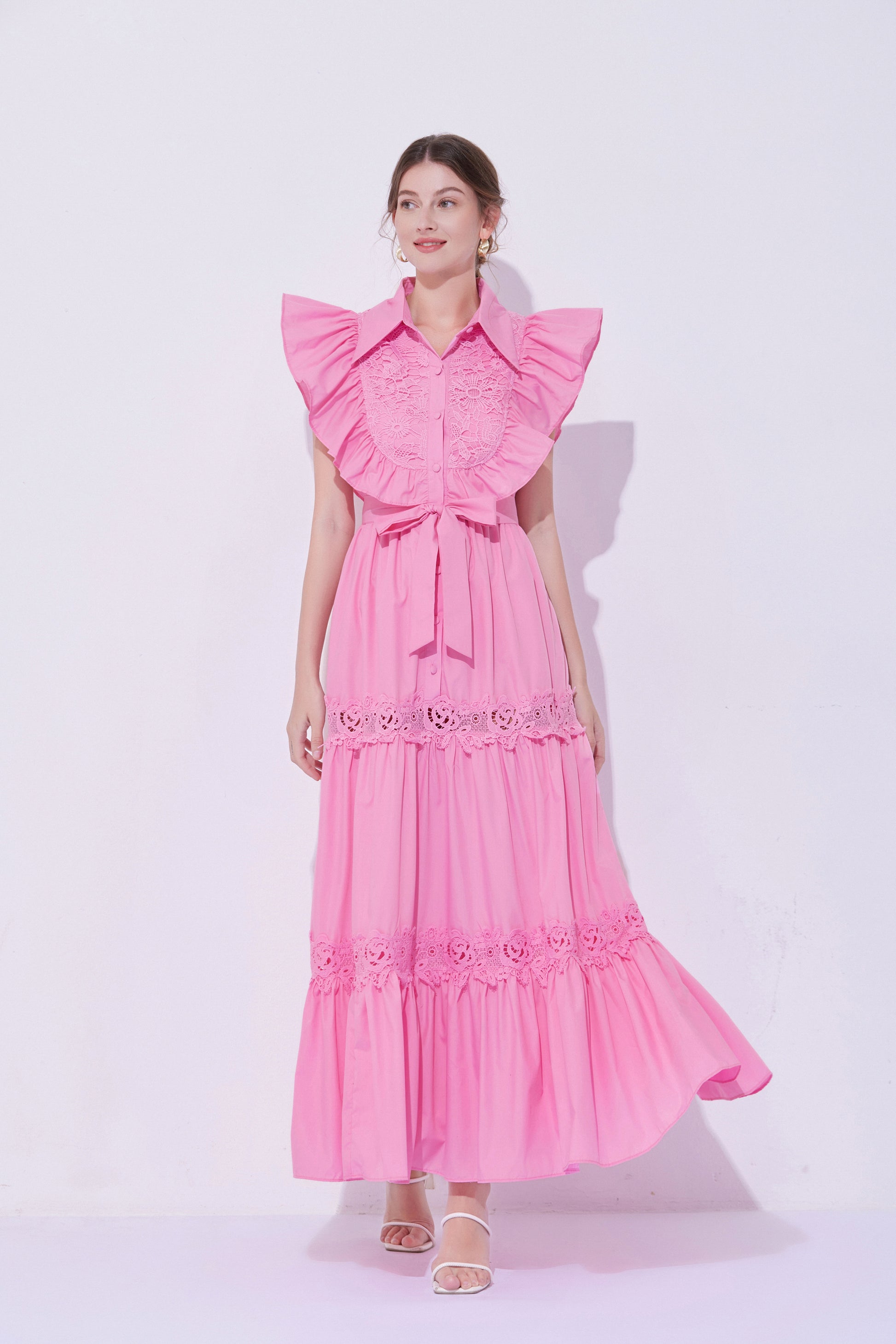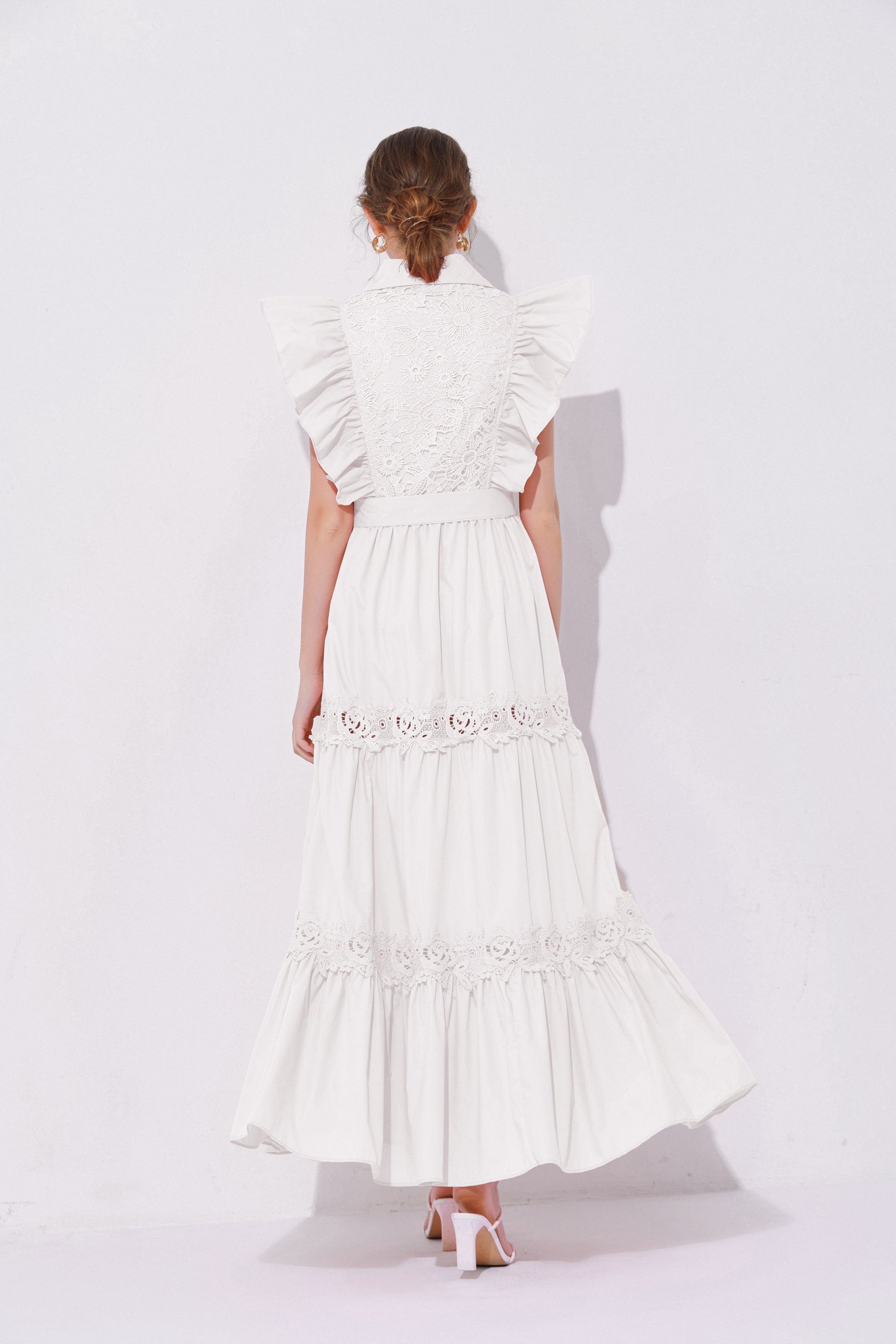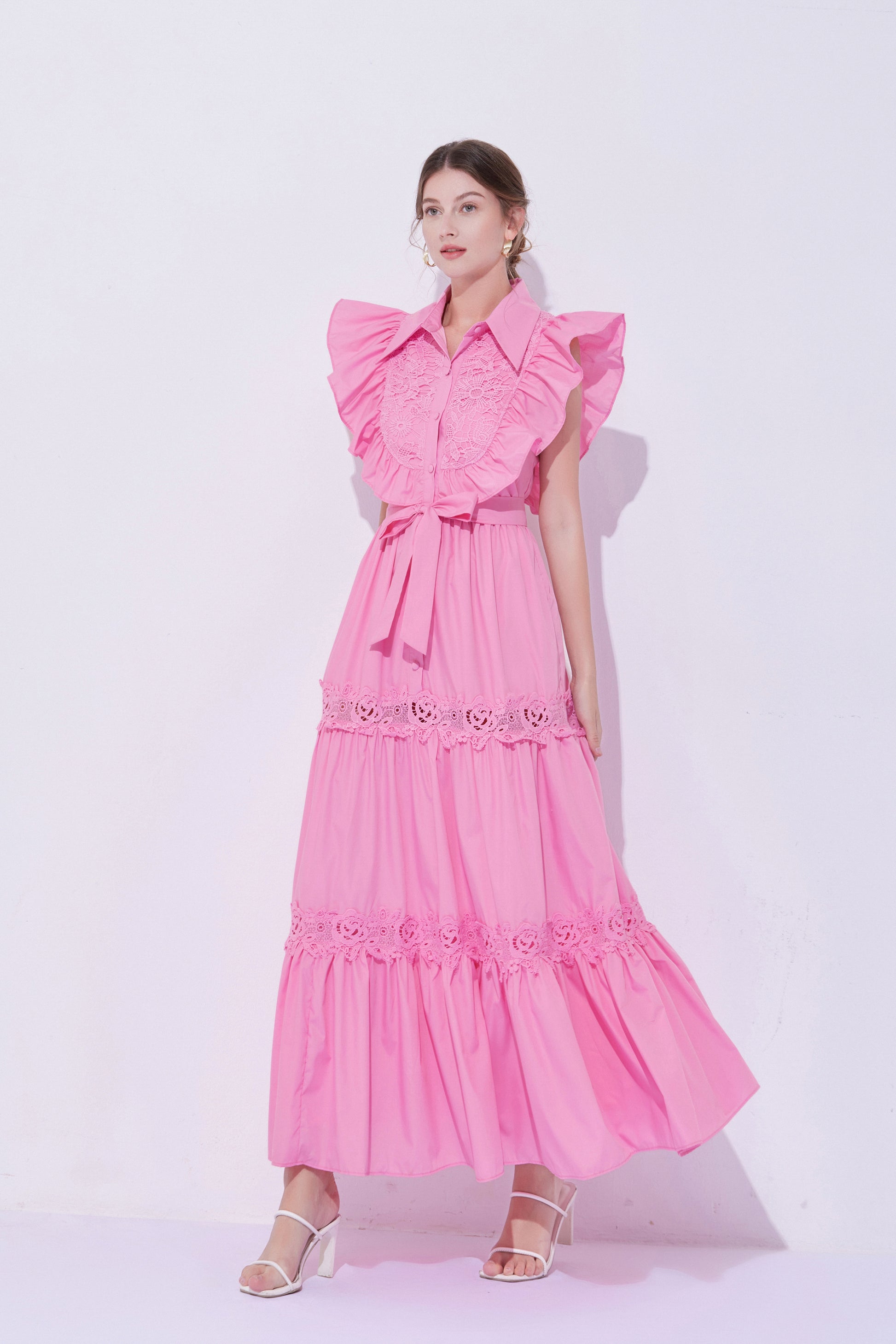 - Design: The exaggerated ruffled design on the shoulders enhances the three-dimensional effect and fashion sense of the dress, making the overall look more vivid and having a stronger visual impact. The lace patchwork on the back and hem adds a touch of refinement.