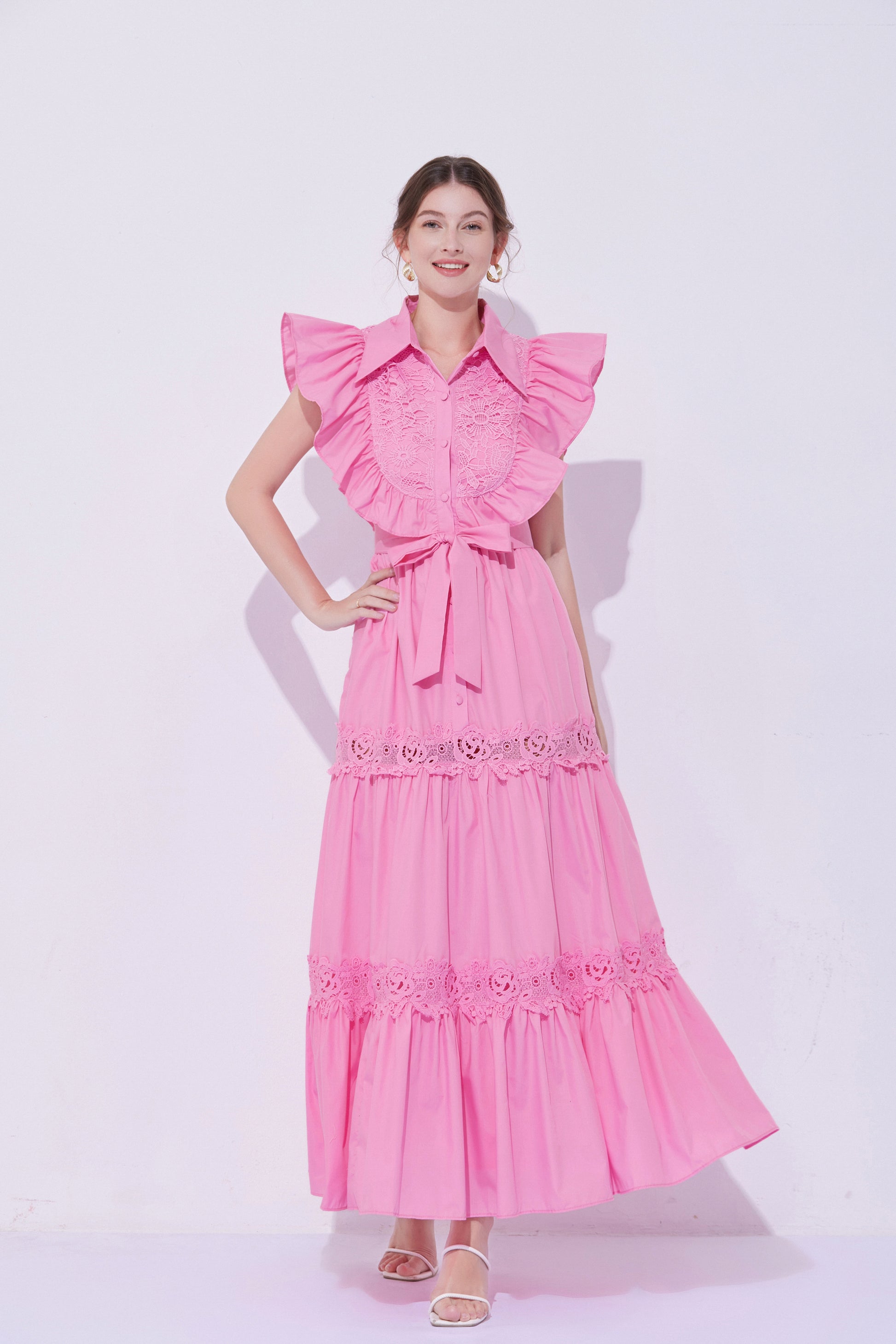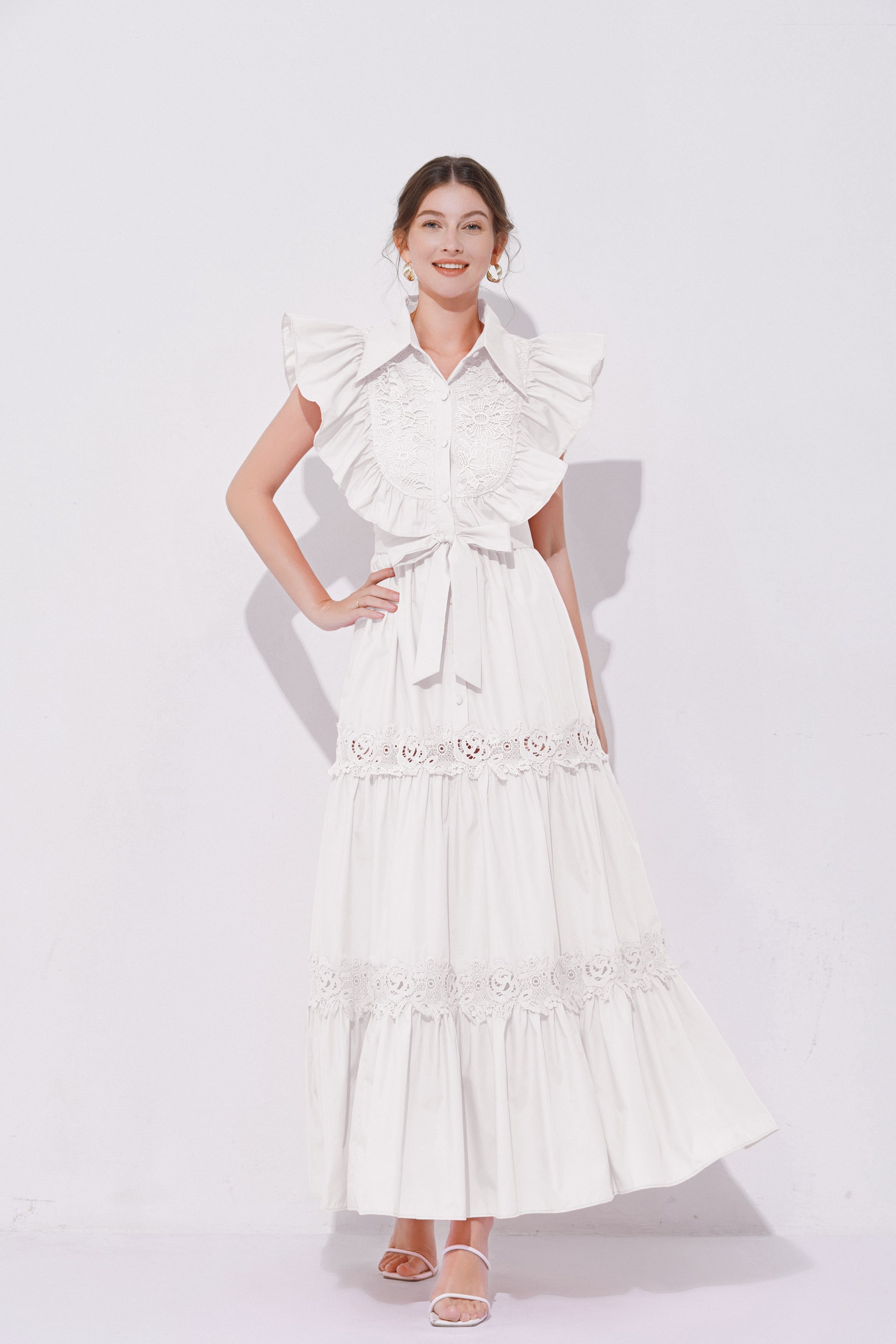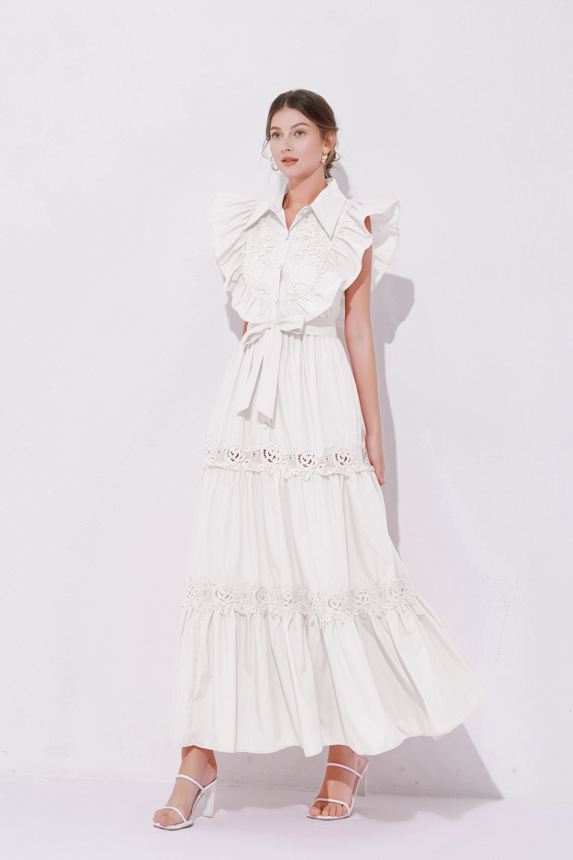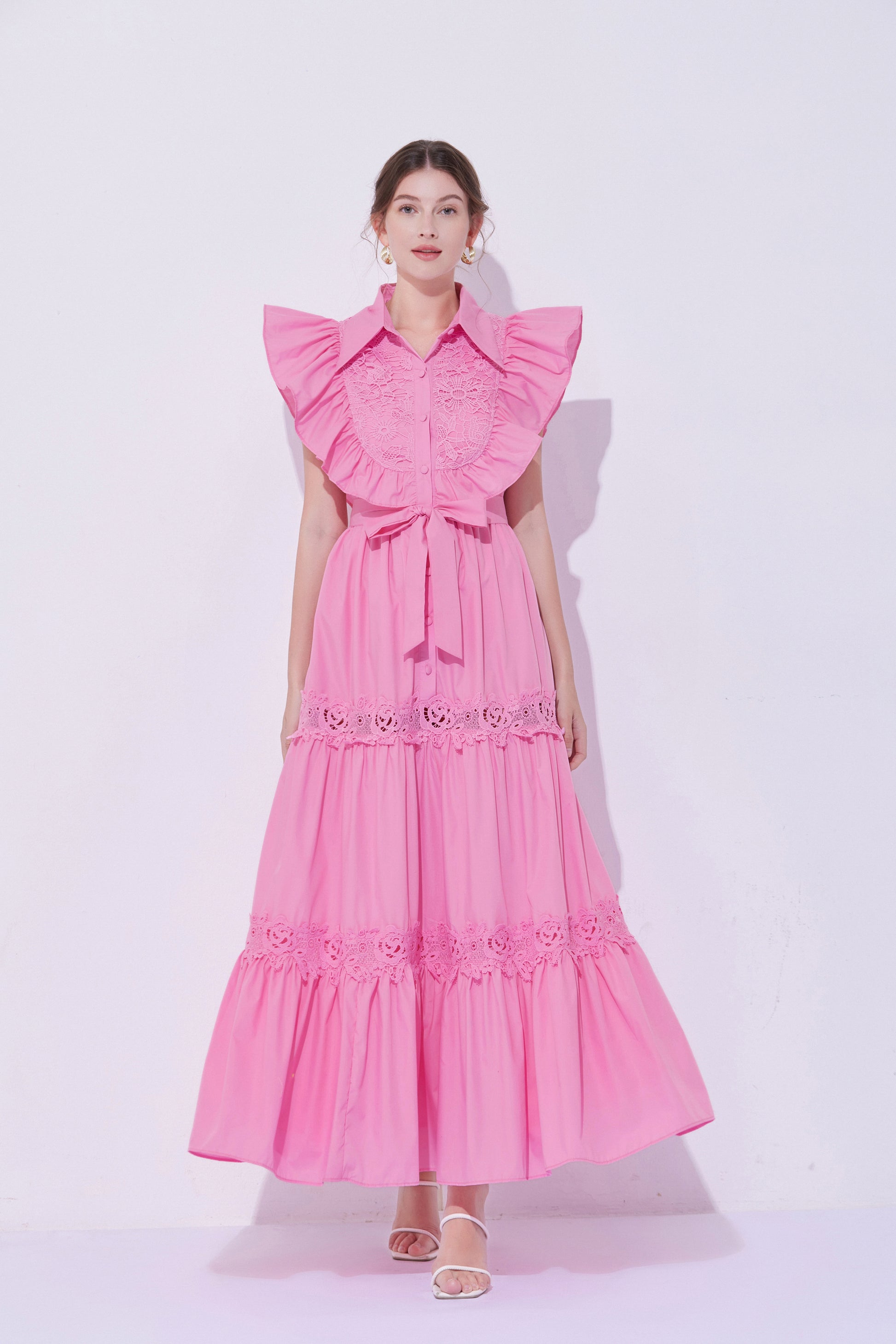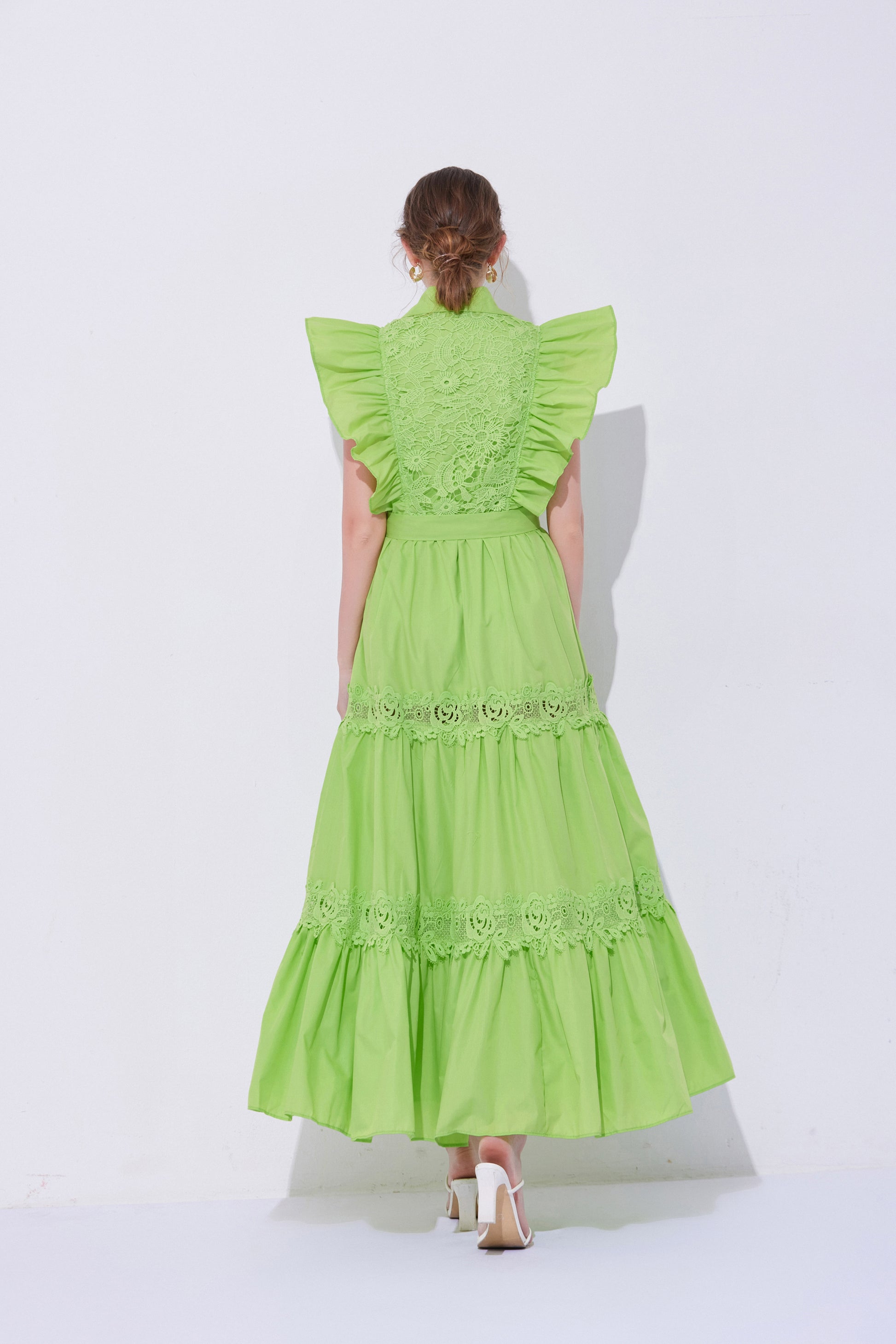 - Design: The exaggerated ruffled design on the shoulders enhances the three-dimensional effect and fashion sense of the dress, making the overall look more vivid and having a stronger visual impact. The lace patchwork on the back and hem adds a touch of refinement.