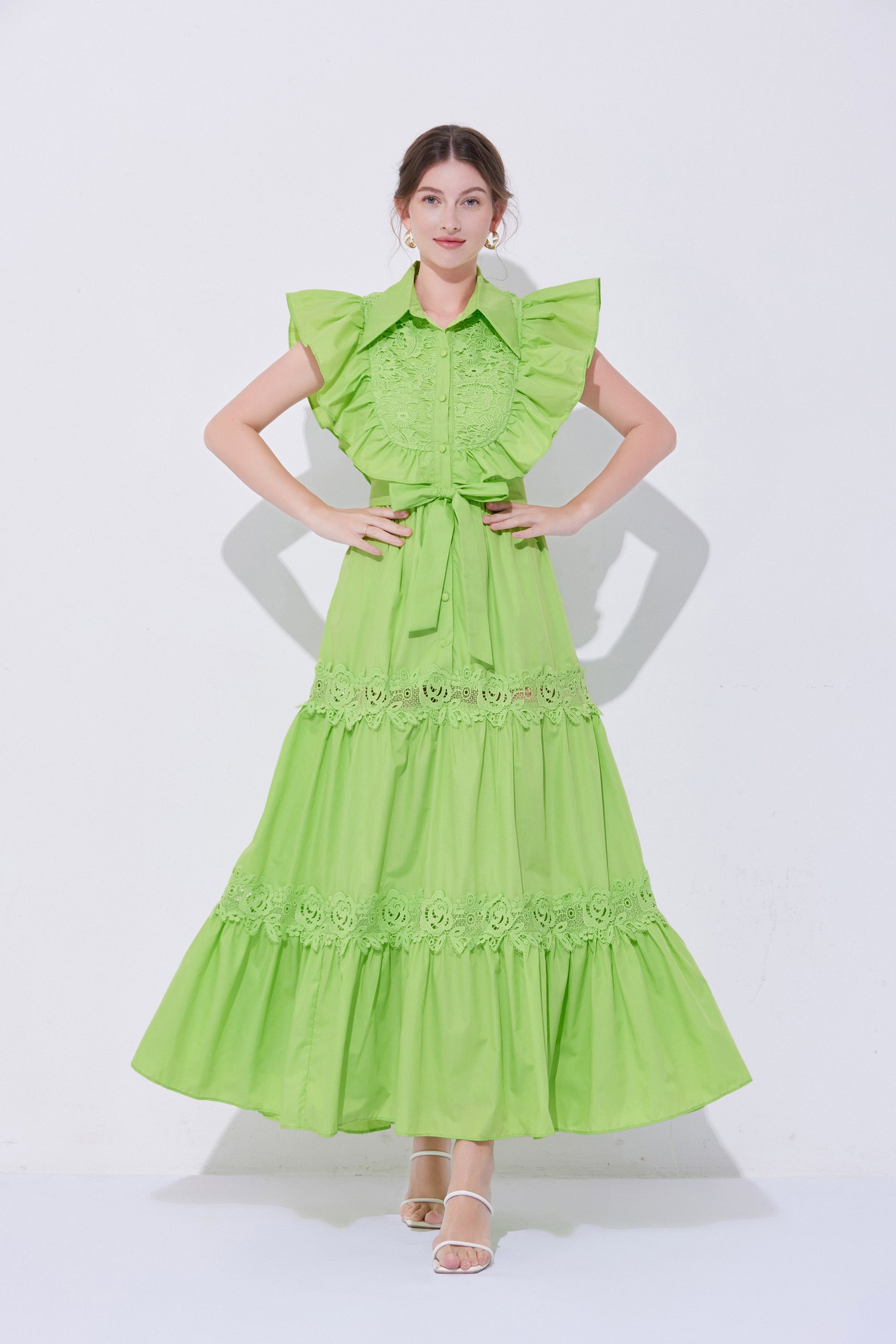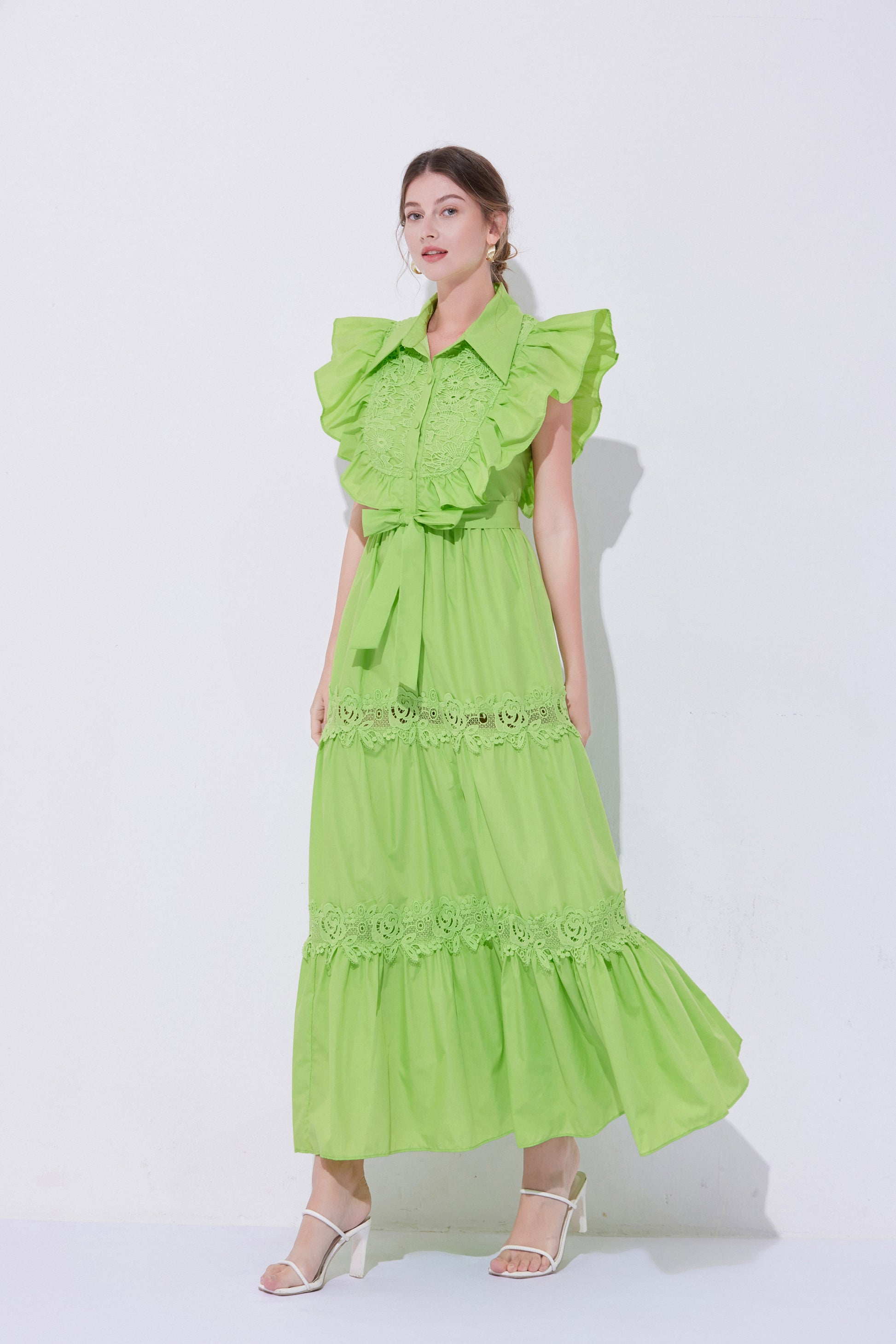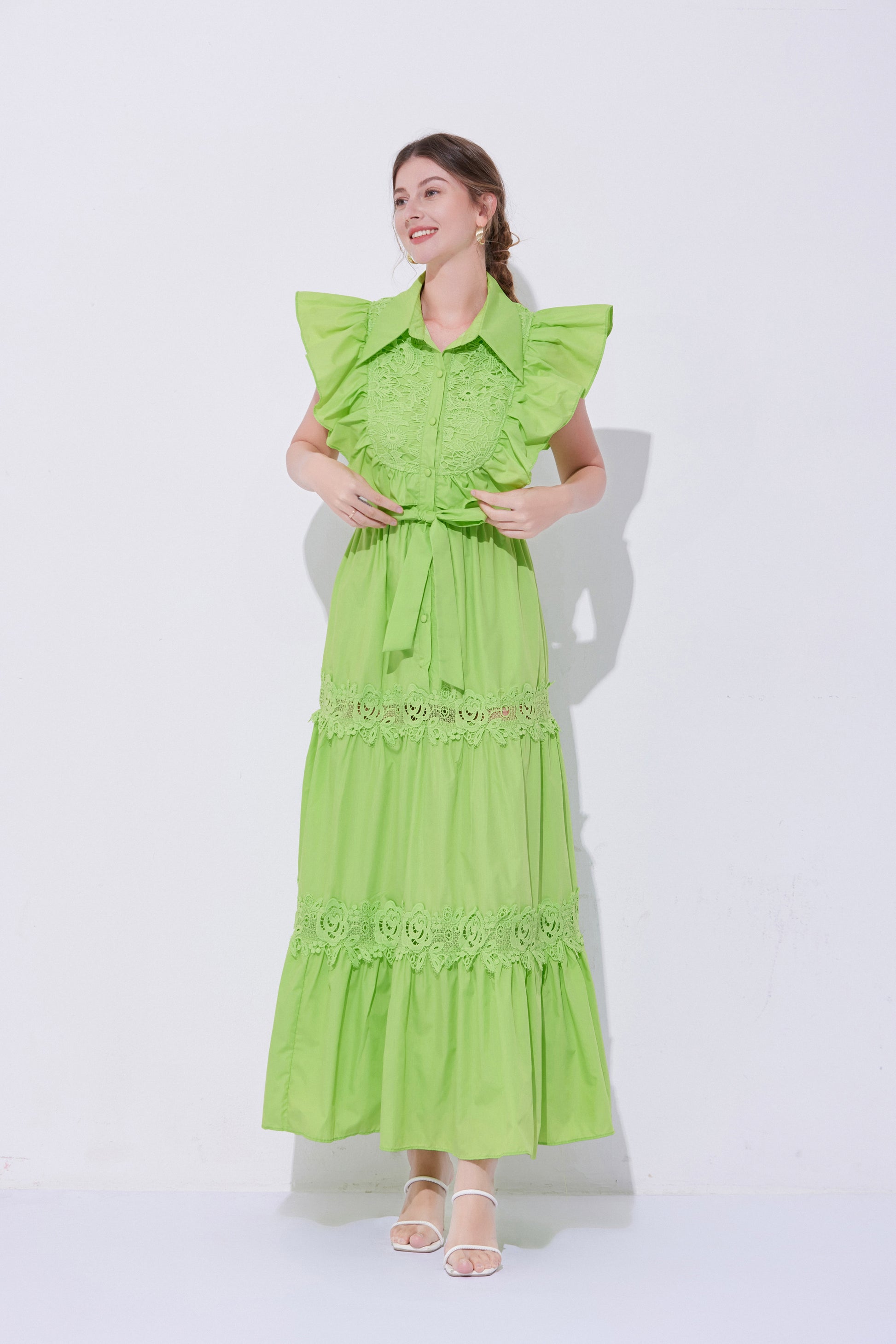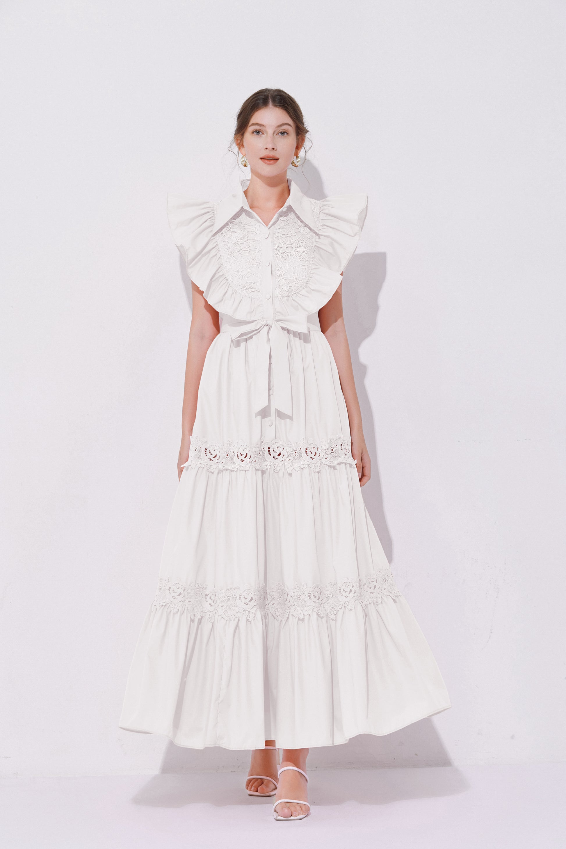 - Design: The exaggerated ruffled design on the shoulders enhances the three-dimensional effect and fashion sense of the dress, making the overall look more vivid and having a stronger visual impact. The lace patchwork on the back and hem adds a touch of refinement.