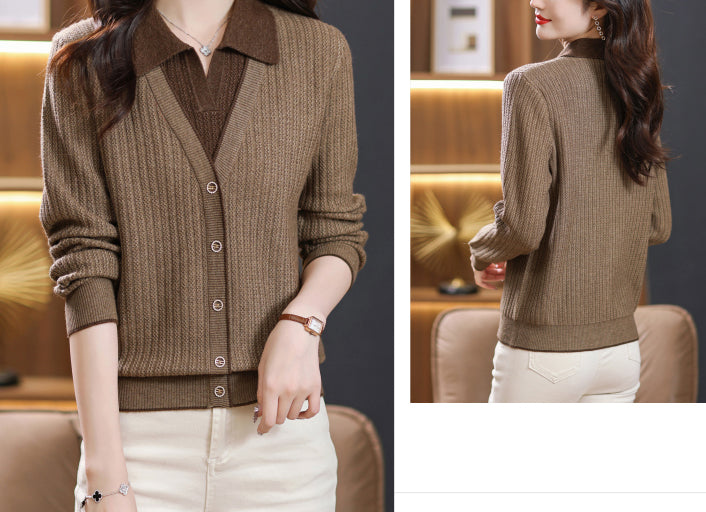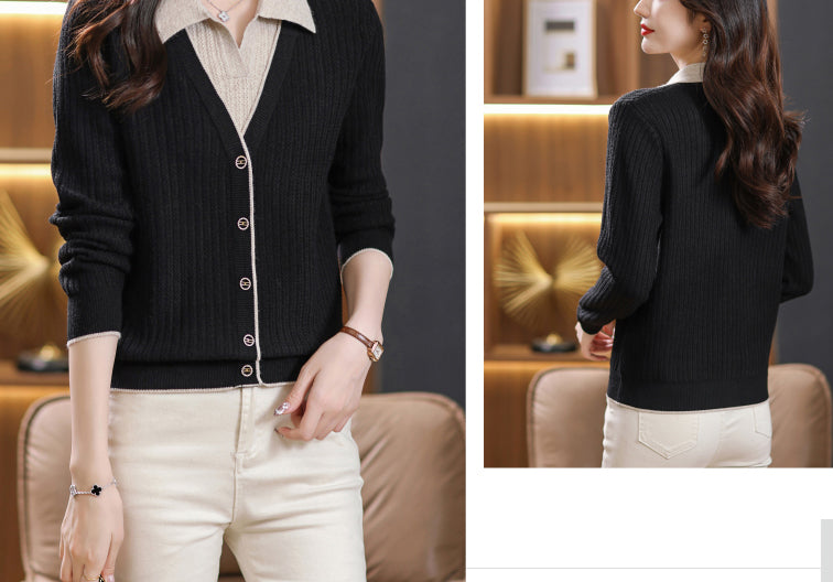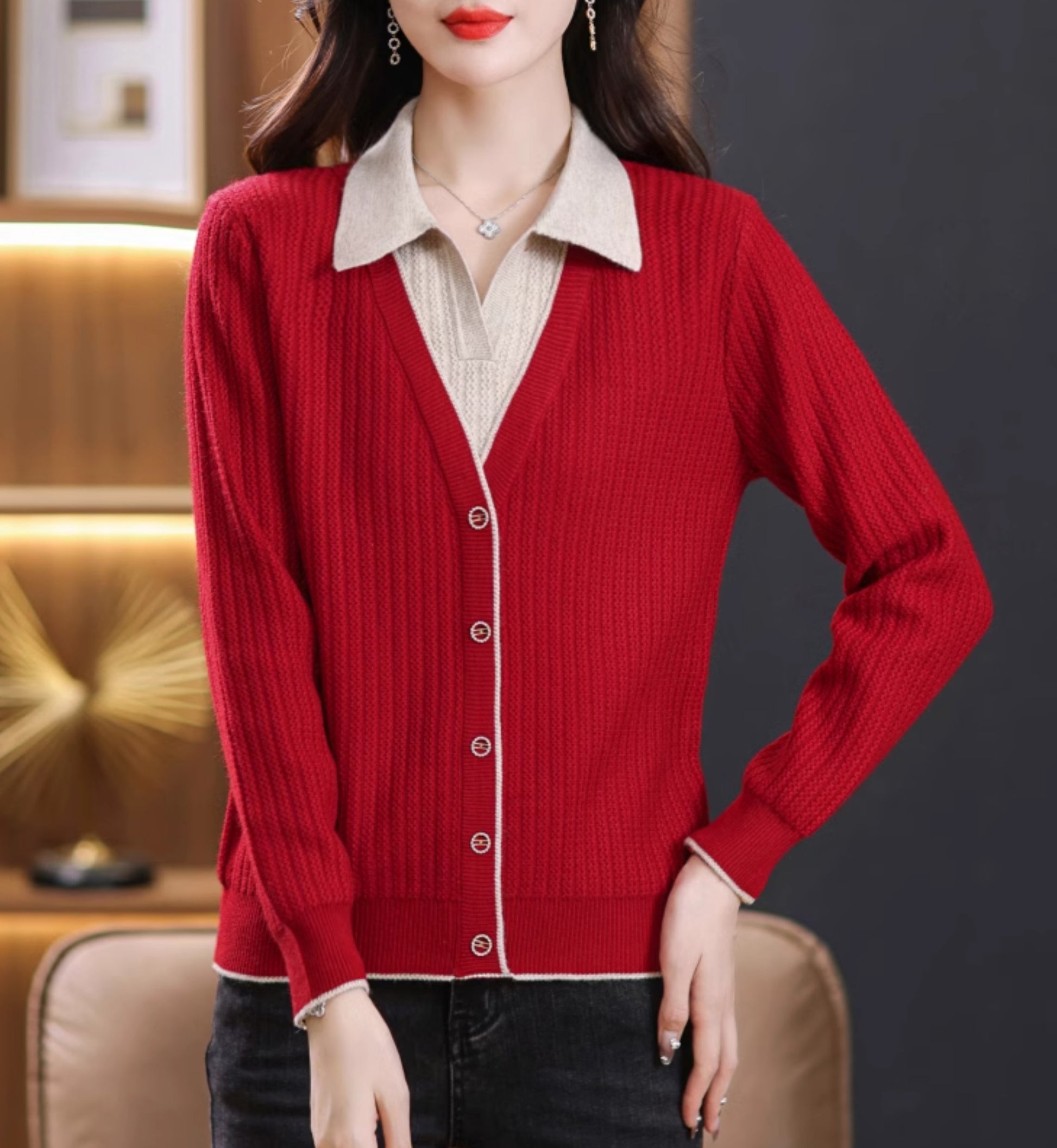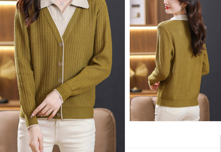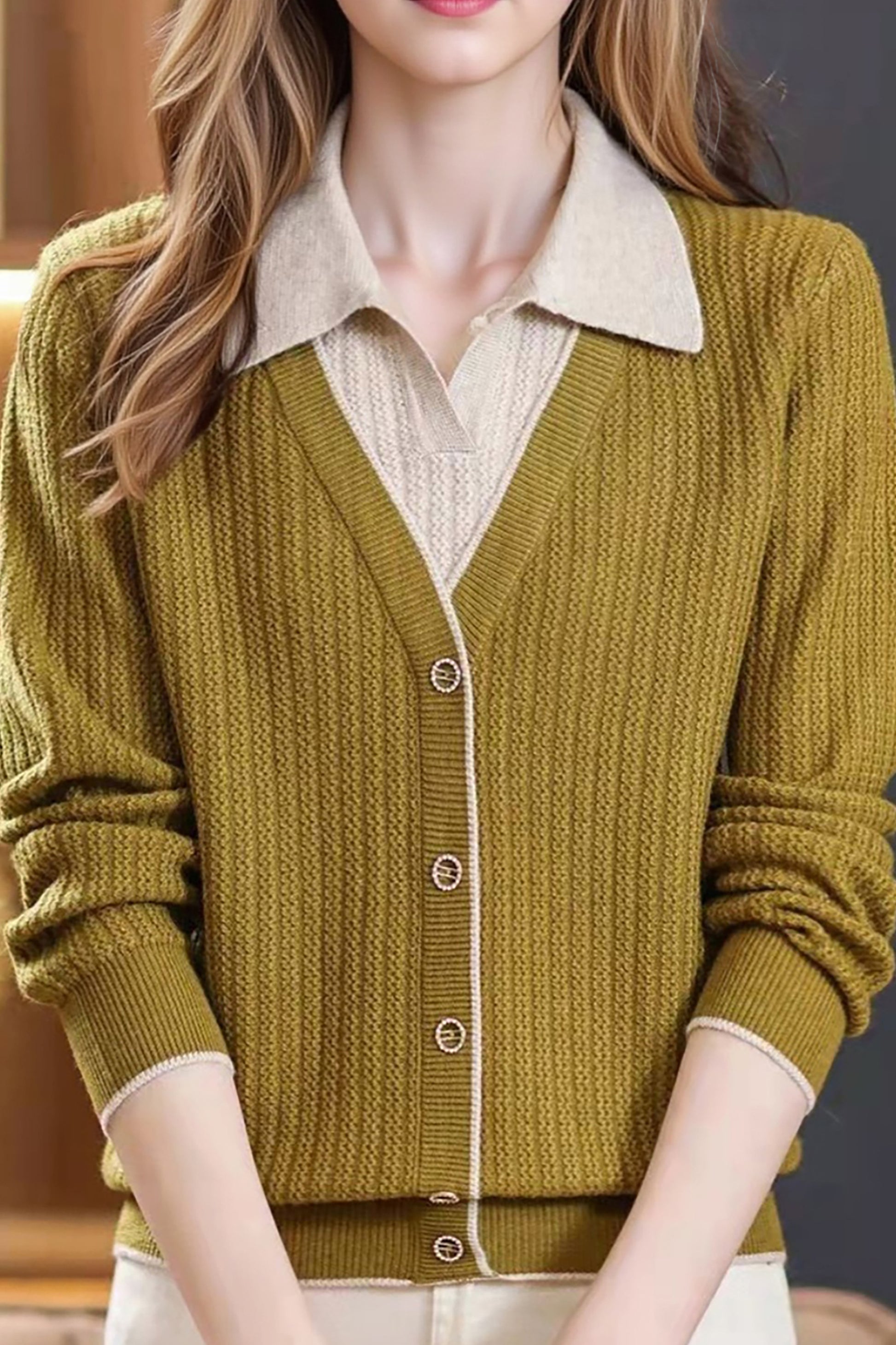 - Features: Color-blocking collar, V-neck lapel, long sleeves, button decoration, fake two-piece knitted top, ribbed knit top,color-blocking knit,autumn and winter pullover knitted sweater.