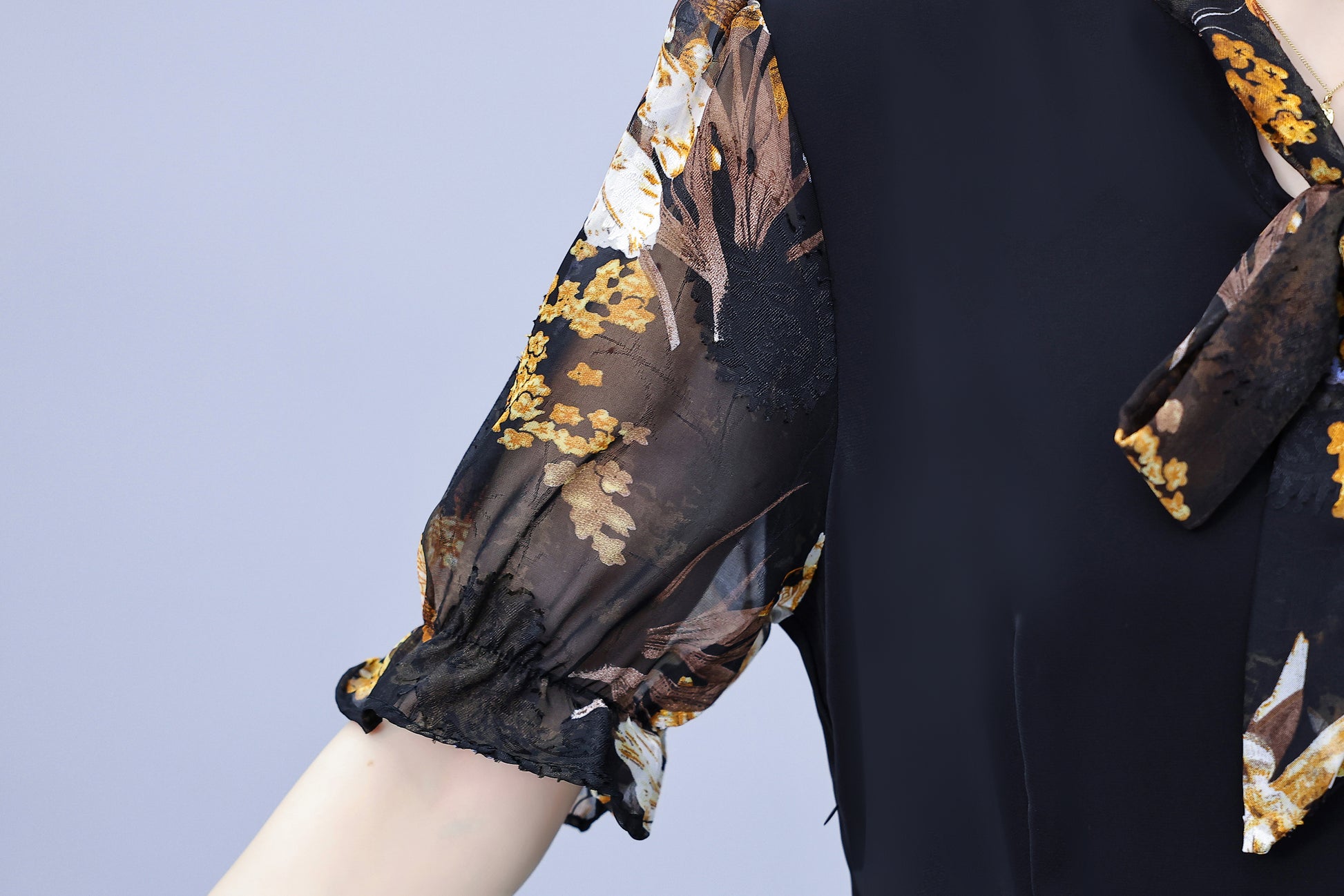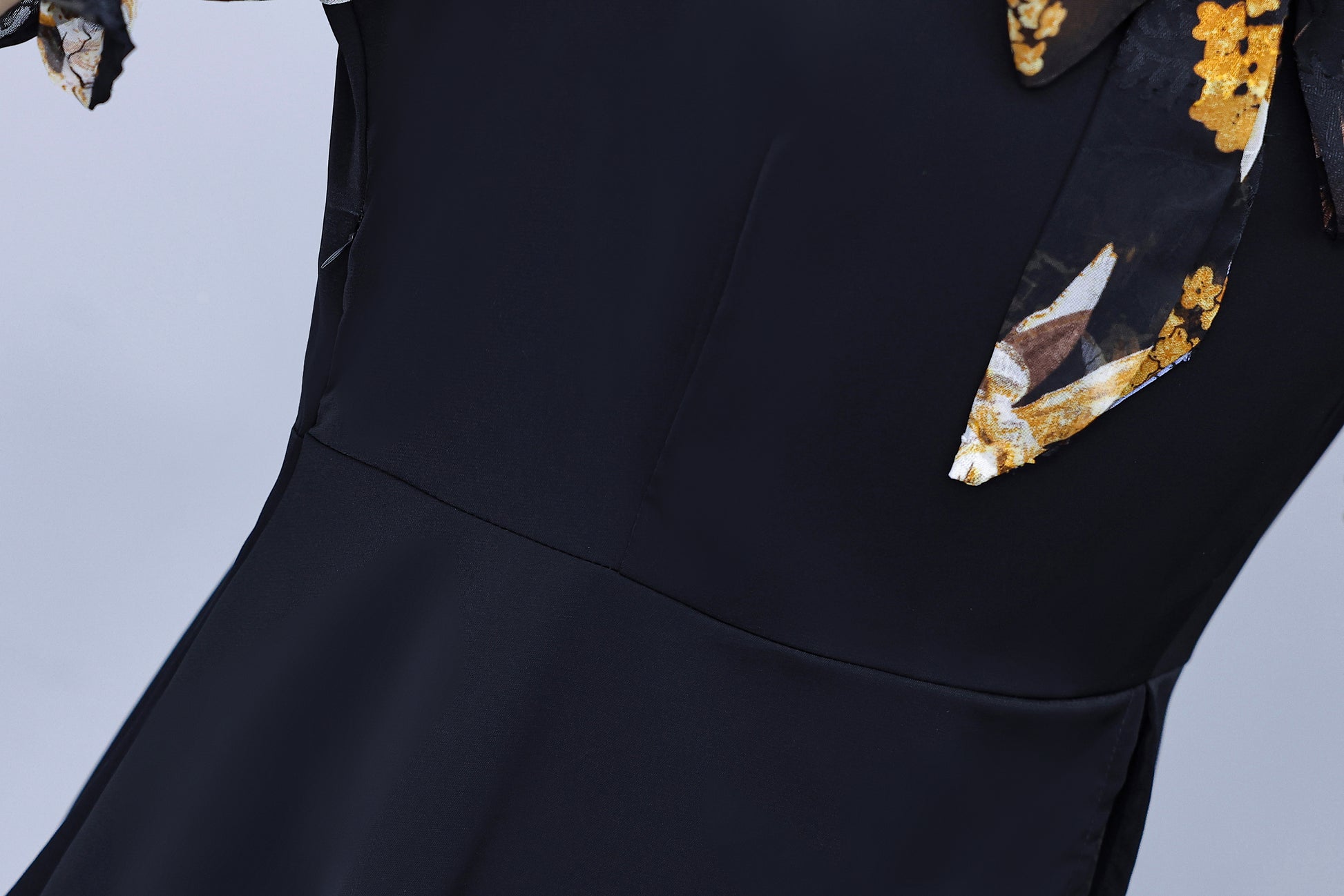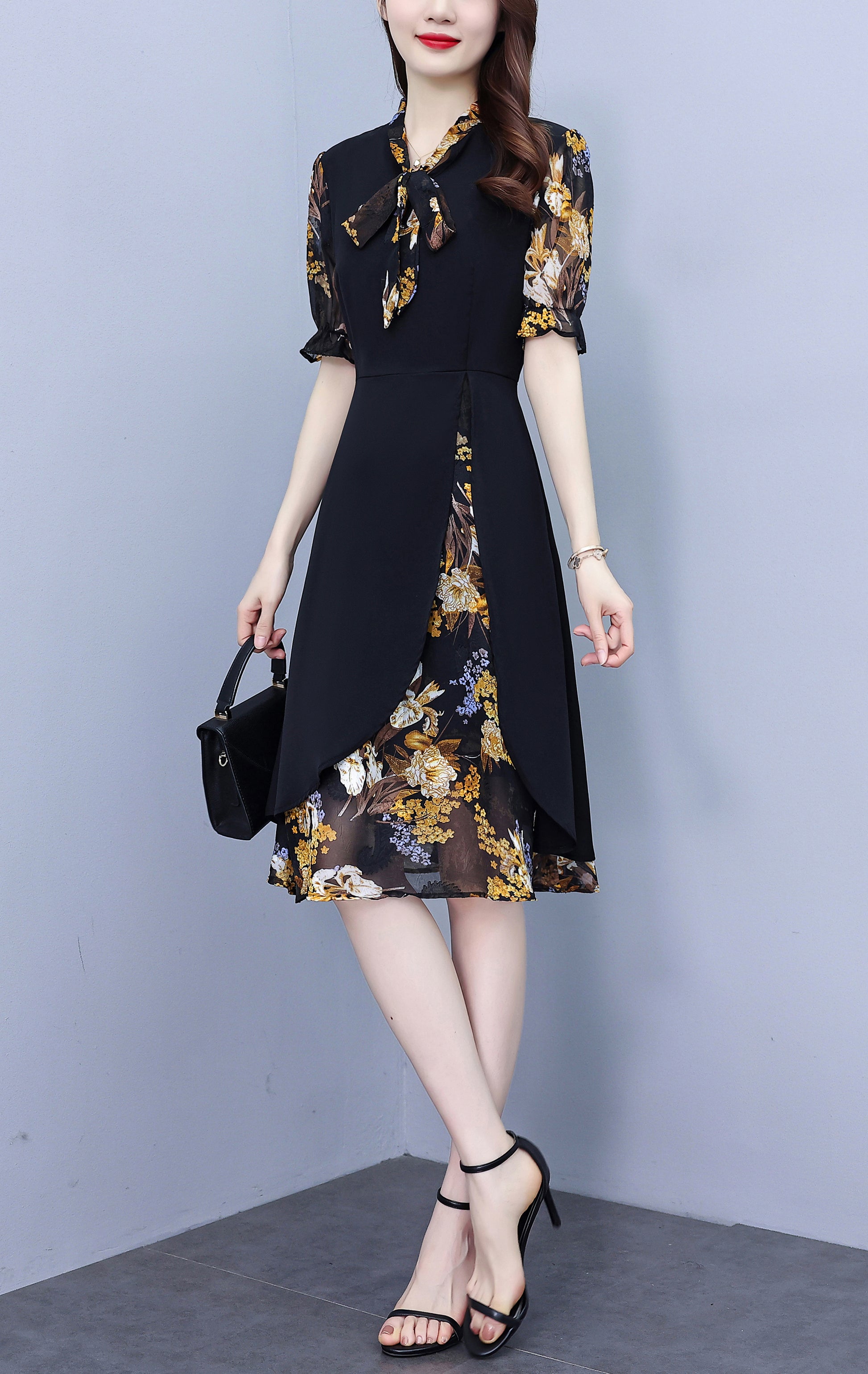 - Features:Black dress,patchwork design,tie v-neck,short sleeve,a-line,side zip,elegant dress,Stretch fabric,midi length,spring&summer dress.