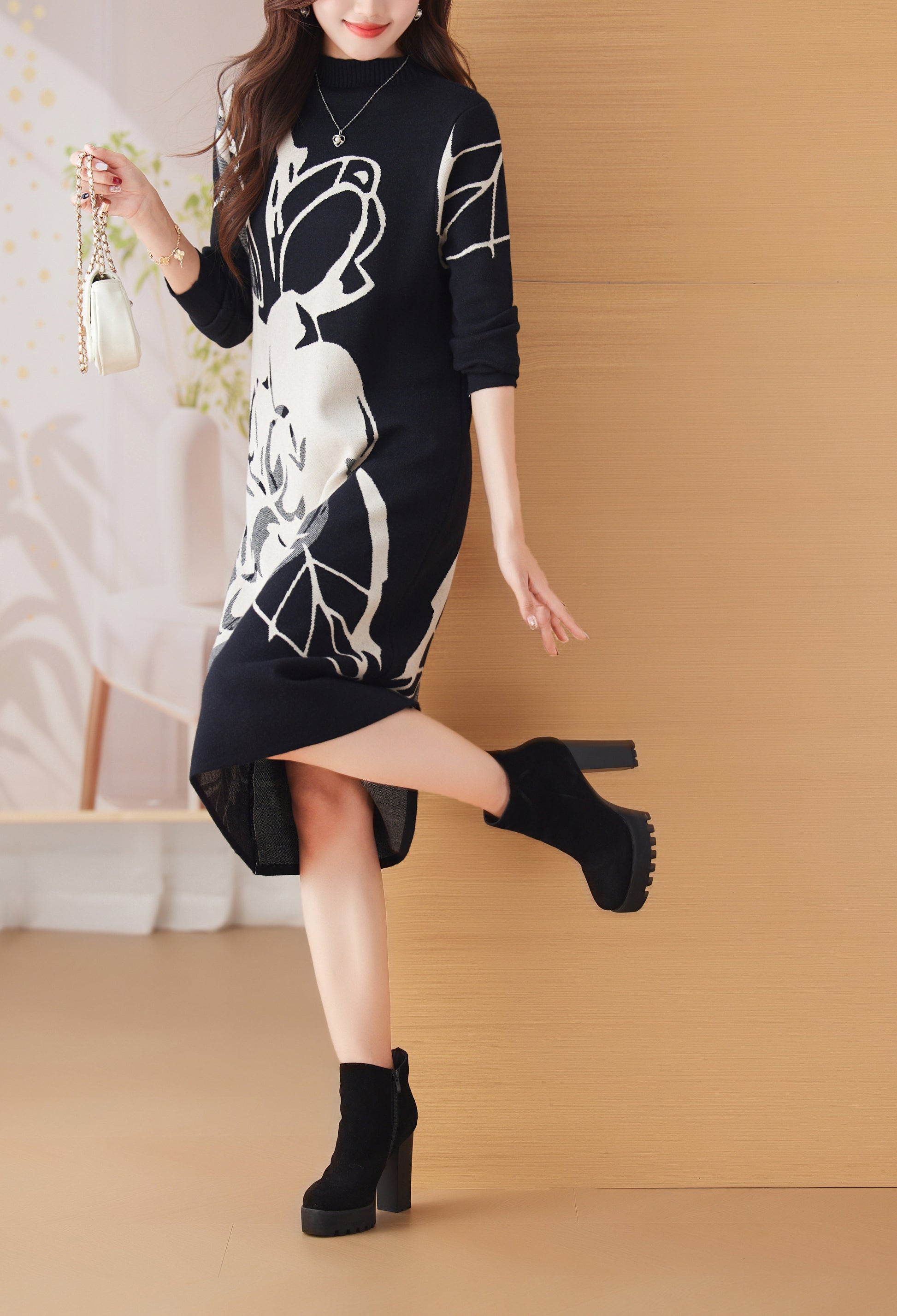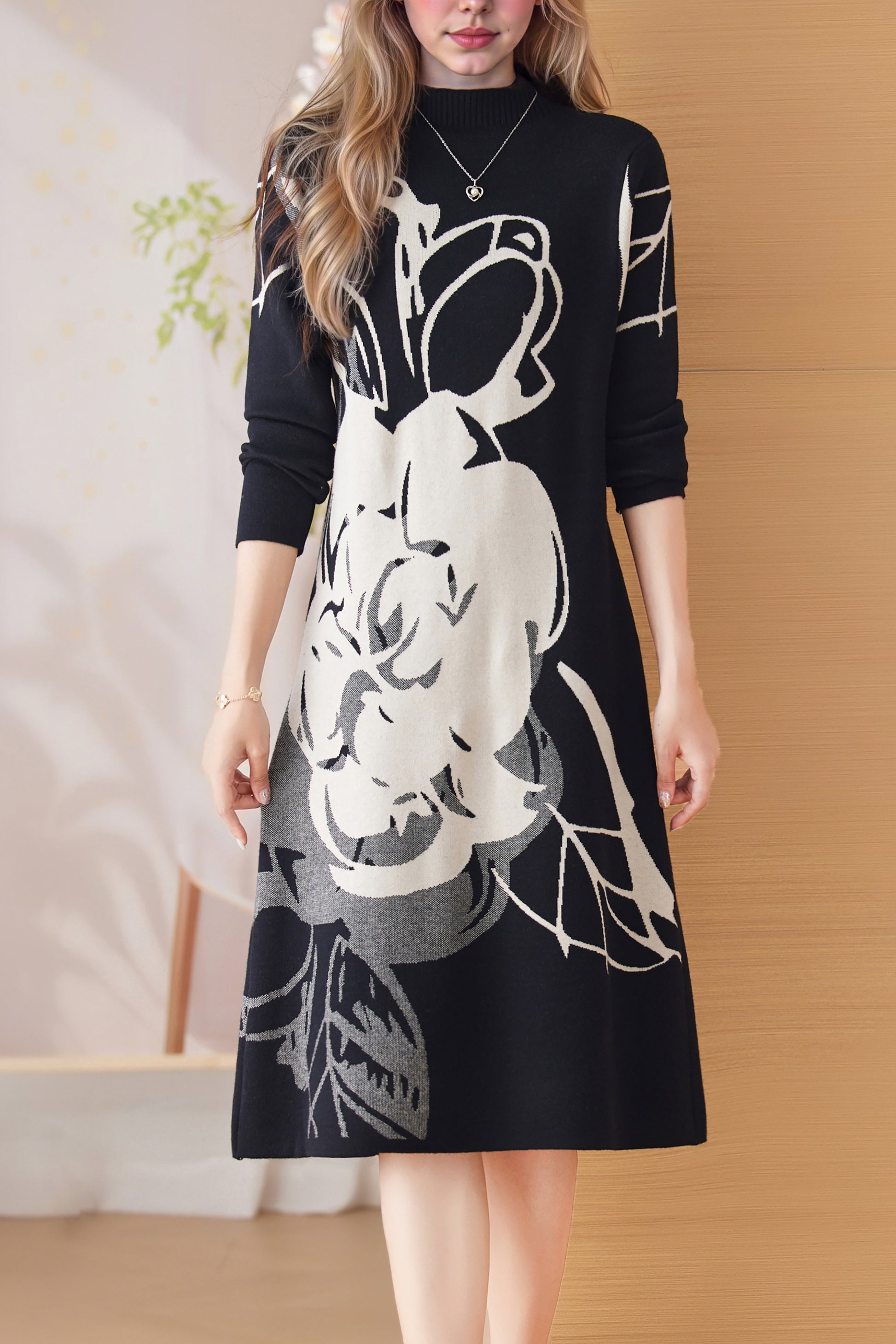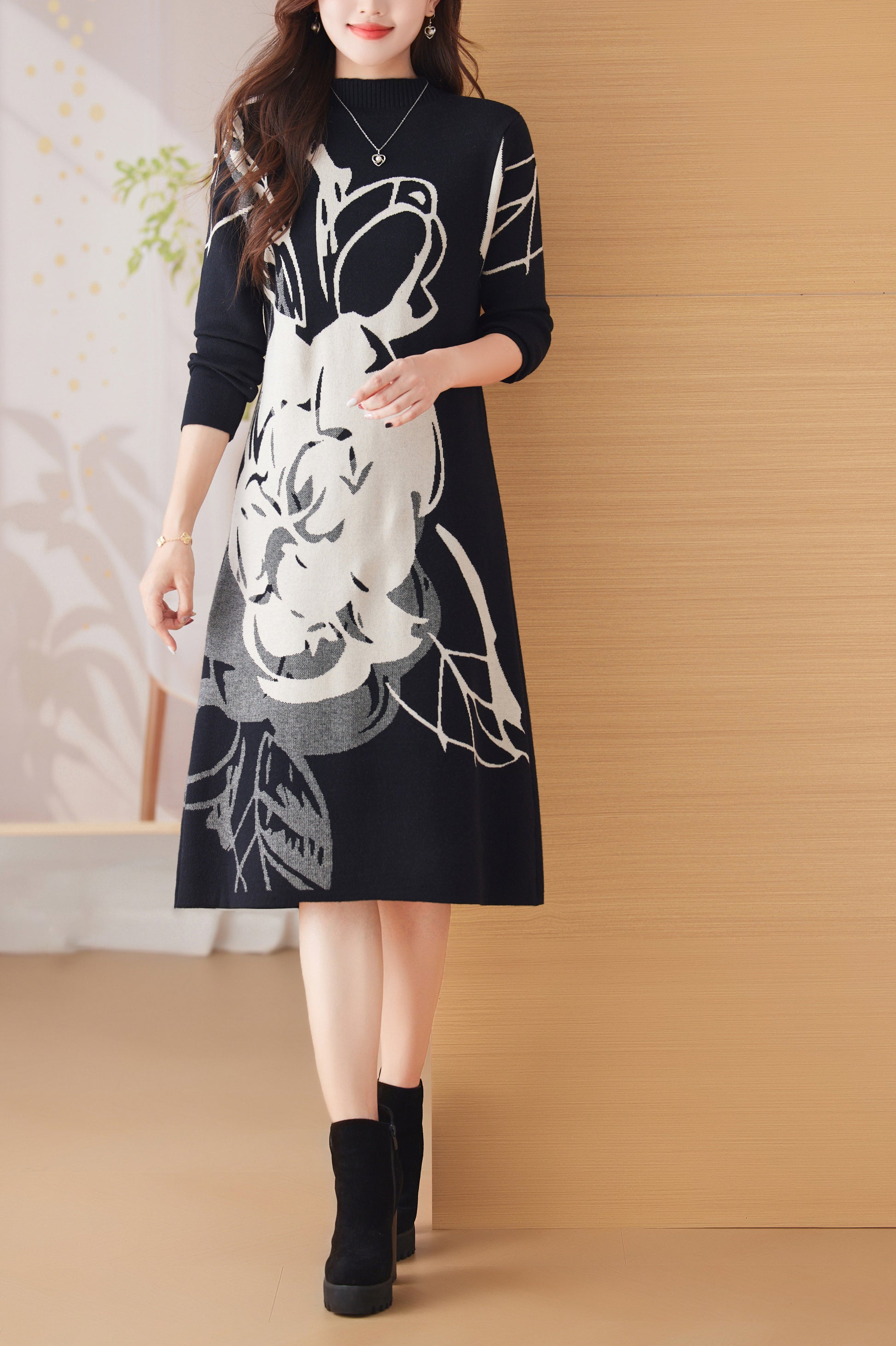 Women's Turtleneck Print Pullover Sweater Midi Dress