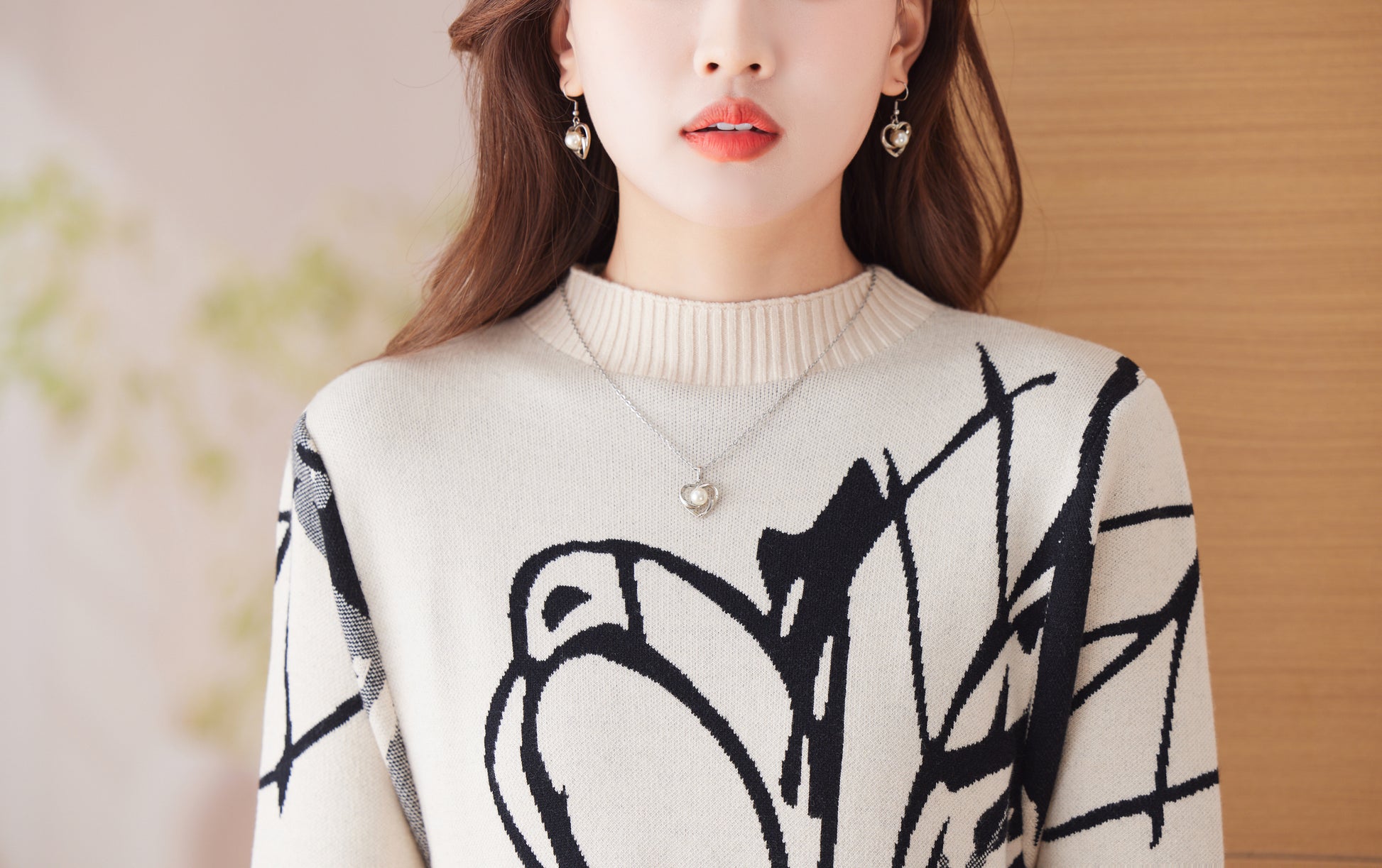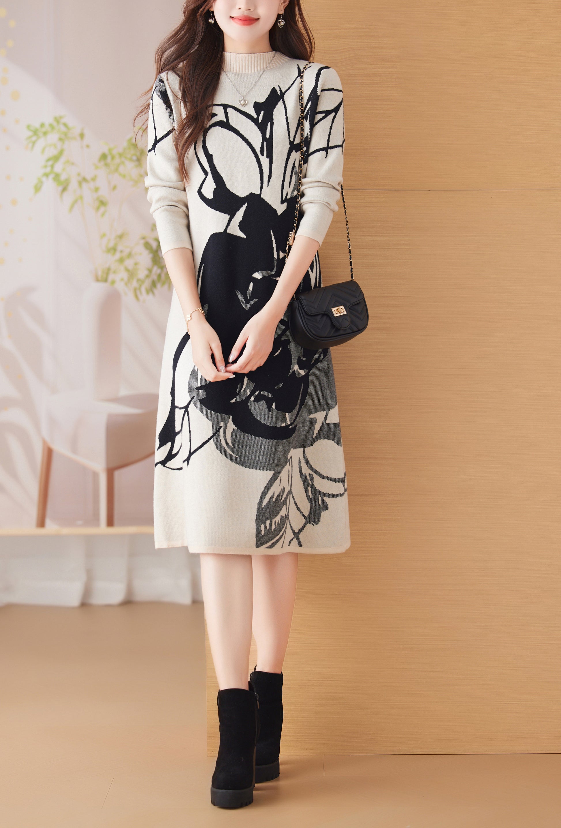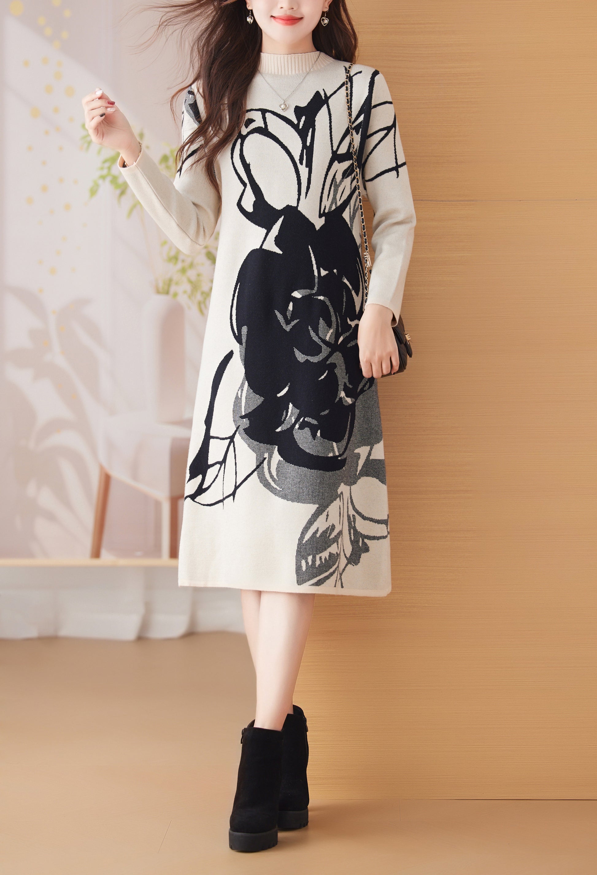 Women's Turtleneck Print Pullover Sweater Midi Dress